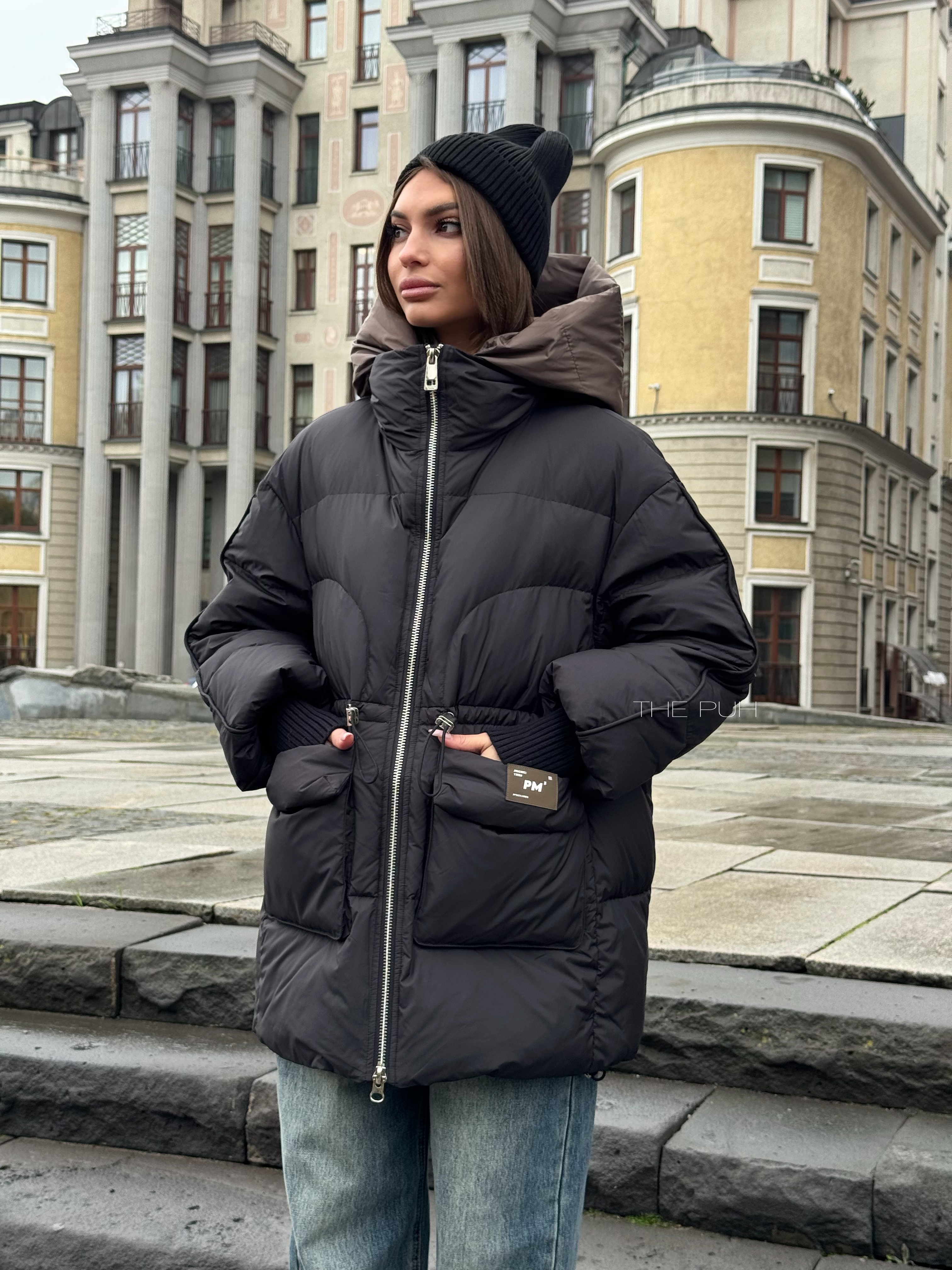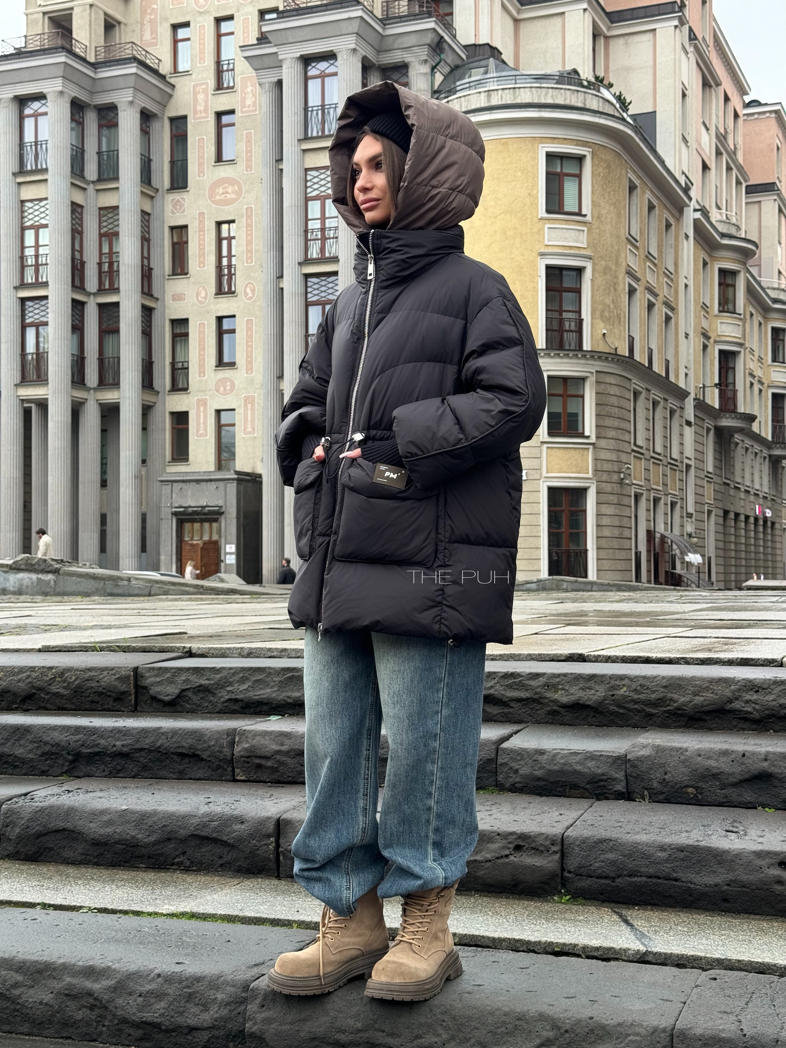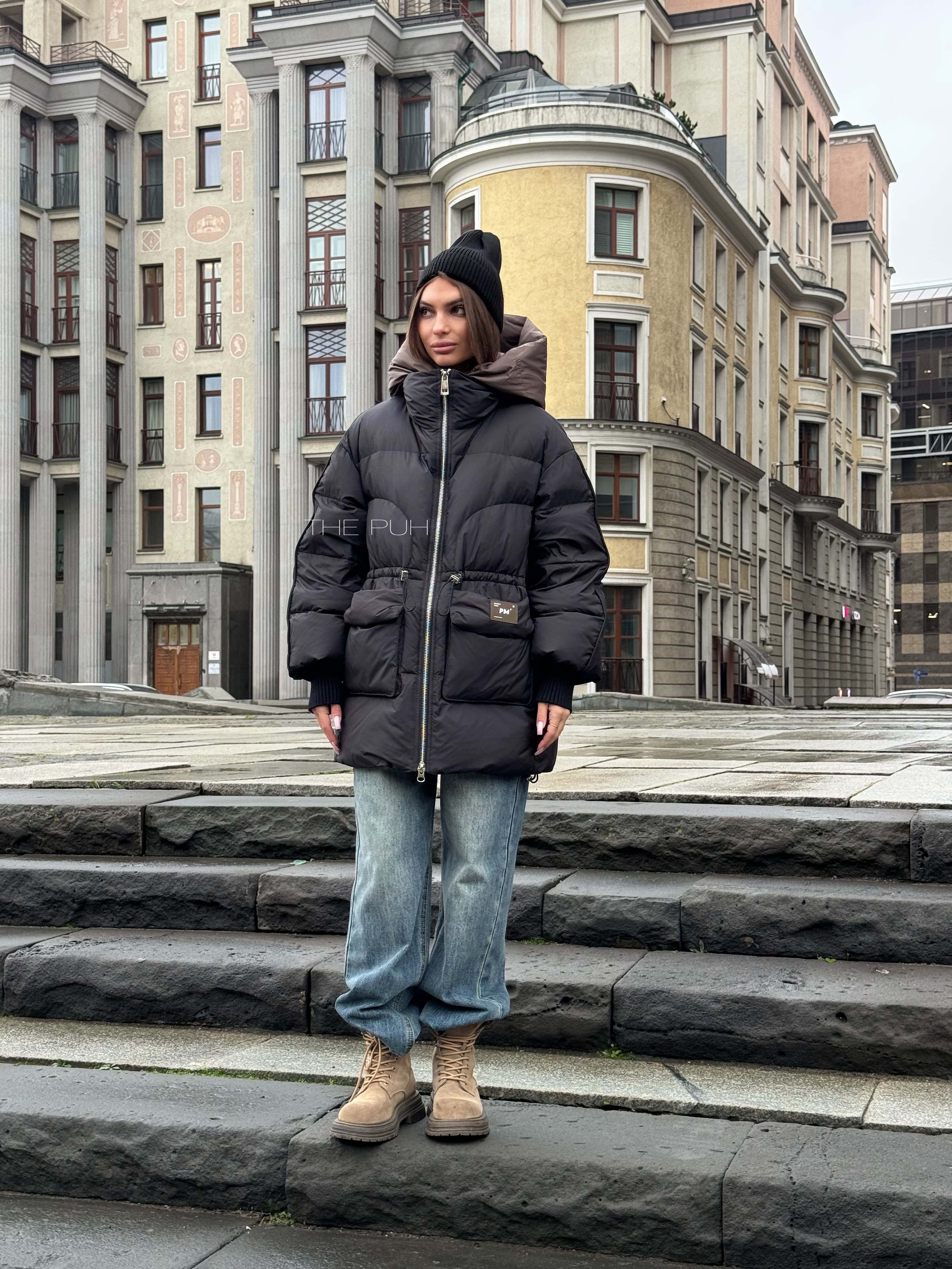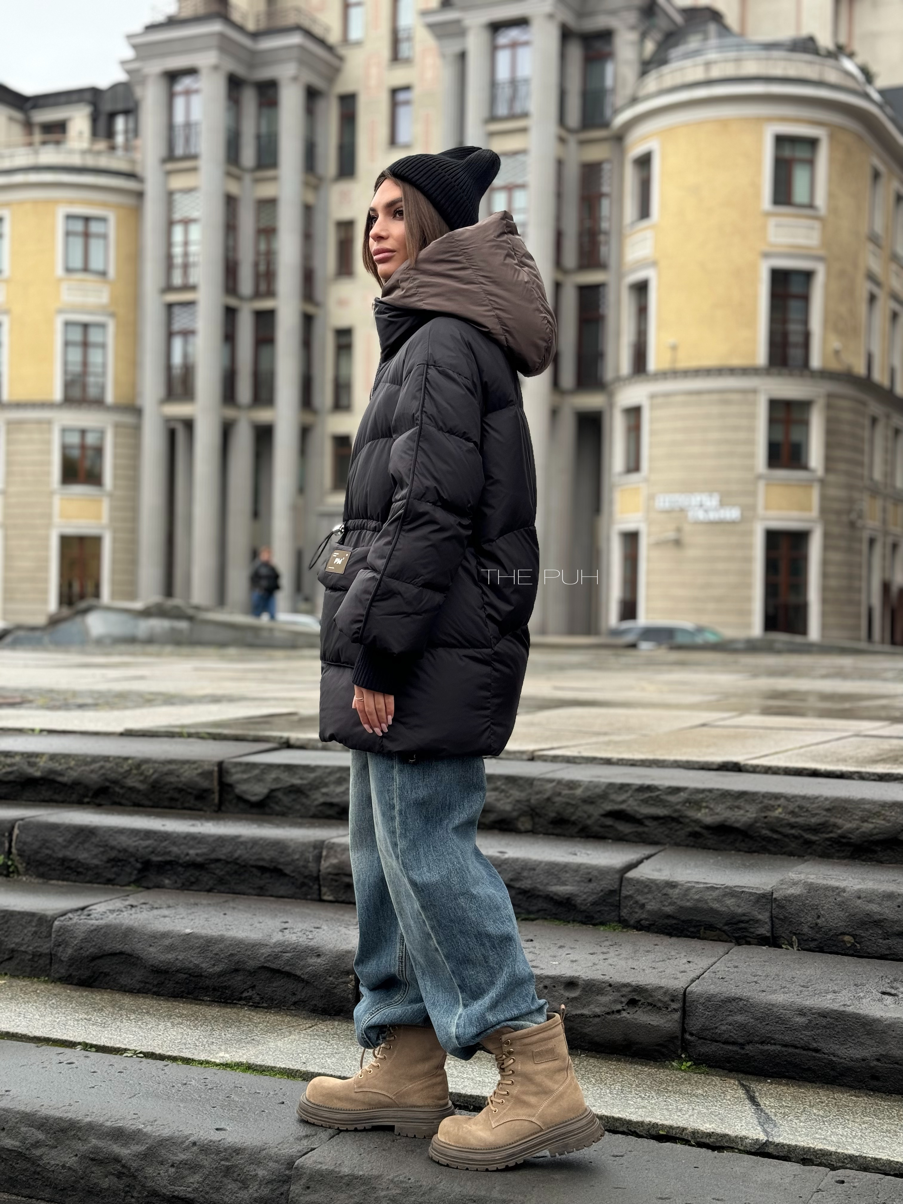Удлиненный черный пуховик на молнии с кулиской на поясе и контрастным капюшоном. Модель также дополнена удлиненными вязаными манжетами, которые защитят от холода и ветра.