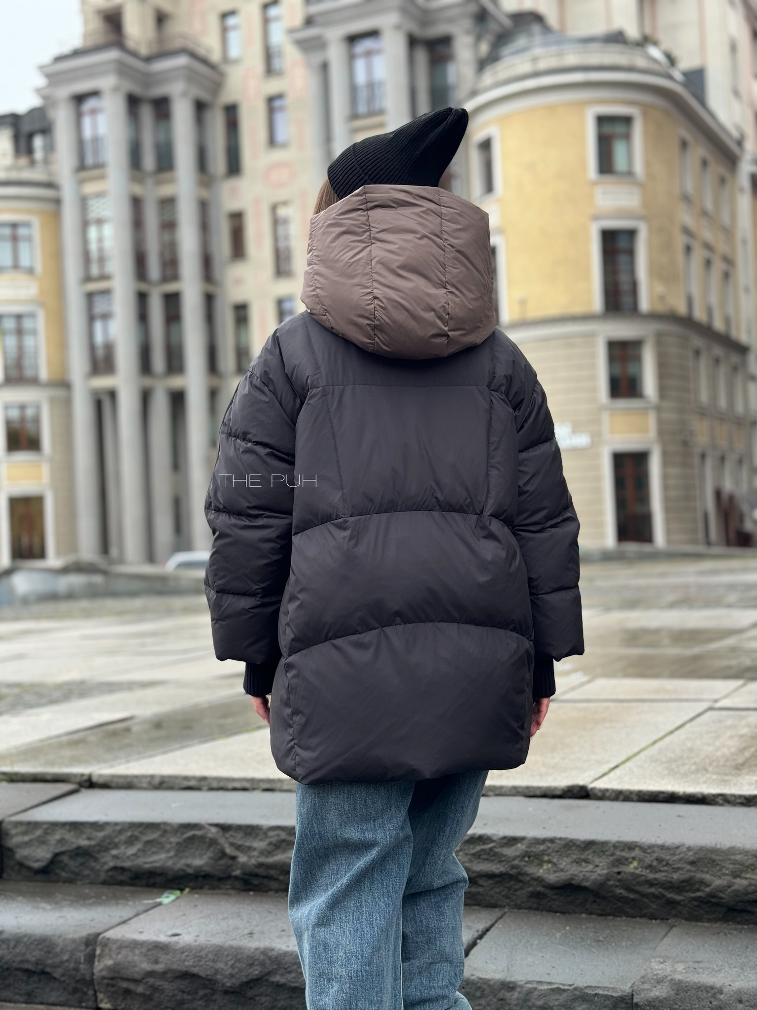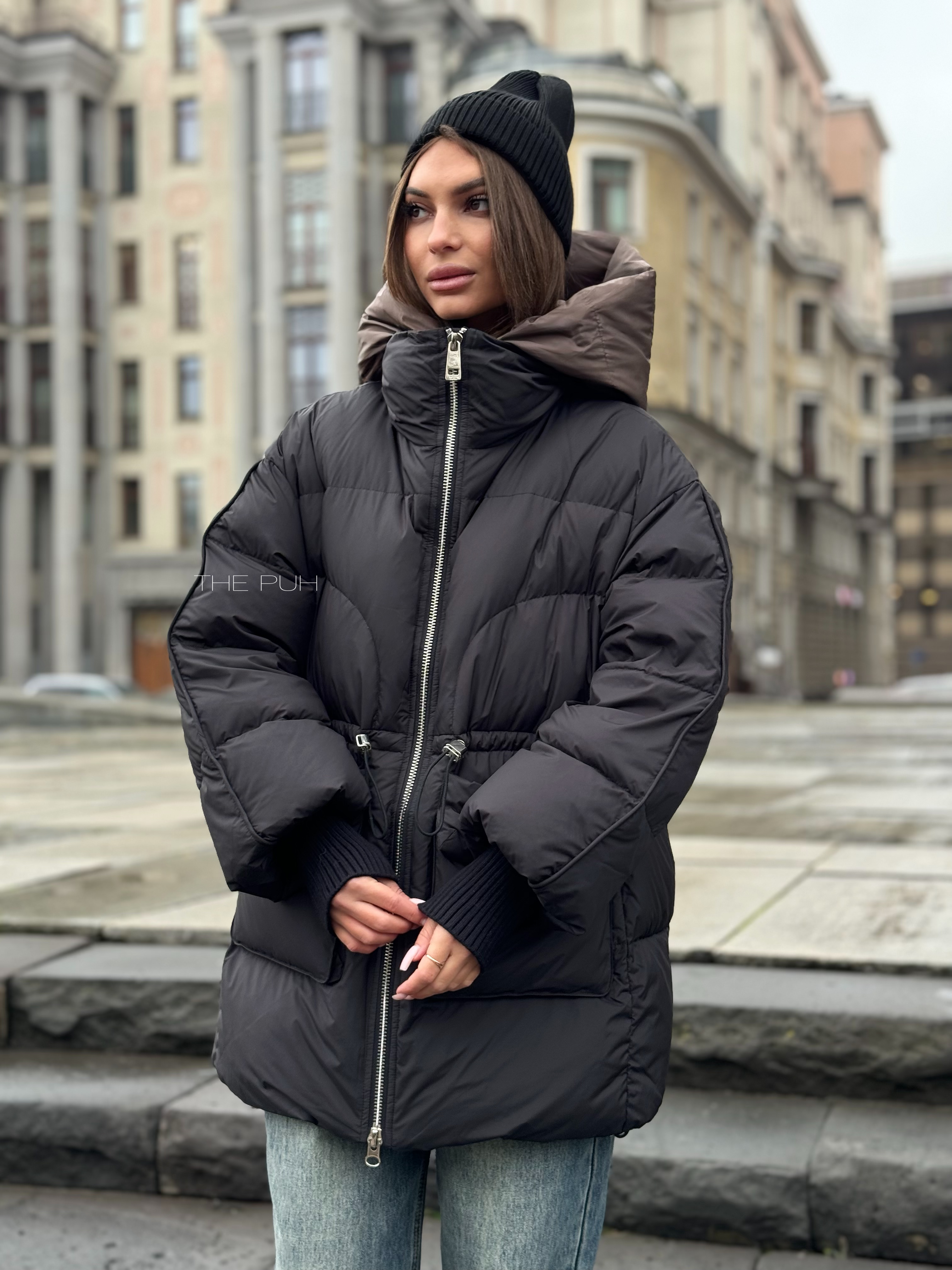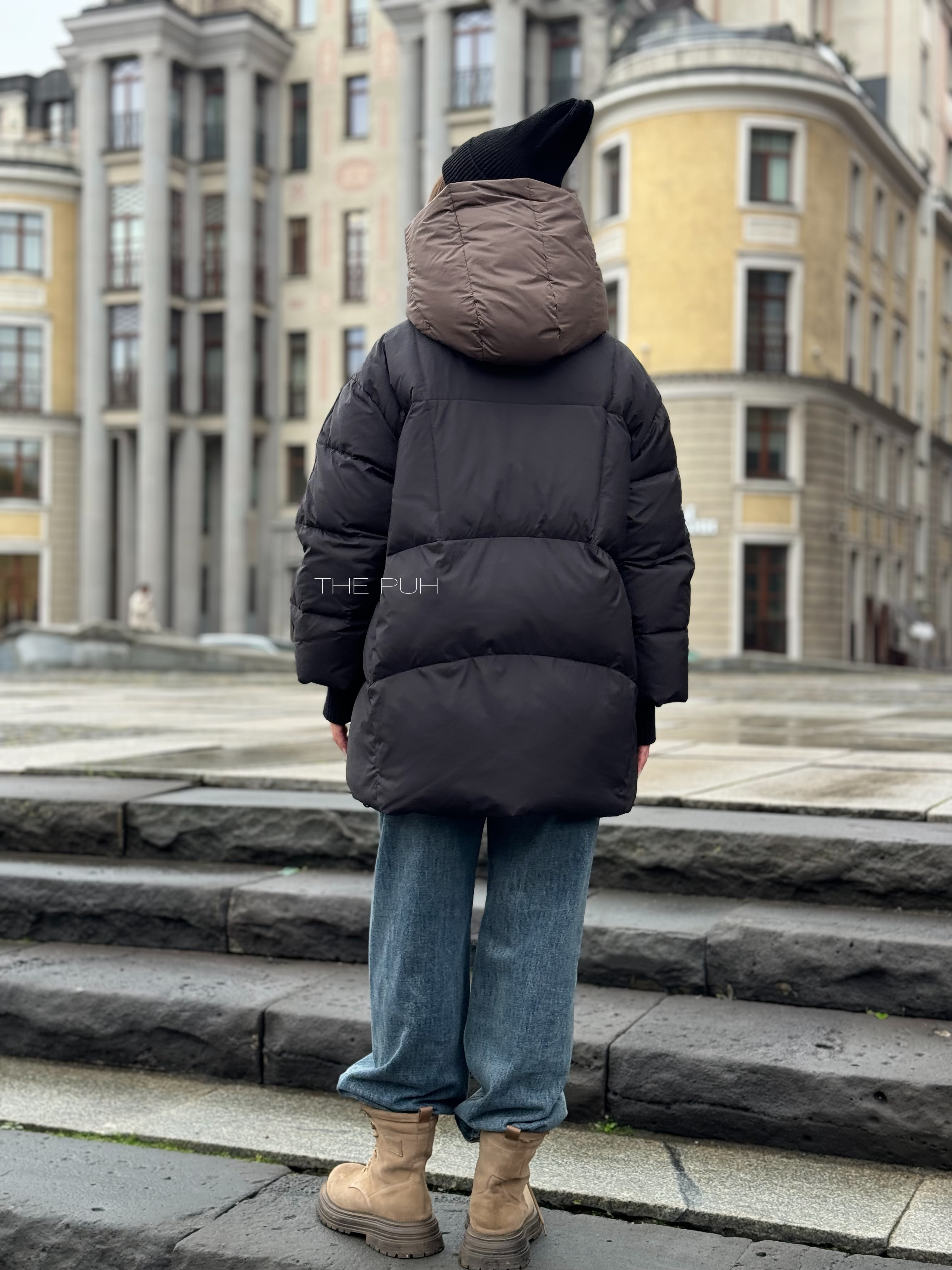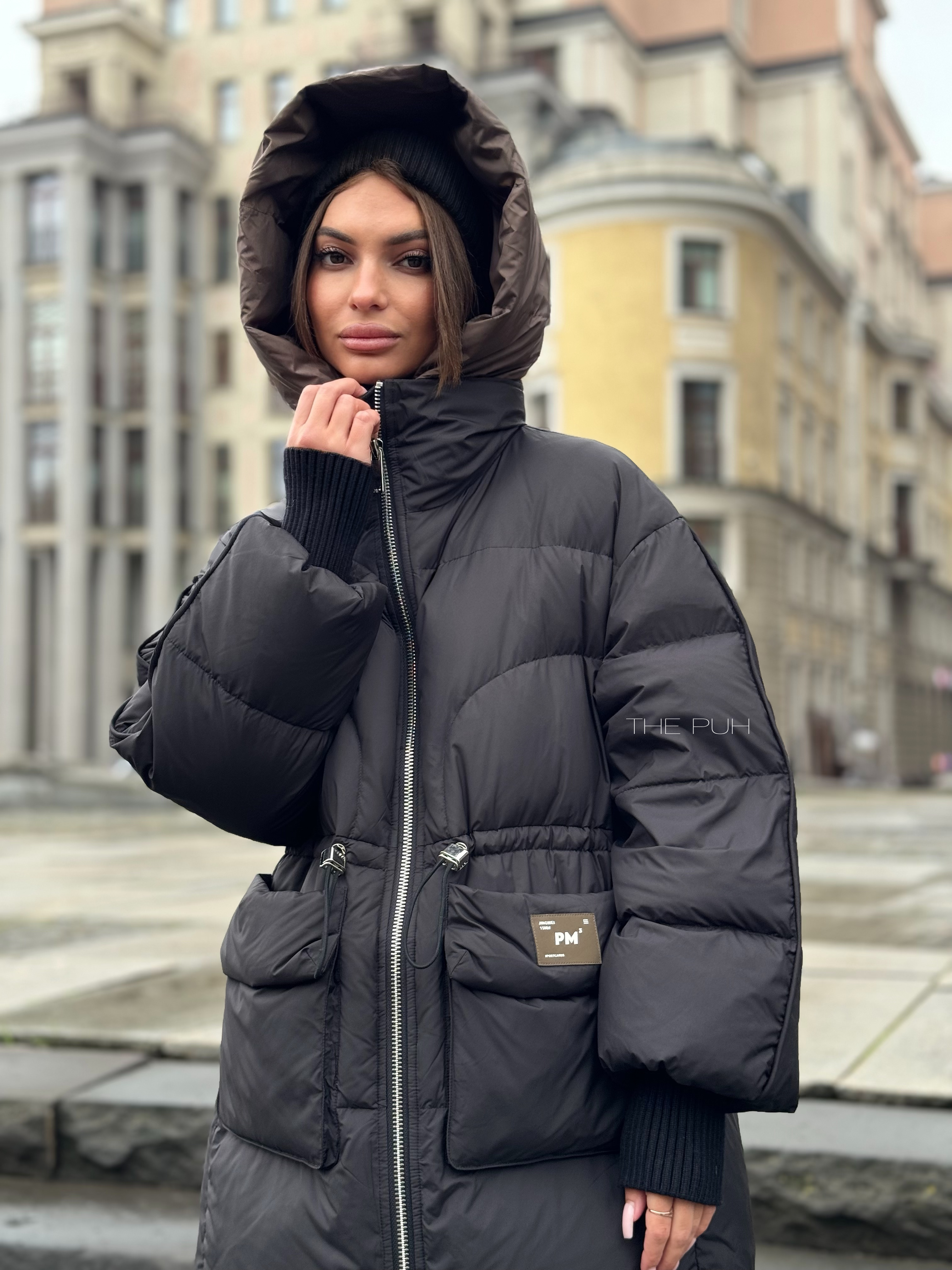 Удлиненный черный пуховик на молнии с кулиской на поясе и контрастным капюшоном. Модель также дополнена удлиненными вязаными манжетами, которые защитят от холода и ветра.