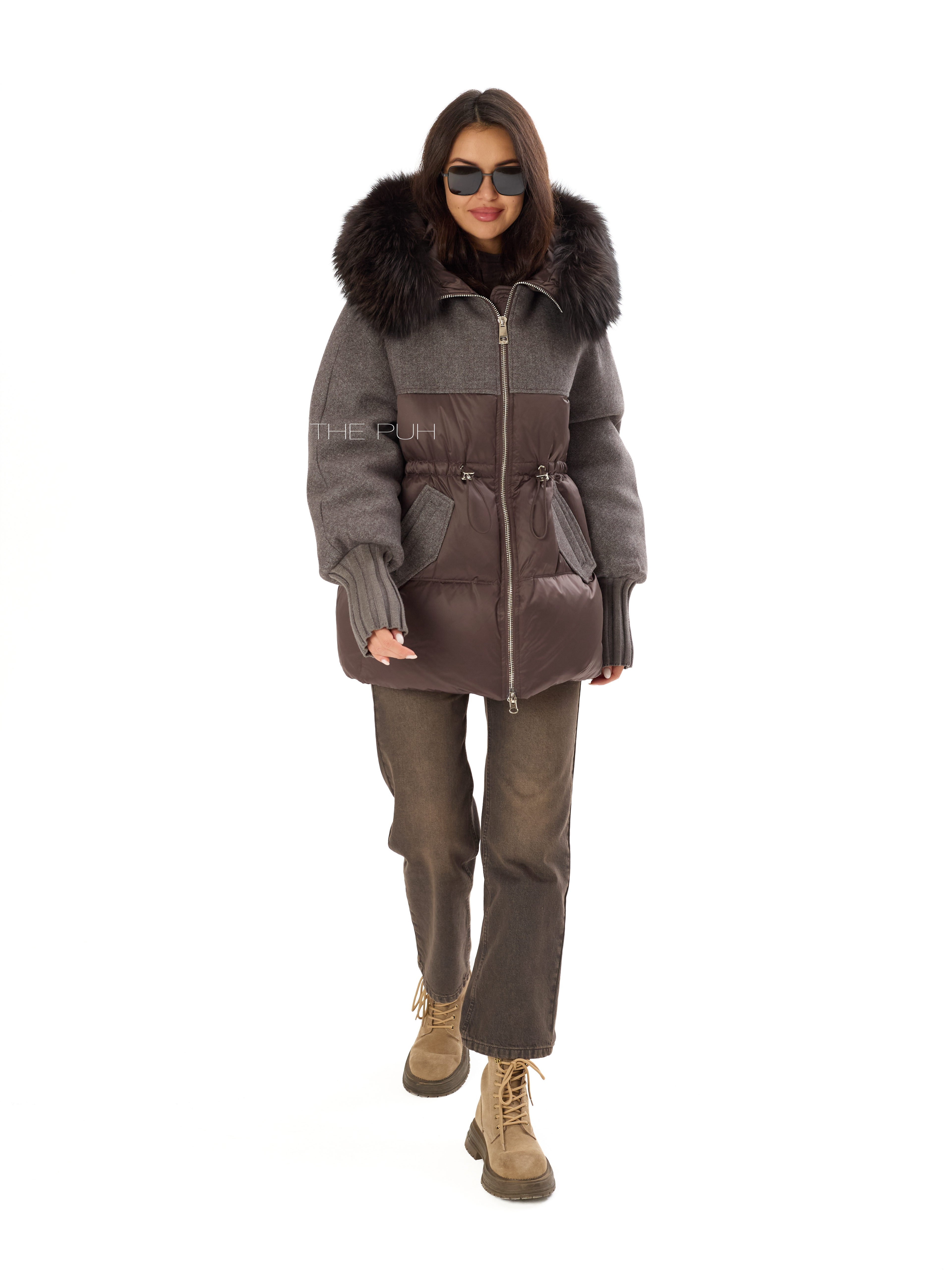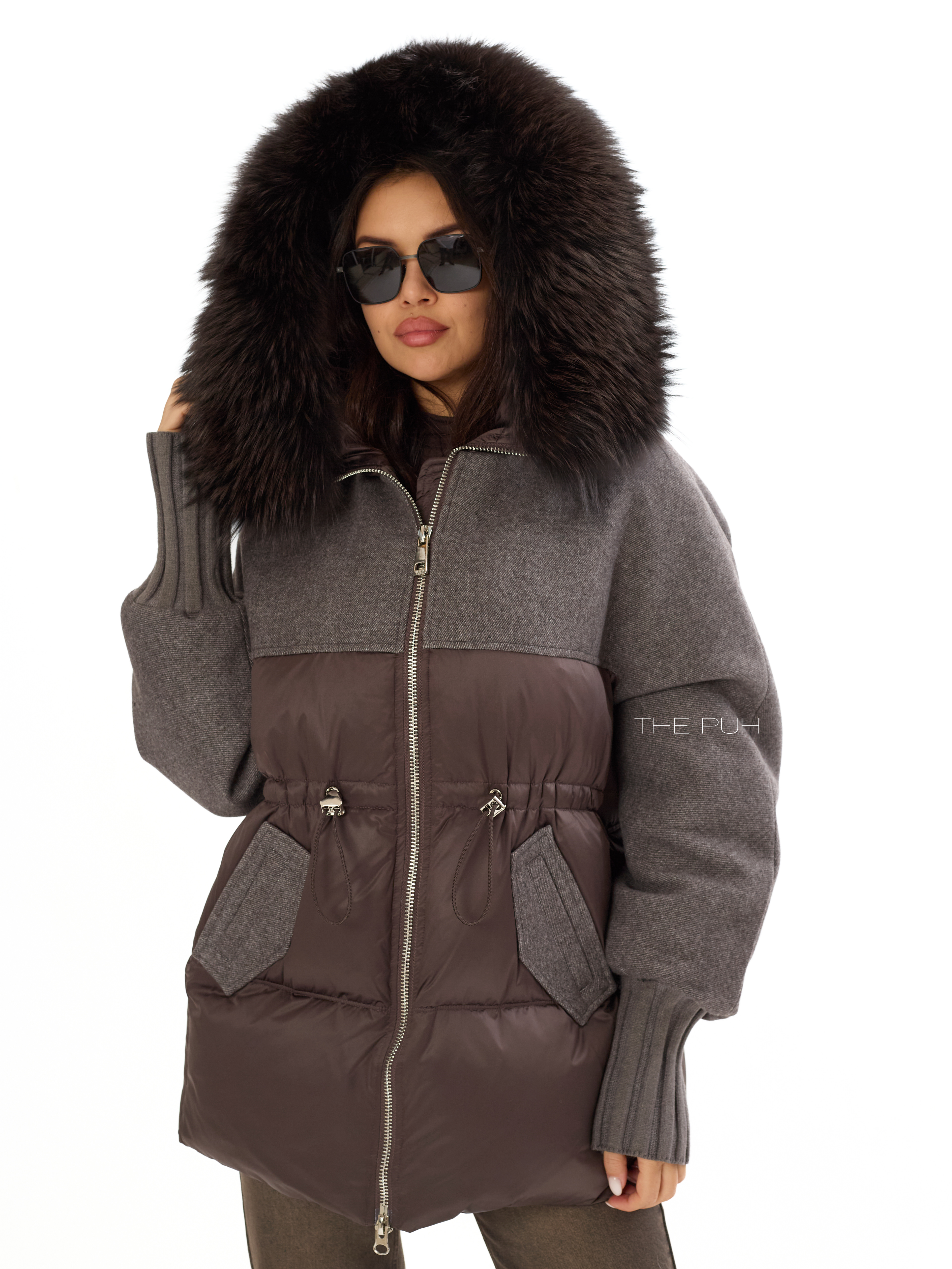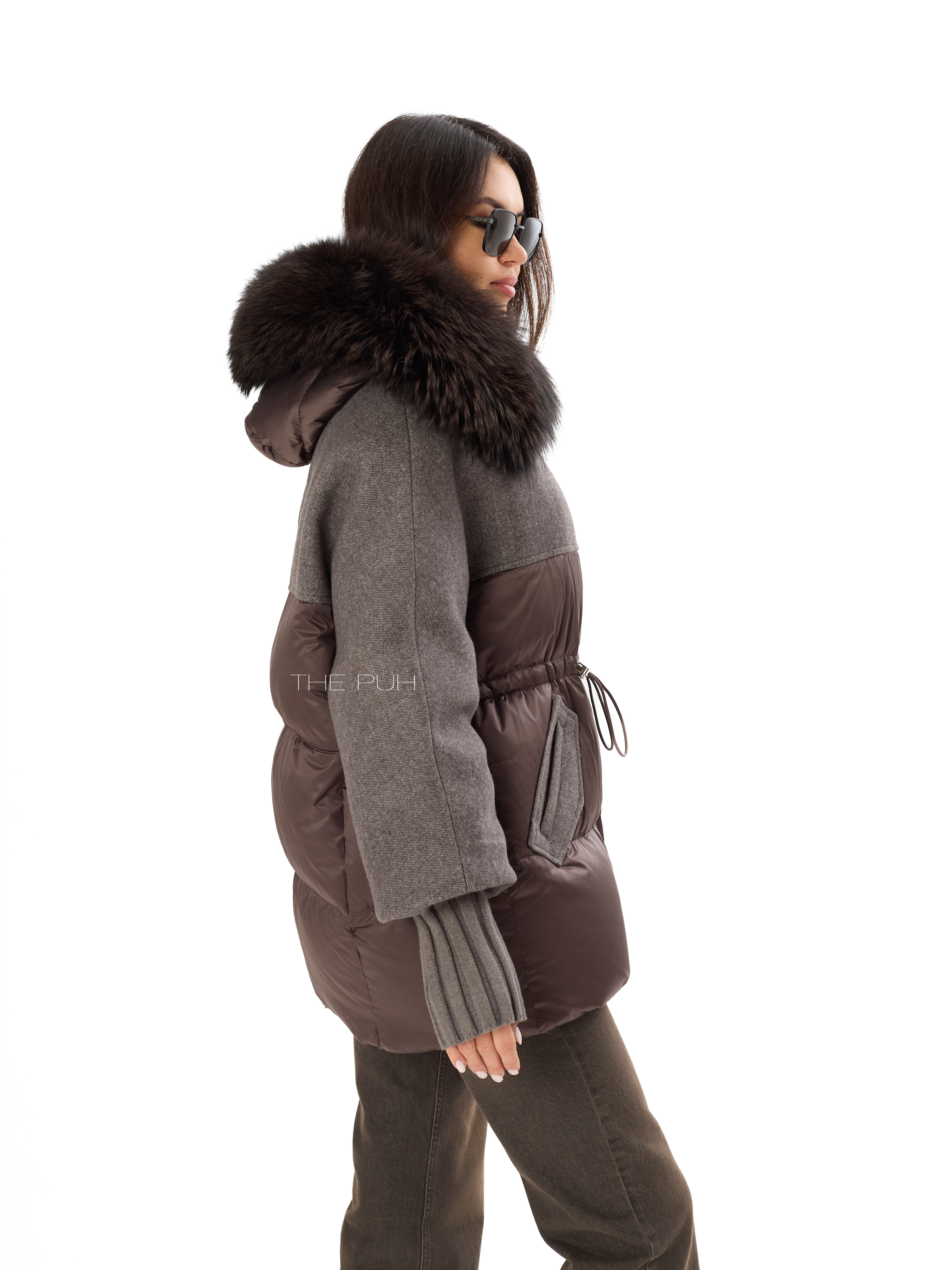 Удлиненный шоколадный пуховик выполнен из комбинированных материалов и и утеплен натуральным гусиным пухом. Модель до середины бедра дополнена несъемным теплым капюшоном с мехом енота и удлиненными трикотажными манжетами на рукавах.