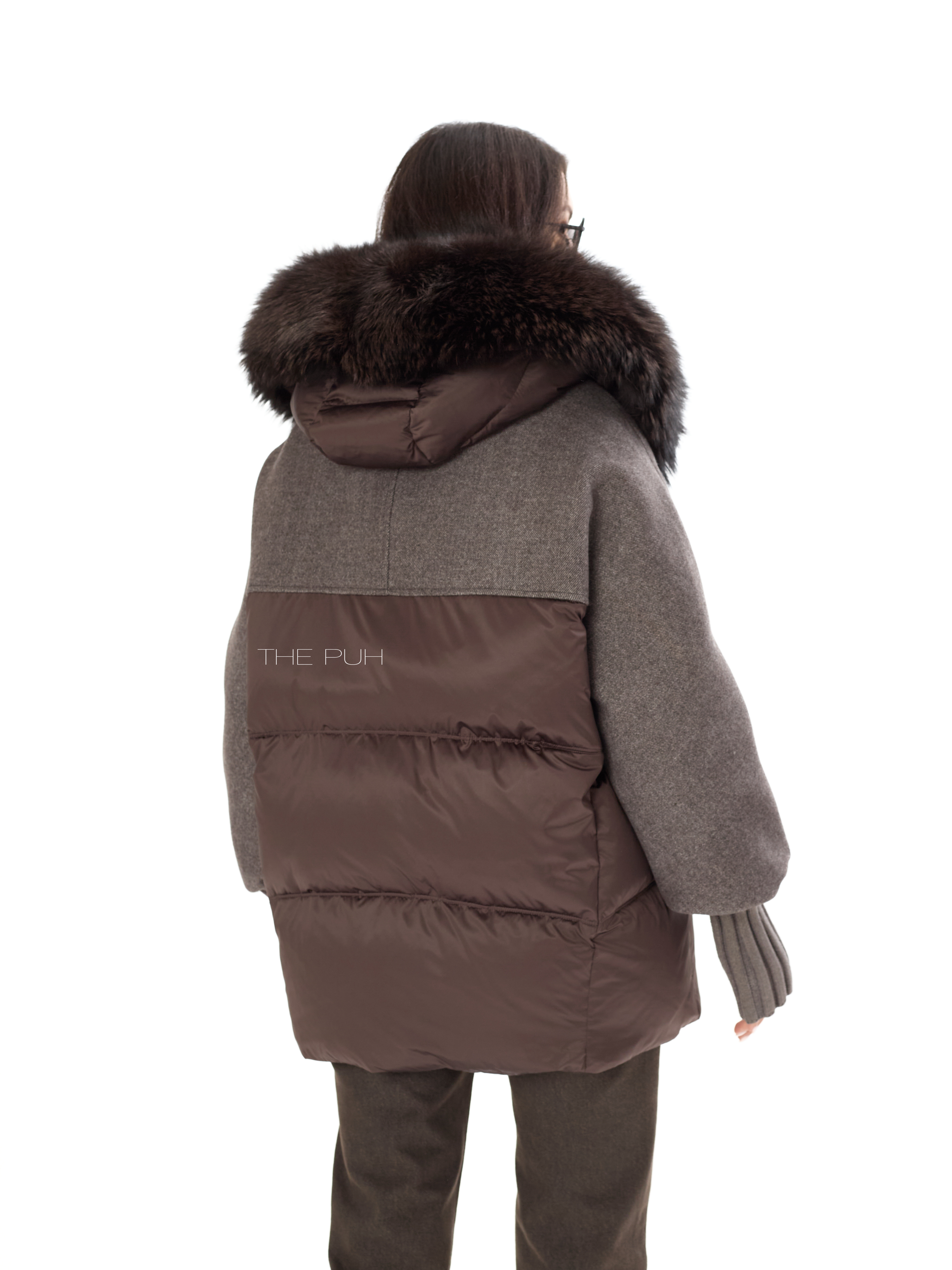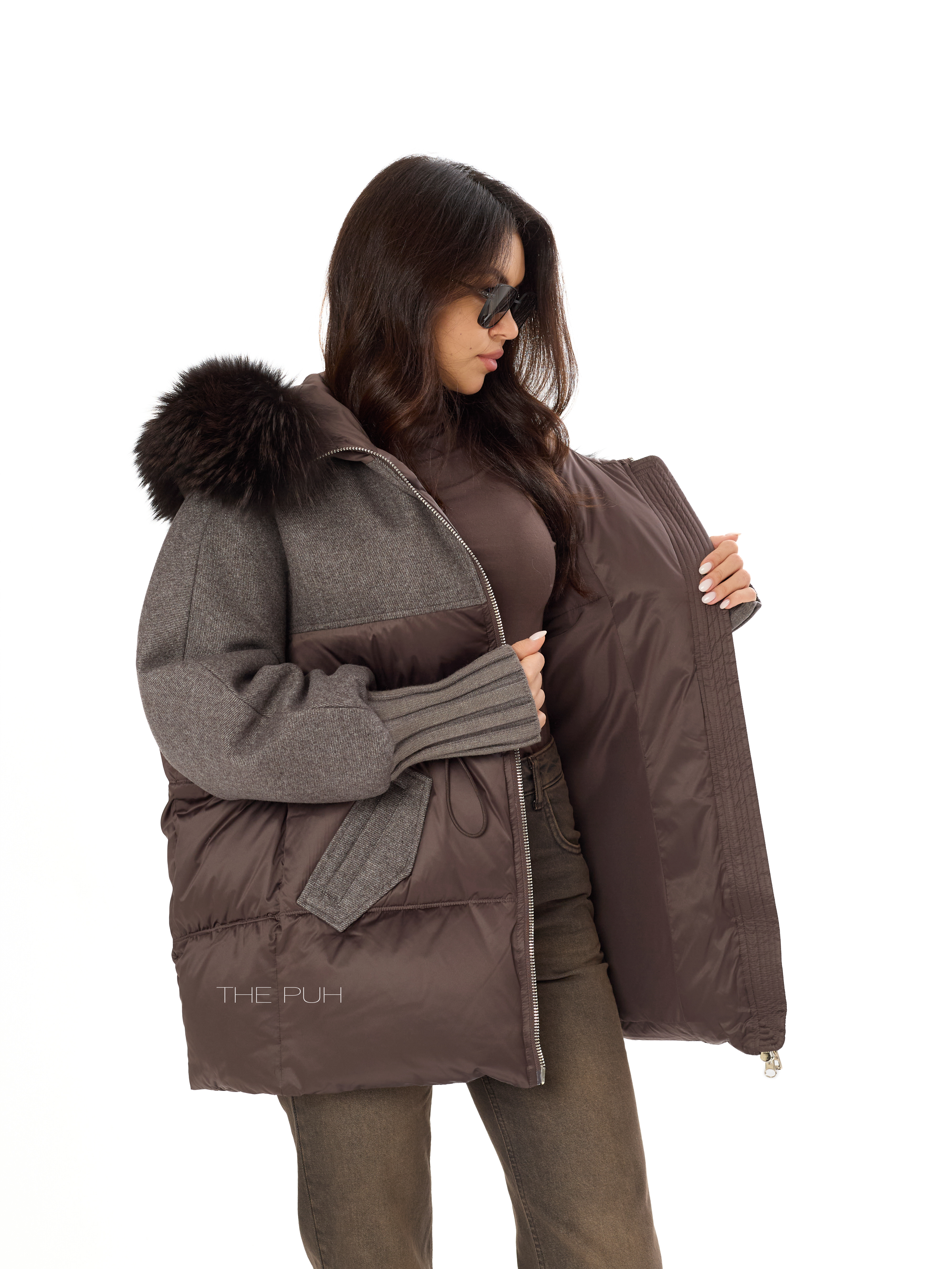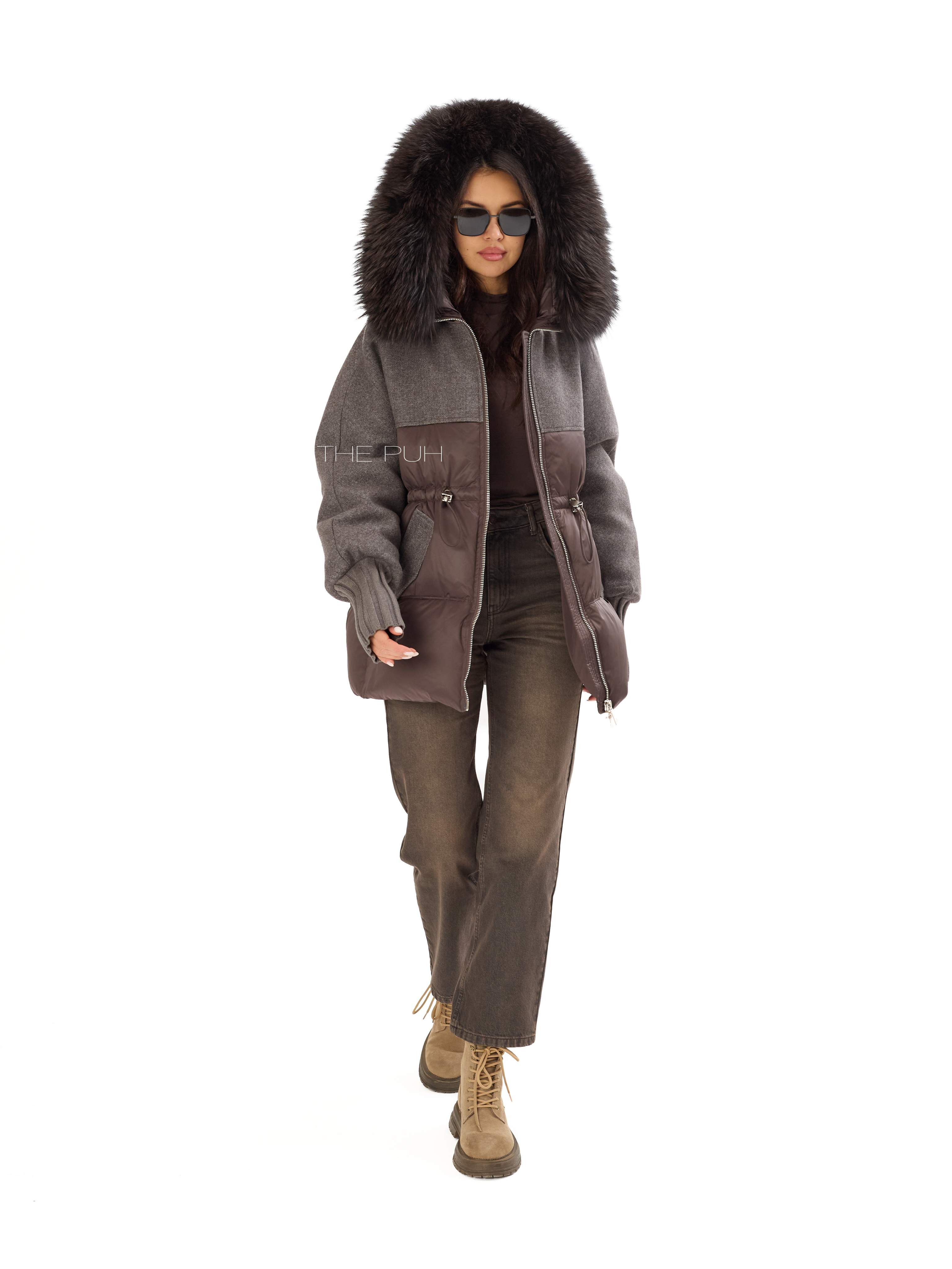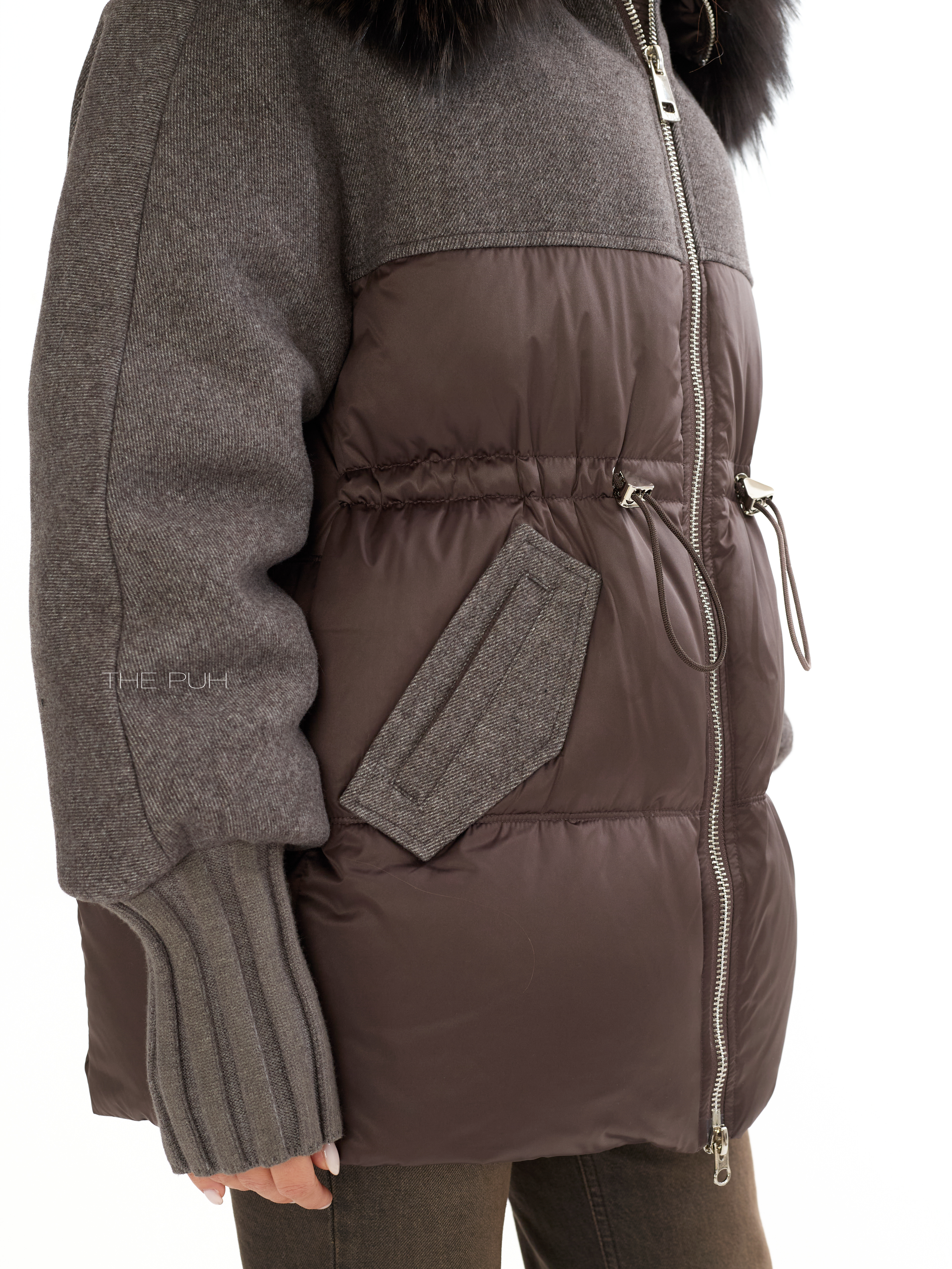 Удлиненный шоколадный пуховик выполнен из комбинированных материалов и и утеплен натуральным гусиным пухом. Модель до середины бедра дополнена несъемным теплым капюшоном с мехом енота и удлиненными трикотажными манжетами на рукавах.