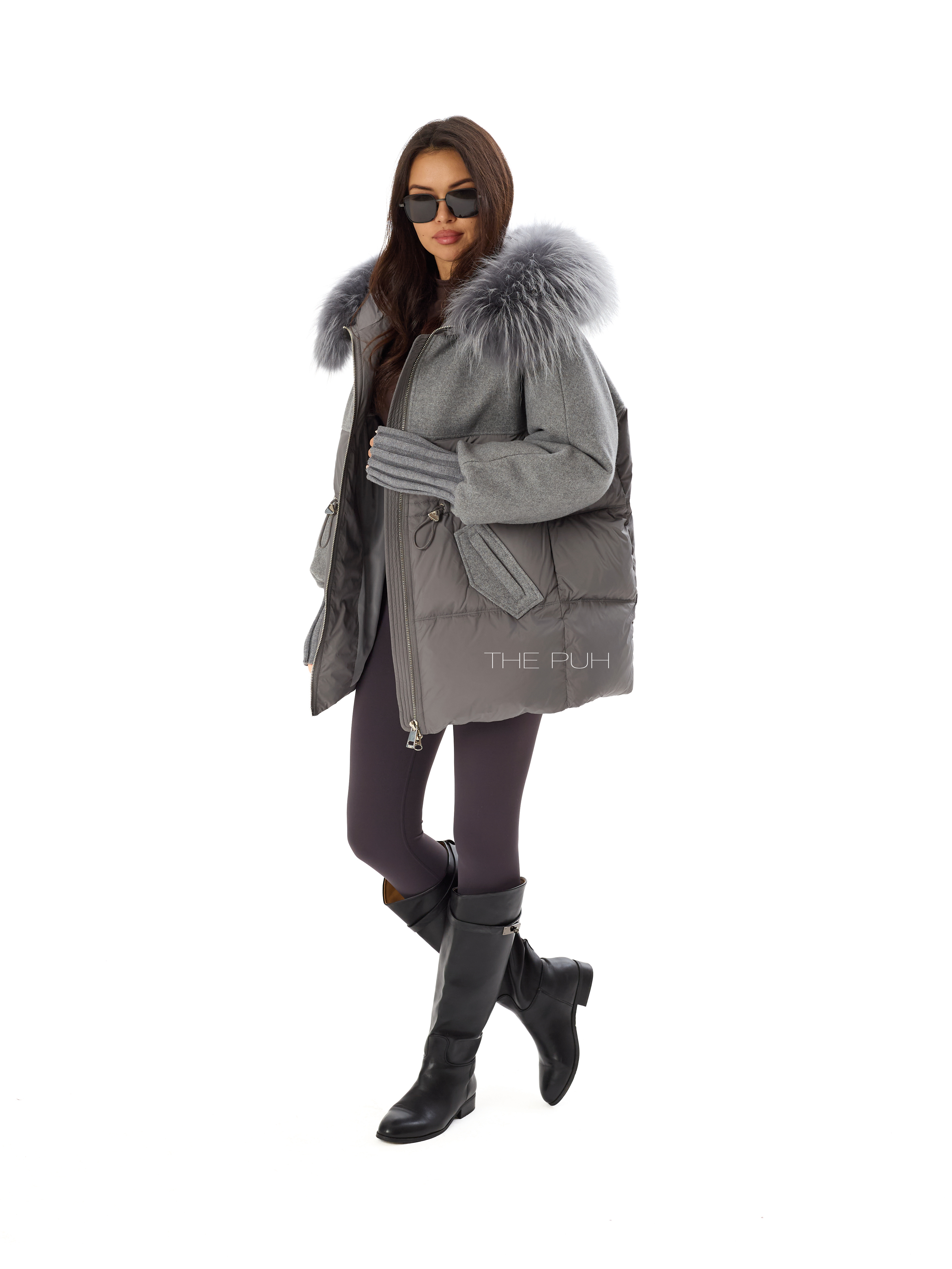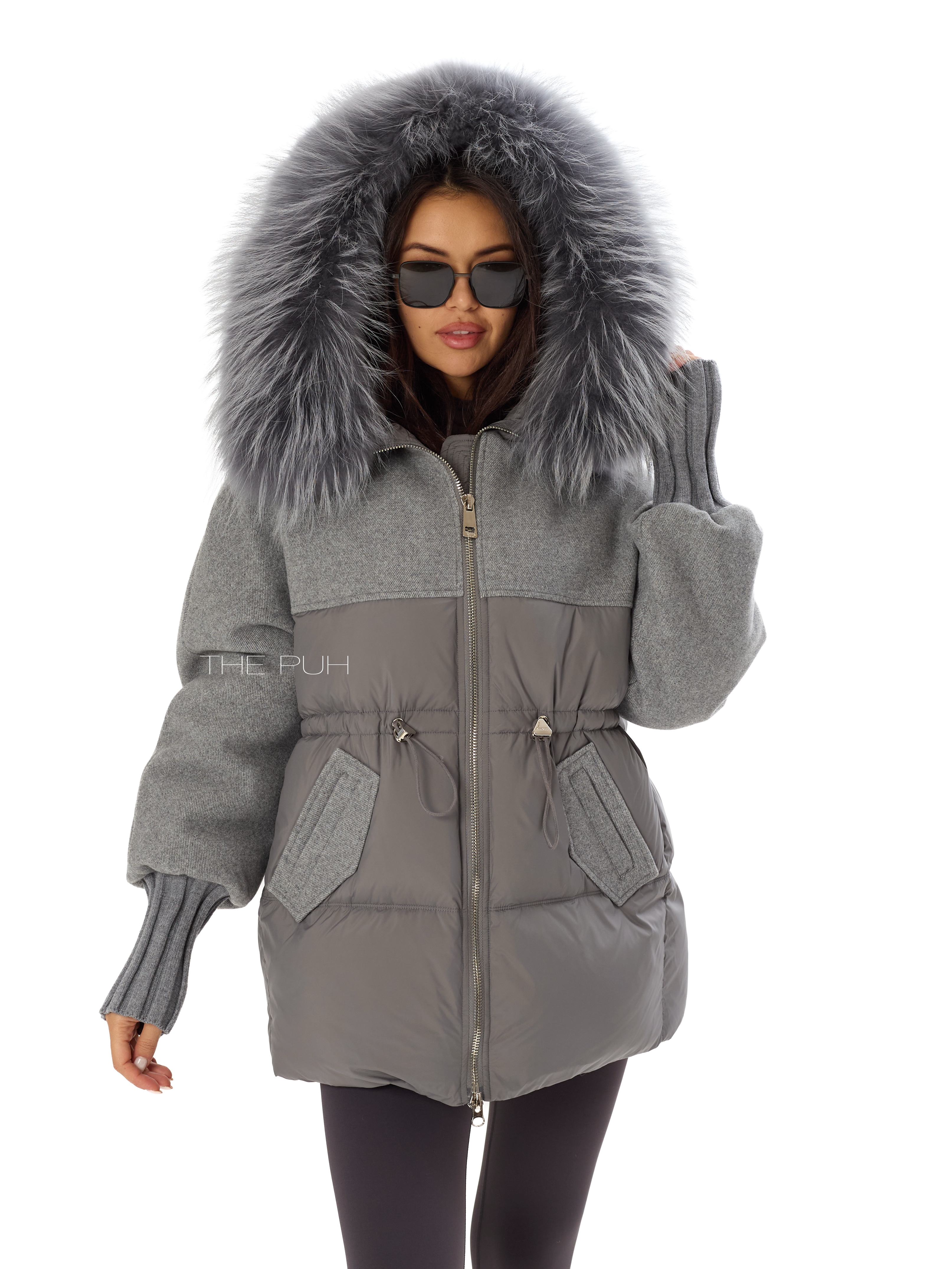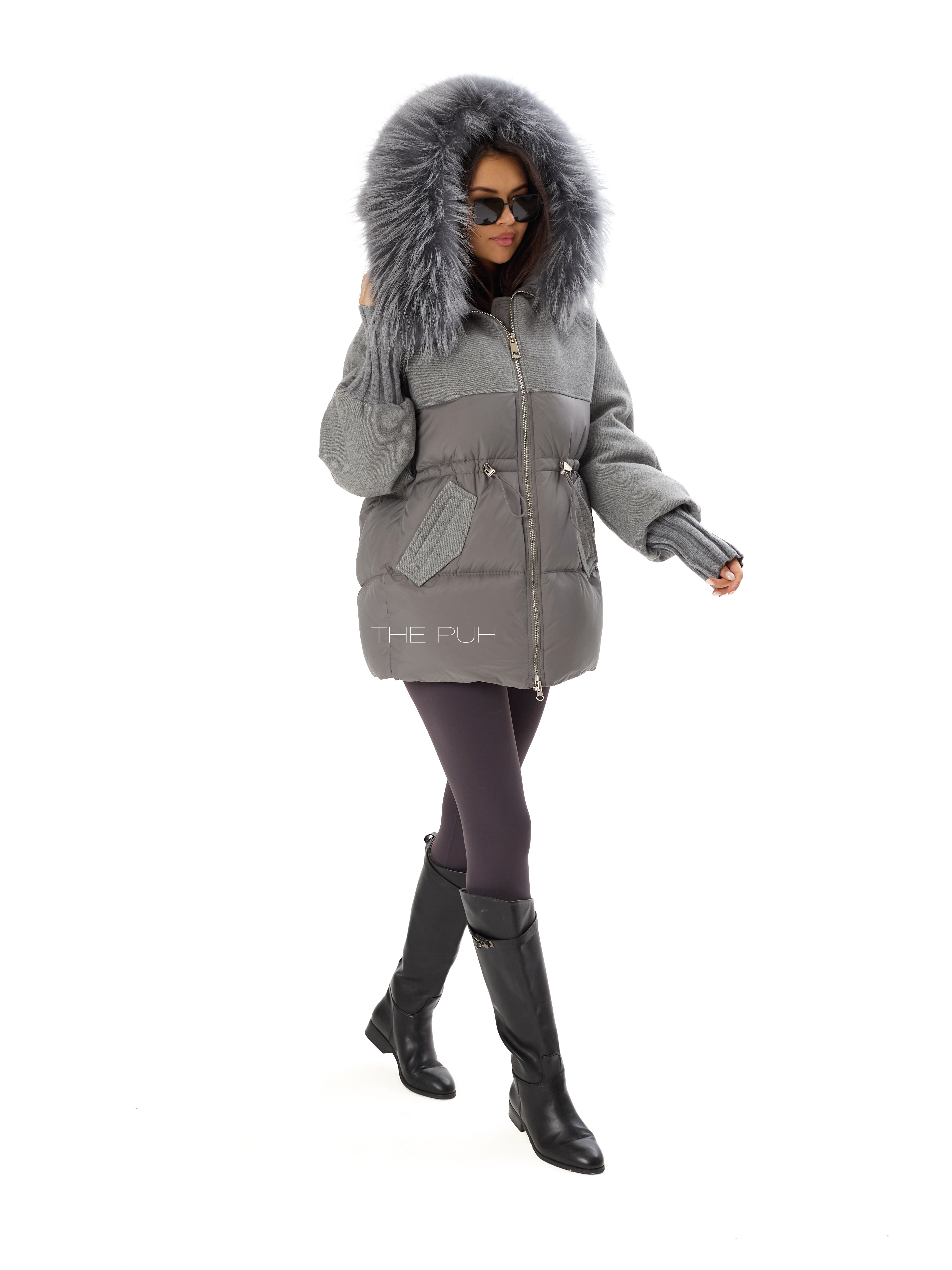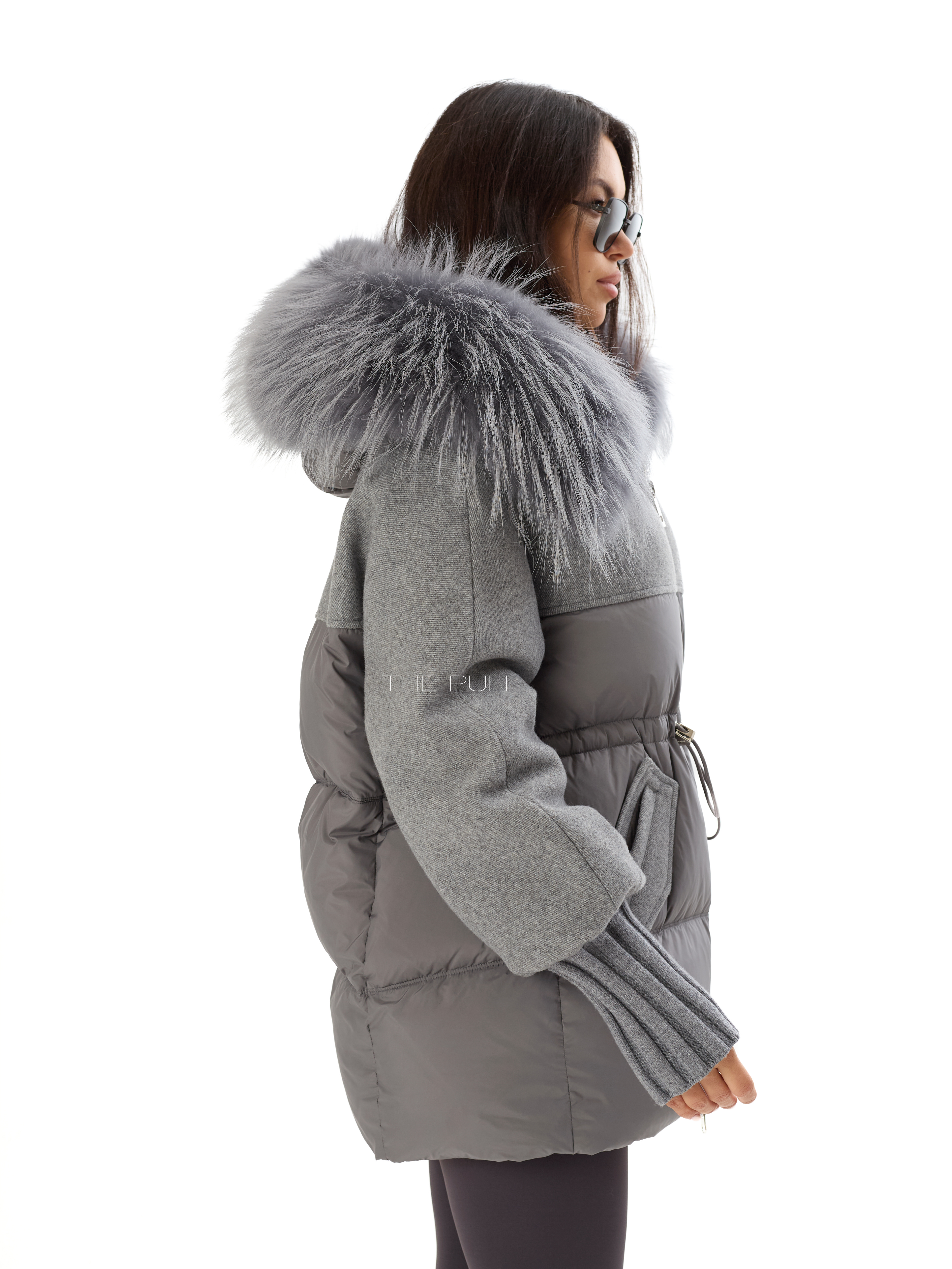 Удлиненный серый пуховик выполнен из комбинированных материалов и и утеплен натуральным гусиным пухом. Модель до середины бедра дополнена несъемным теплым капюшоном с мехом енота и удлиненными трикотажными манжетами на рукавах.