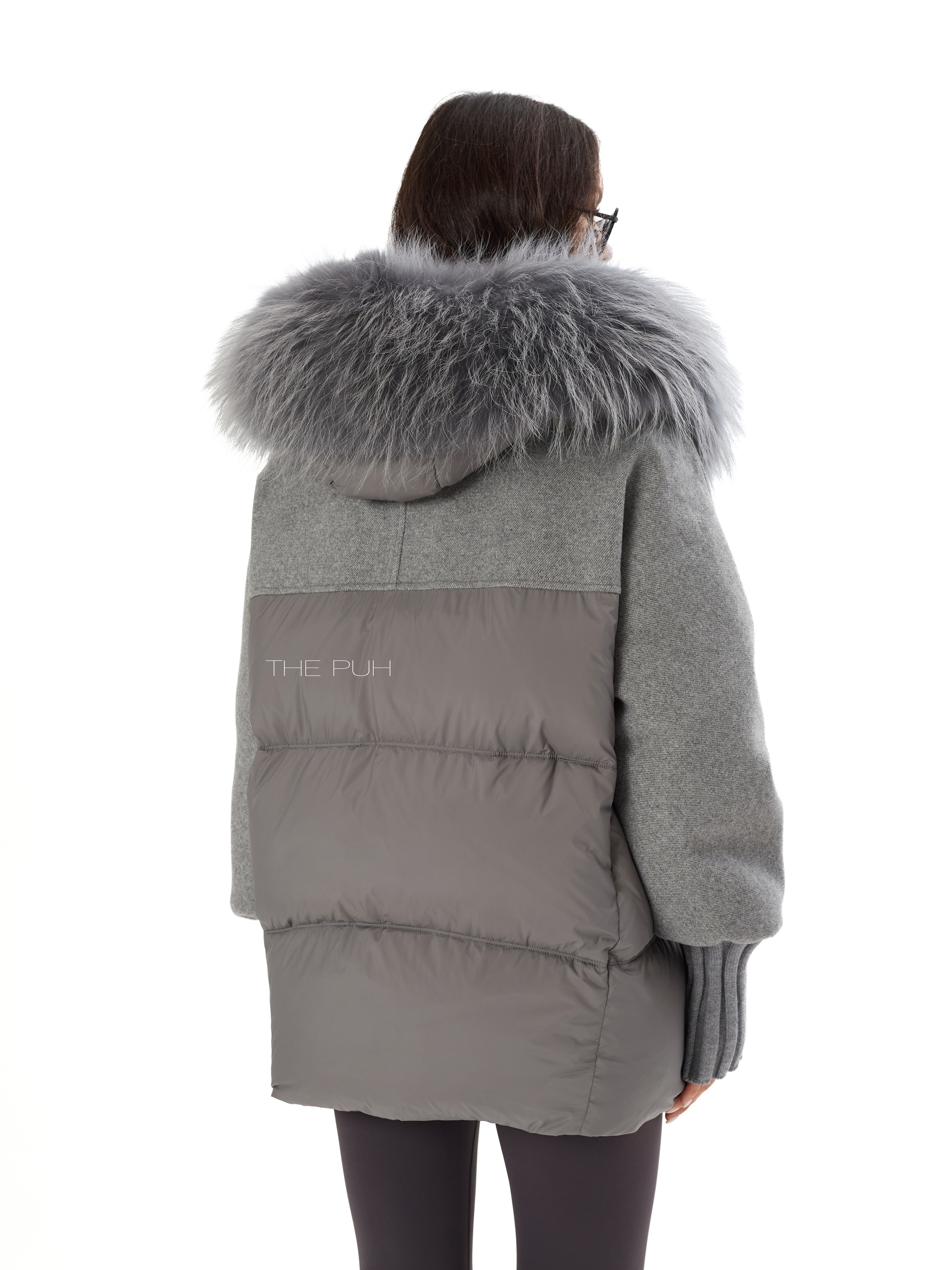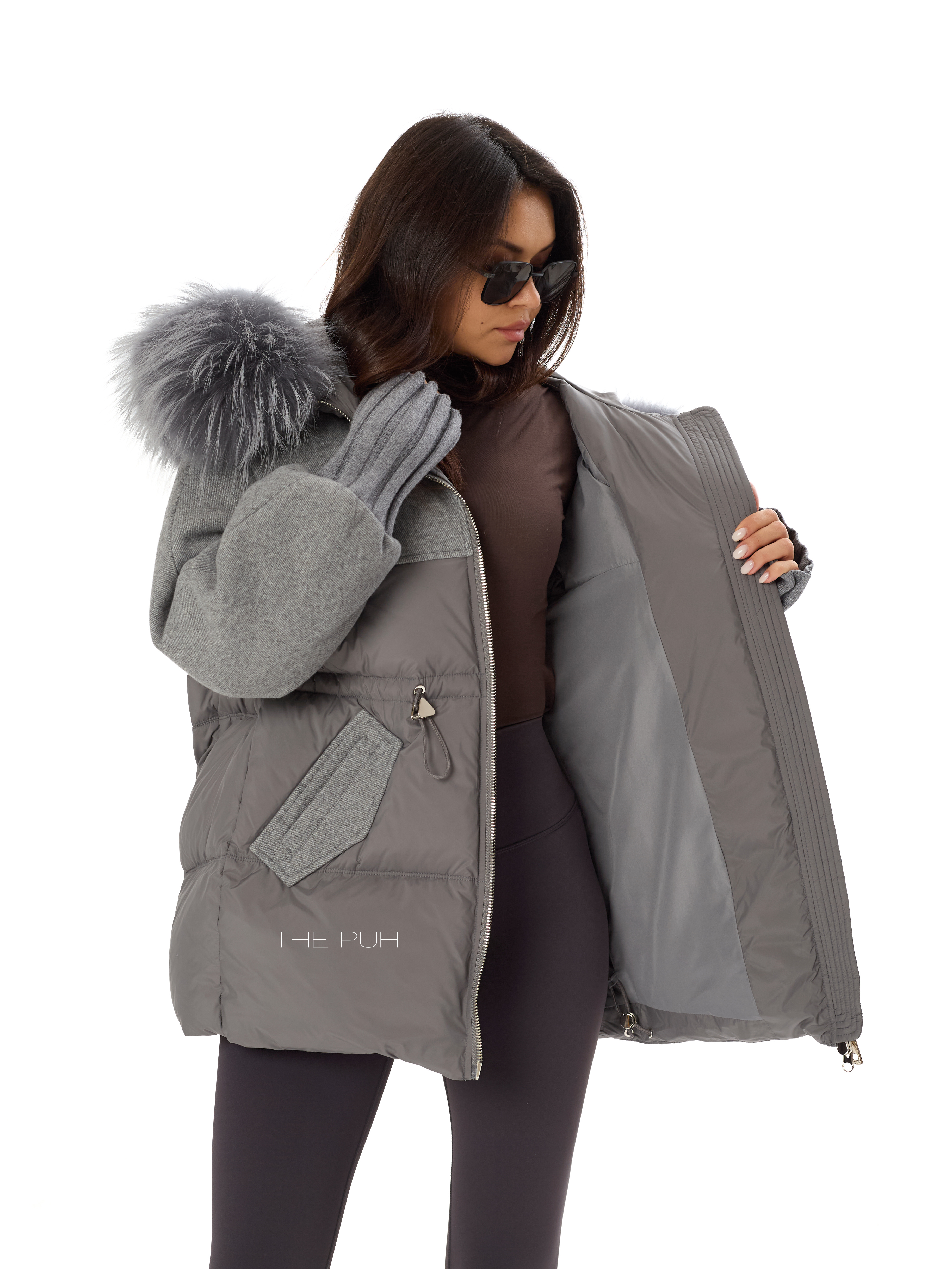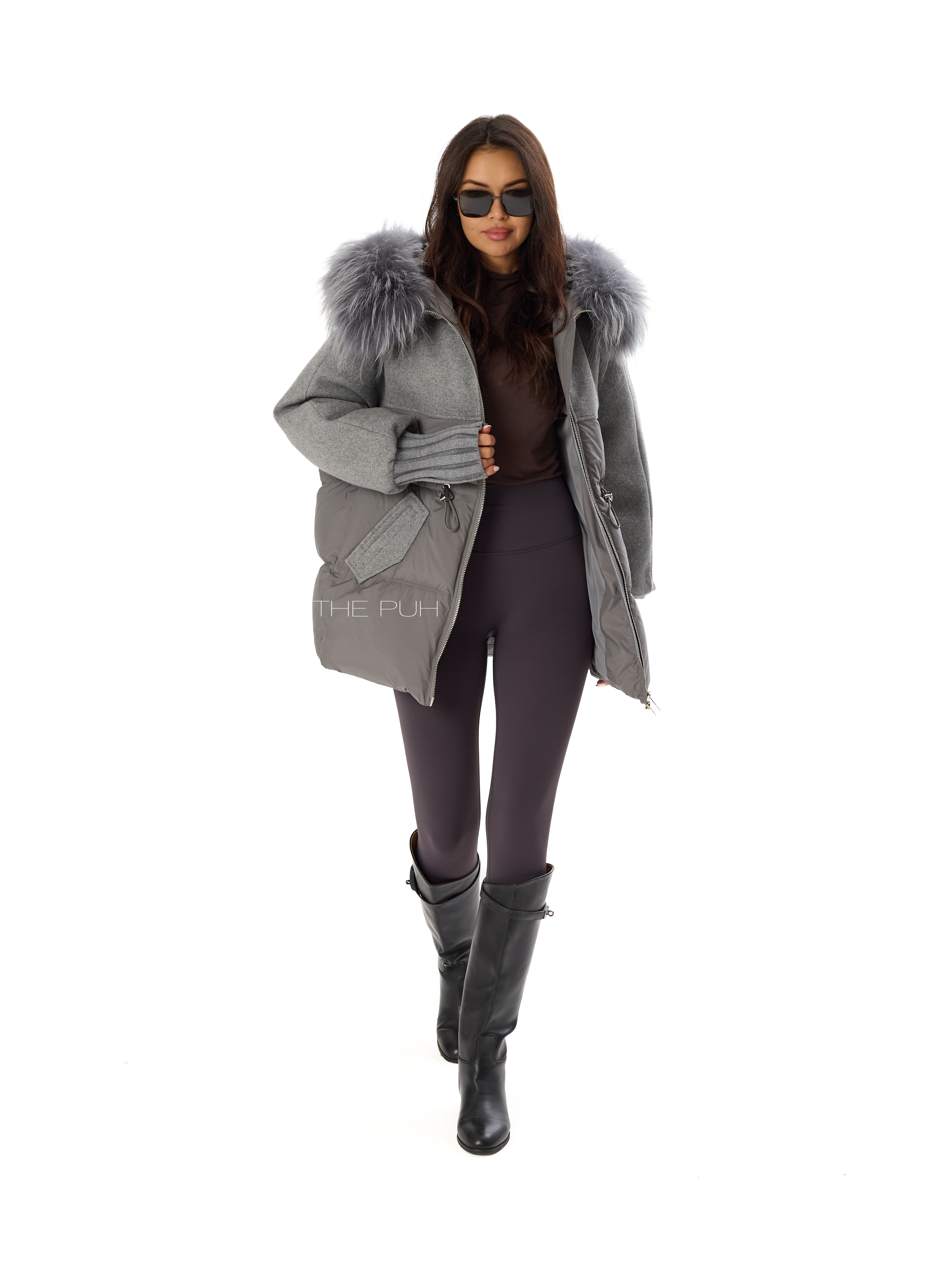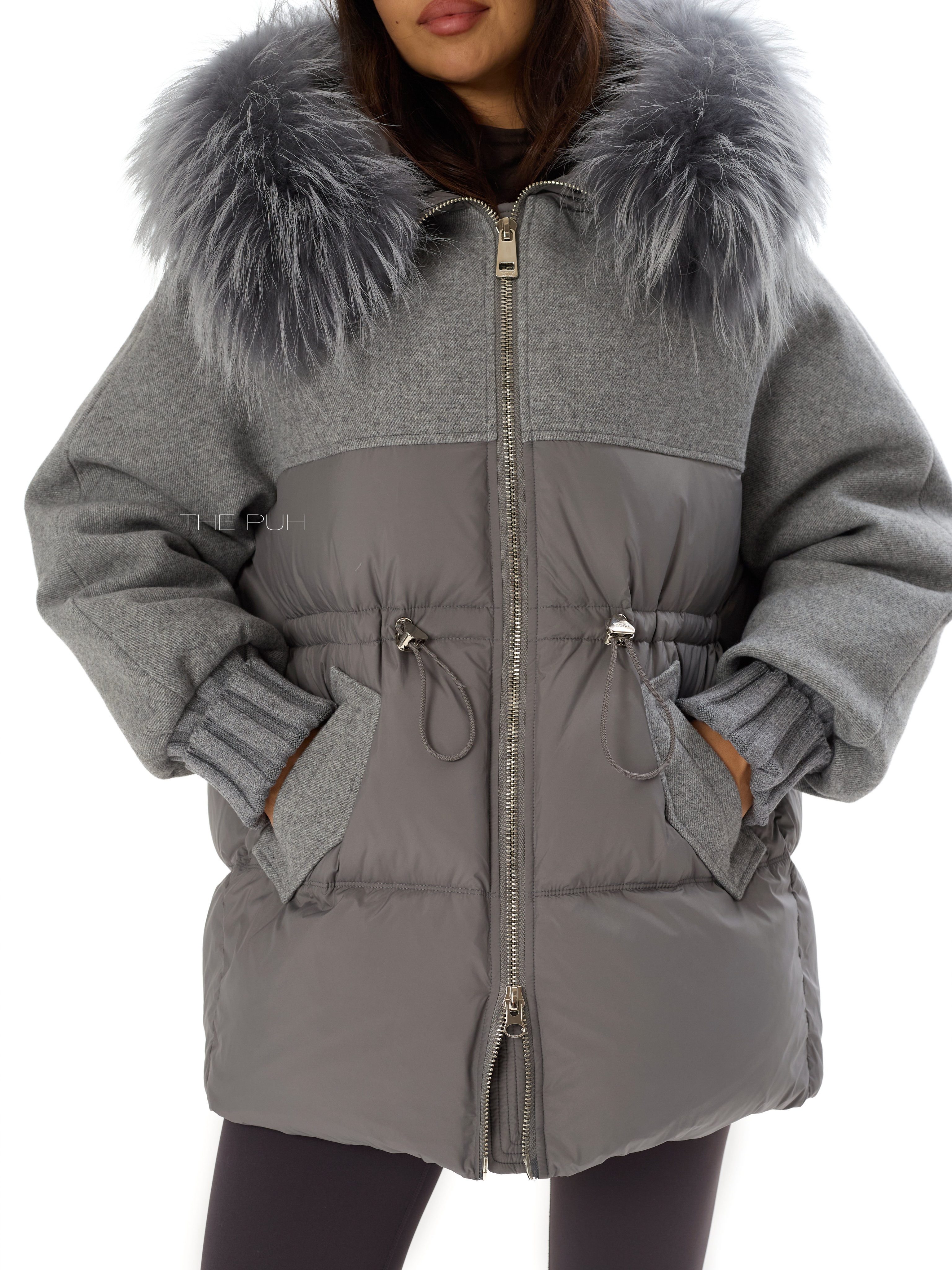 Удлиненный серый пуховик выполнен из комбинированных материалов и и утеплен натуральным гусиным пухом. Модель до середины бедра дополнена несъемным теплым капюшоном с мехом енота и удлиненными трикотажными манжетами на рукавах.