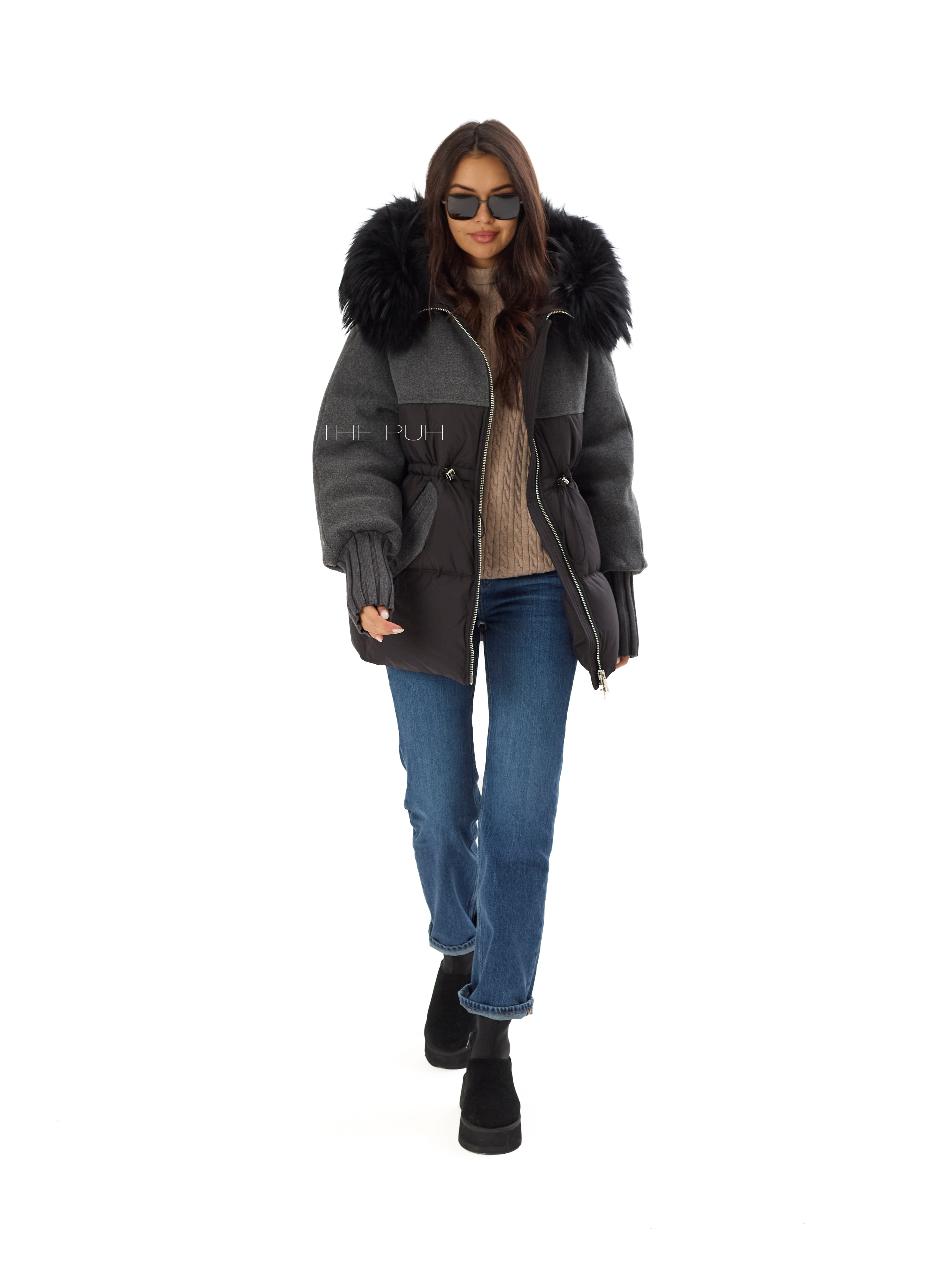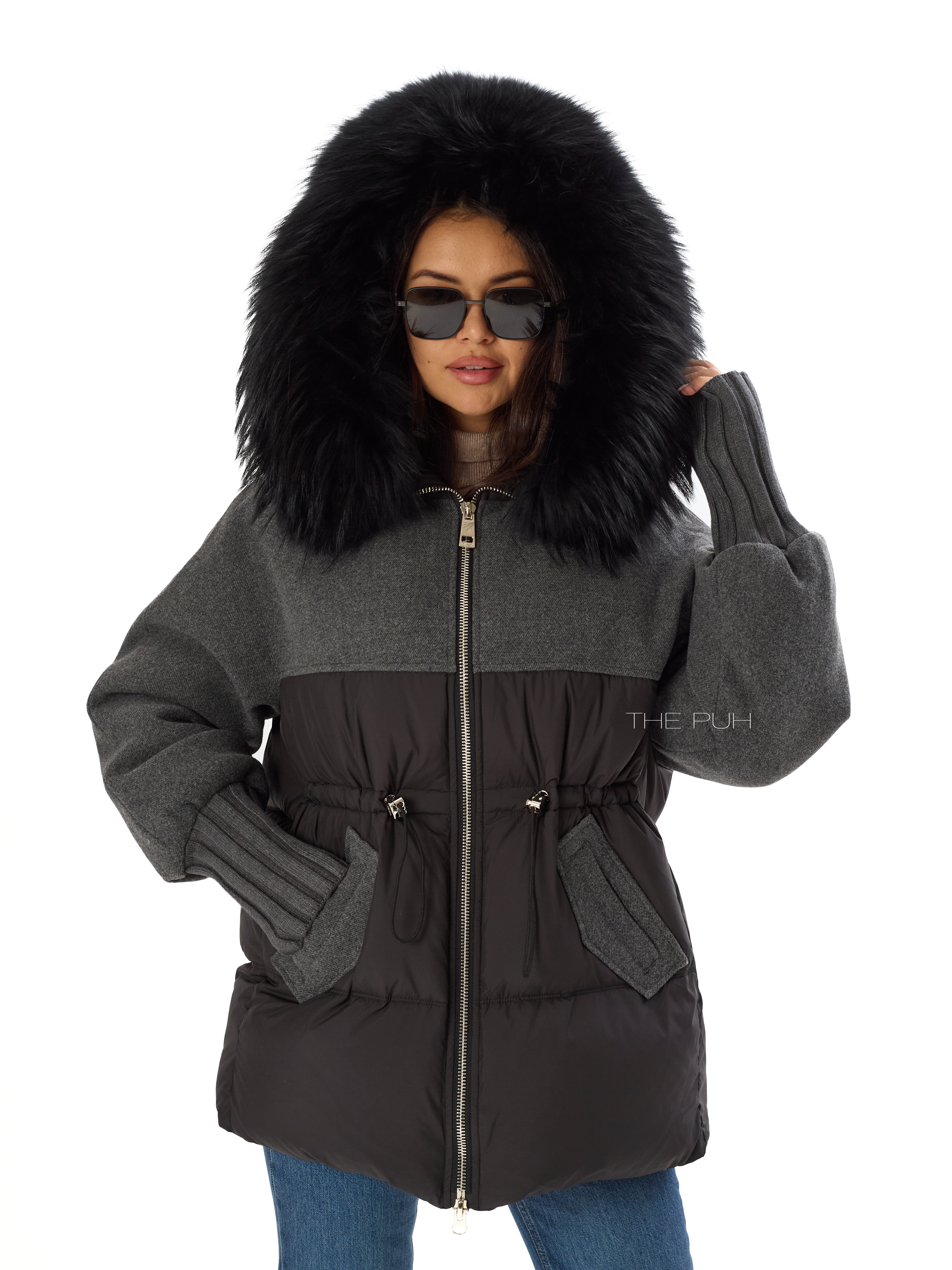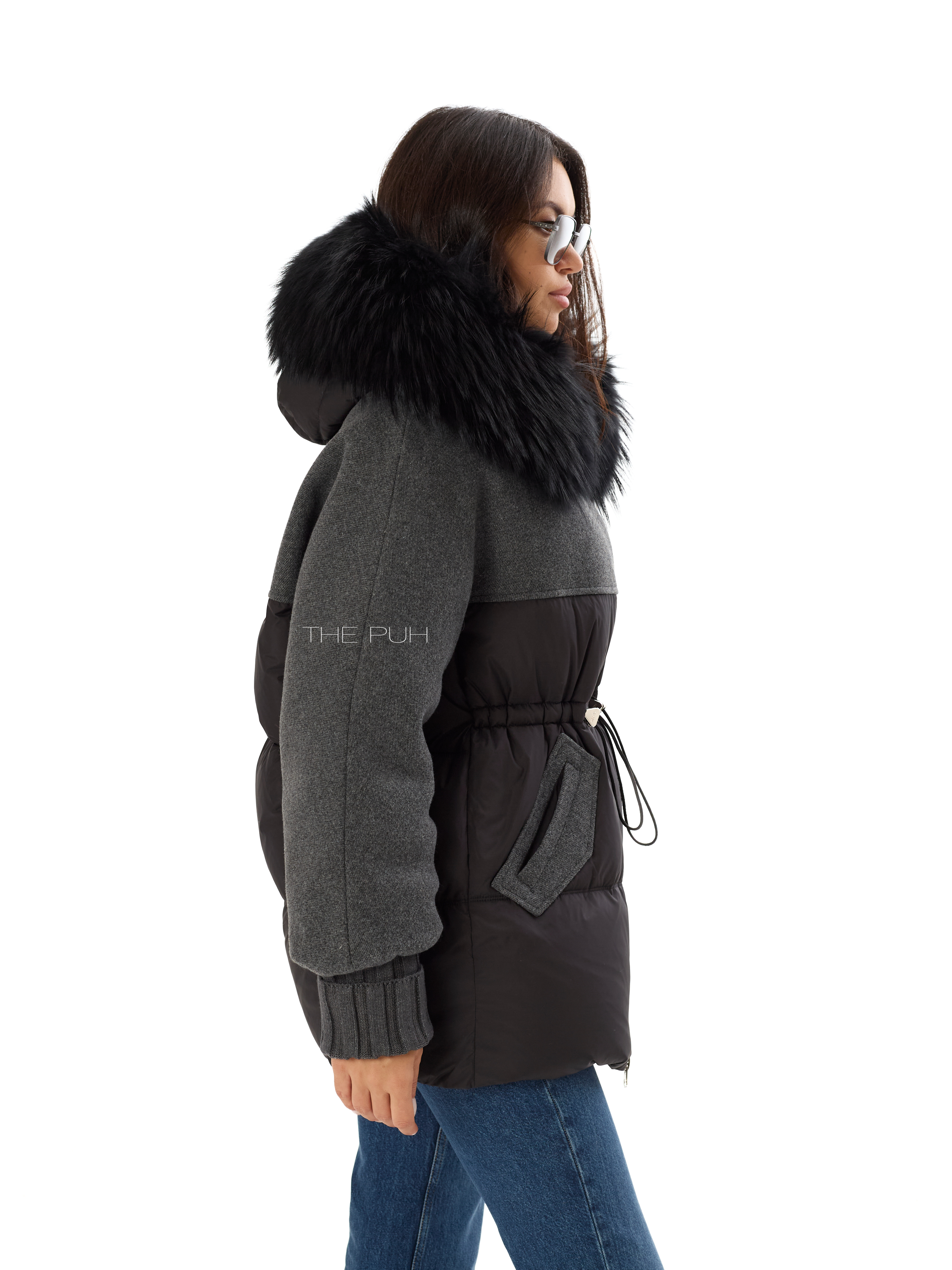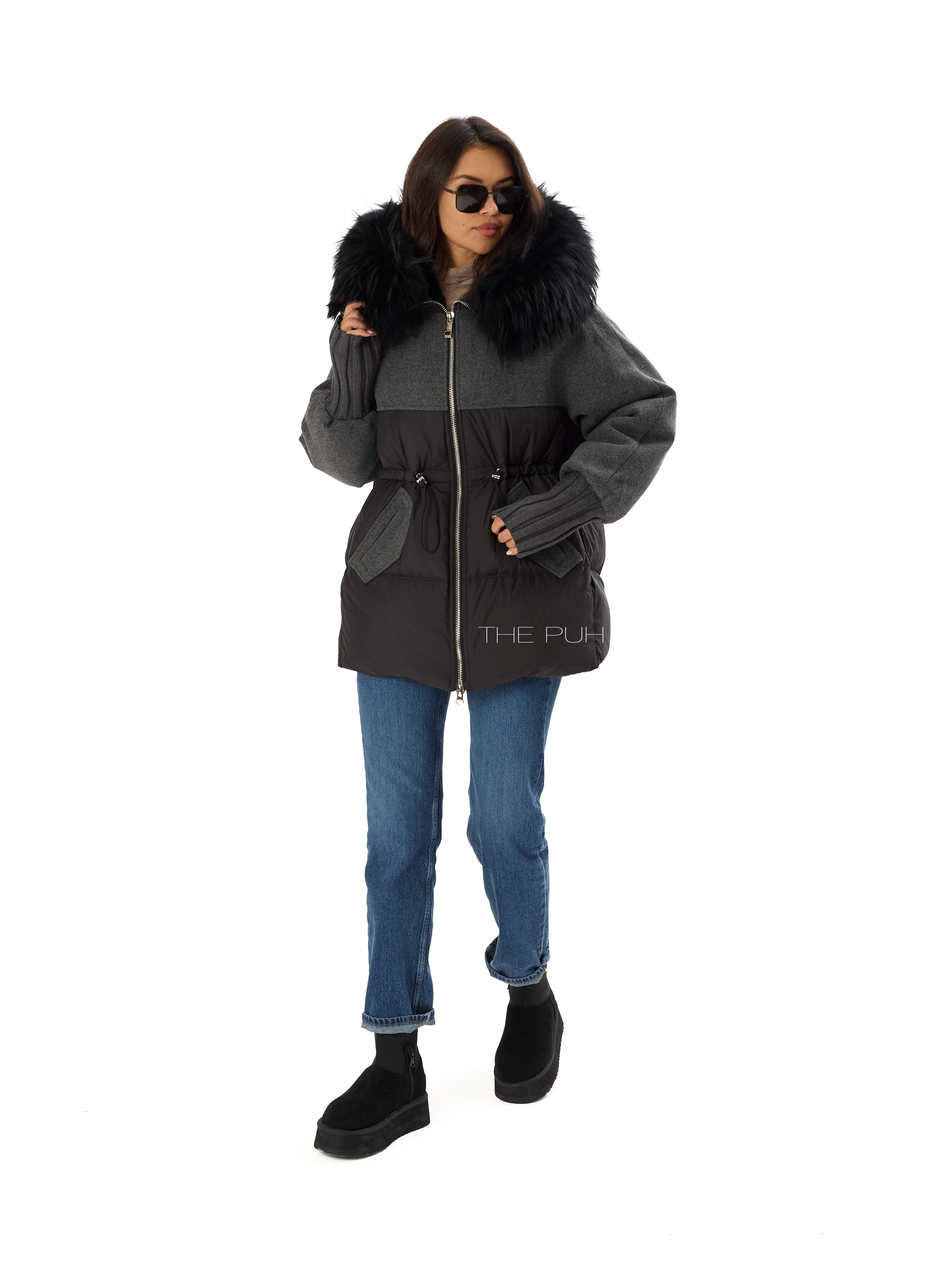 Удлиненный черный пуховик выполнен из комбинированных материалов и и утеплен натуральным гусиным пухом. Модель до середины бедра дополнена несъемным теплым капюшоном с мехом енота и удлиненными трикотажными манжетами на рукавах.