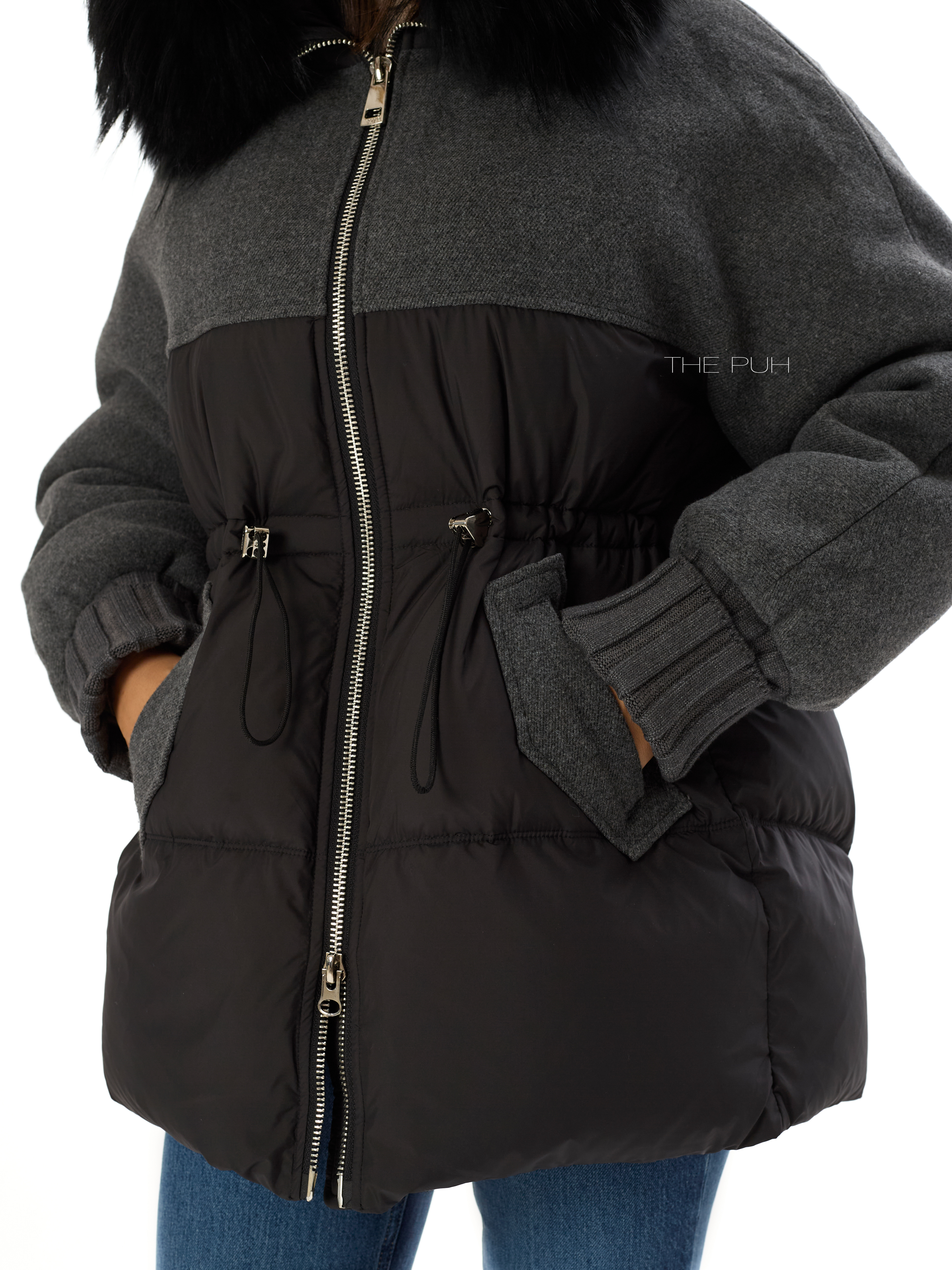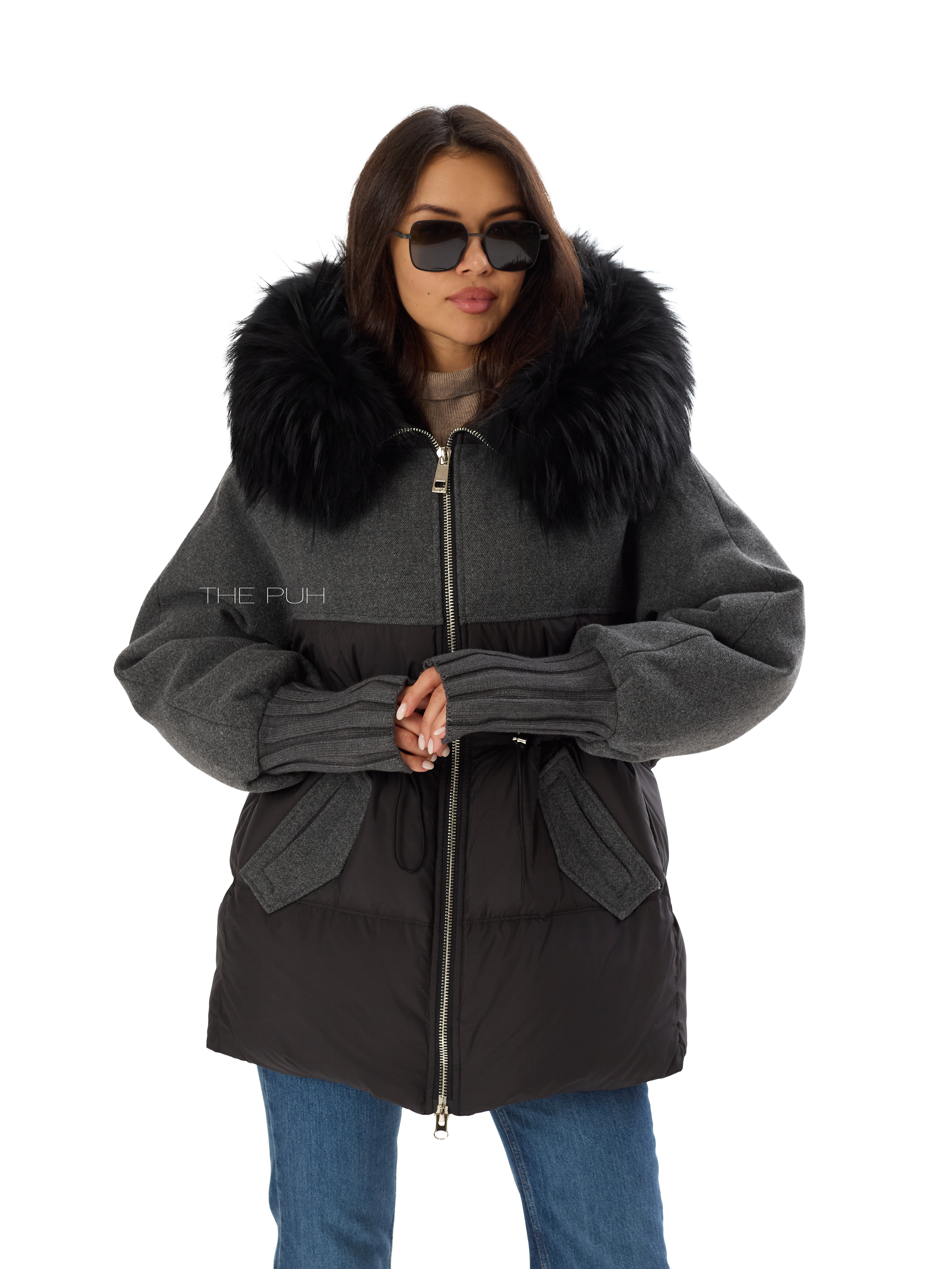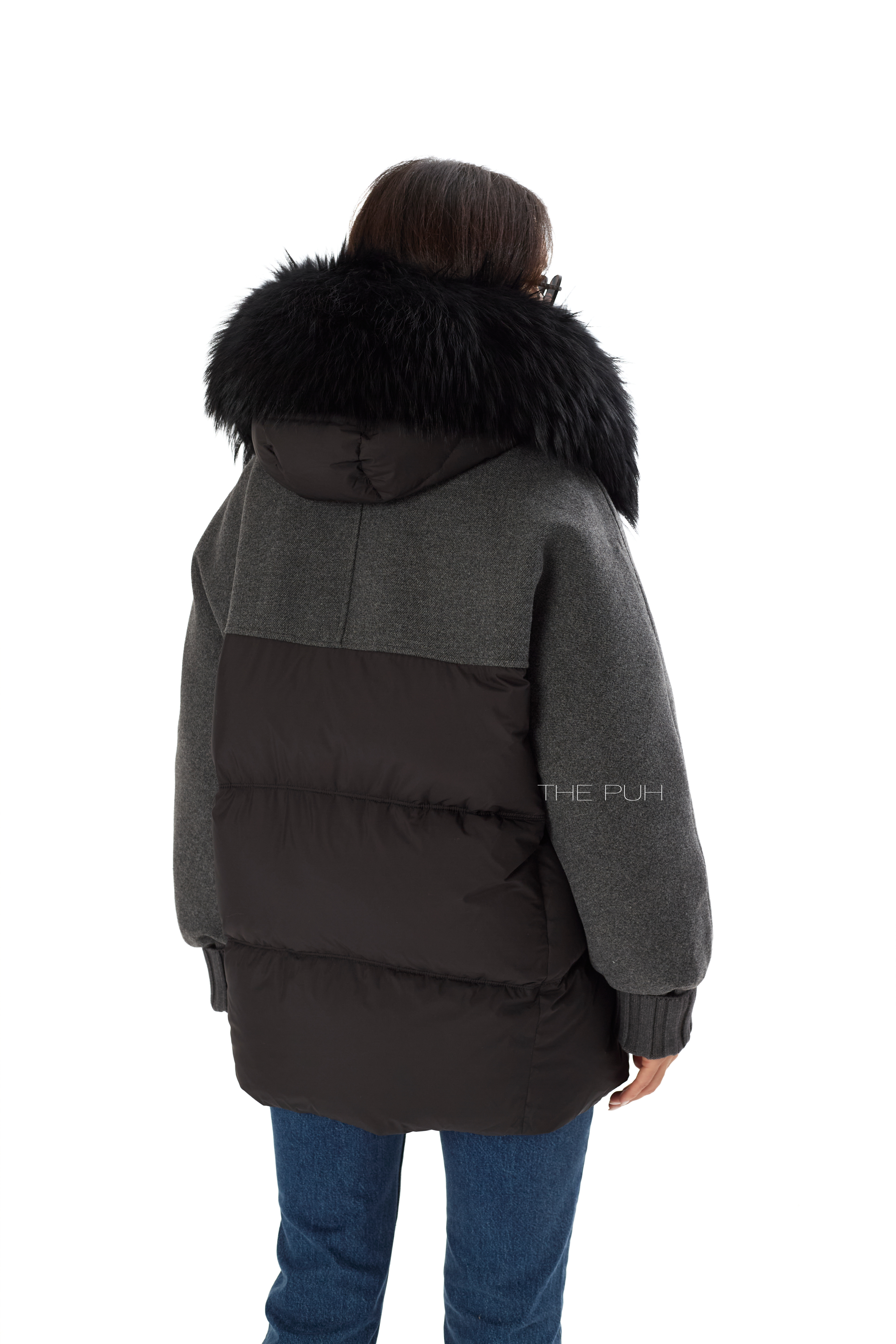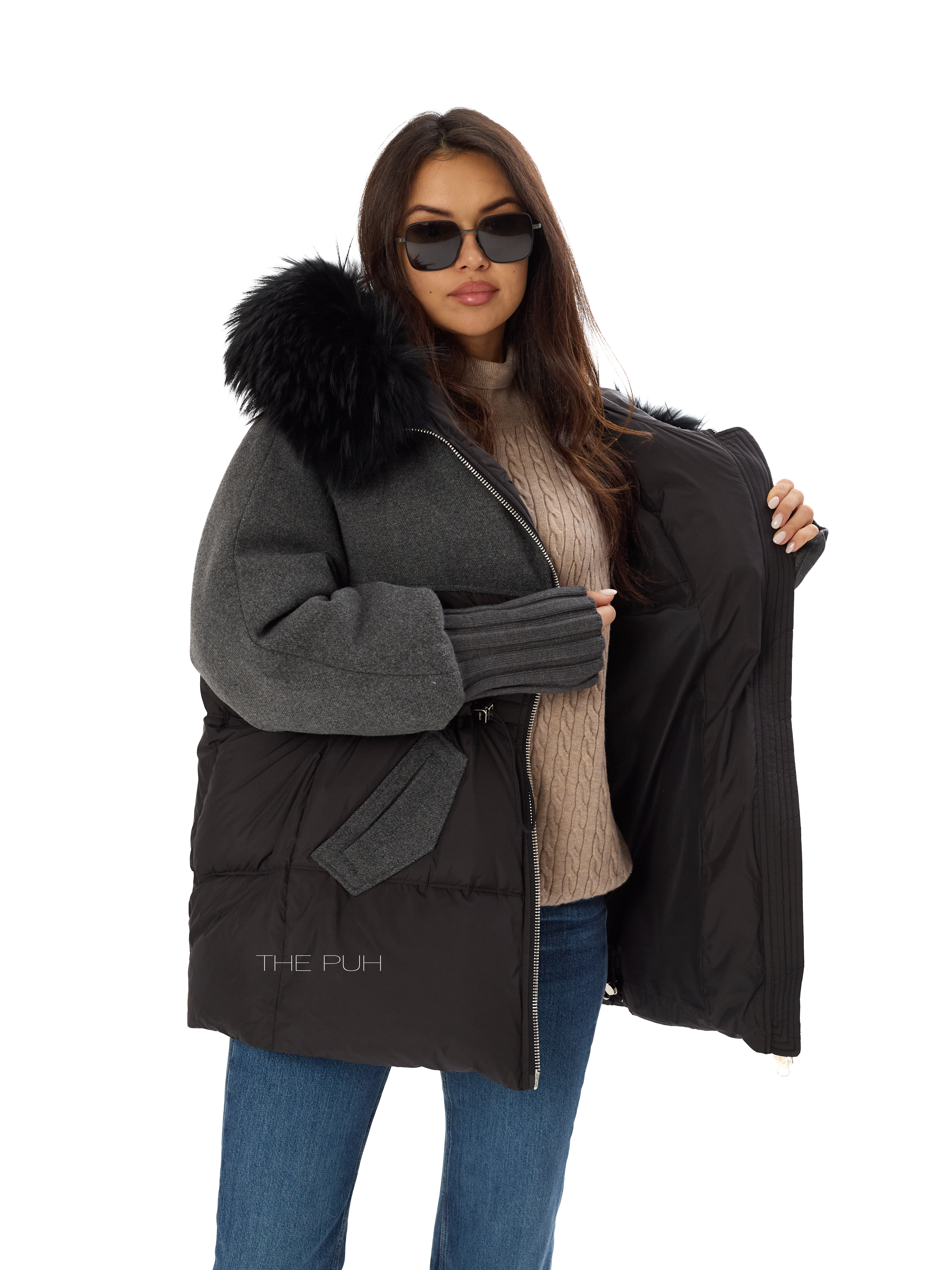 Удлиненный черный пуховик выполнен из комбинированных материалов и и утеплен натуральным гусиным пухом. Модель до середины бедра дополнена несъемным теплым капюшоном с мехом енота и удлиненными трикотажными манжетами на рукавах.
