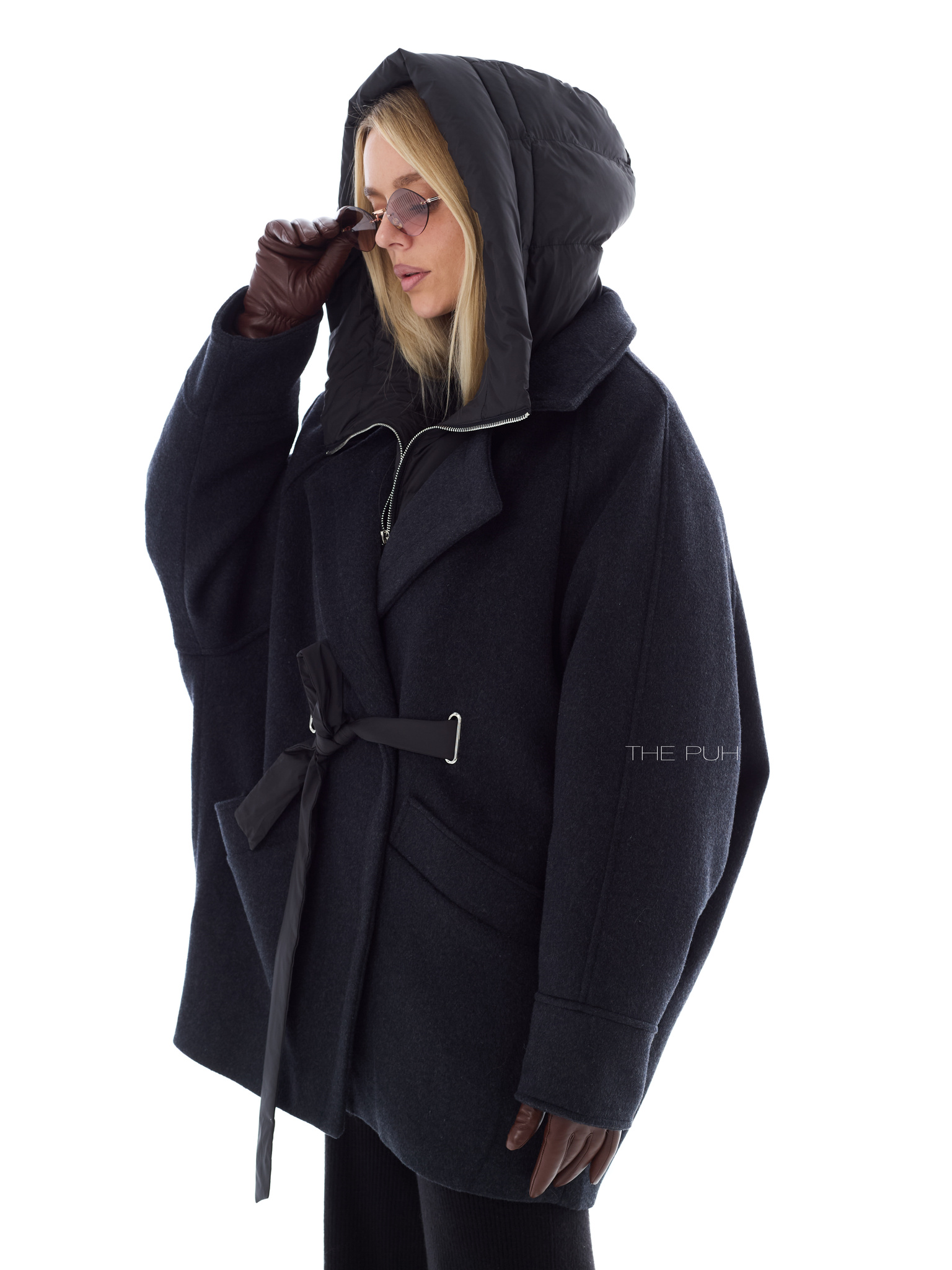 Черное пальто силуэта "летучая мышь" со съемной манишкой и поясом – стильная модель, где утепленная манишка с капюшоном защищает от непогоды, а элегантный пояс подчеркивает силуэт. Теплый пуховый наполнитель и лаконичный дизайн делают его универсальным выбором для города.
