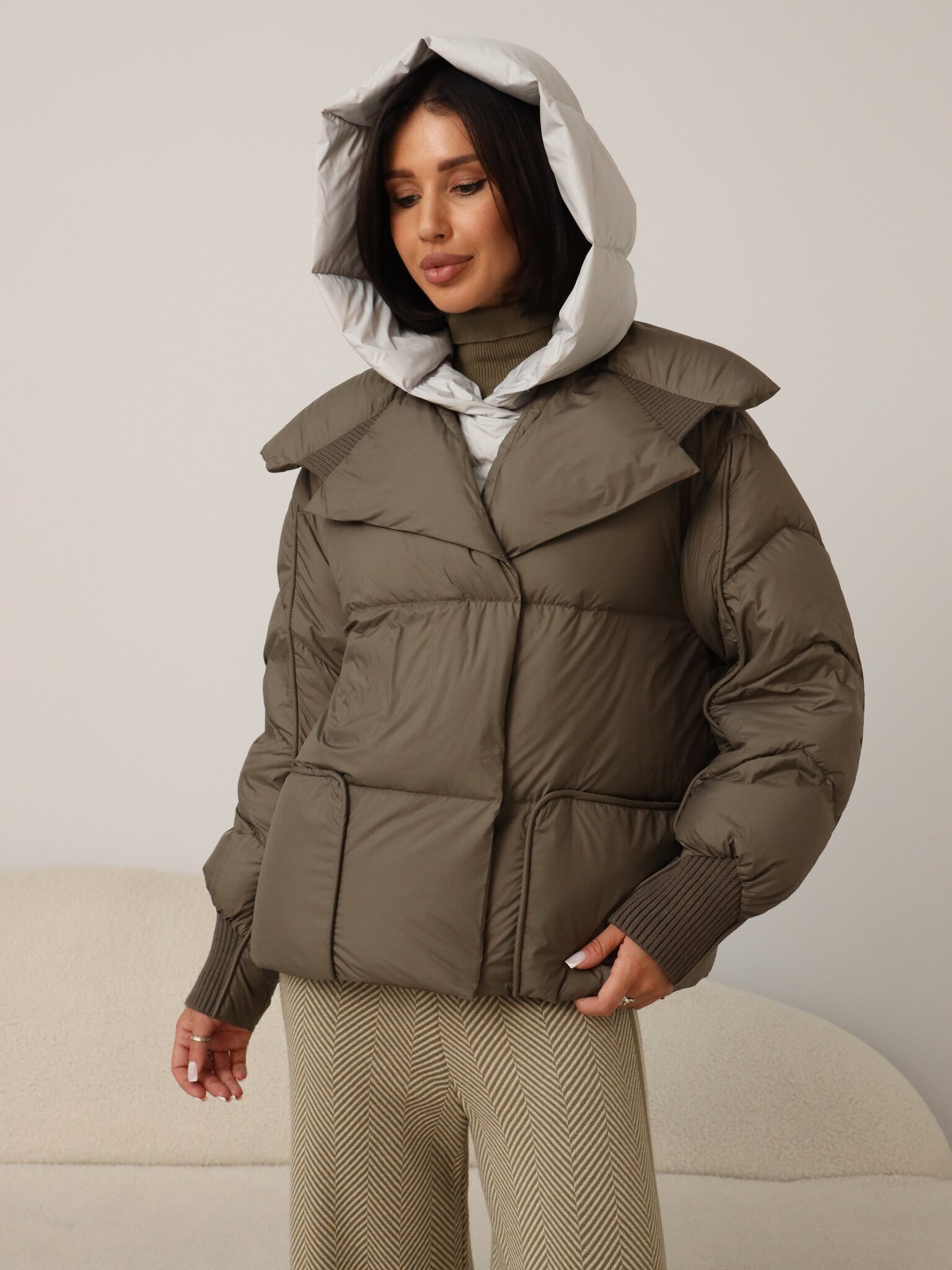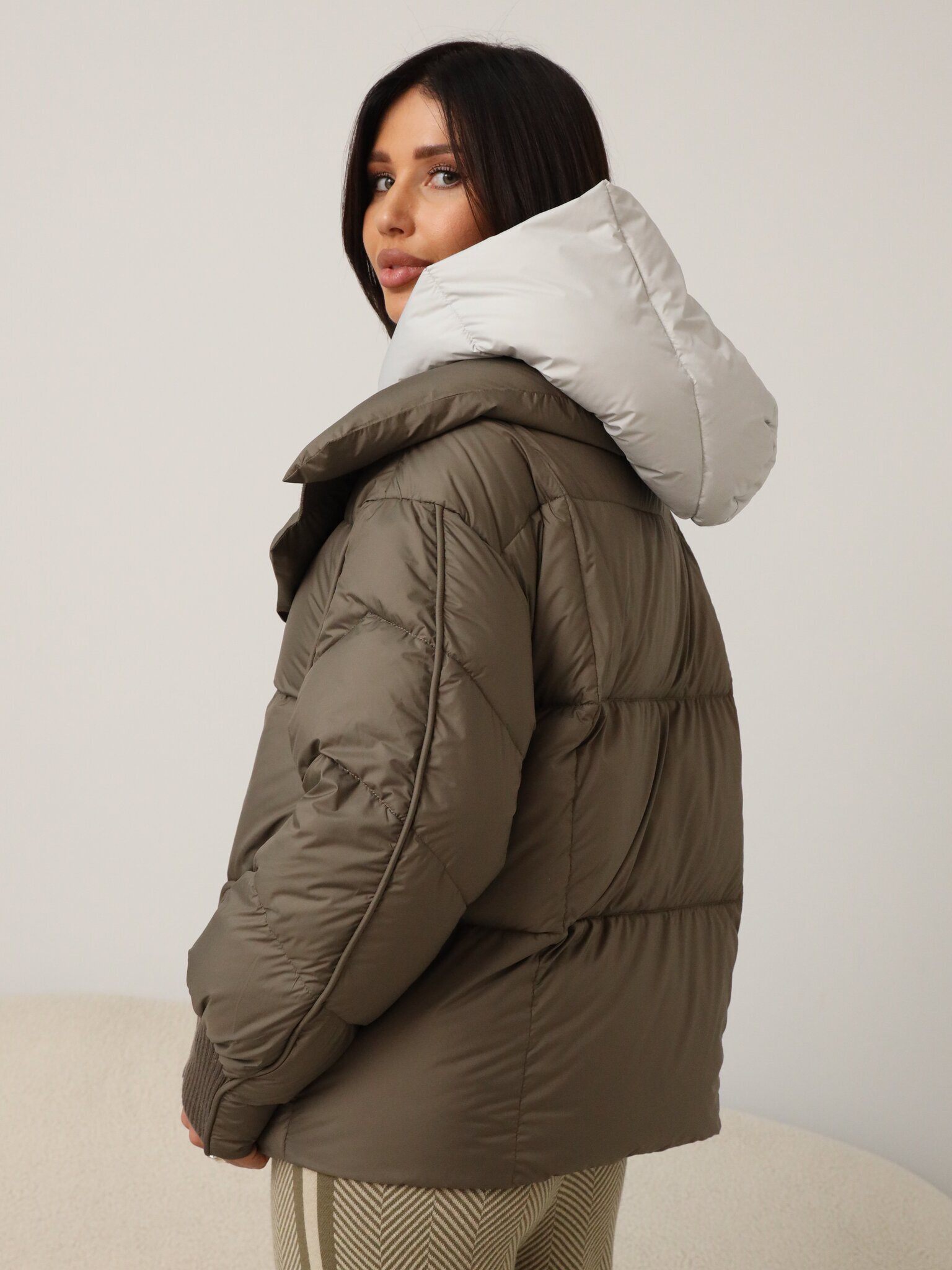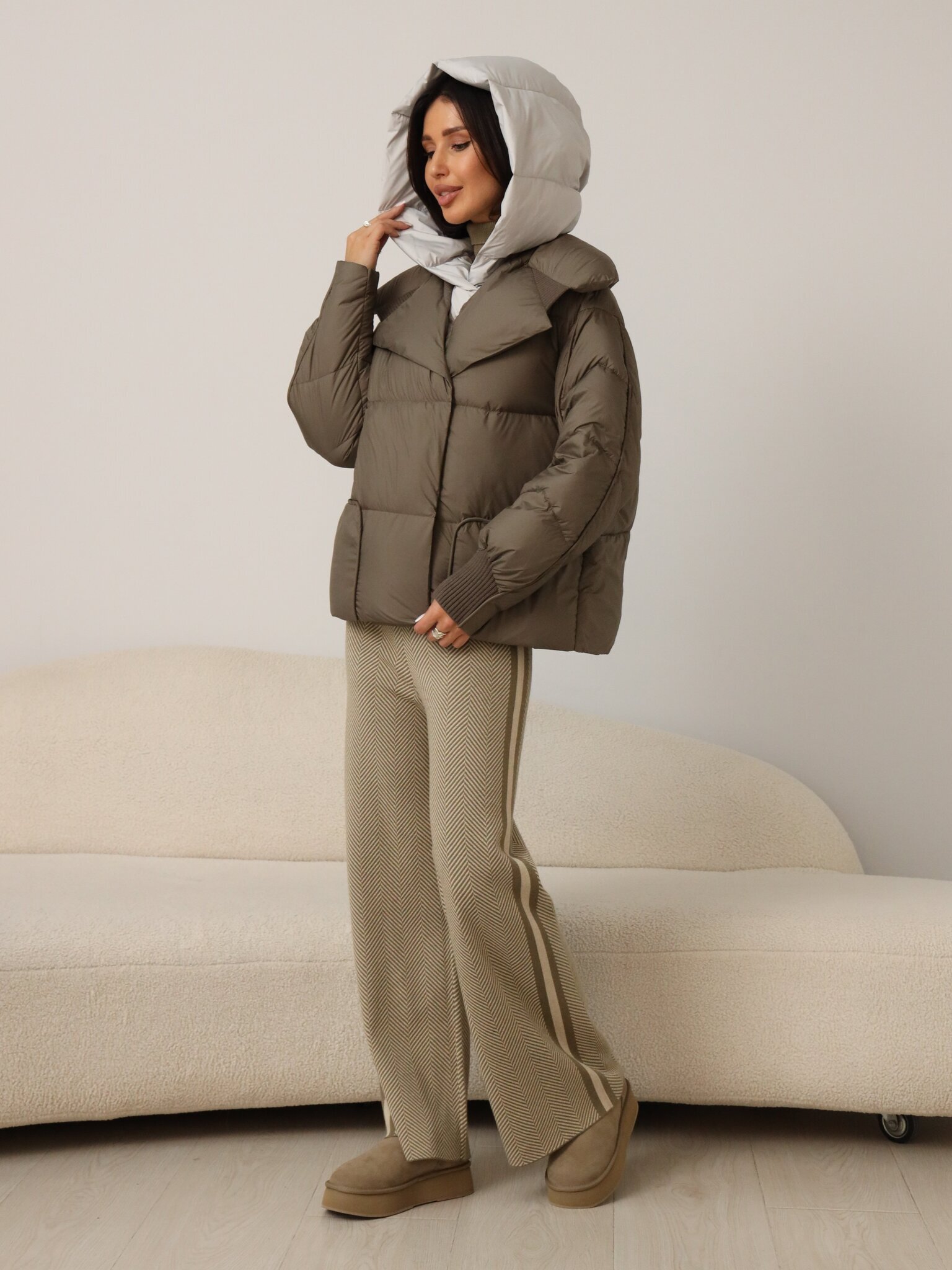 Легкий пуховик с прямой стежкой цвета капучино с встроенной манишкой и капюшоном серого цвета.