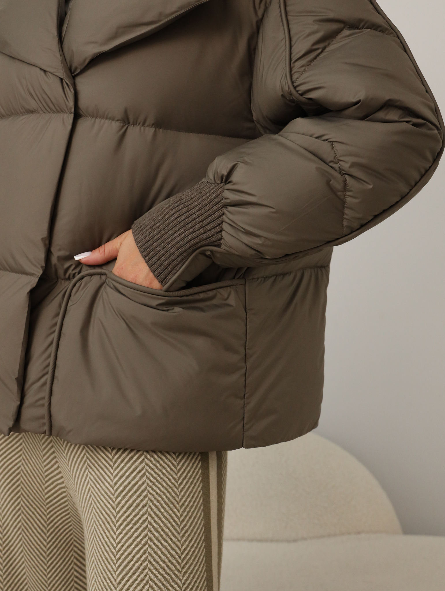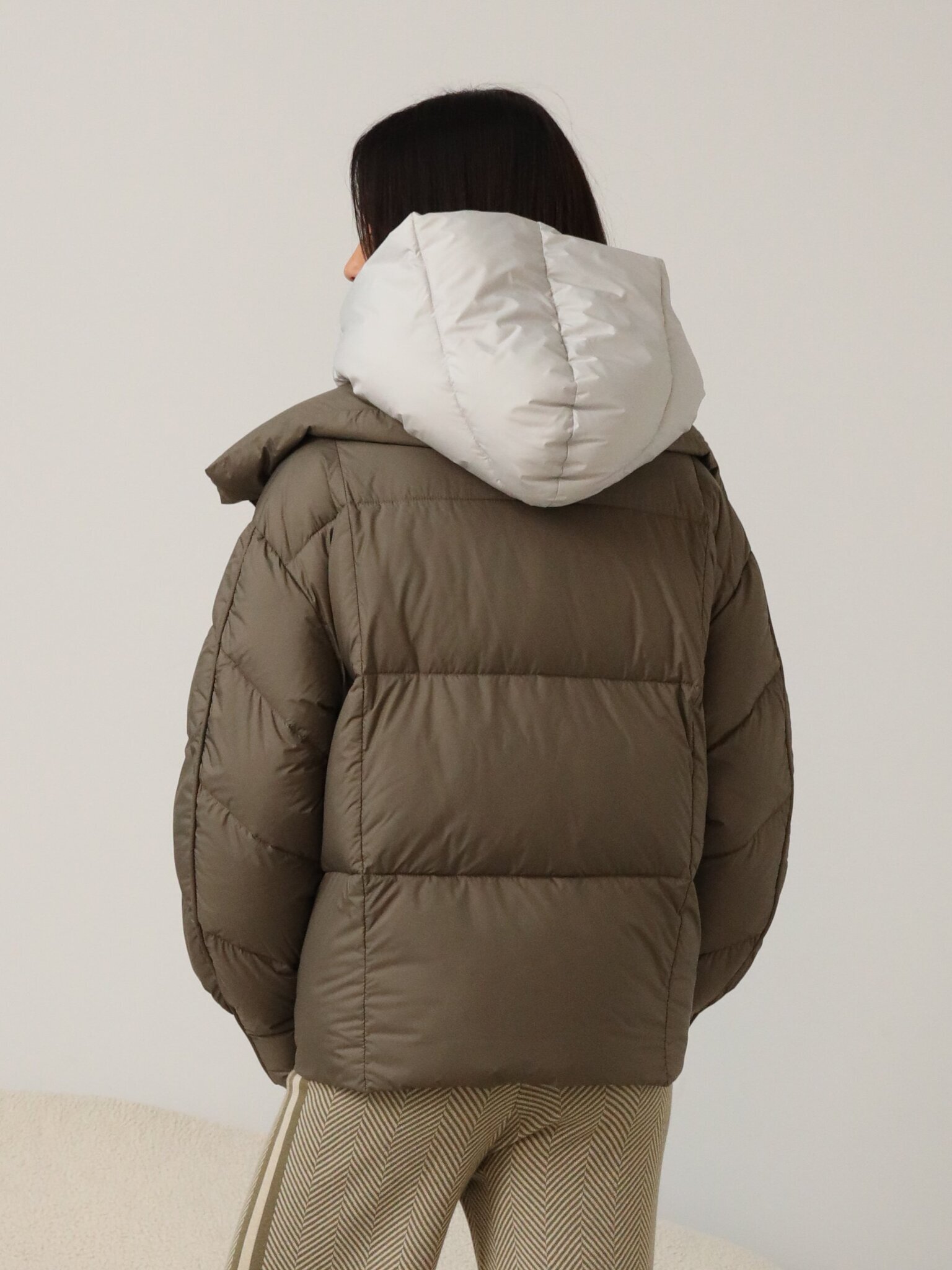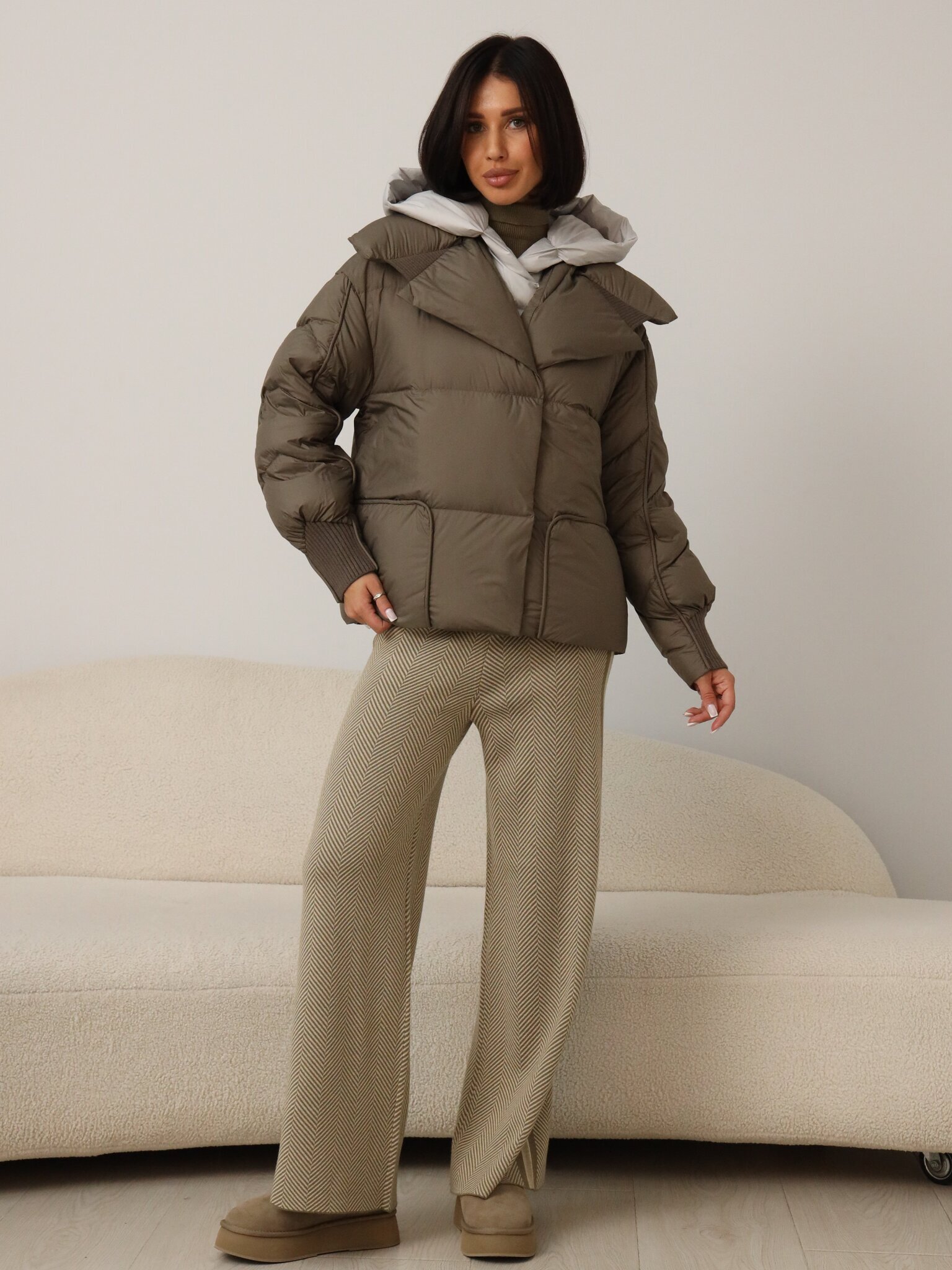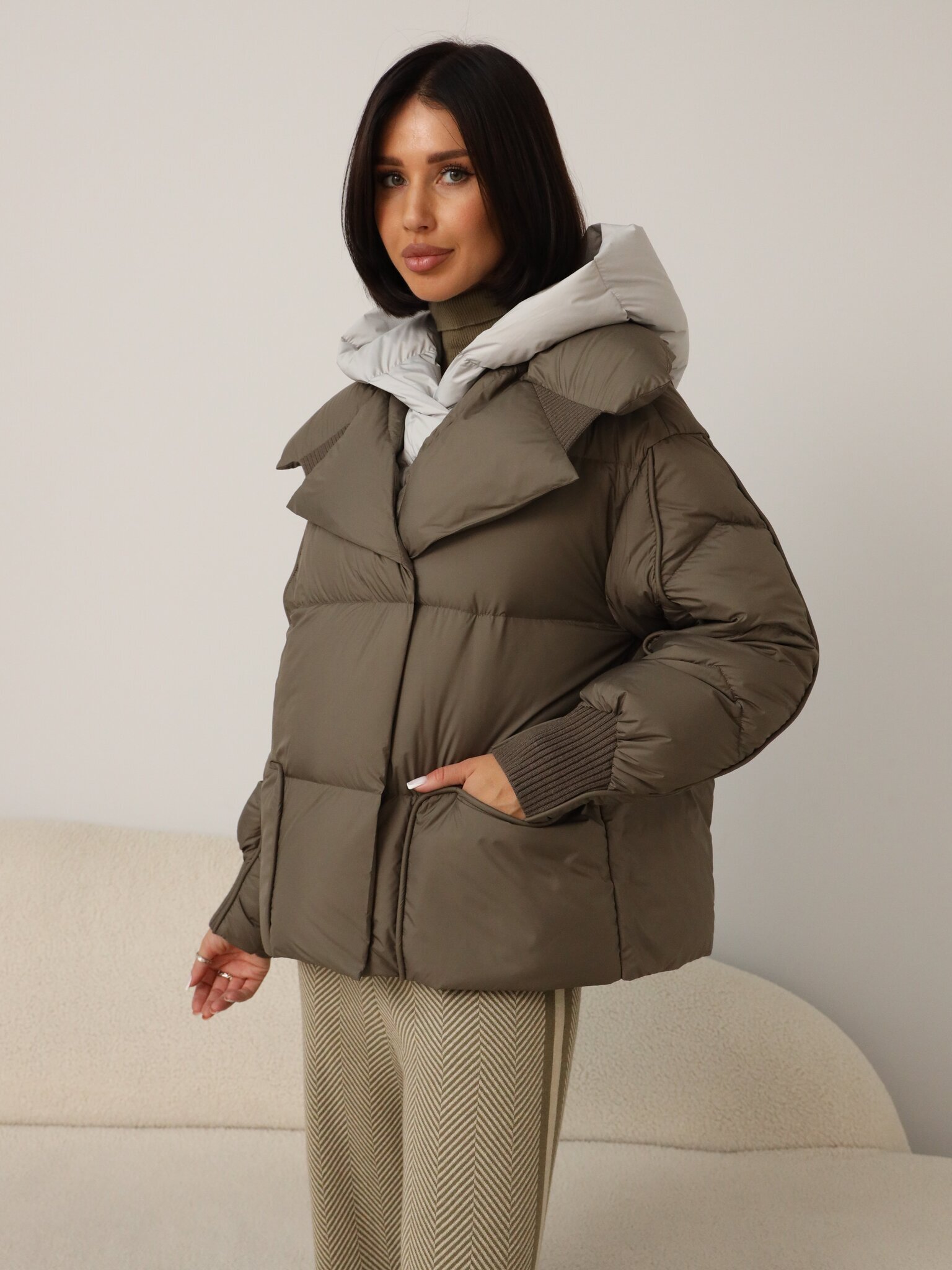 Легкий пуховик с прямой стежкой цвета капучино с встроенной манишкой и капюшоном серого цвета.