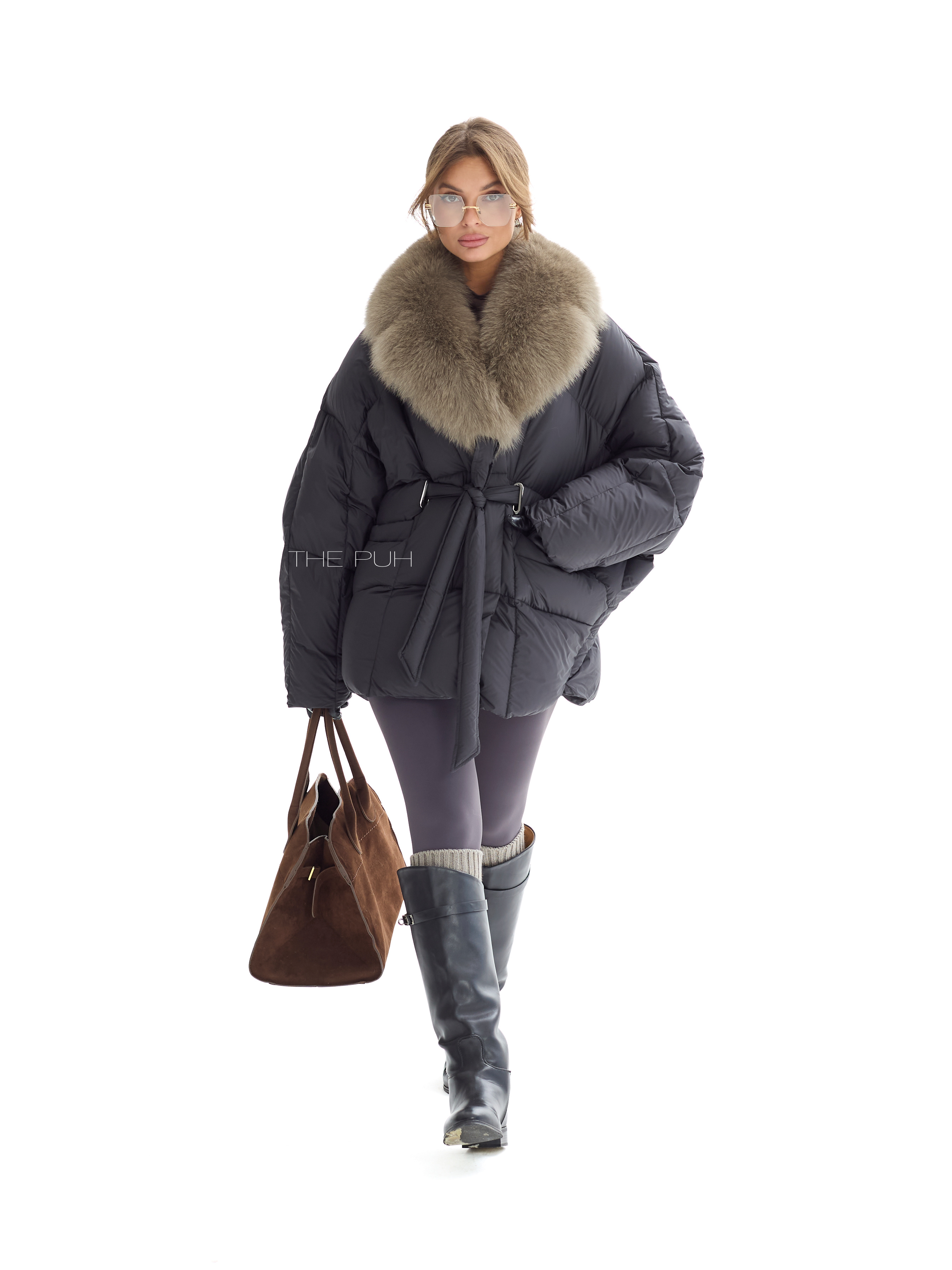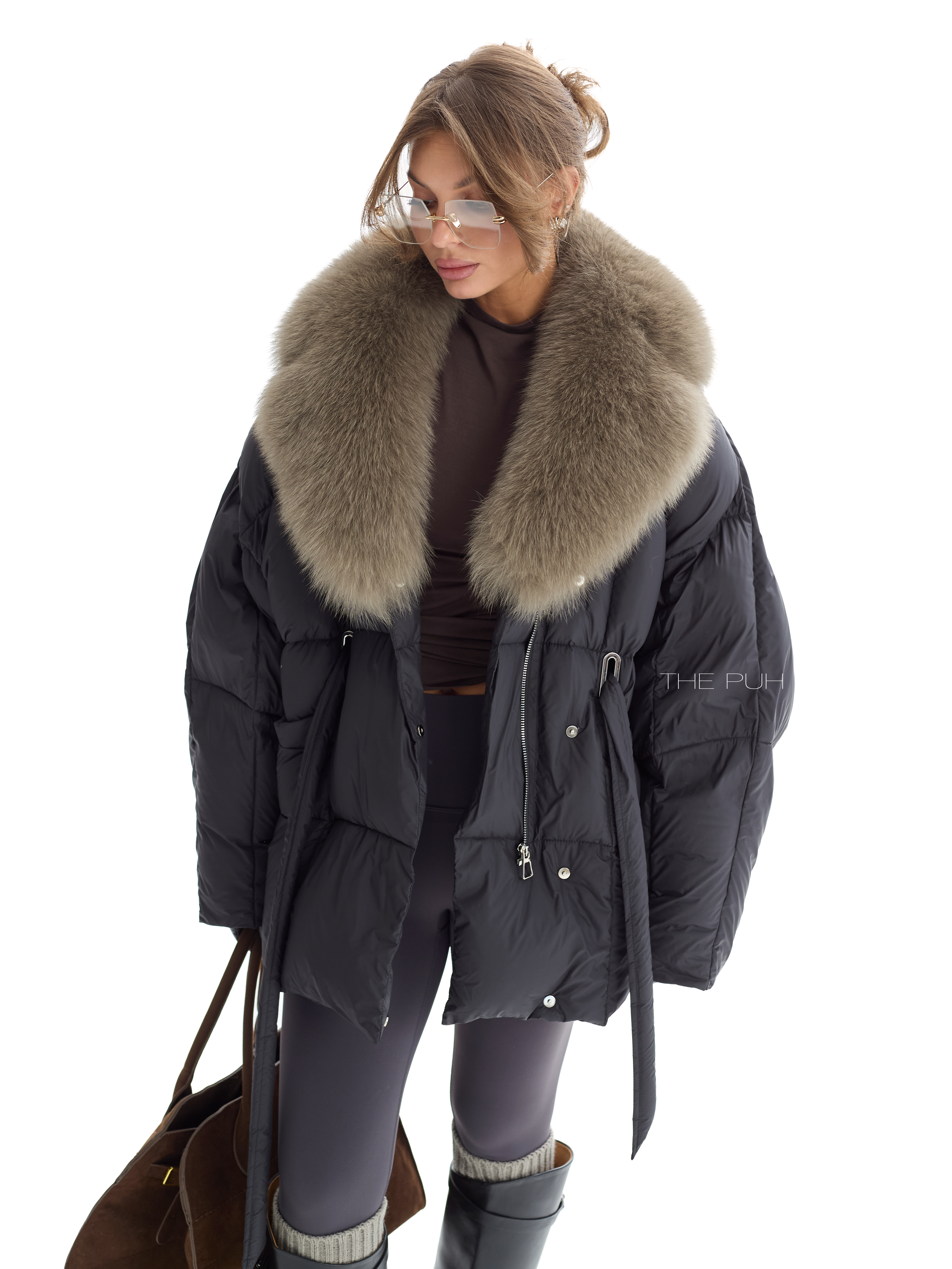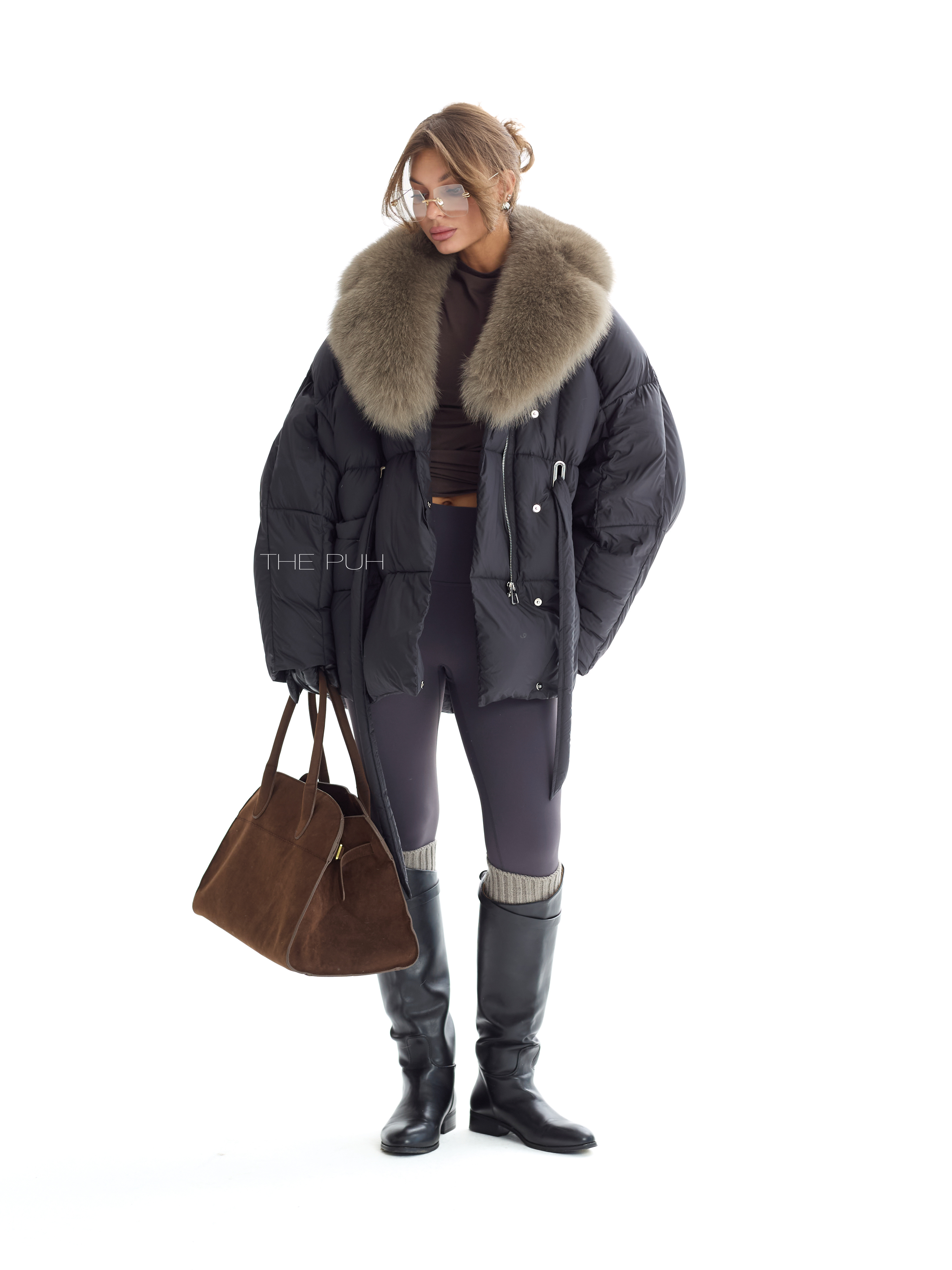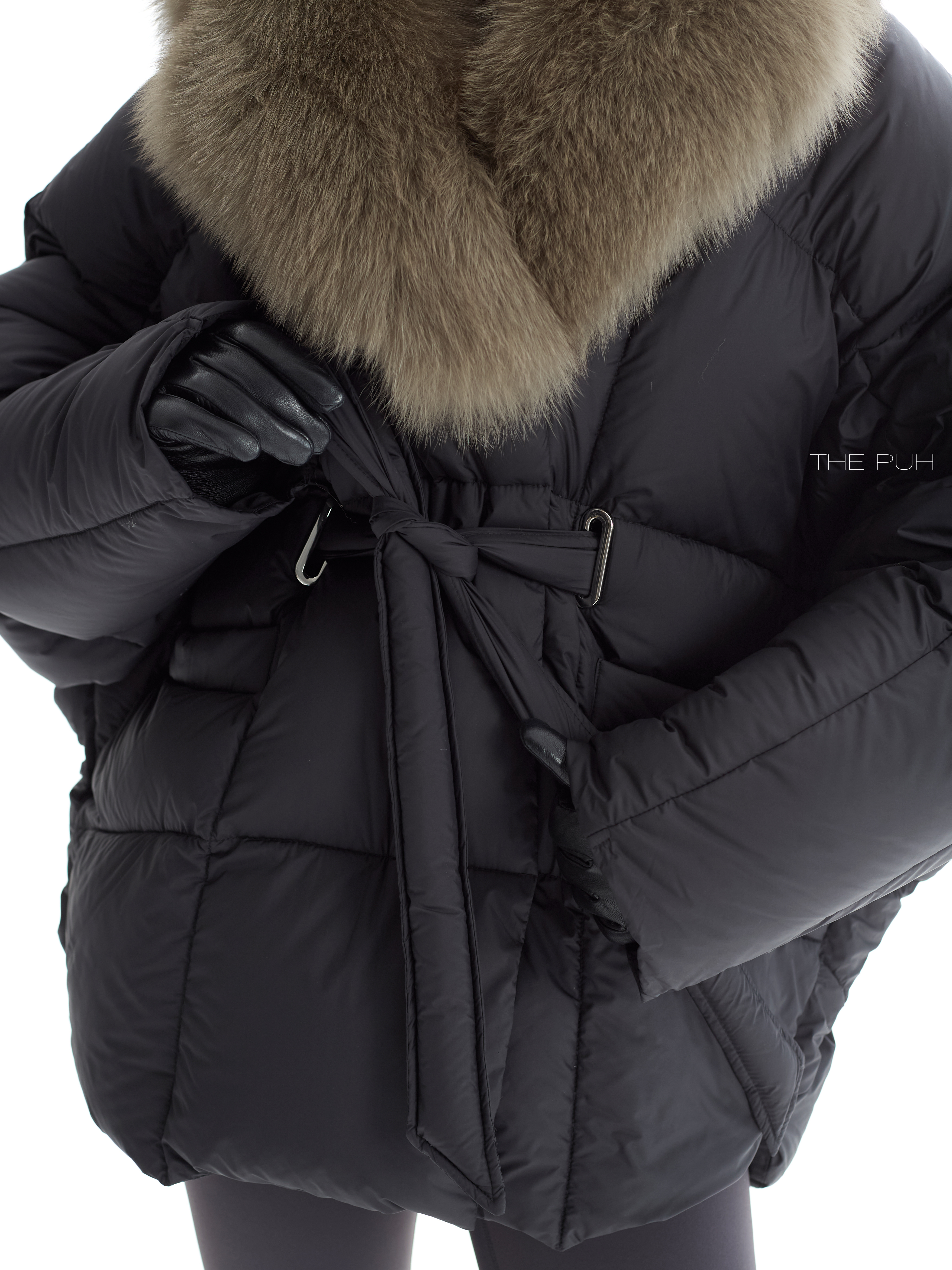 Объемный черный пуховик оригинального кроя "летучая мышь" с цельнокроеным рукавом, встроенным поясом и съемным воротником из натурального меха.