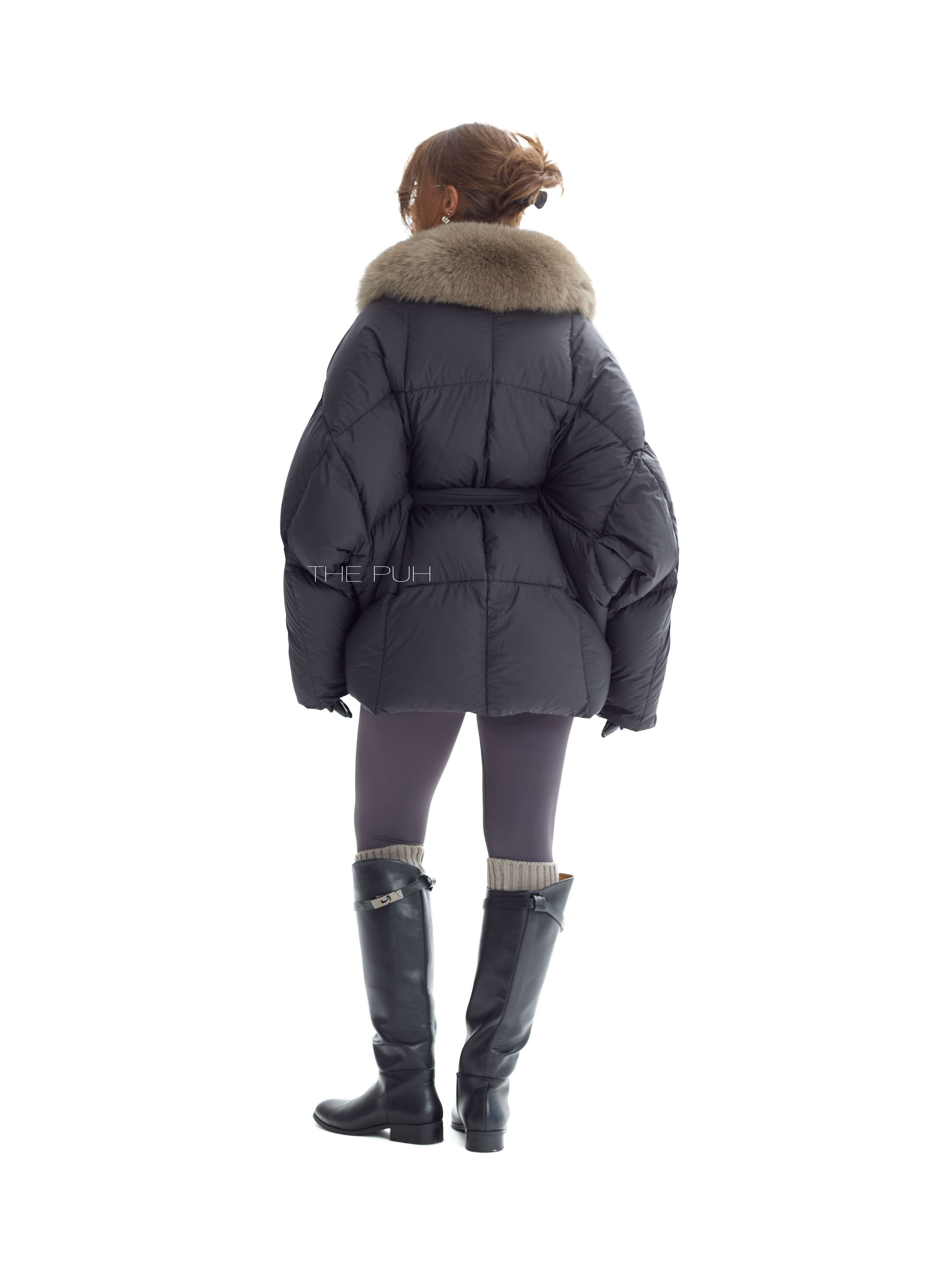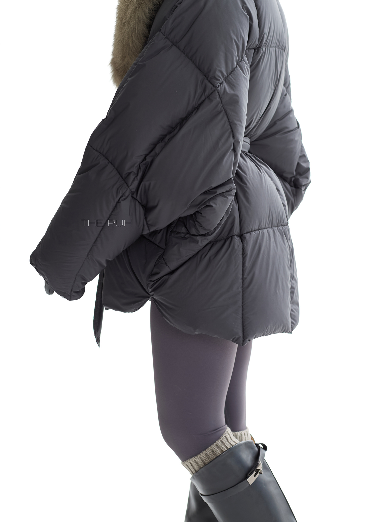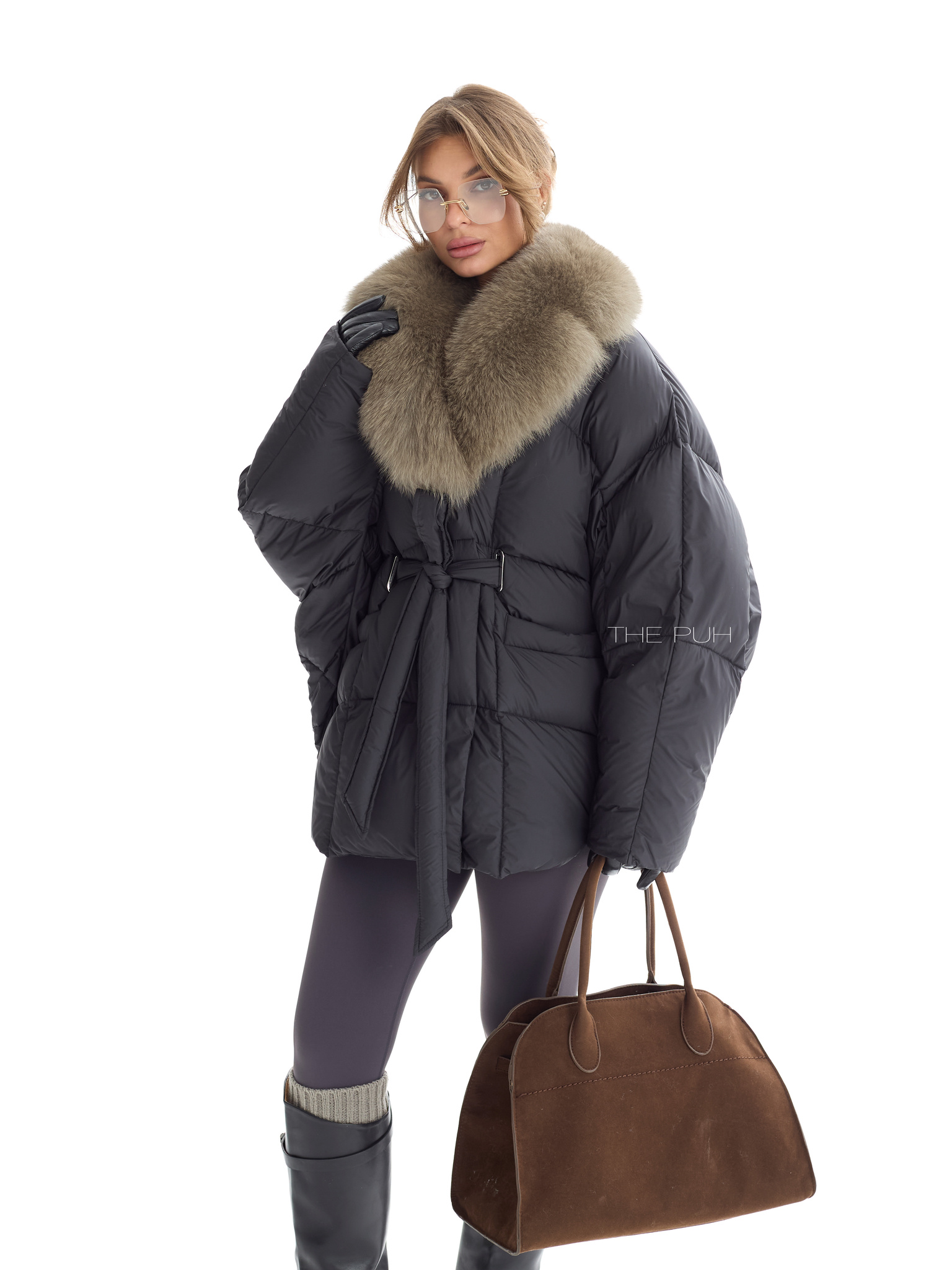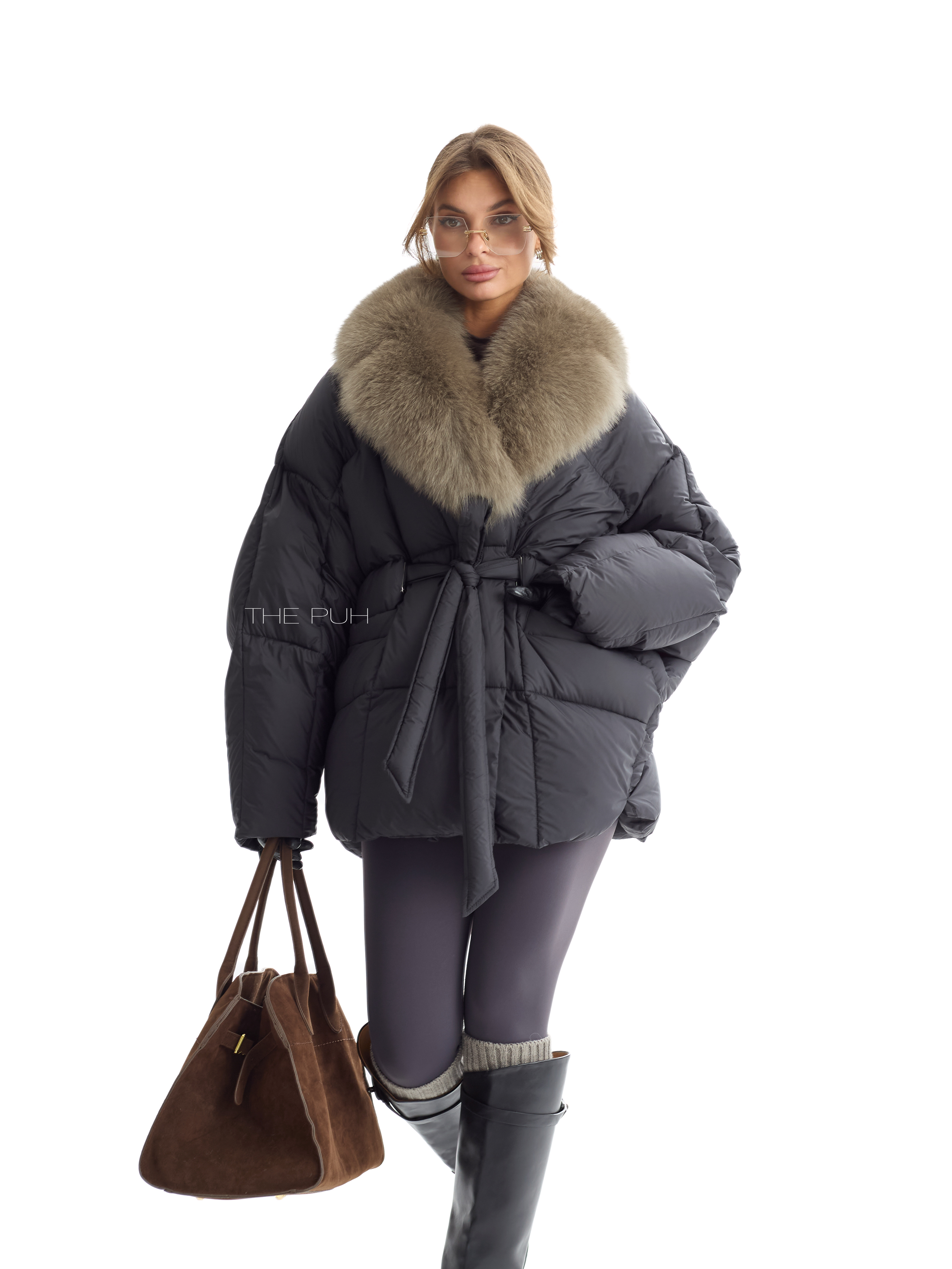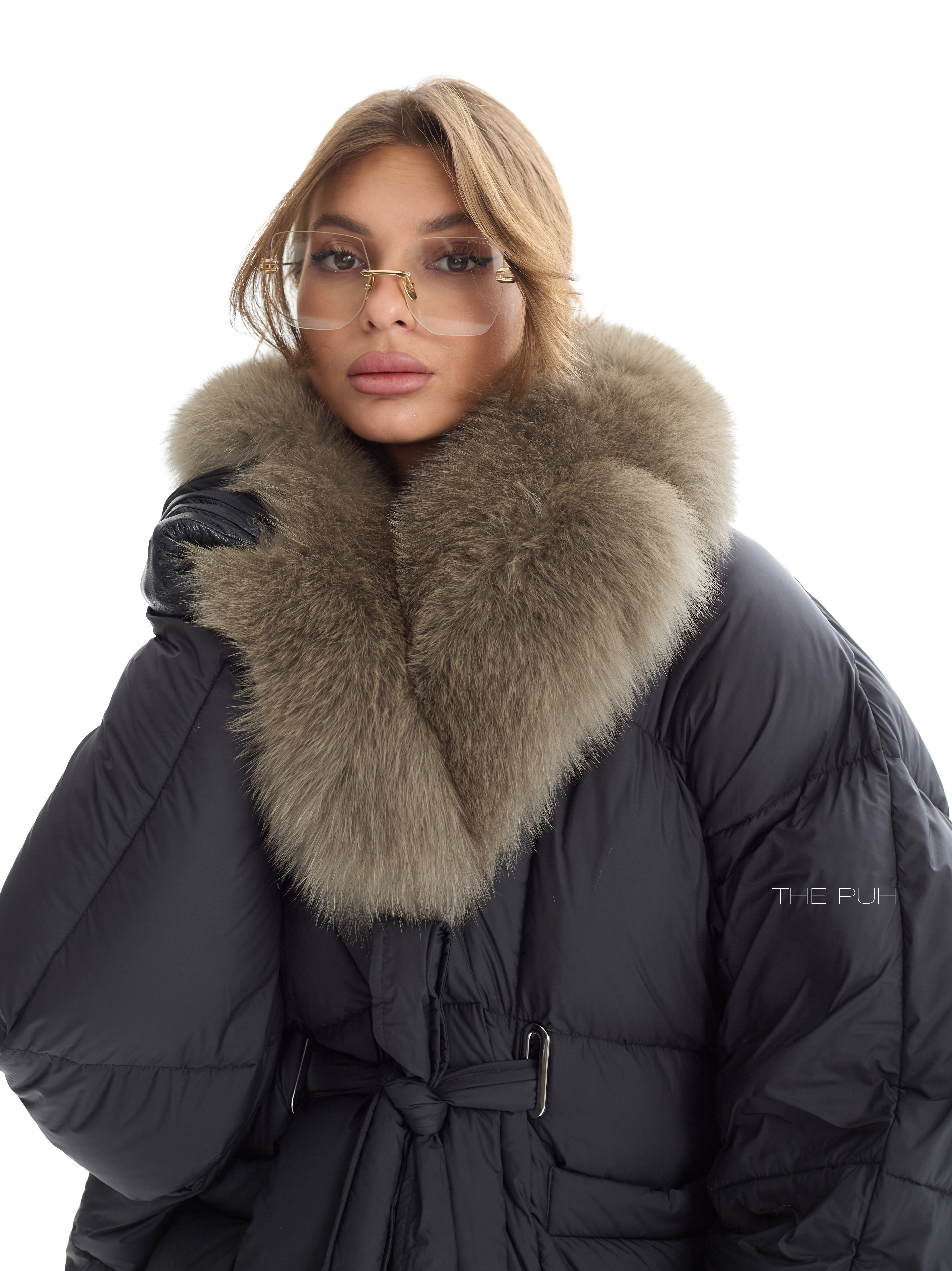Объемный черный пуховик оригинального кроя "летучая мышь" с цельнокроеным рукавом, встроенным поясом и съемным воротником из натурального меха.