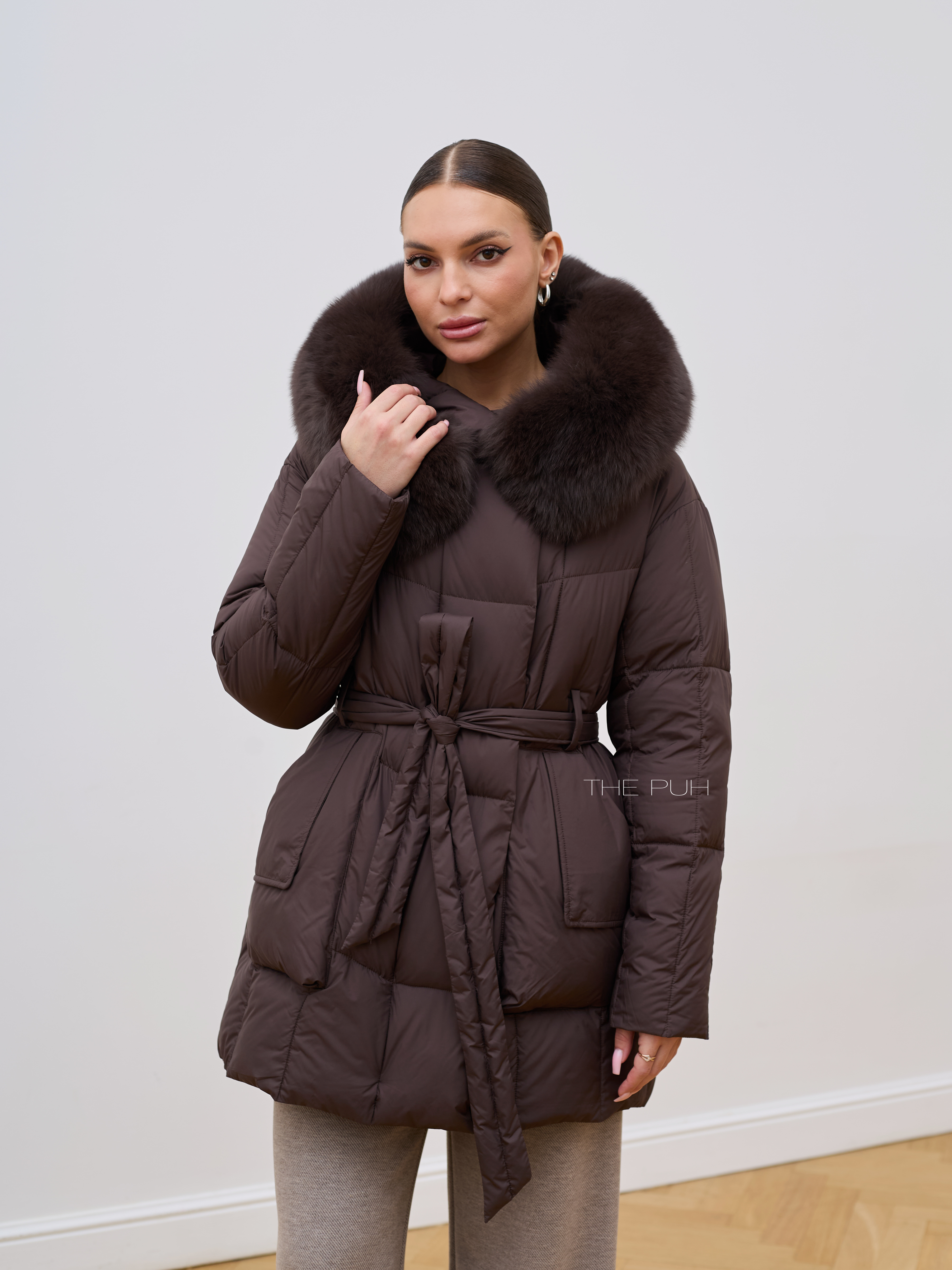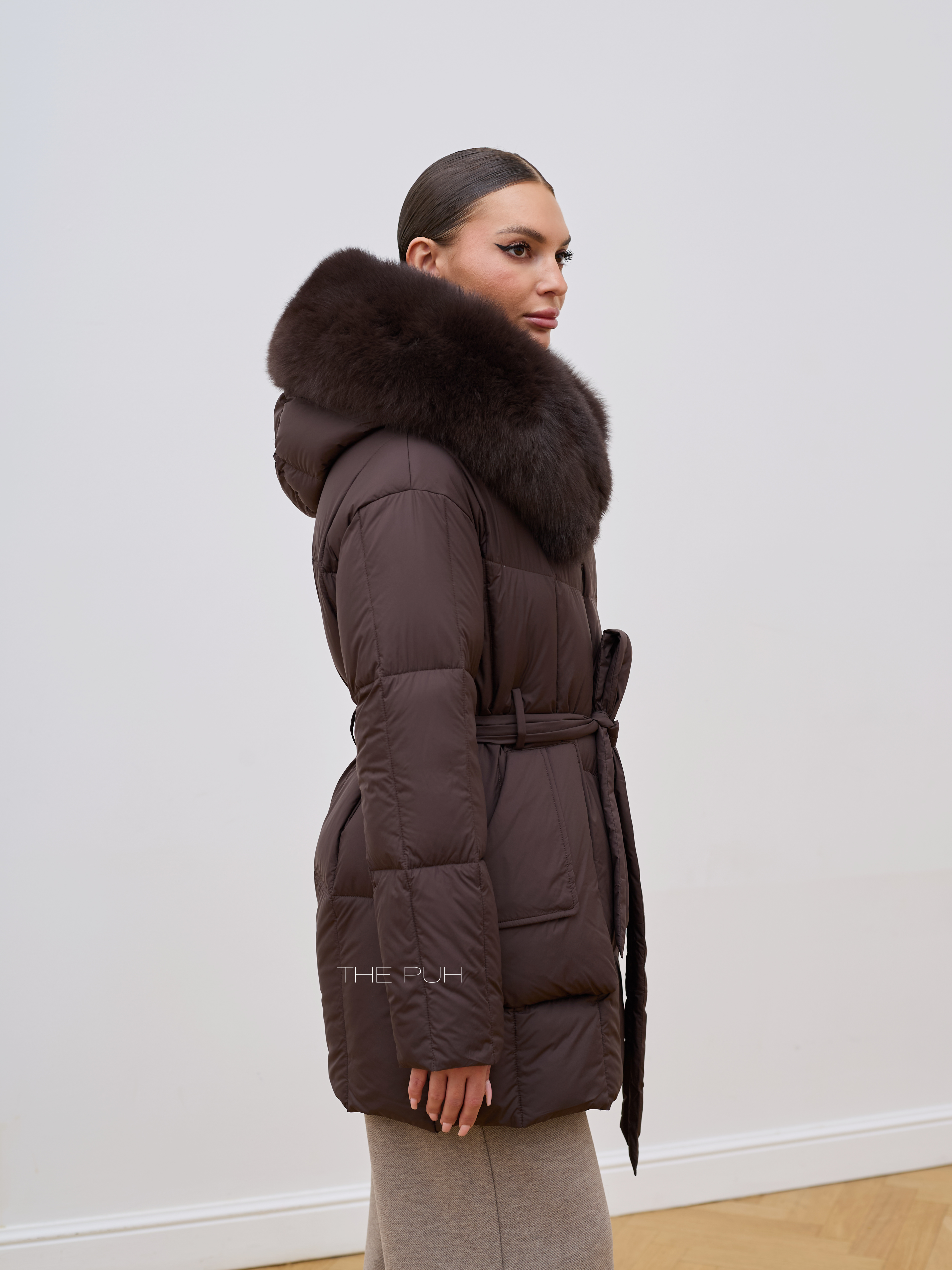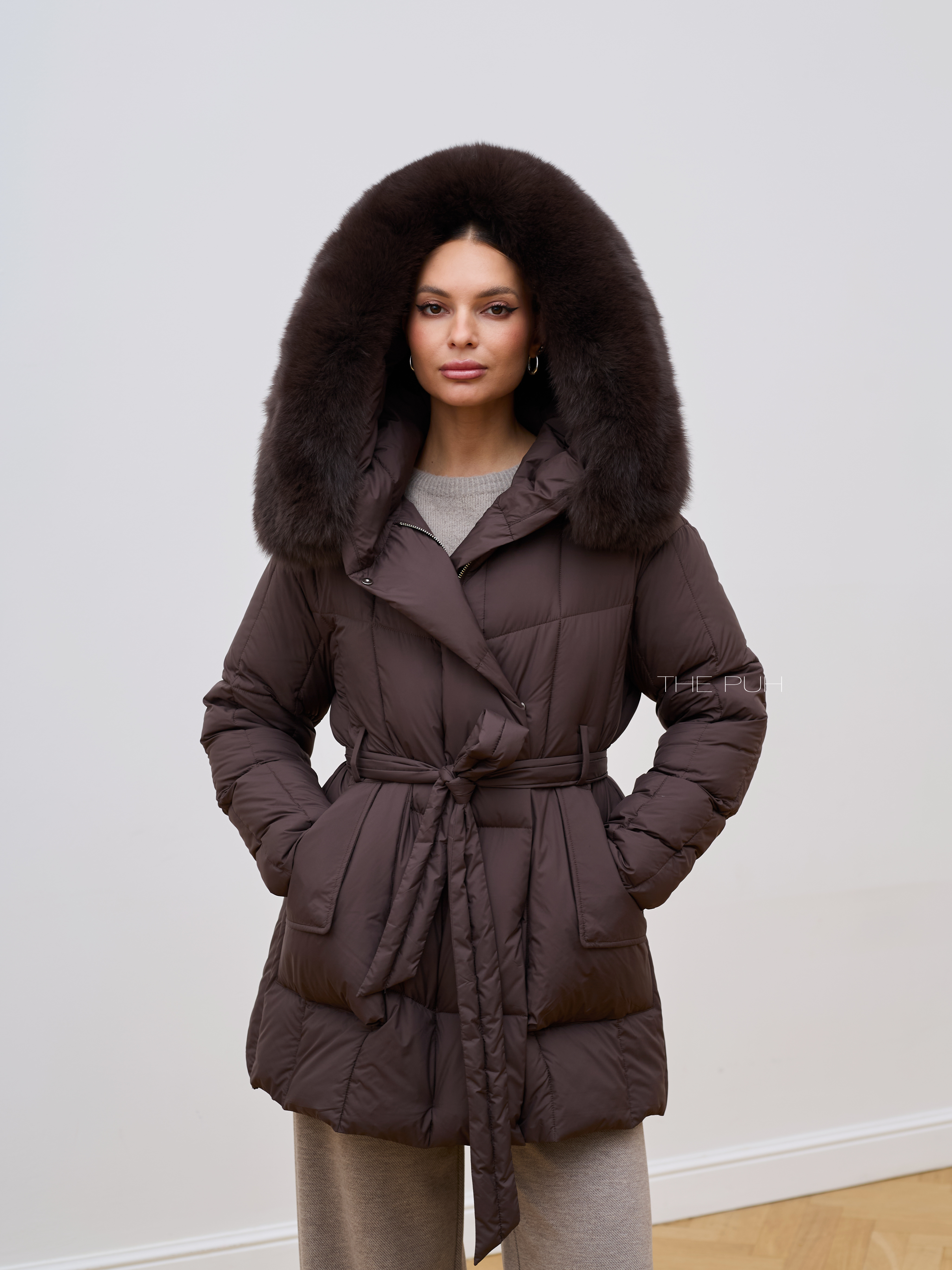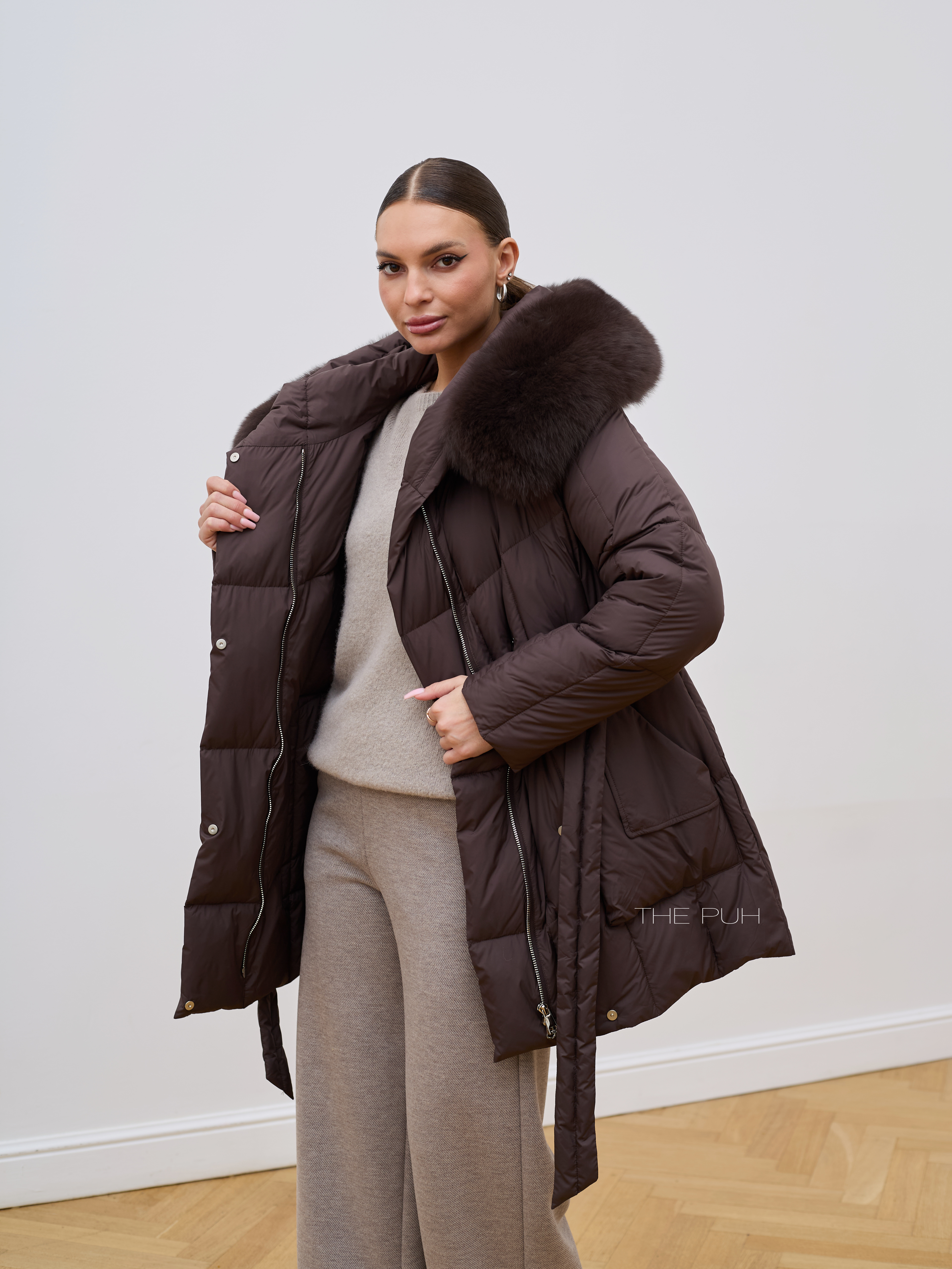 Удлиненный пуховик шоколадного цвета застегивается на молнию и дополнен поясом, благодаря которому вы можете изменять силуэт и контролировать прилегание пуховика. Модель утеплена натуральным гусиным пухом и способна выдерживать самые крепкие морозы. Объемный теплый капюшон оторочен мехом в тон.
