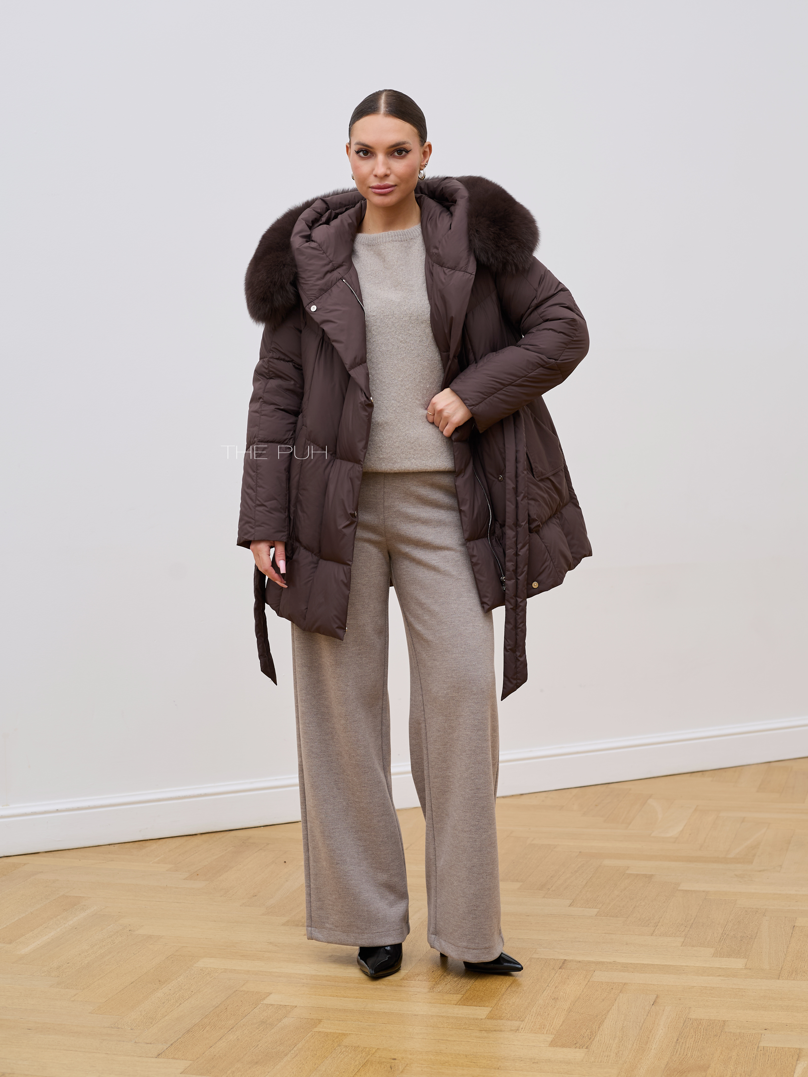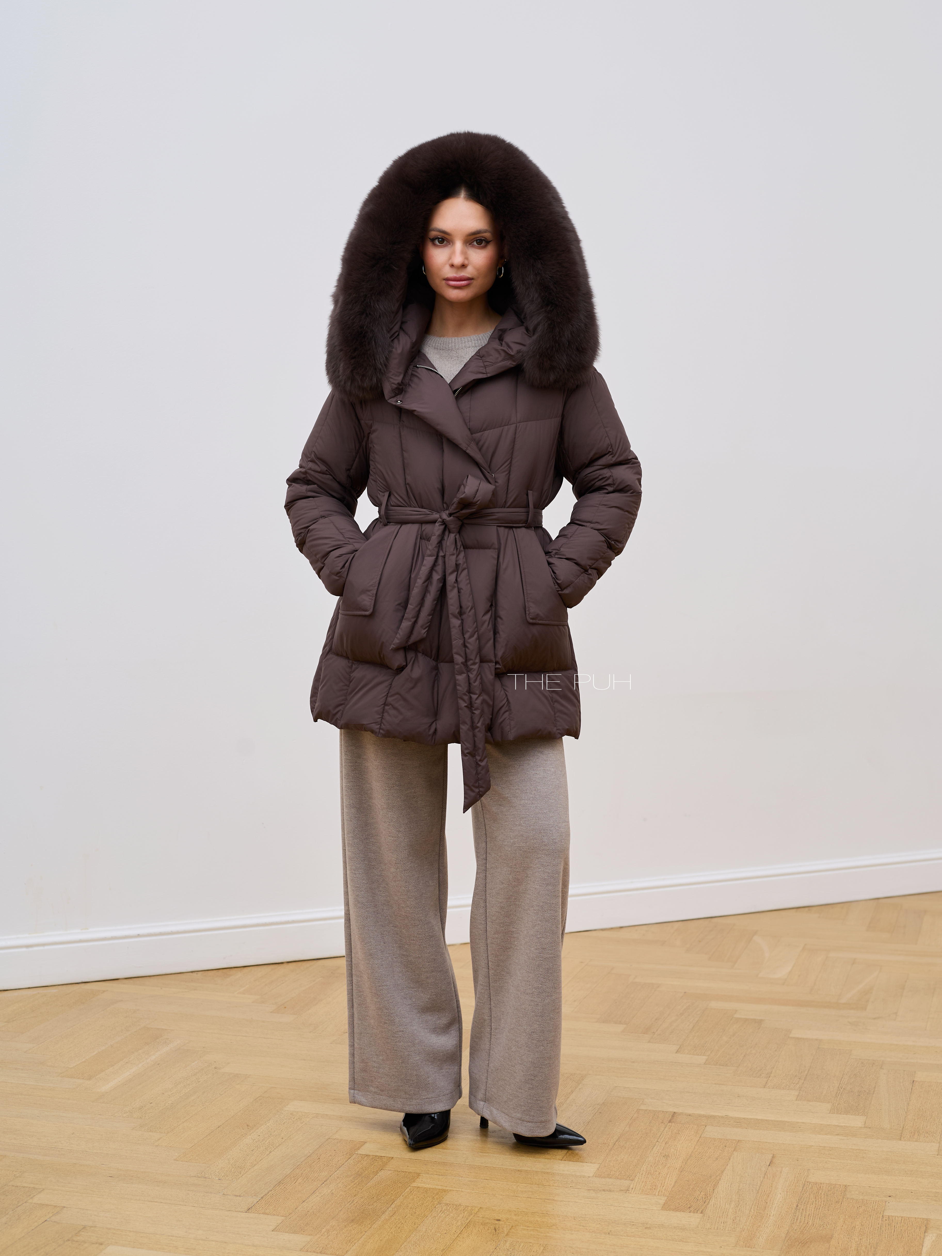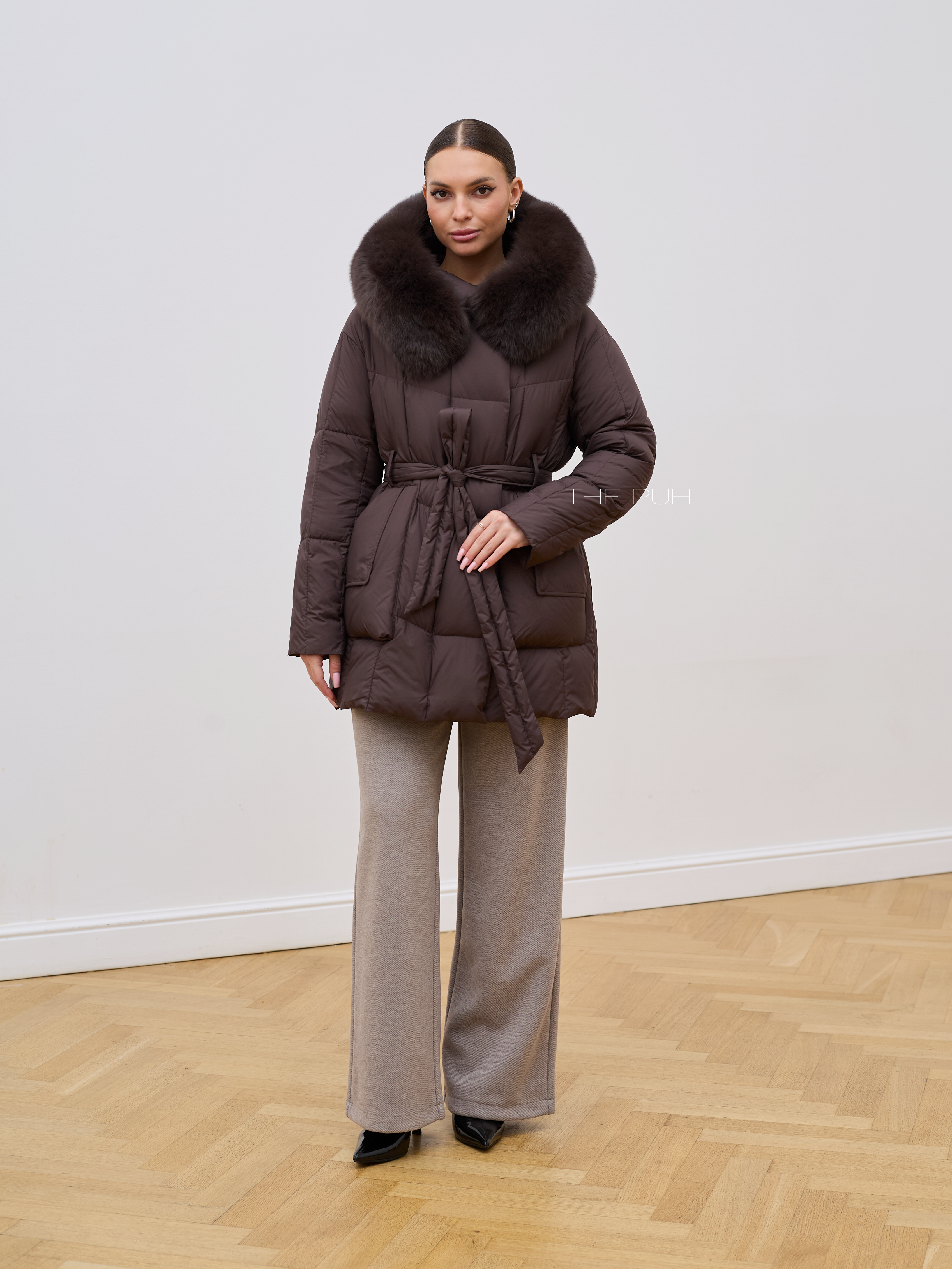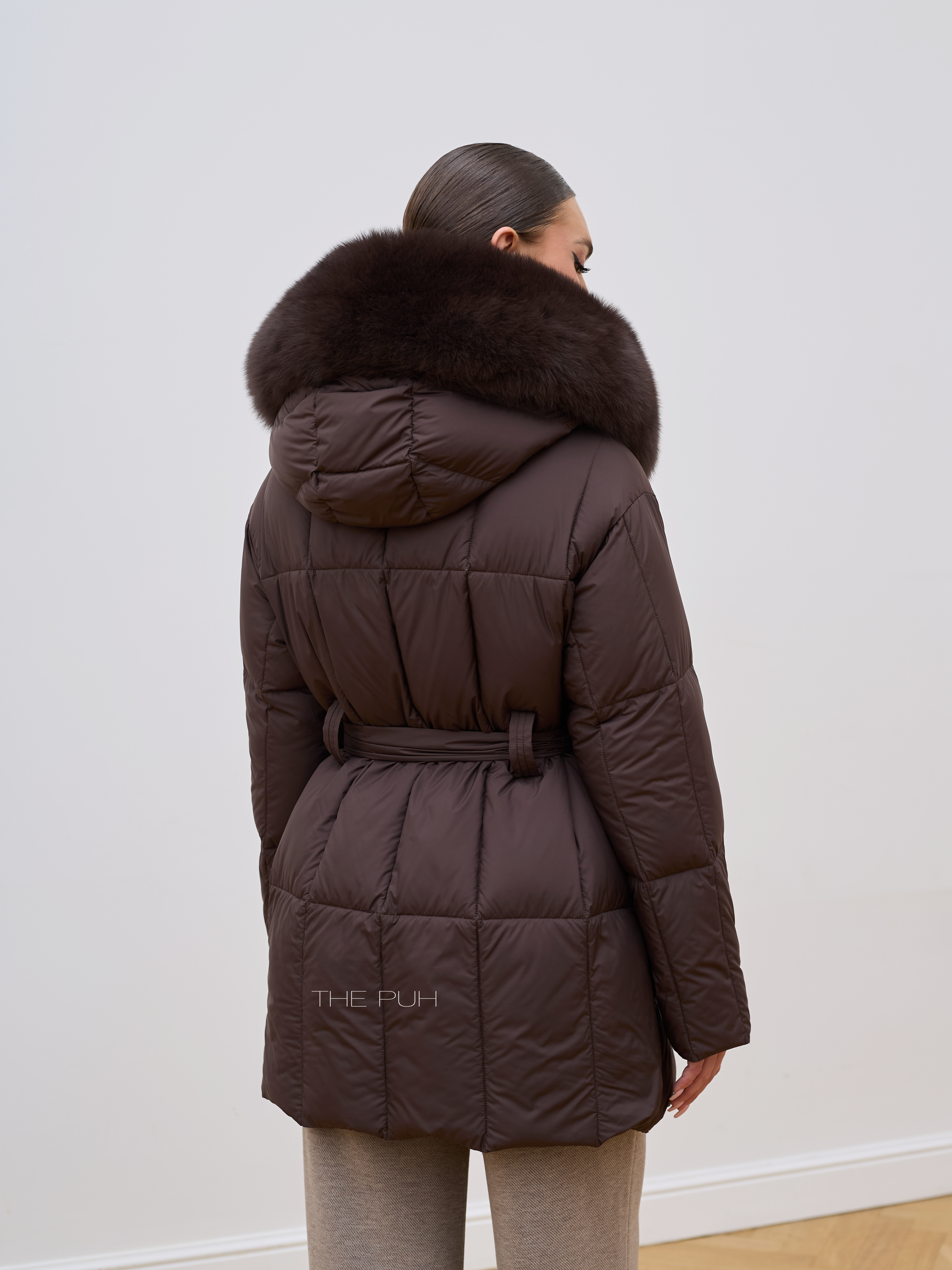 Удлиненный пуховик шоколадного цвета застегивается на молнию и дополнен поясом, благодаря которому вы можете изменять силуэт и контролировать прилегание пуховика. Модель утеплена натуральным гусиным пухом и способна выдерживать самые крепкие морозы. Объемный теплый капюшон оторочен мехом в тон.