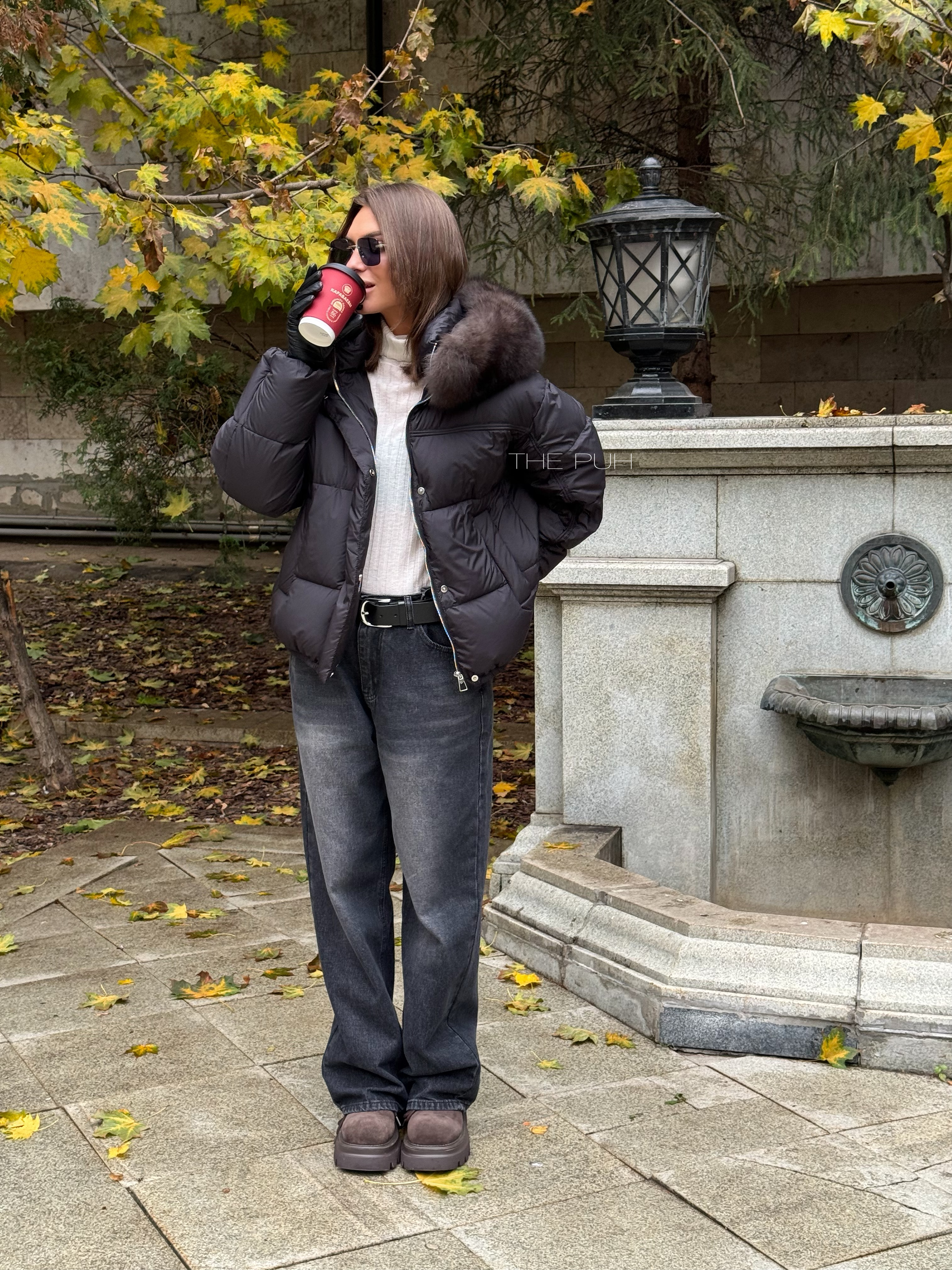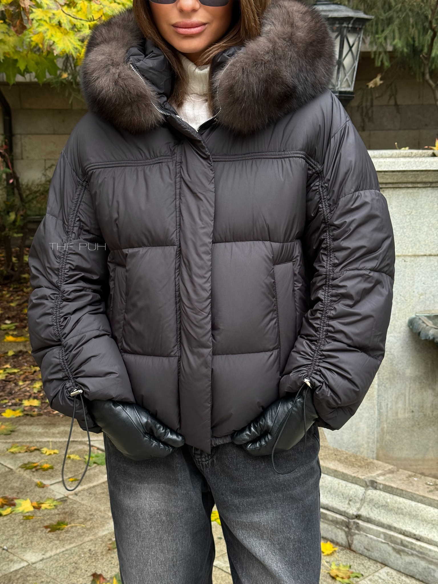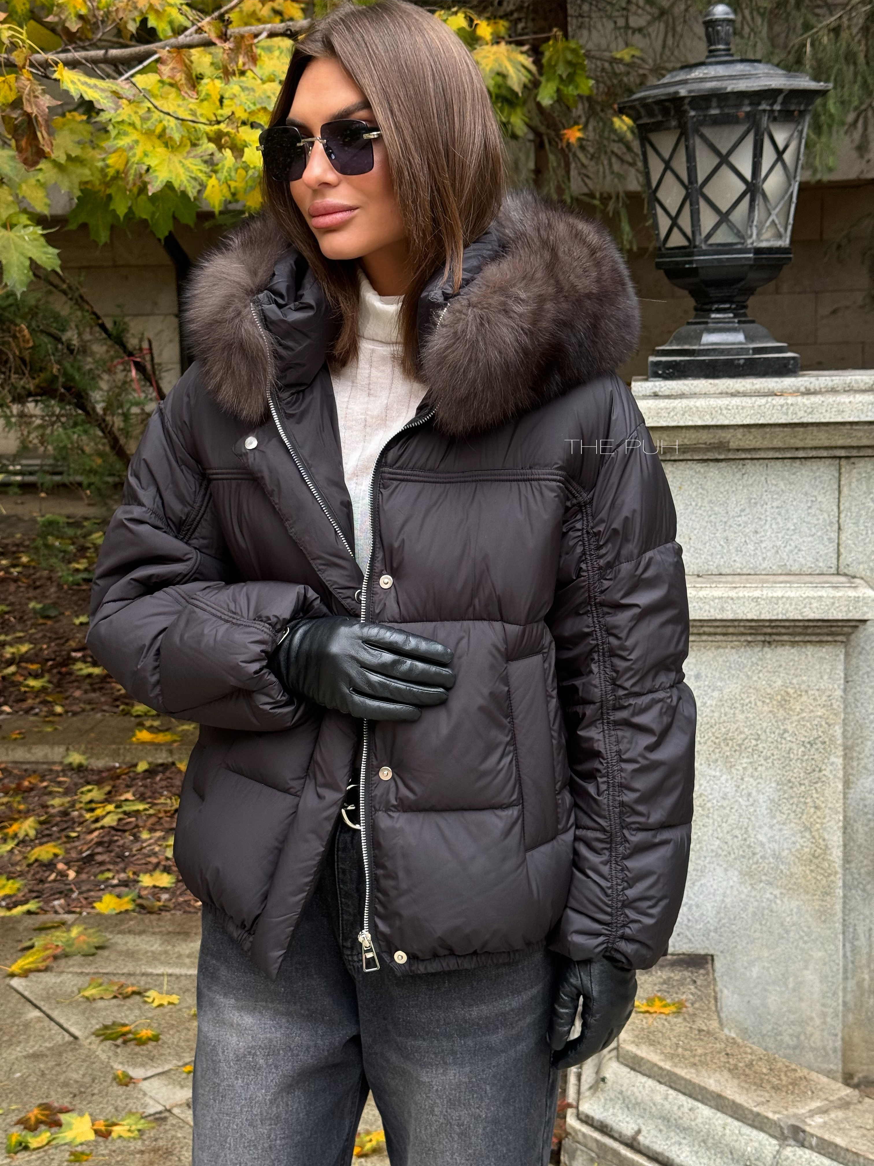 Короткий пуховик черного цвета с меховой отделкой капюшона и затяжками на рукавах, которые позволяют регулировать их длину. Модель утеплена натуральным пухом, что позволяет ей выдерживать зимние холода.
