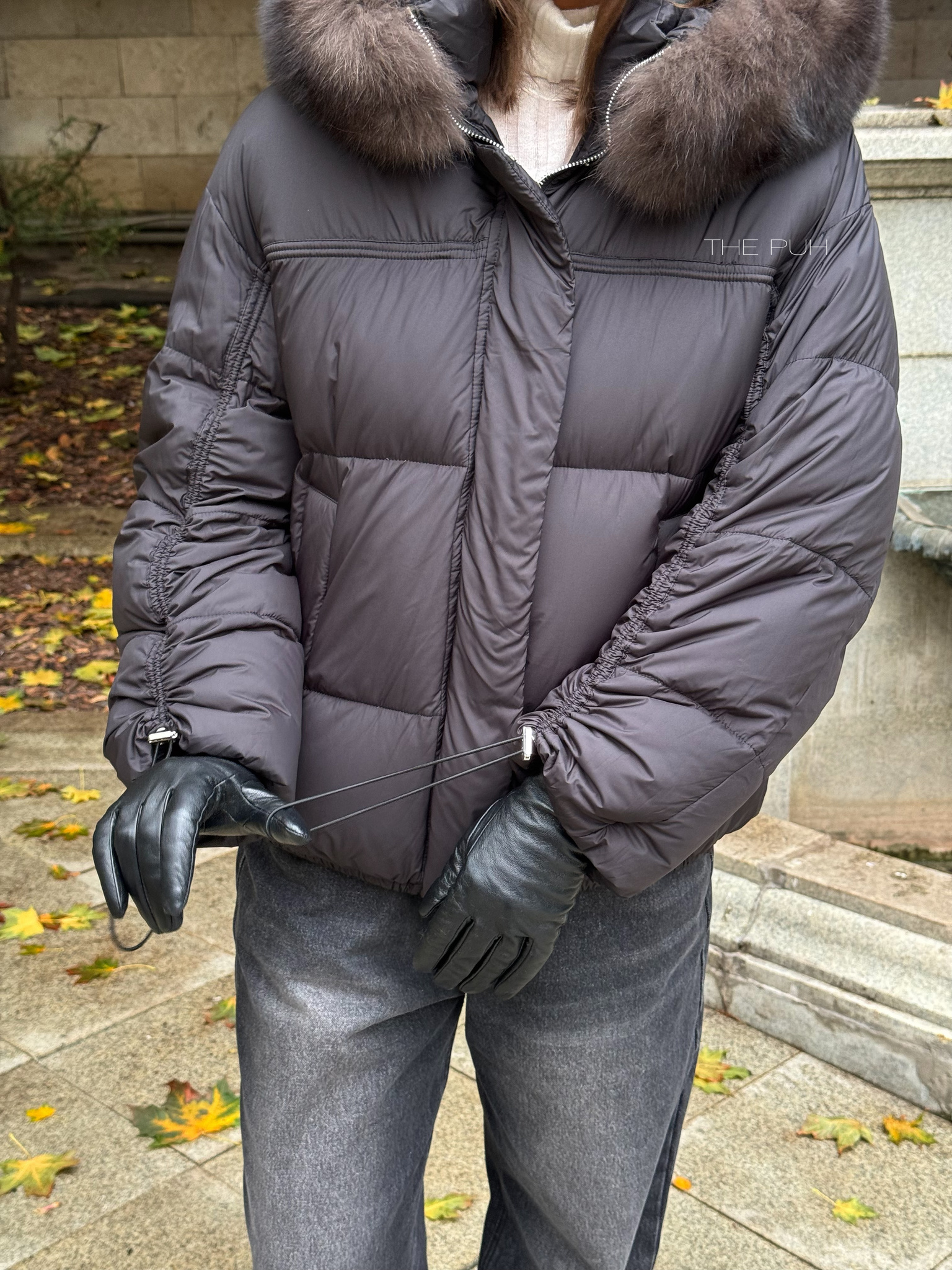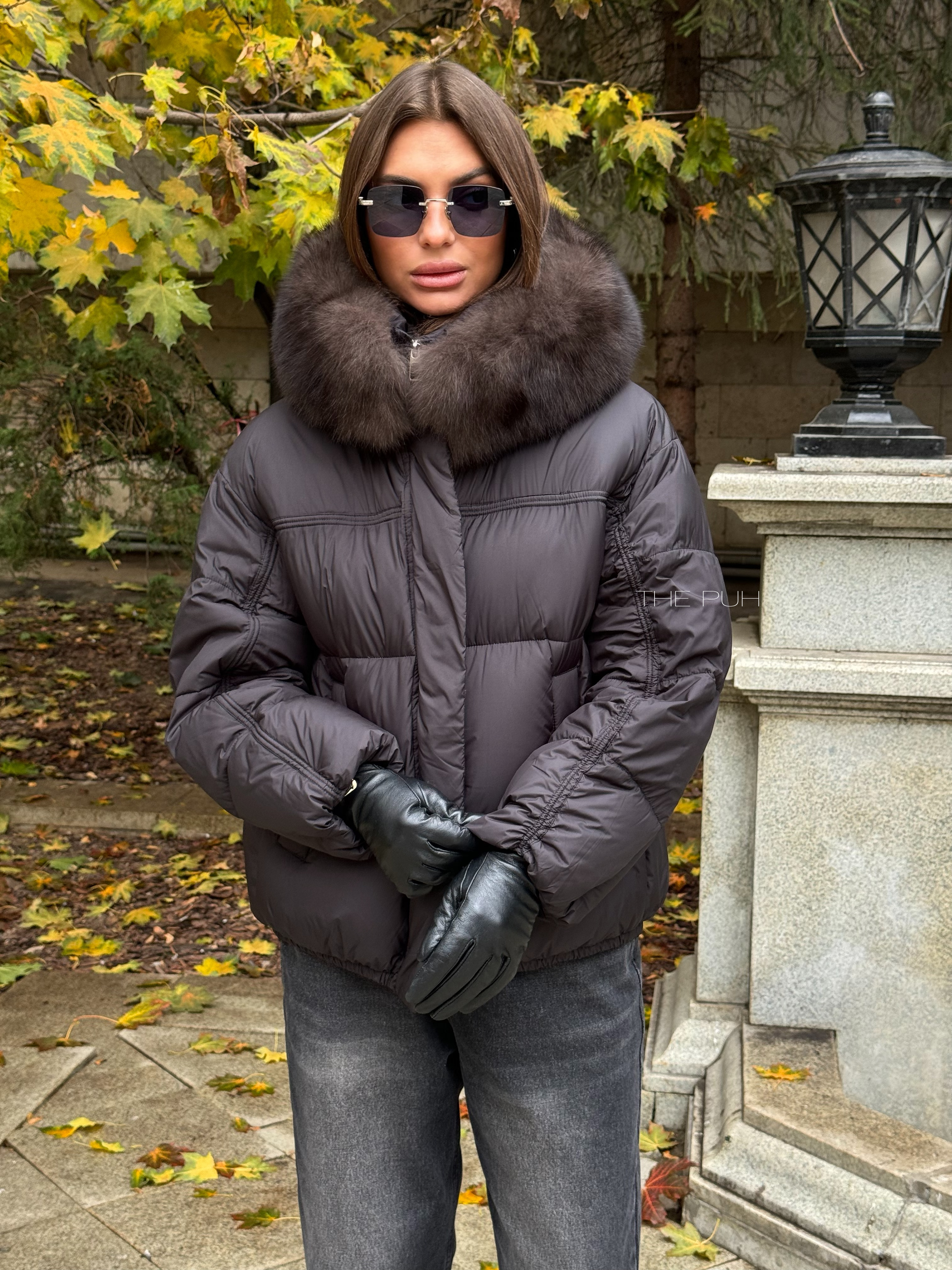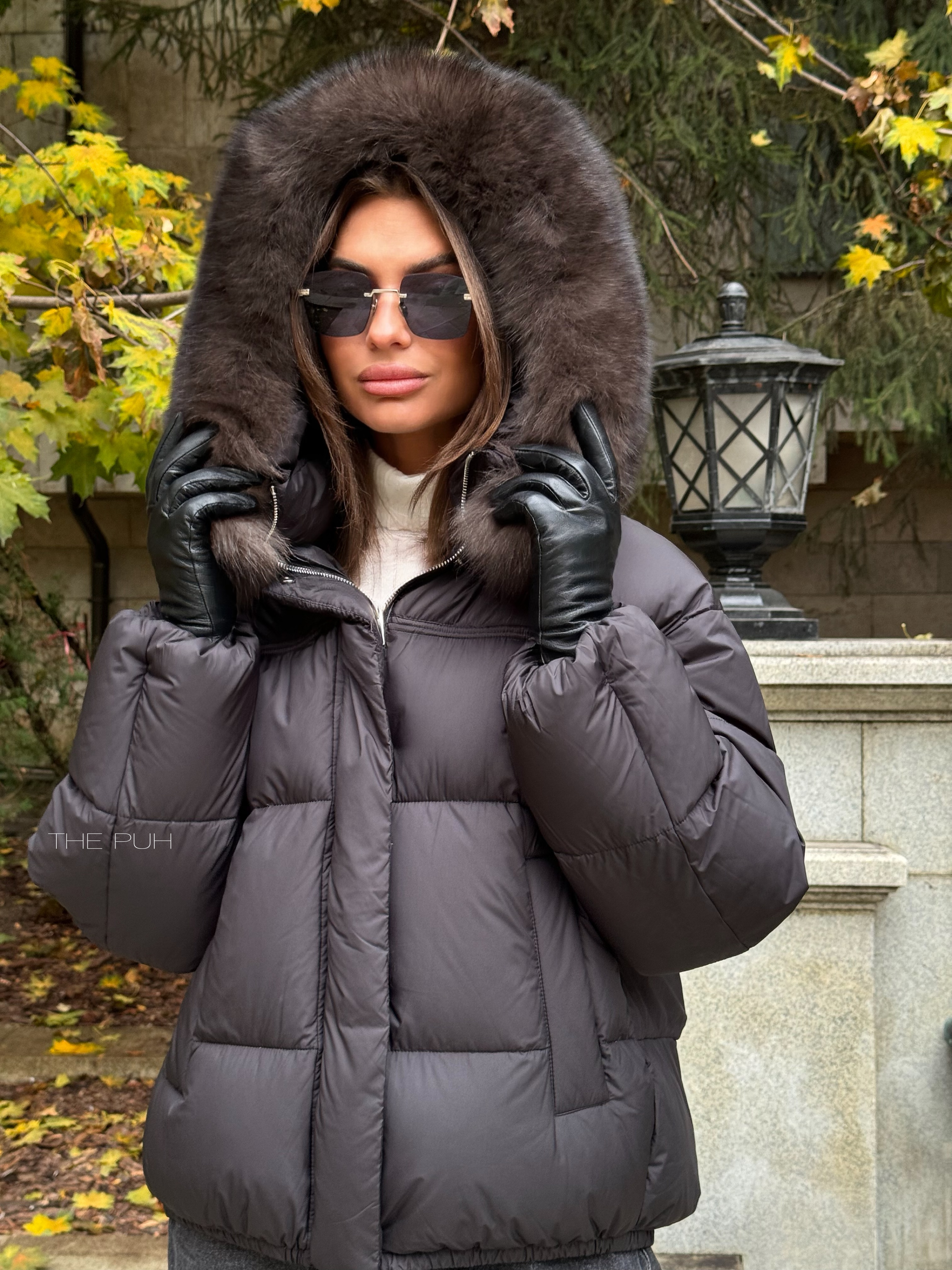 Короткий пуховик черного цвета с меховой отделкой капюшона и затяжками на рукавах, которые позволяют регулировать их длину. Модель утеплена натуральным пухом, что позволяет ей выдерживать зимние холода.