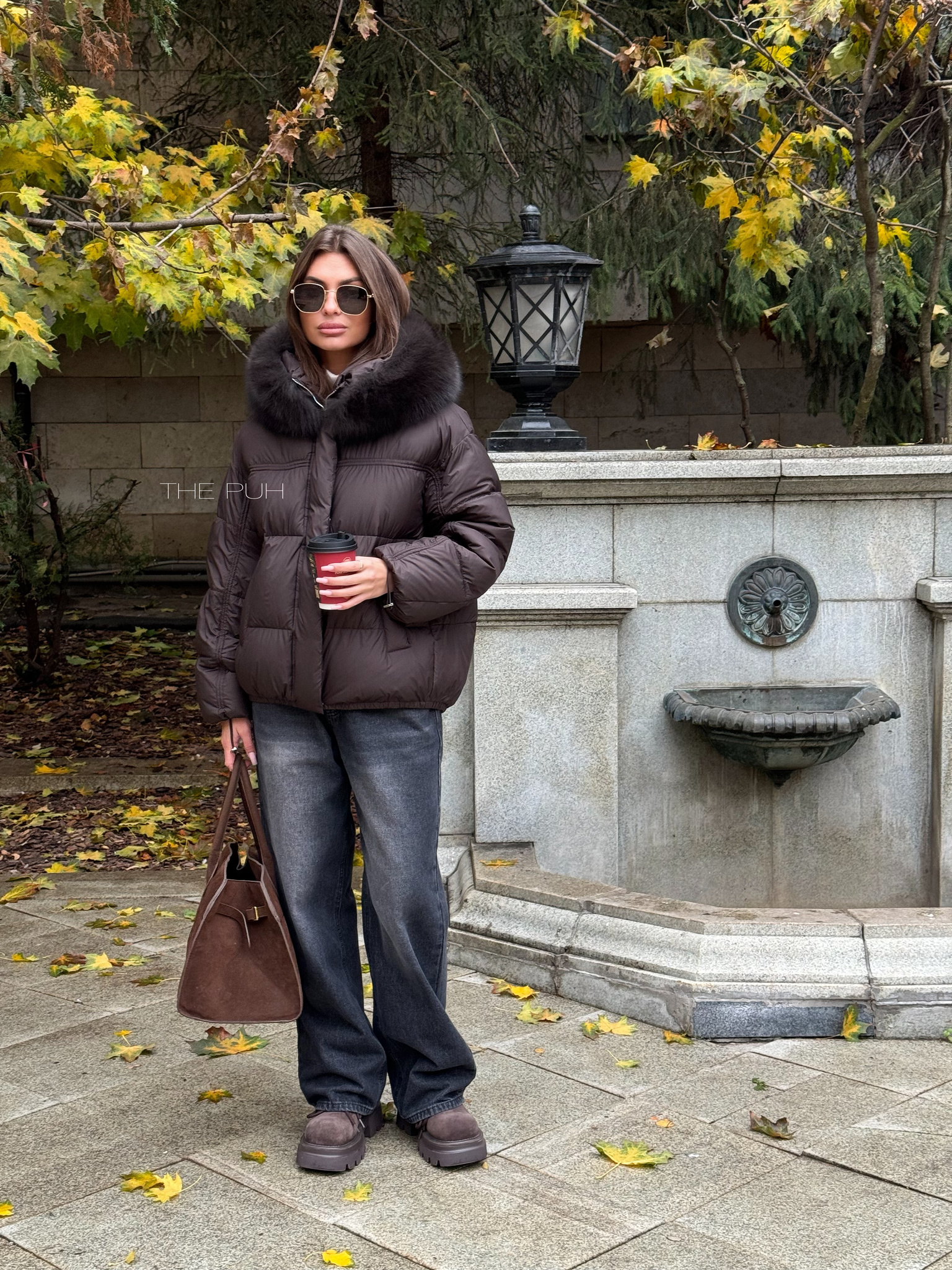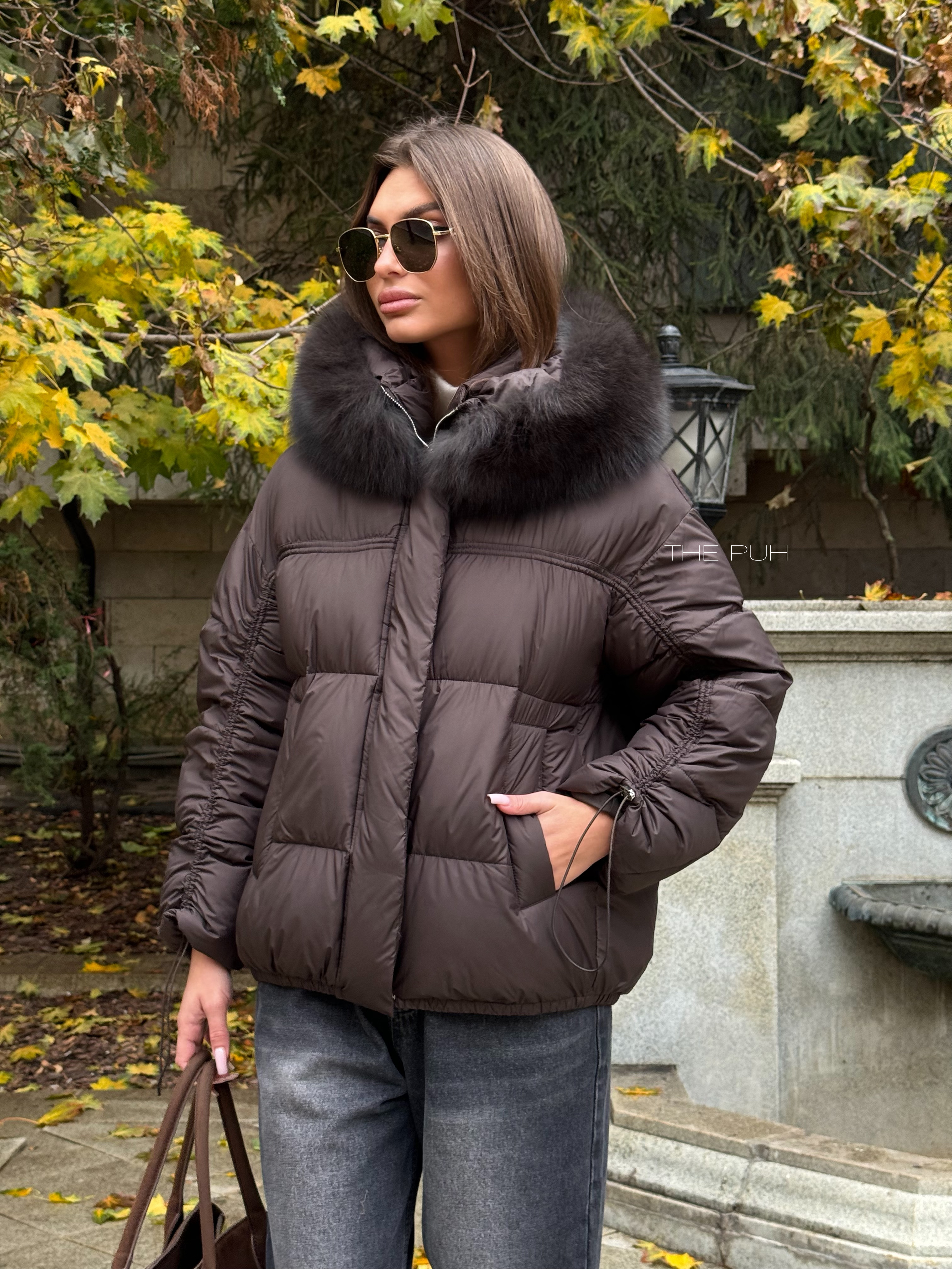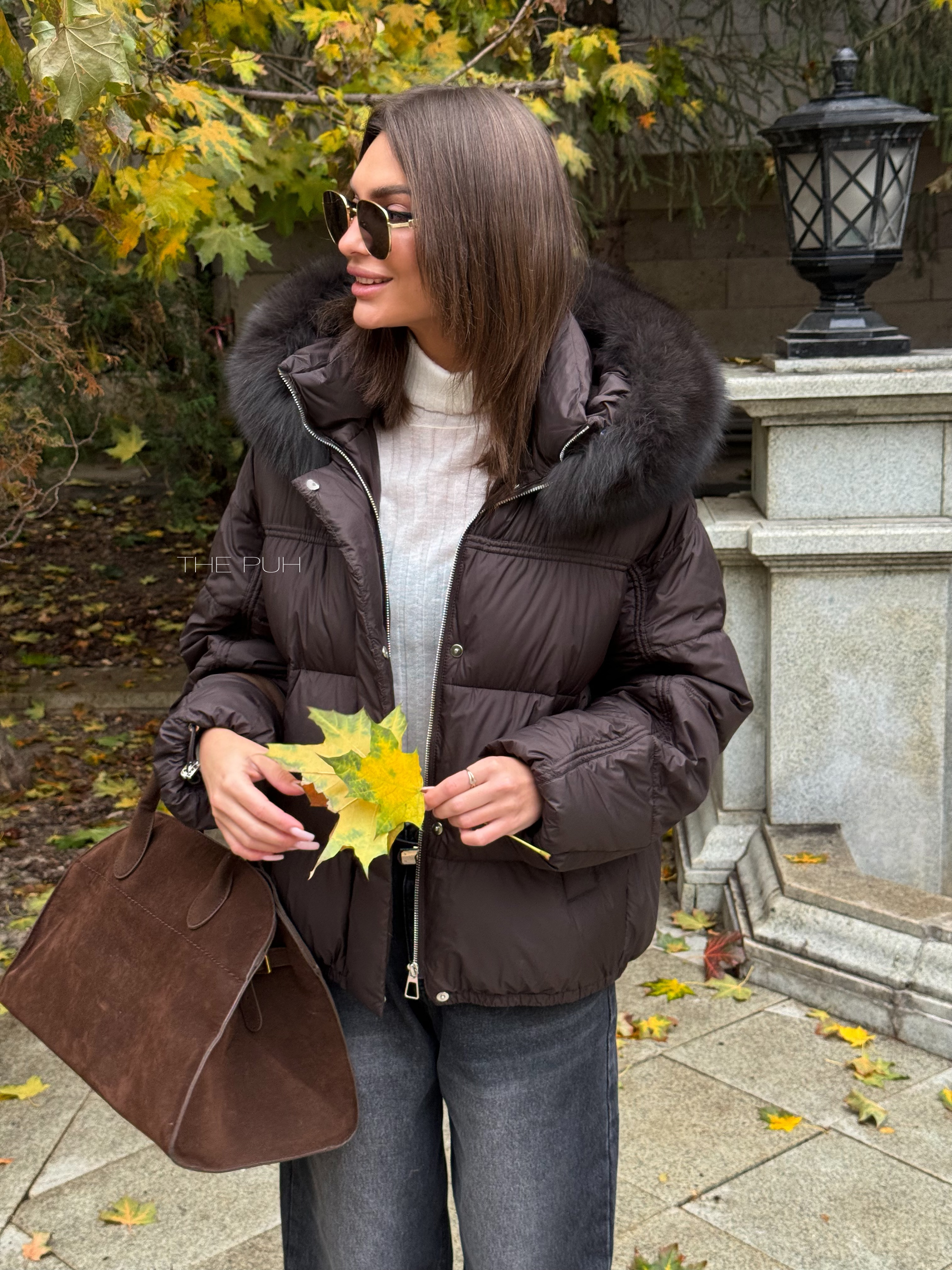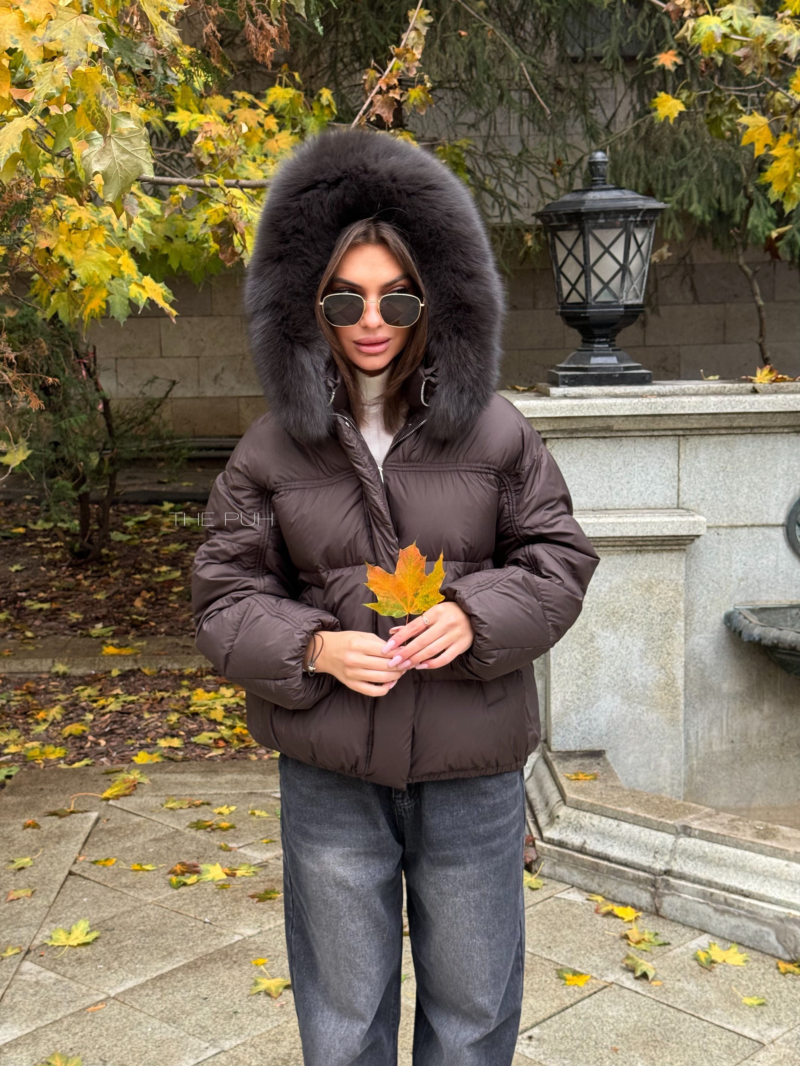 Короткий пуховик шоколадного цвета с меховой отделкой капюшона и затяжками на рукавах, которые позволяют регулировать их длину. Модель утеплена натуральным пухом, что позволяет ей выдерживать зимние холода.