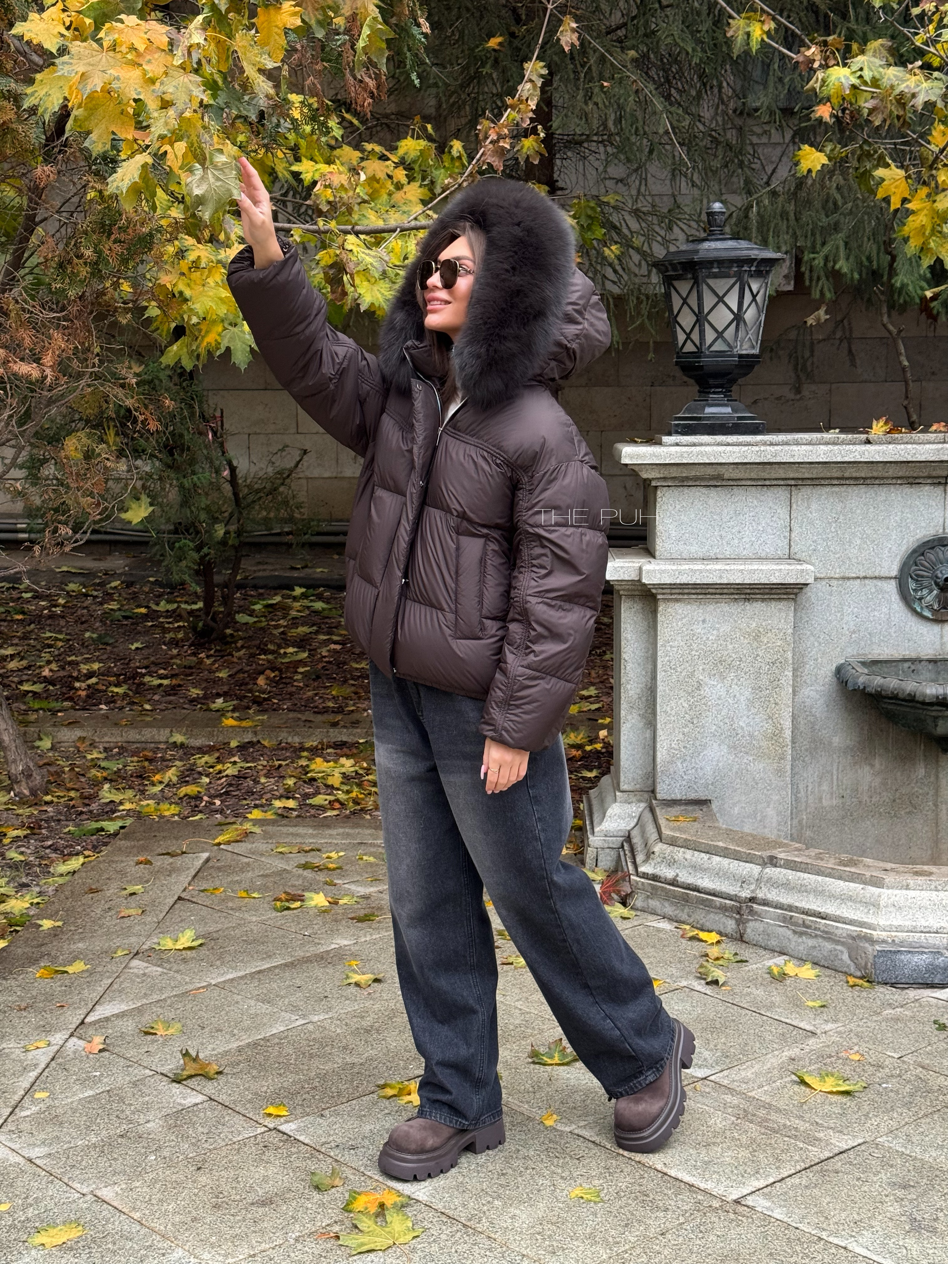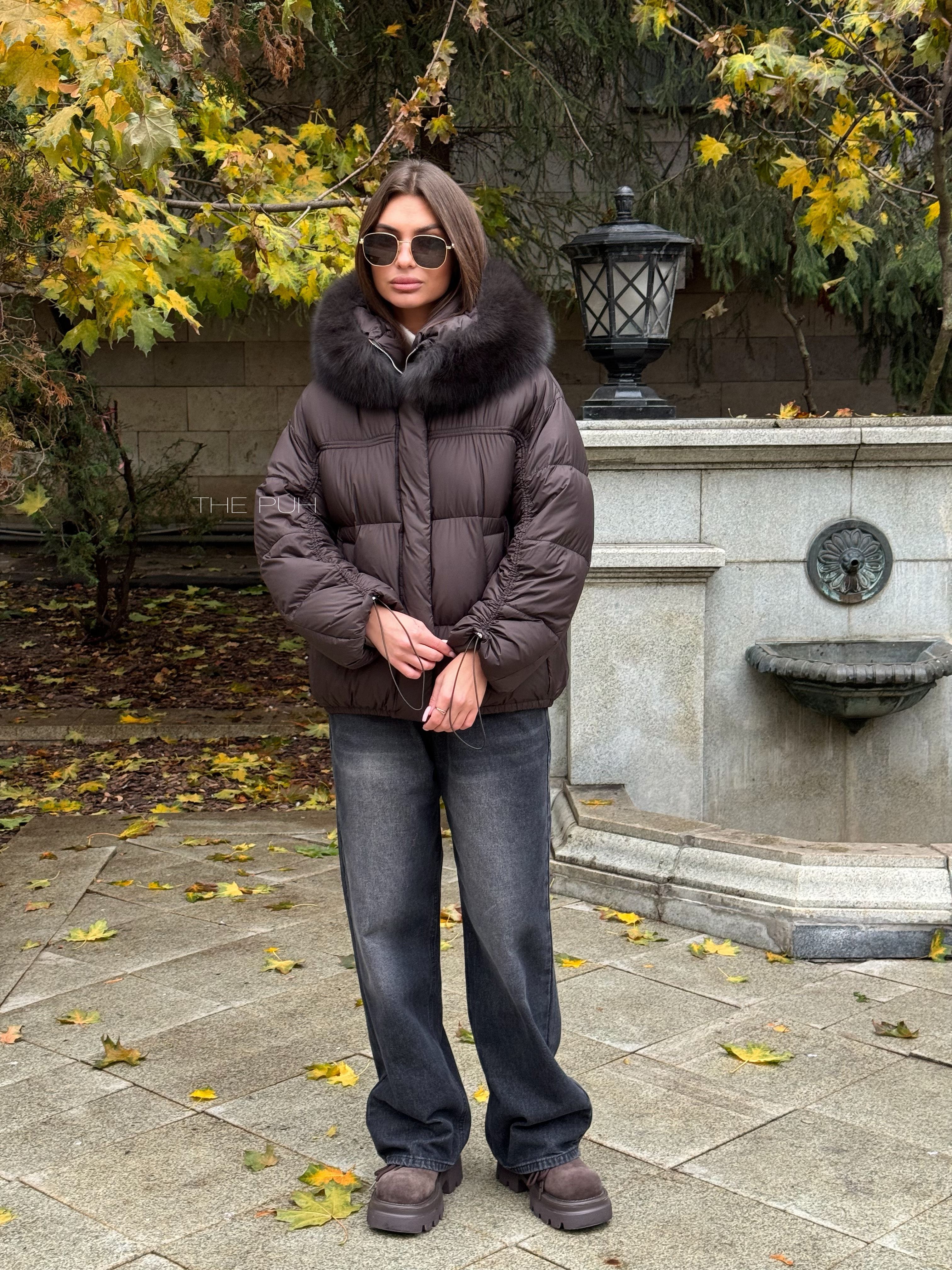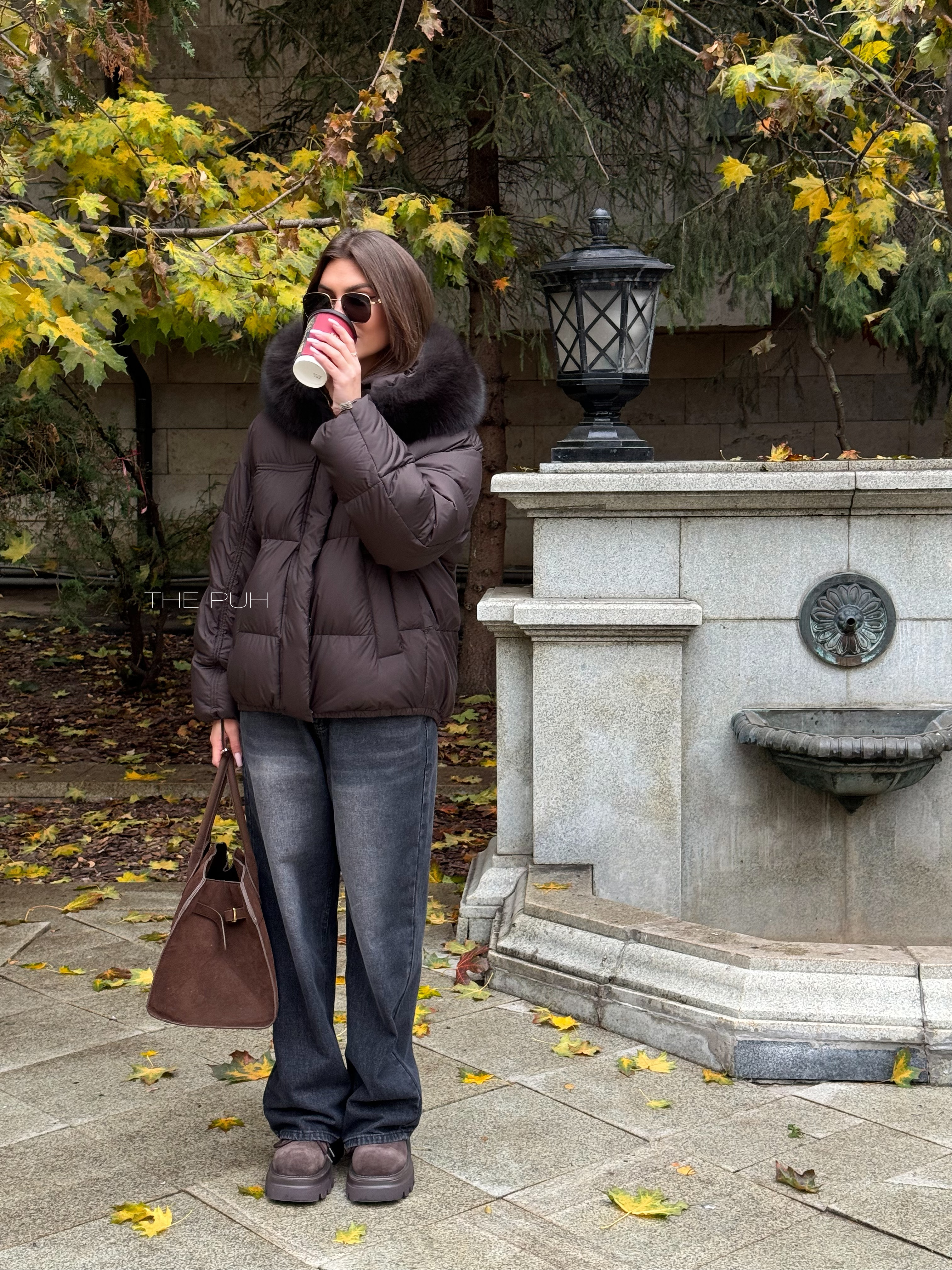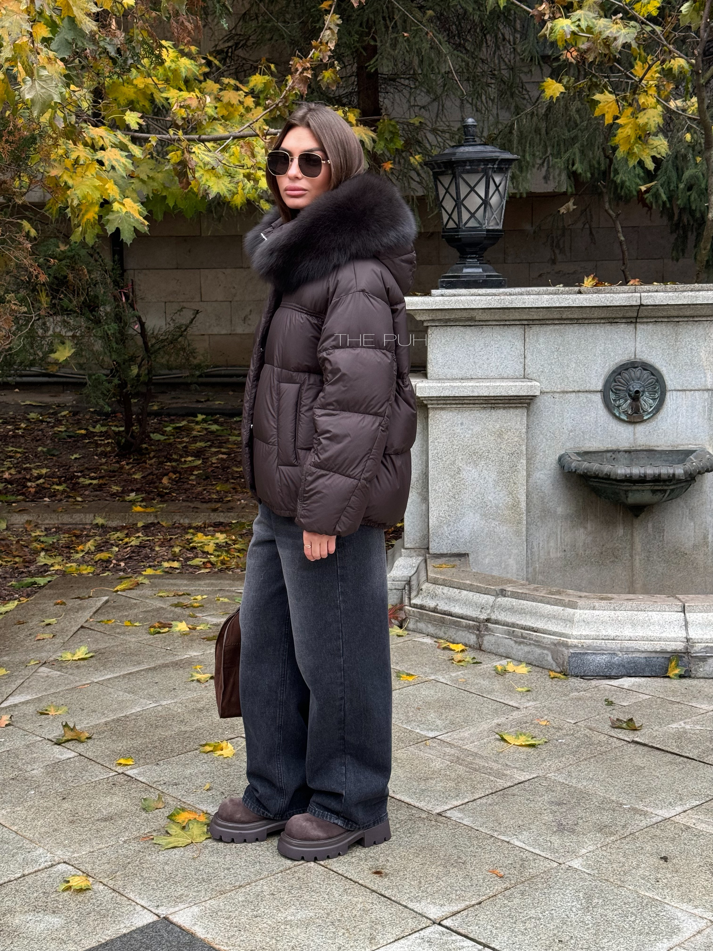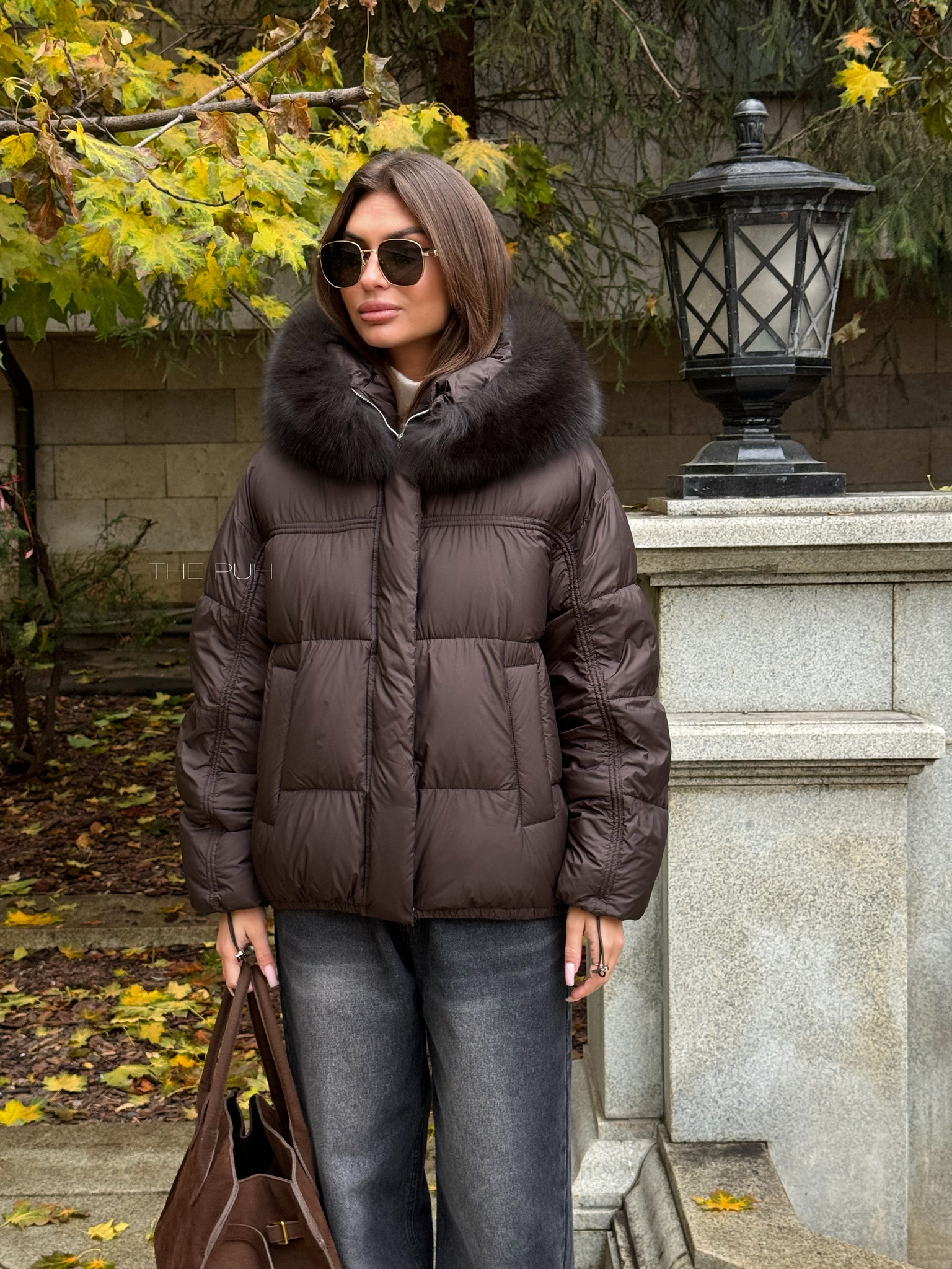 Короткий пуховик шоколадного цвета с меховой отделкой капюшона и затяжками на рукавах, которые позволяют регулировать их длину. Модель утеплена натуральным пухом, что позволяет ей выдерживать зимние холода.