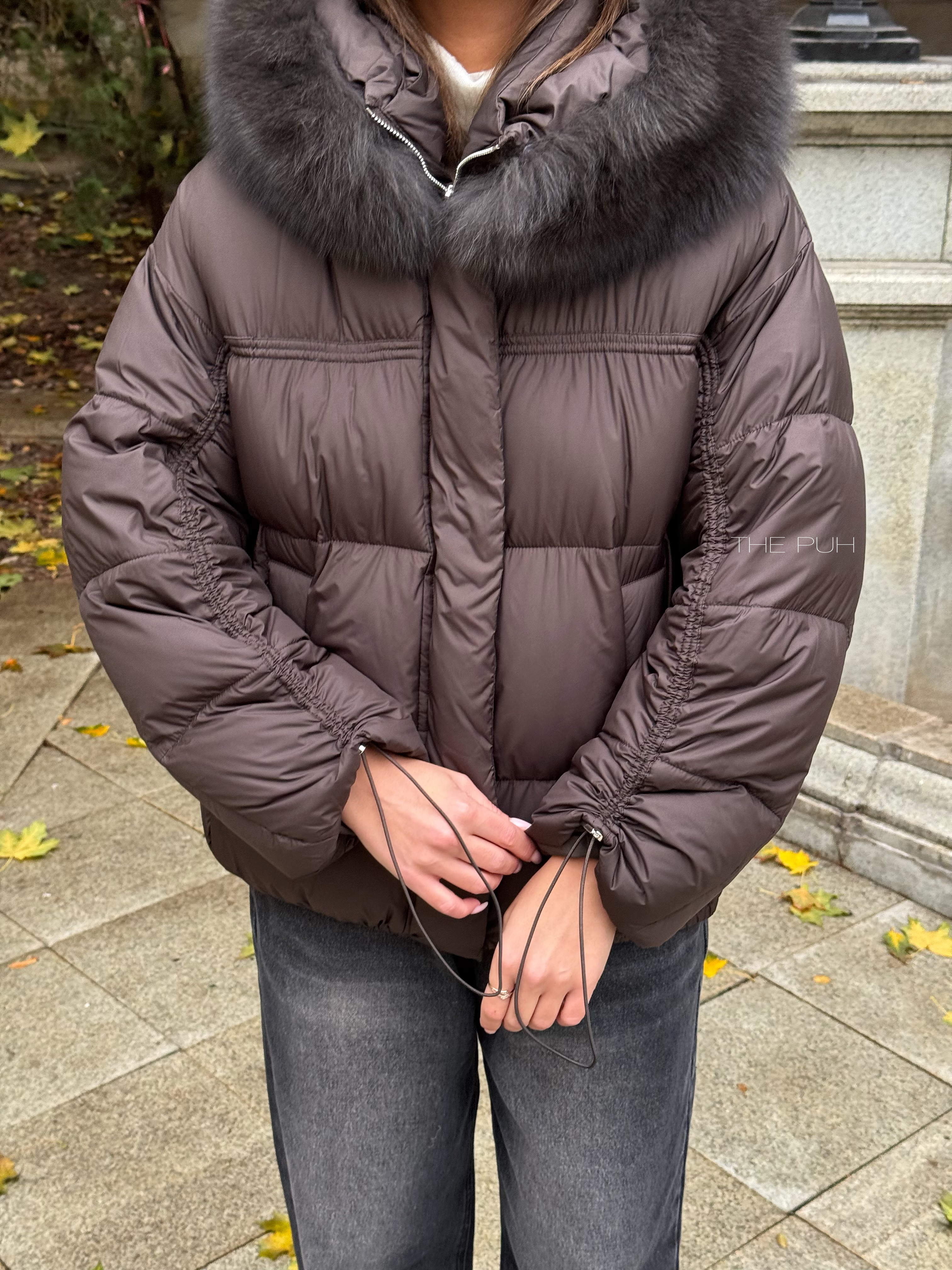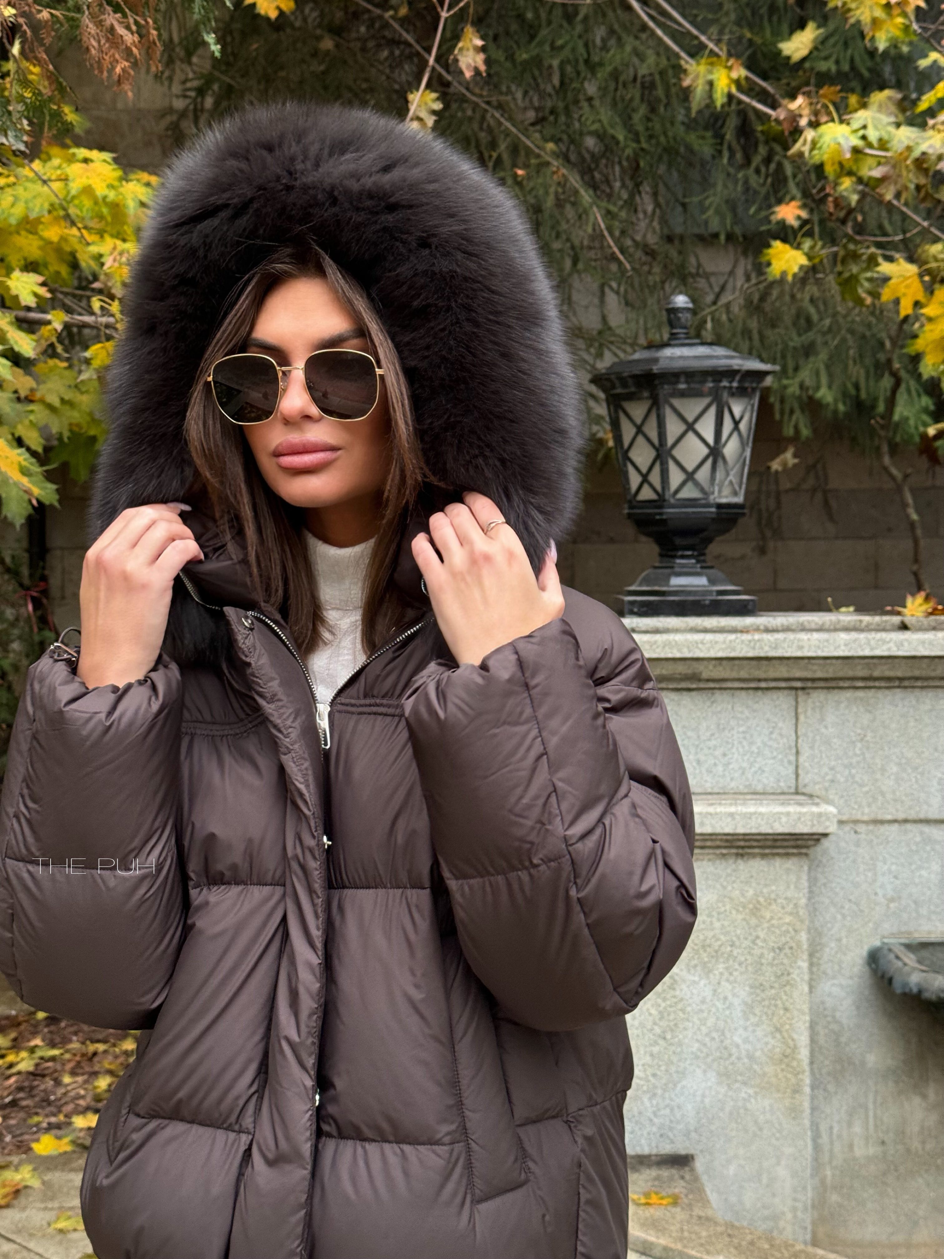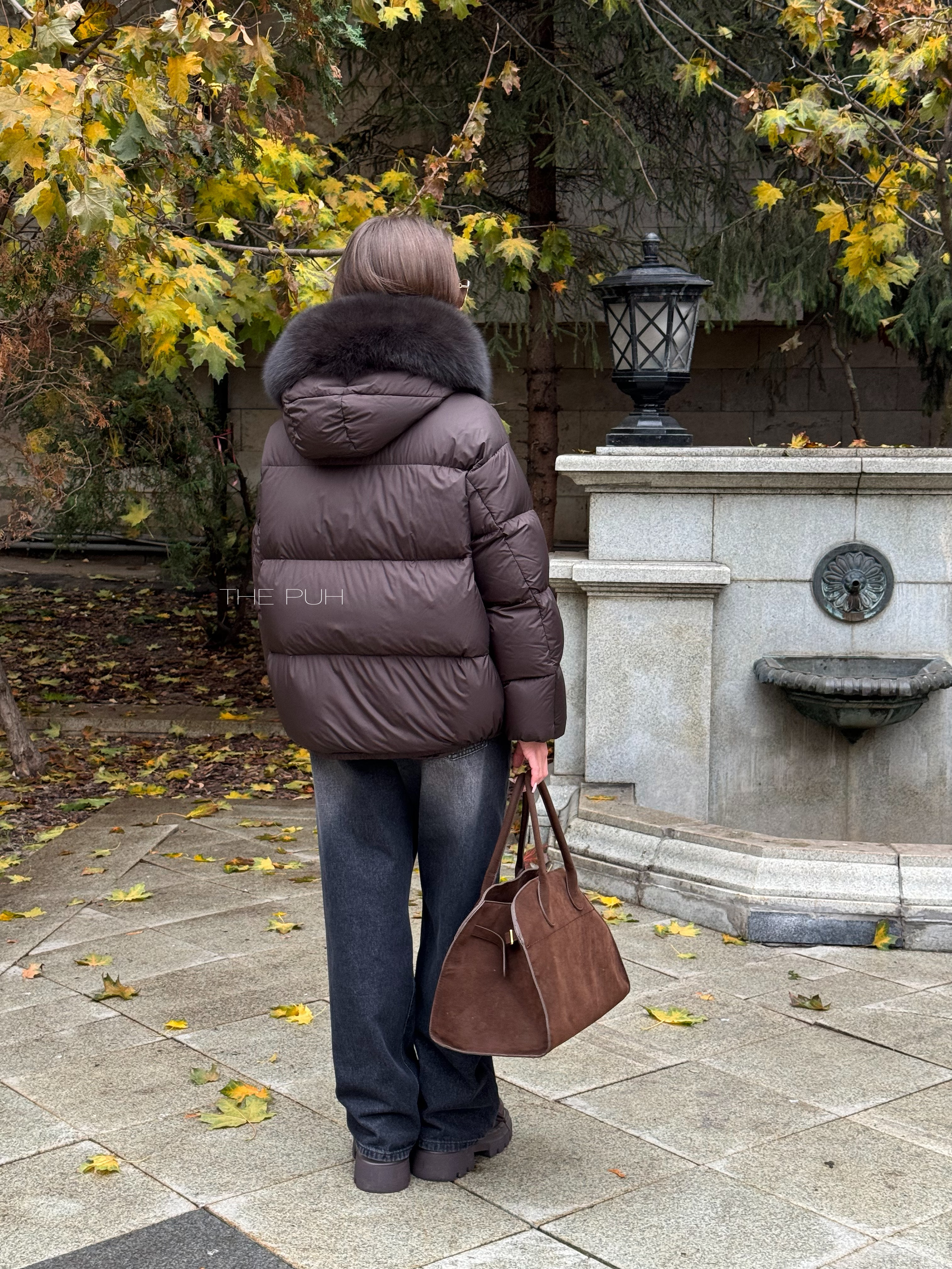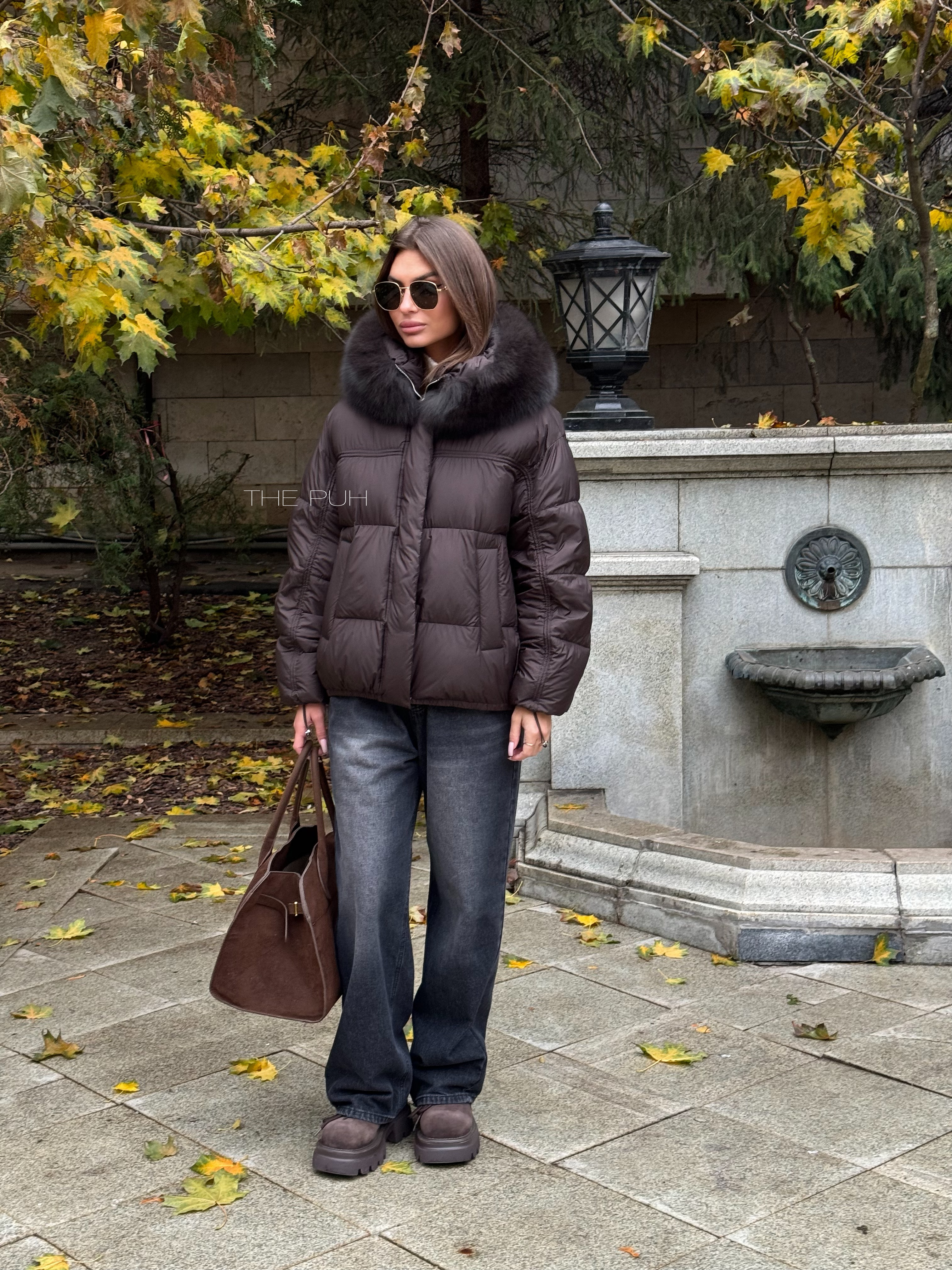 Короткий пуховик шоколадного цвета с меховой отделкой капюшона и затяжками на рукавах, которые позволяют регулировать их длину. Модель утеплена натуральным пухом, что позволяет ей выдерживать зимние холода.