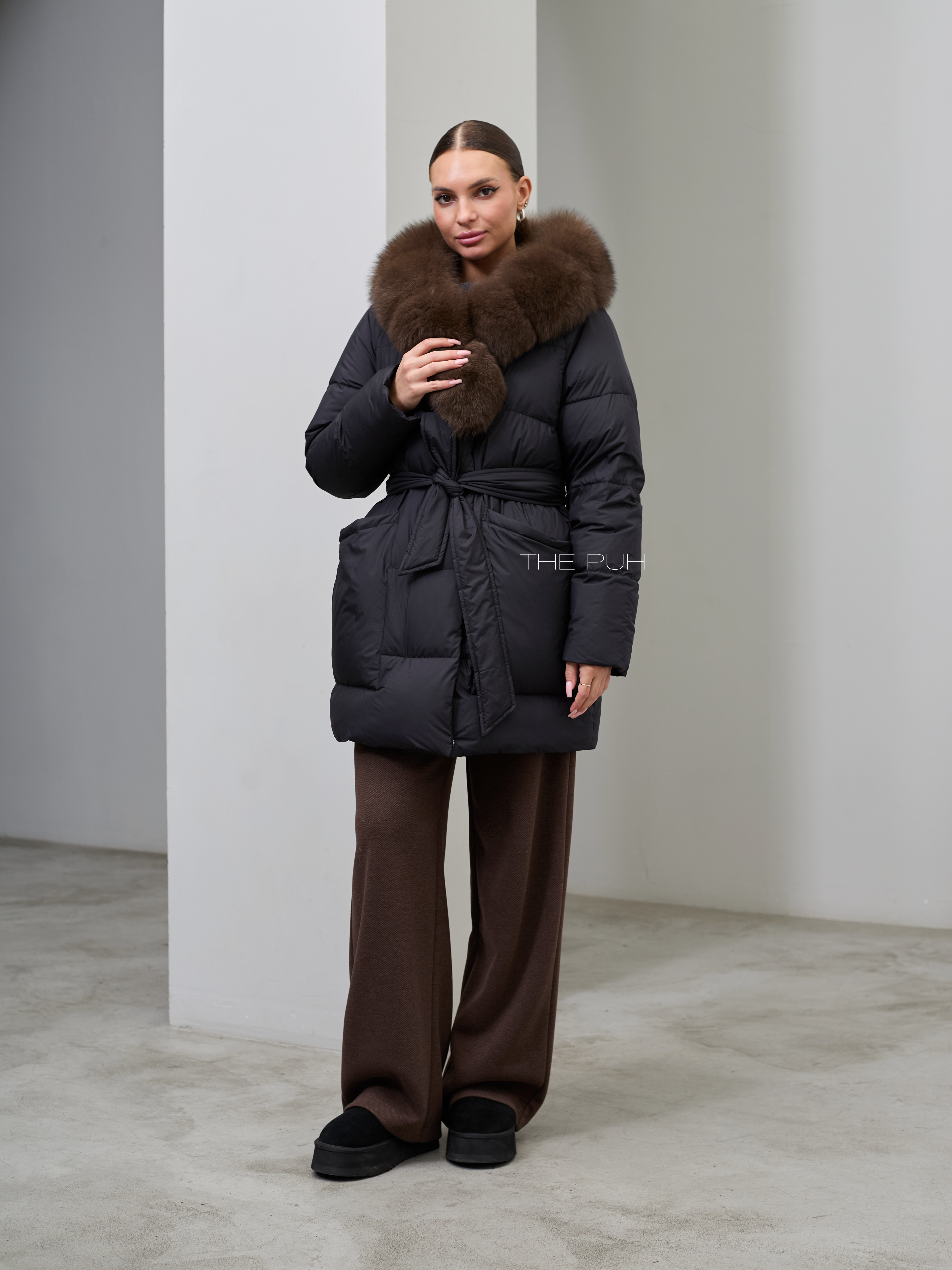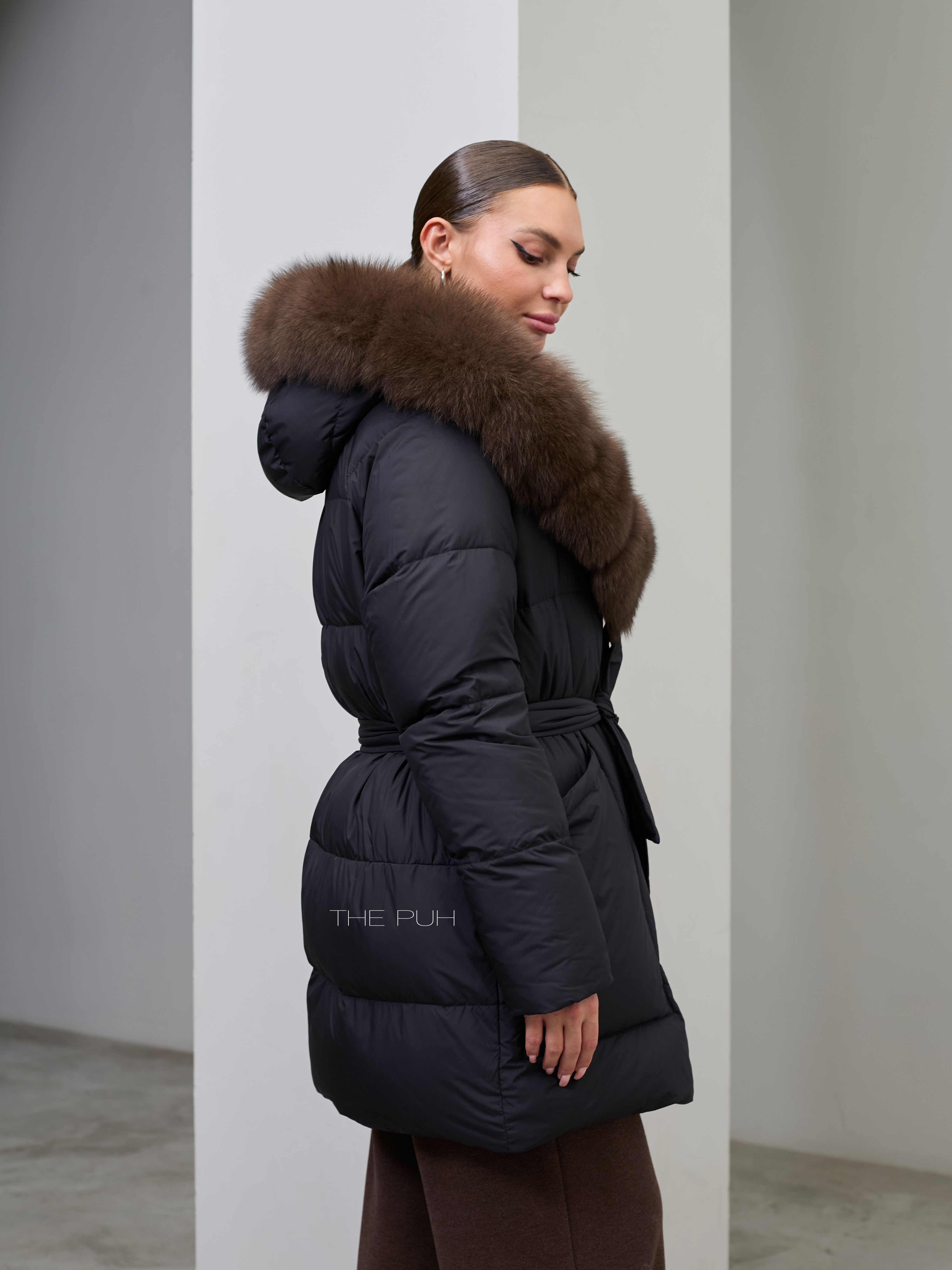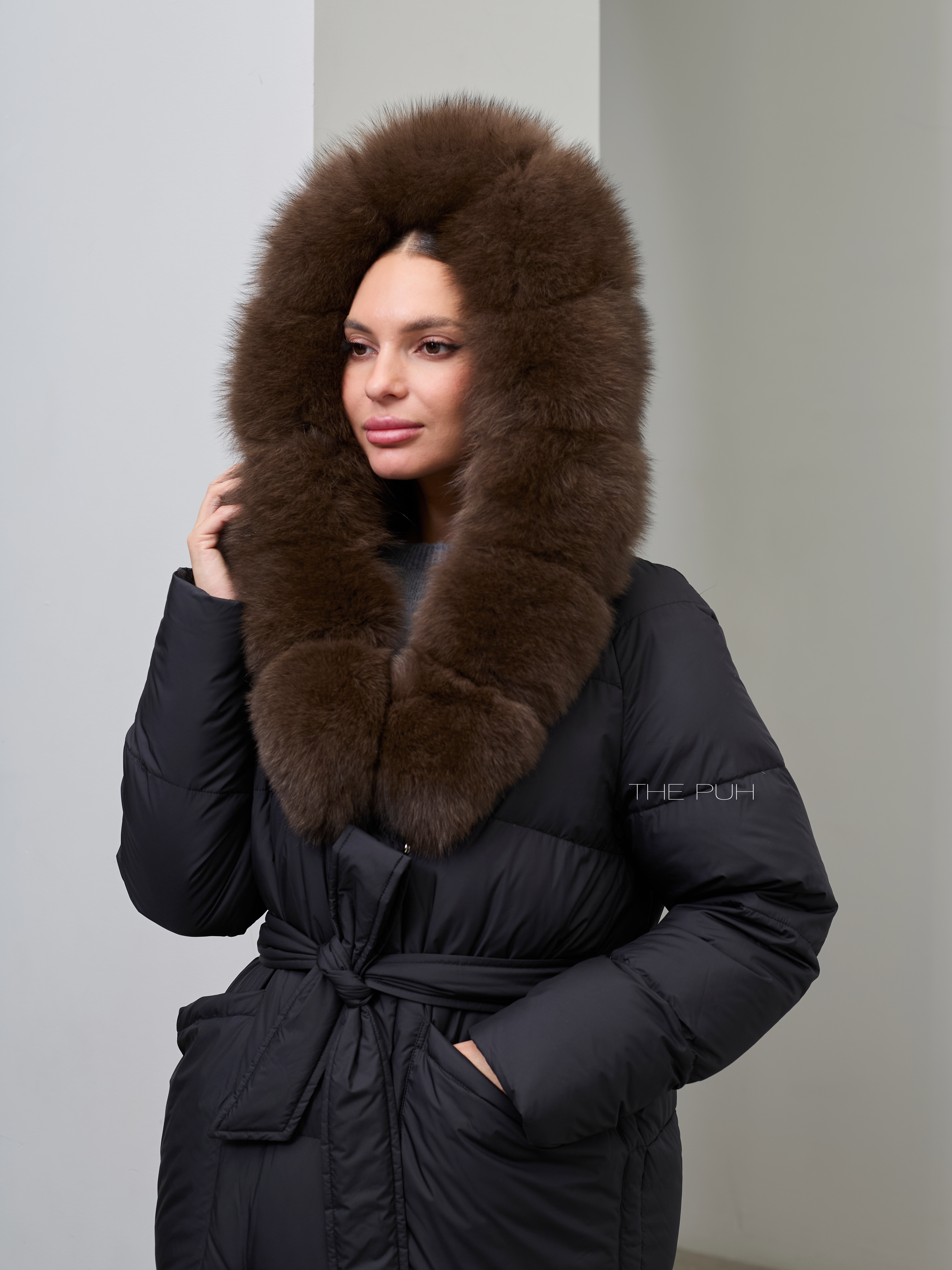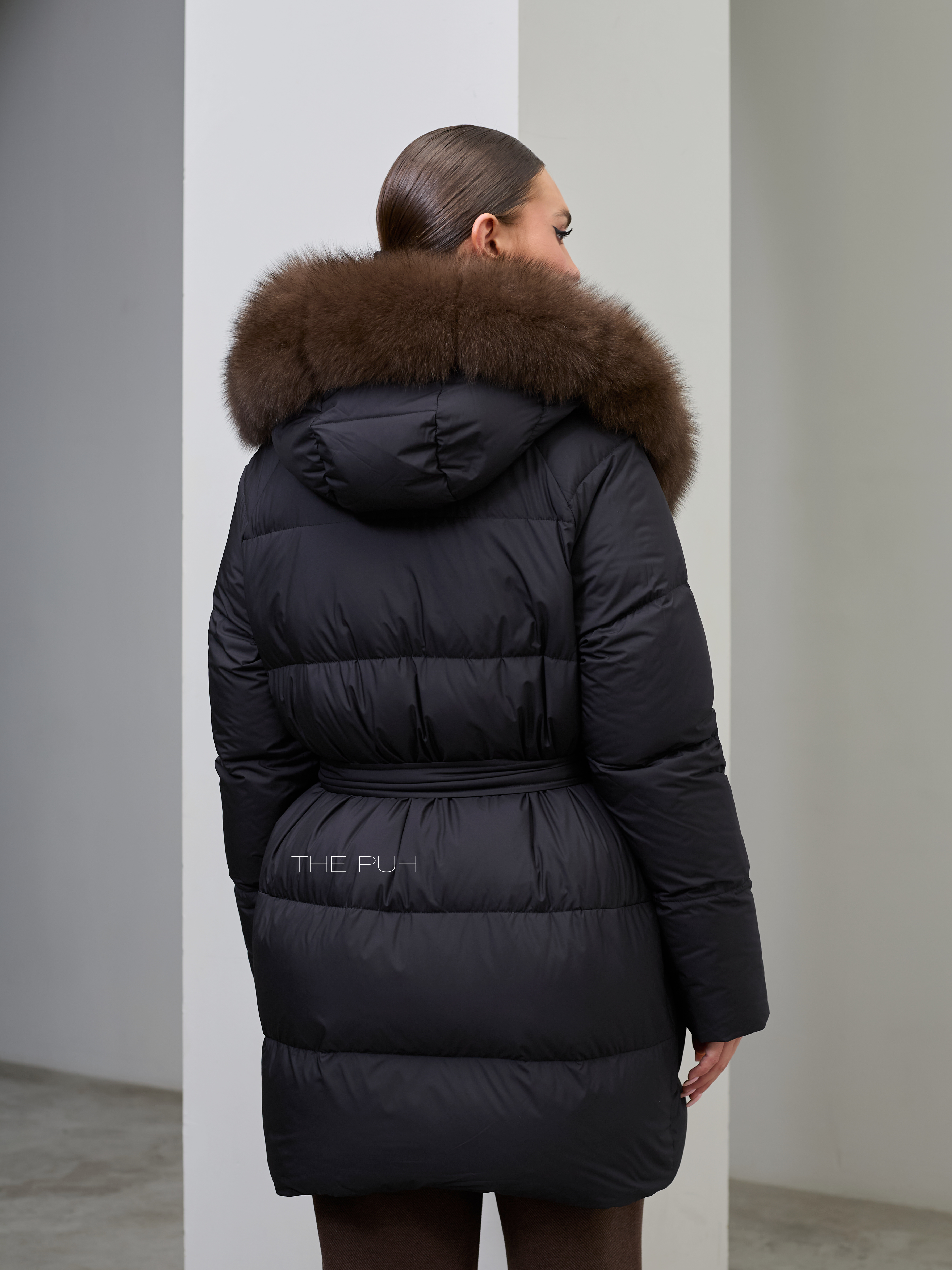 Удлиненный пуховик черного цвета застегивается на молнию с пуговицами и дополнен поясом, благодаря которому вы можете изменять силуэт и контролировать прилегание пуховика. Модель утеплена натуральным гусиным пухом и способна выдерживать самые крепкие морозы. Объемный теплый капюшон оторочен мехом коричневого цвета.