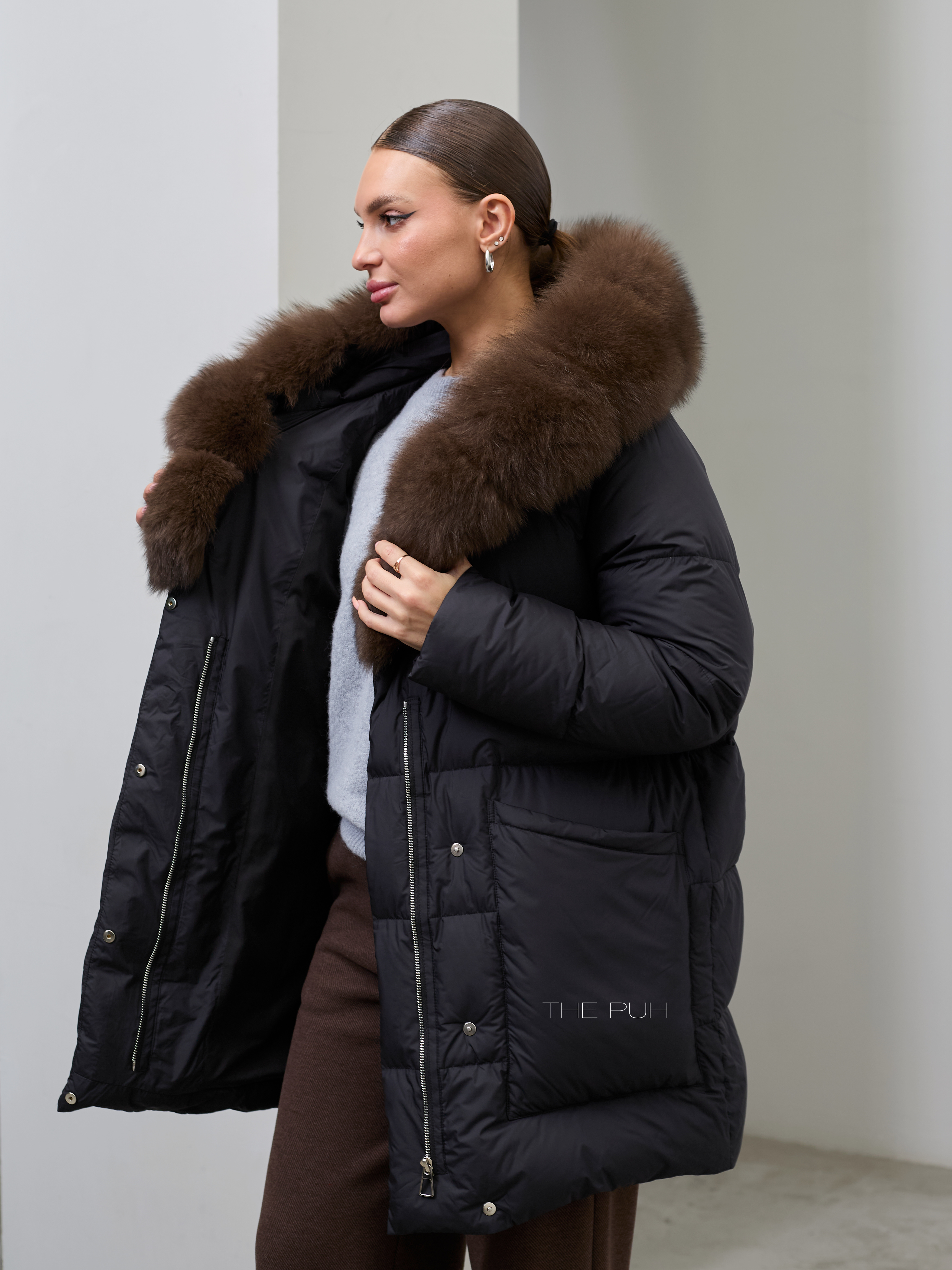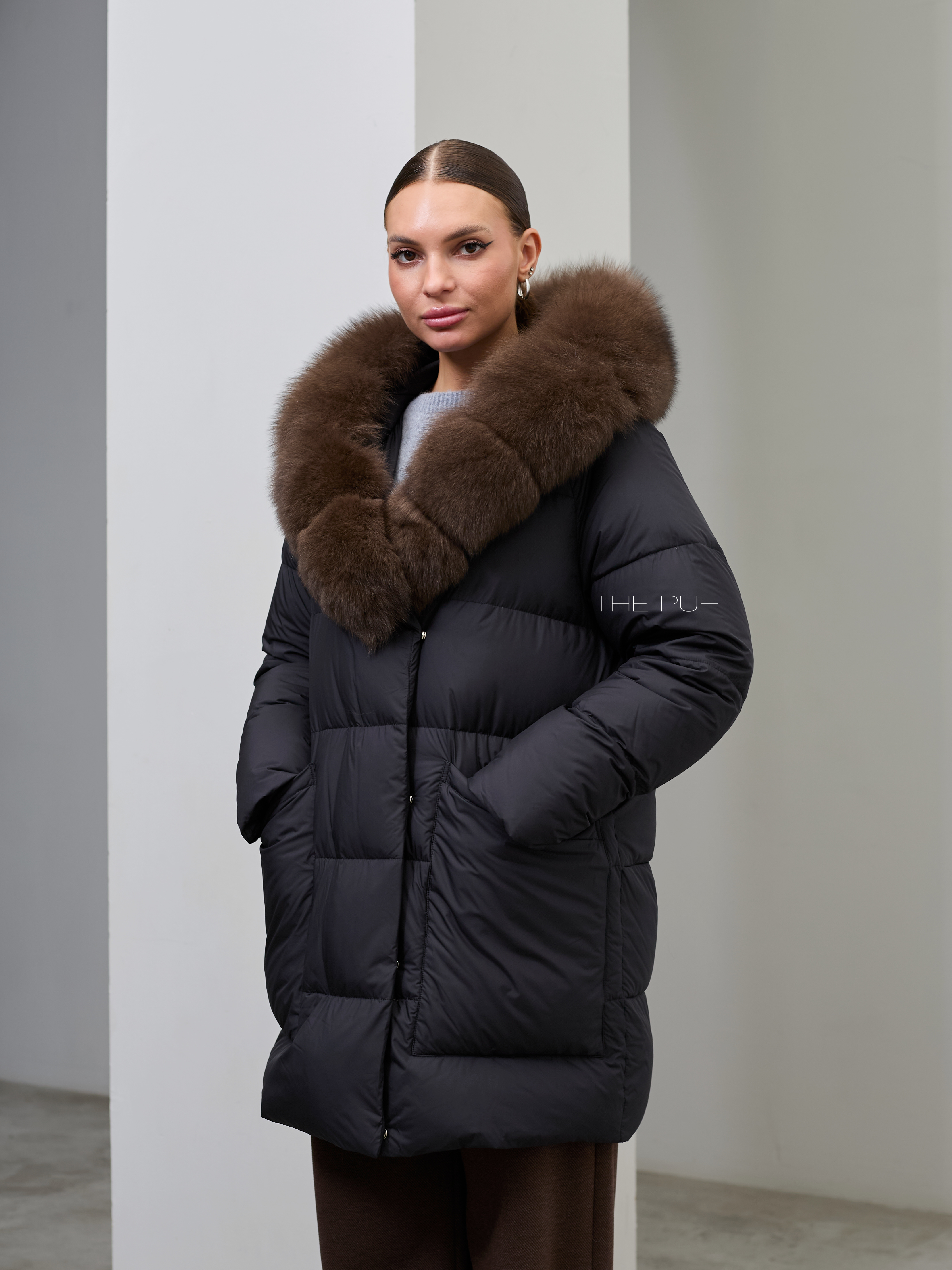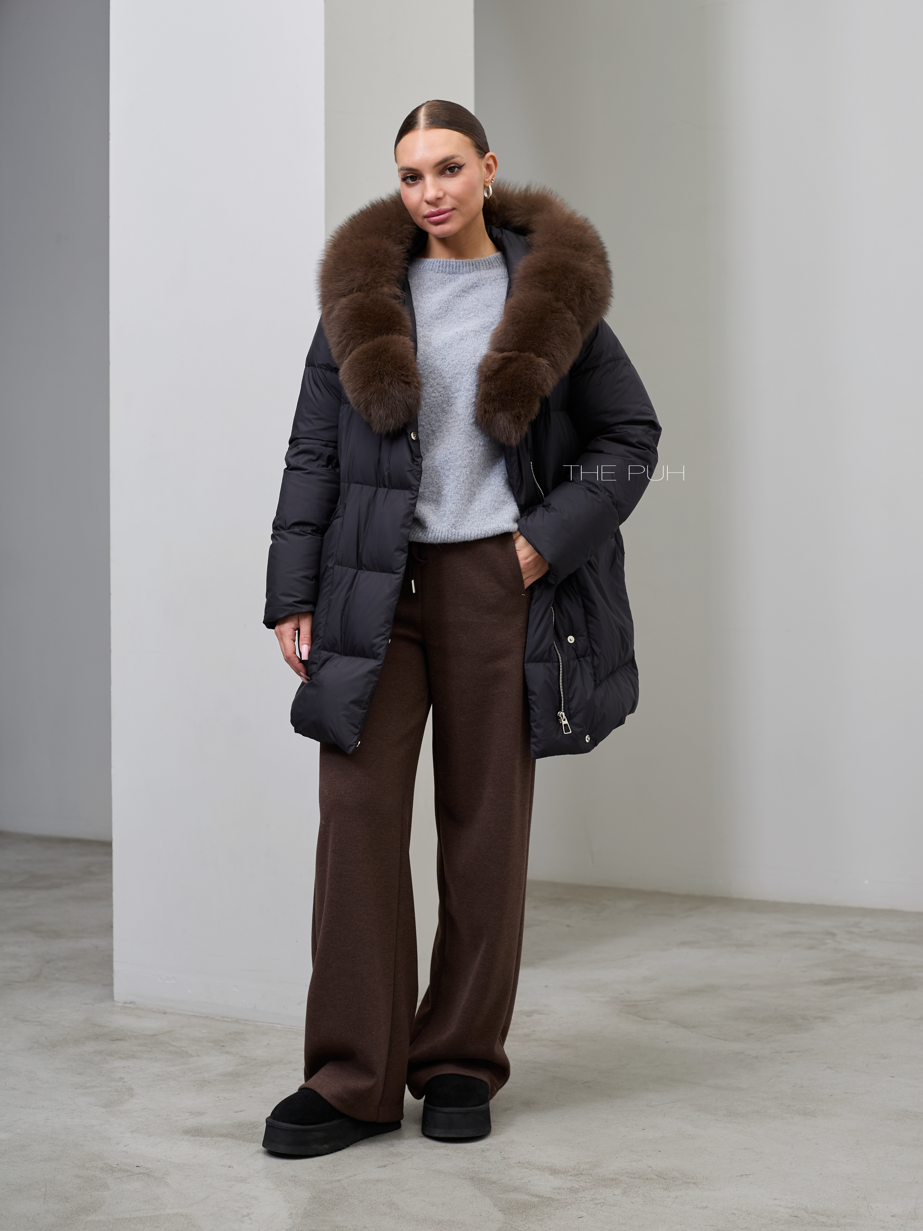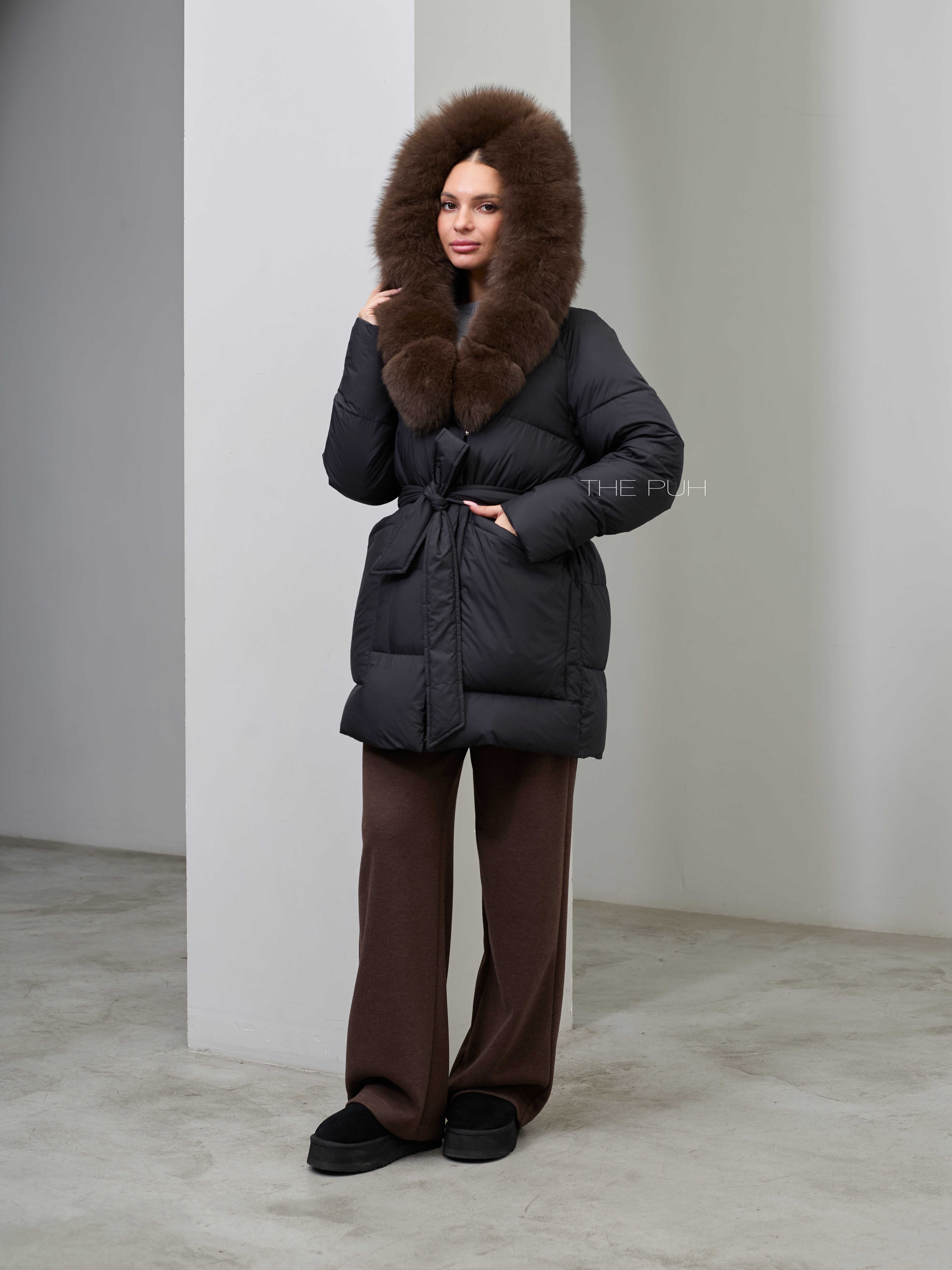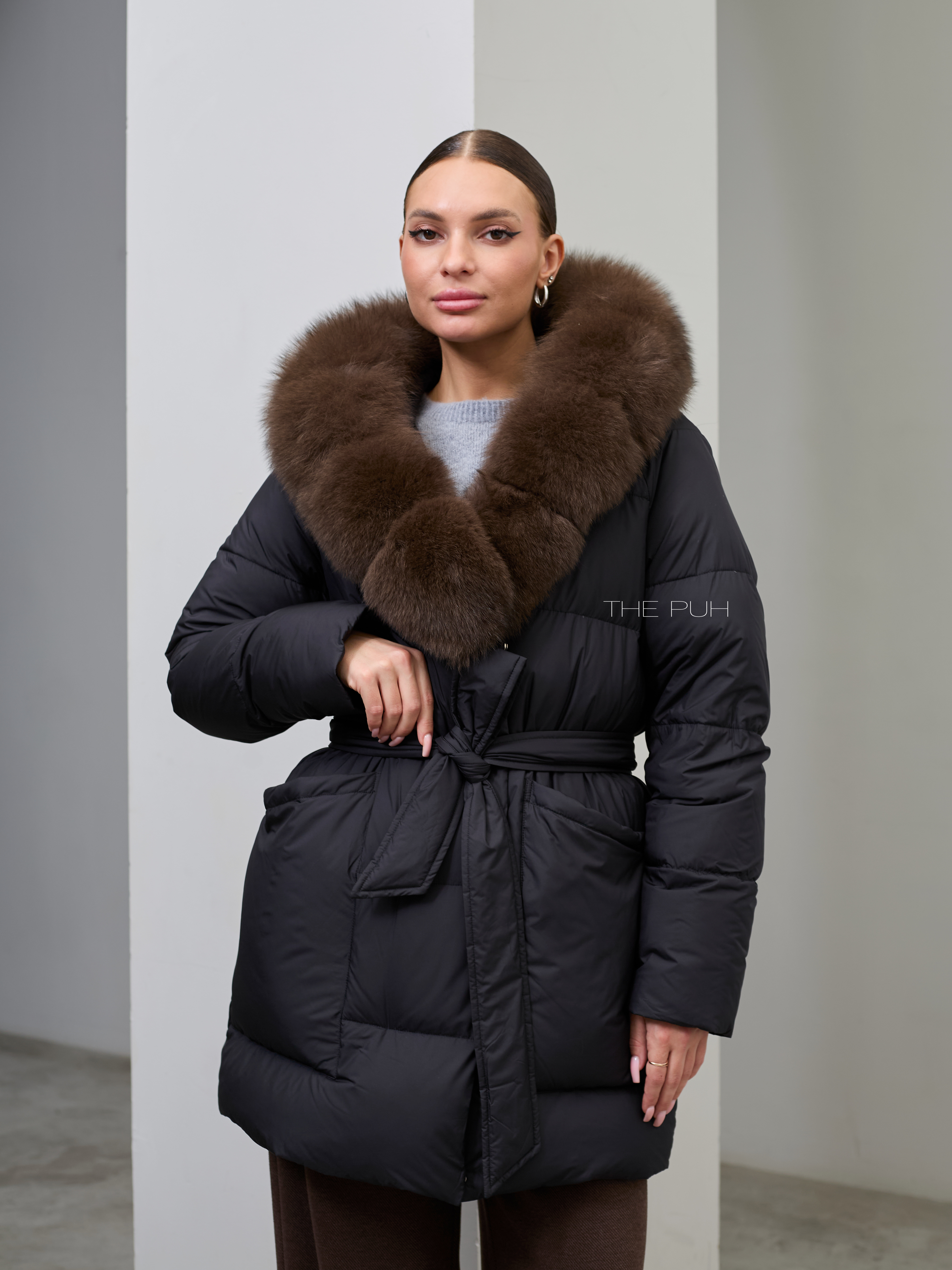 Удлиненный пуховик черного цвета застегивается на молнию с пуговицами и дополнен поясом, благодаря которому вы можете изменять силуэт и контролировать прилегание пуховика. Модель утеплена натуральным гусиным пухом и способна выдерживать самые крепкие морозы. Объемный теплый капюшон оторочен мехом коричневого цвета.