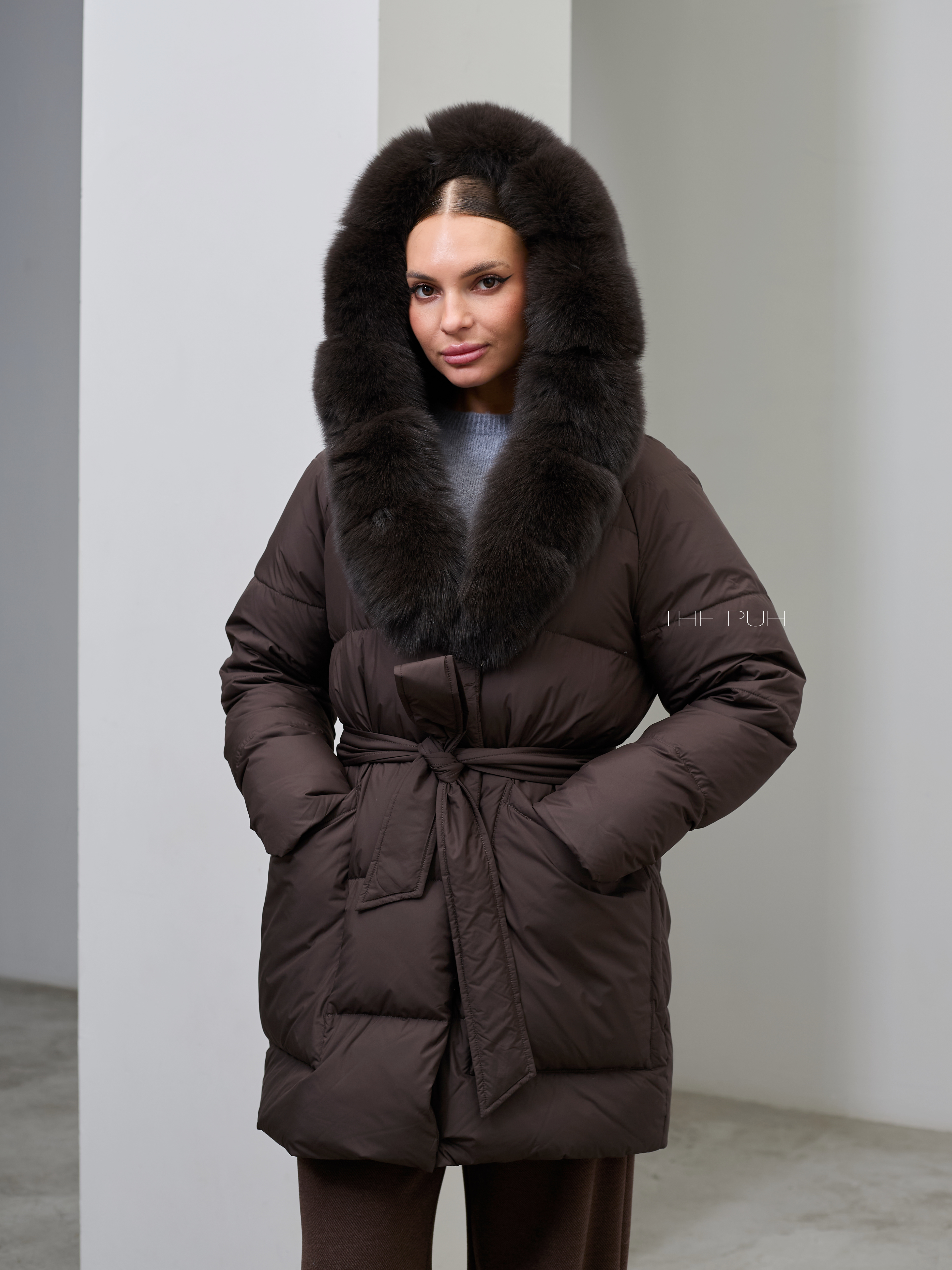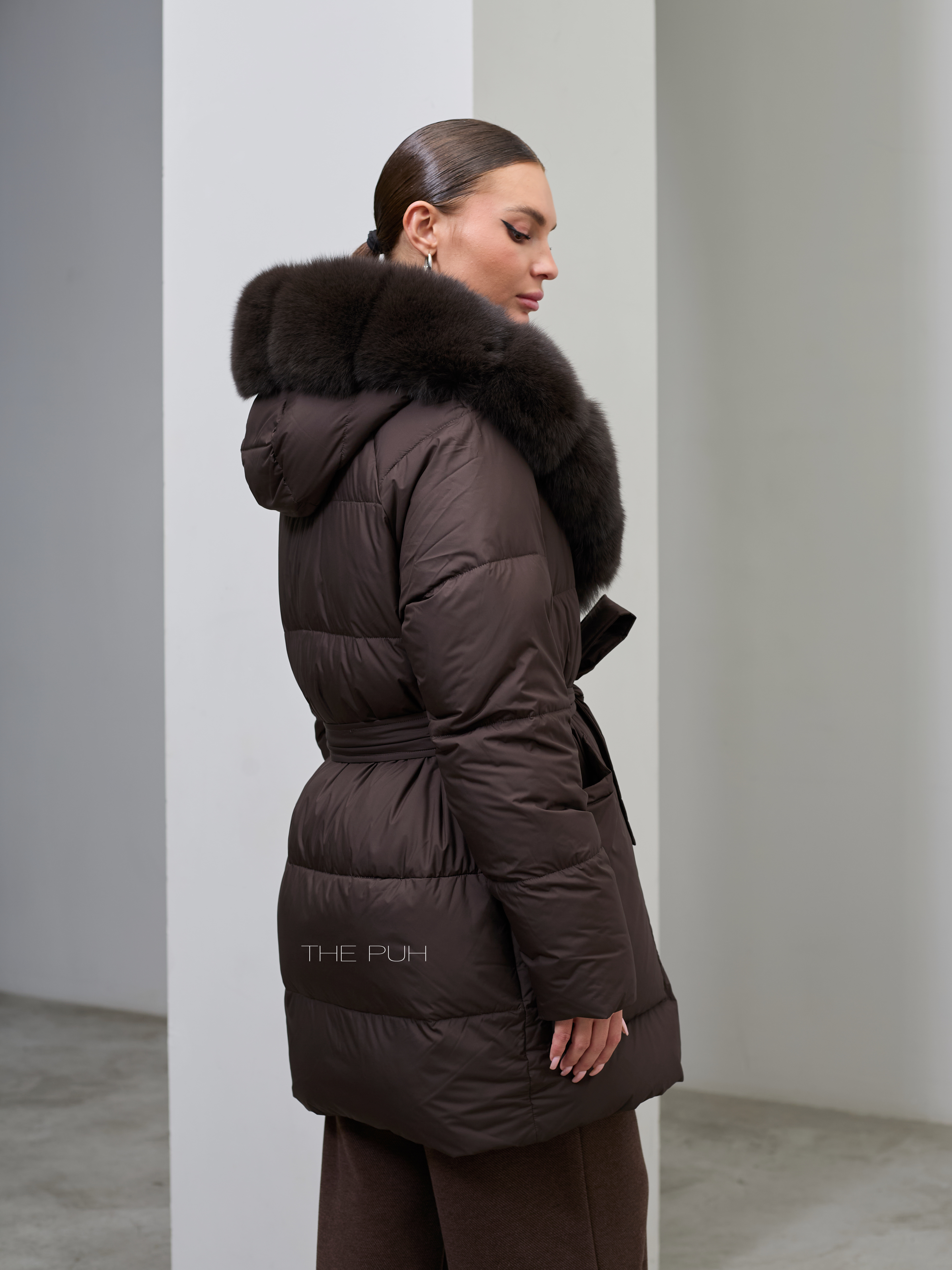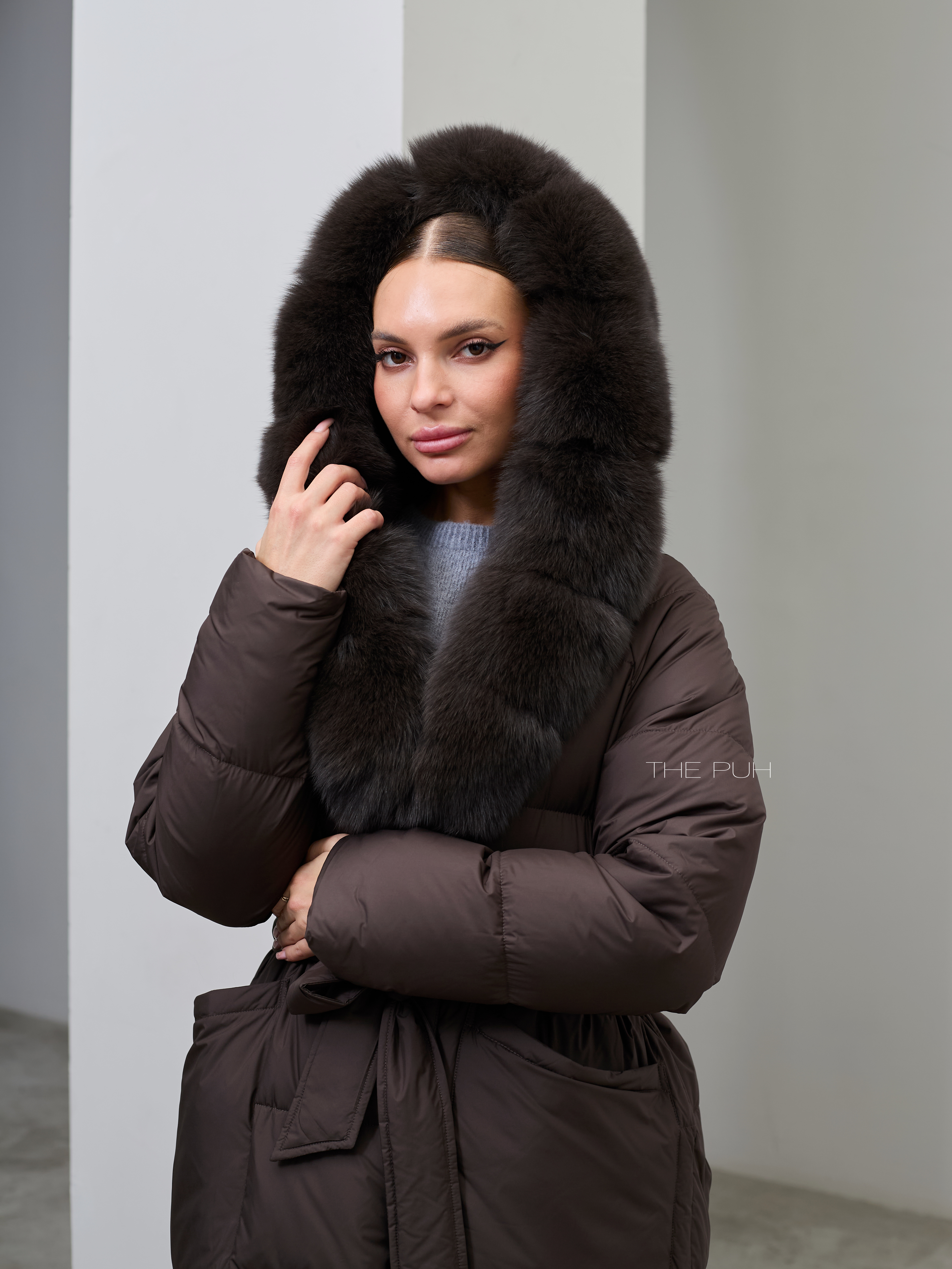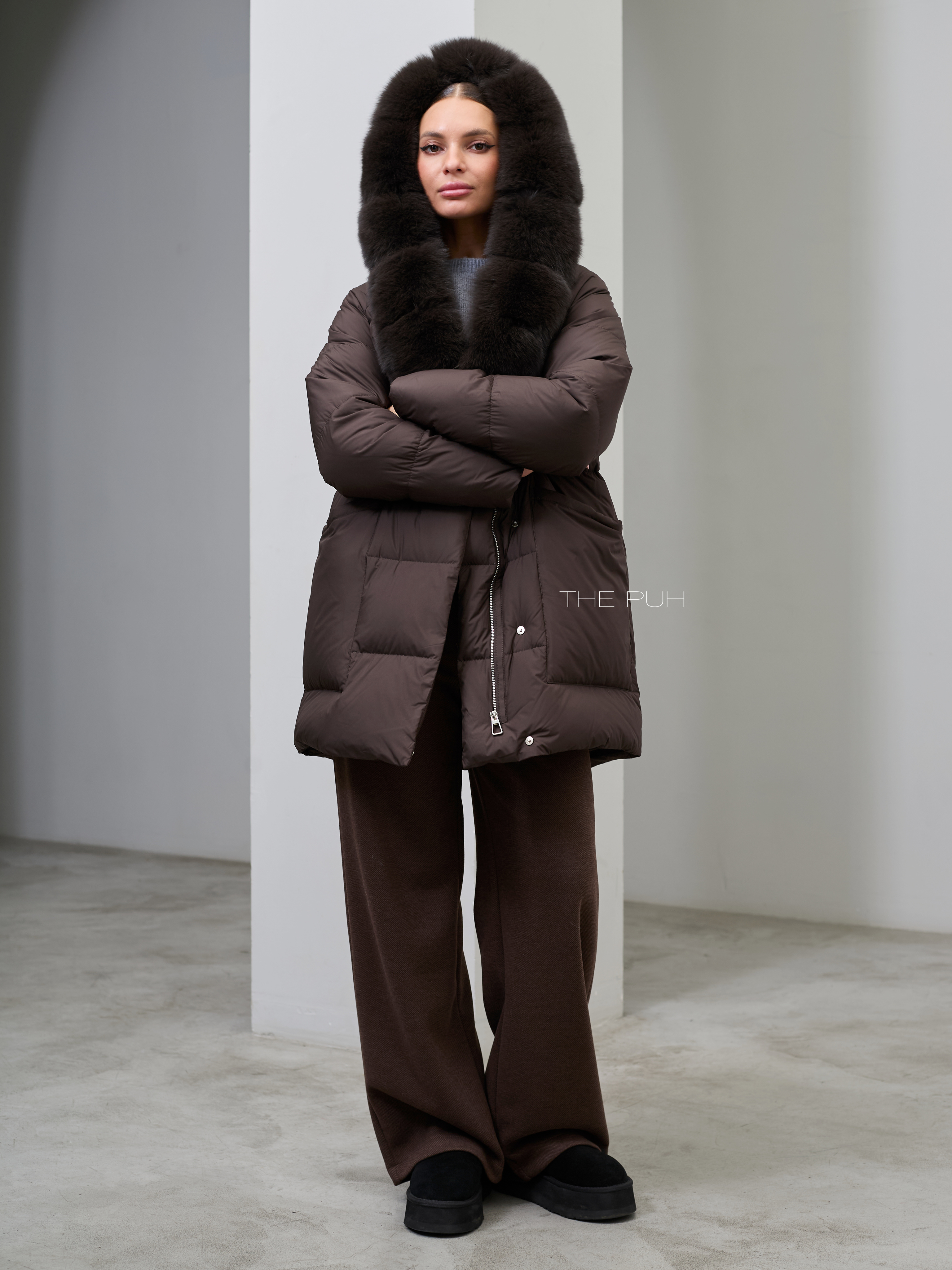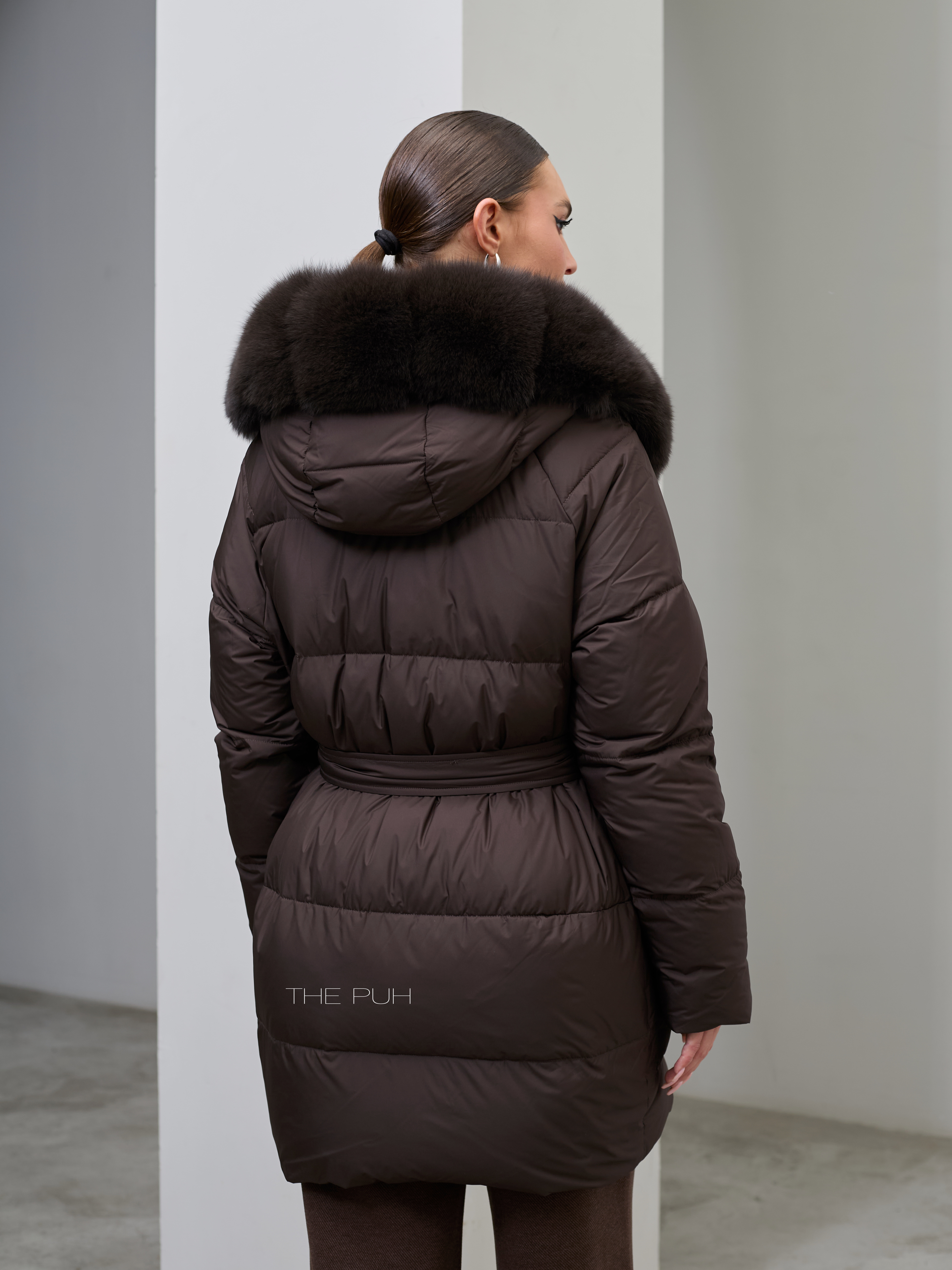 Удлиненный пуховик шоколадного цвета застегивается на молнию с пуговицами и дополнен поясом, благодаря которому вы можете изменять силуэт и контролировать прилегание пуховика. Модель утеплена натуральным гусиным пухом и способна выдерживать самые крепкие морозы. Объемный теплый капюшон оторочен мехом в тон.