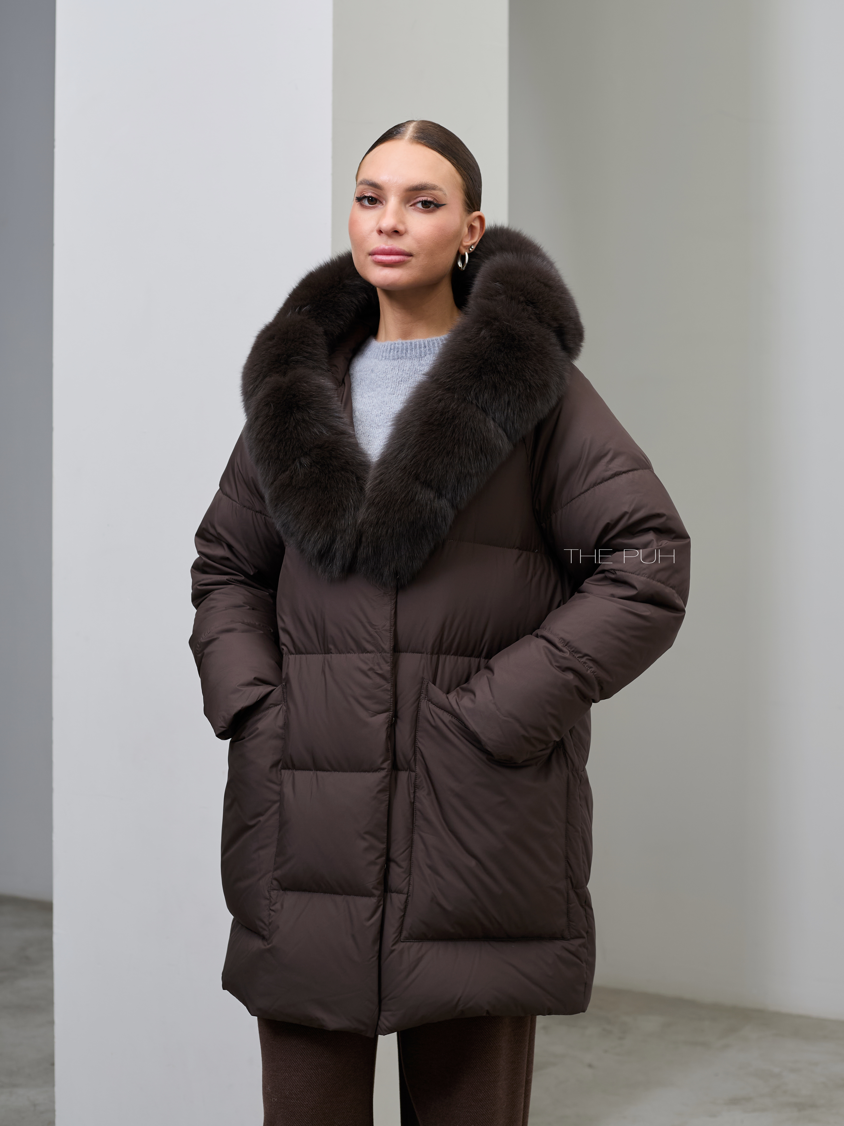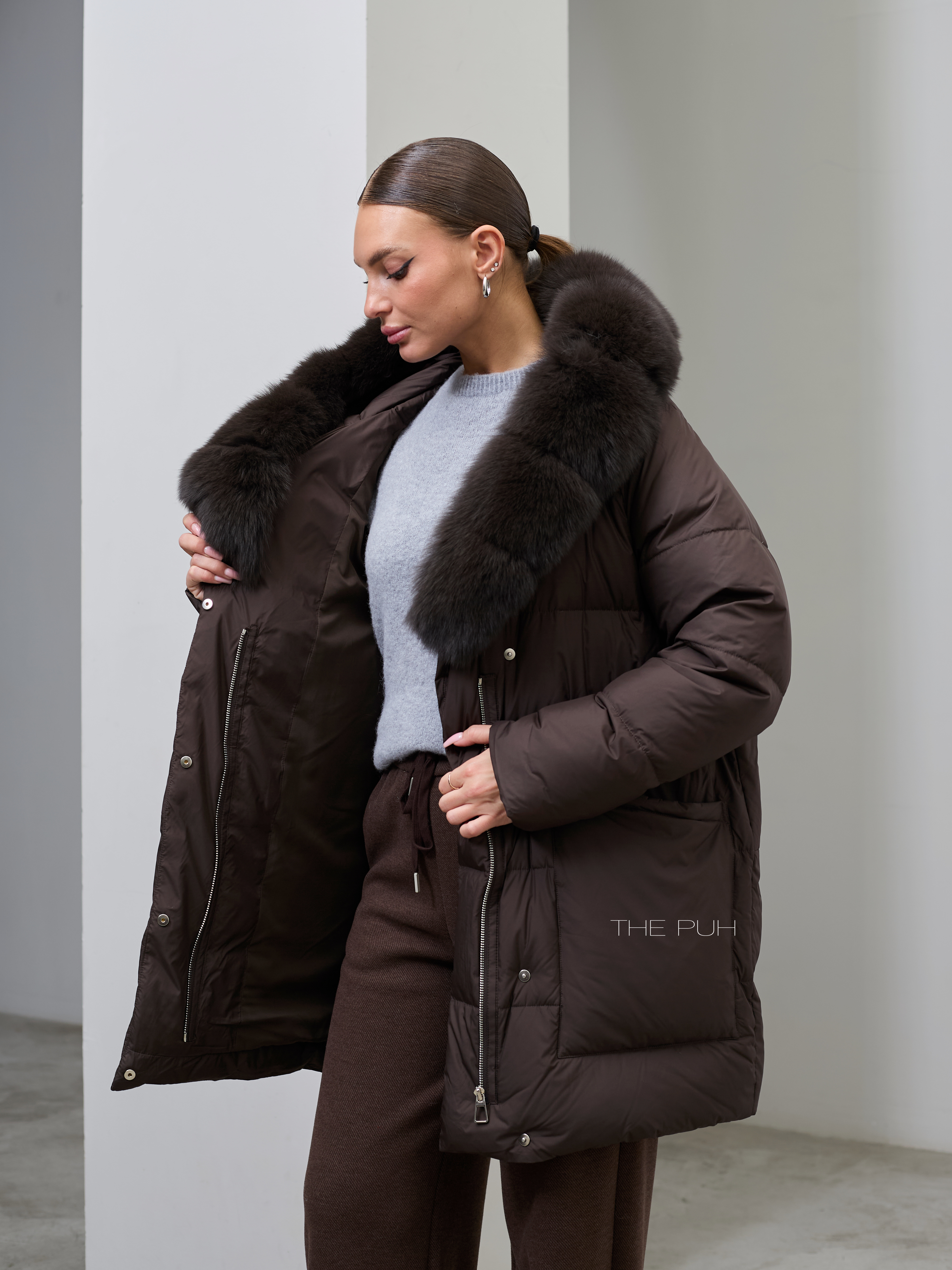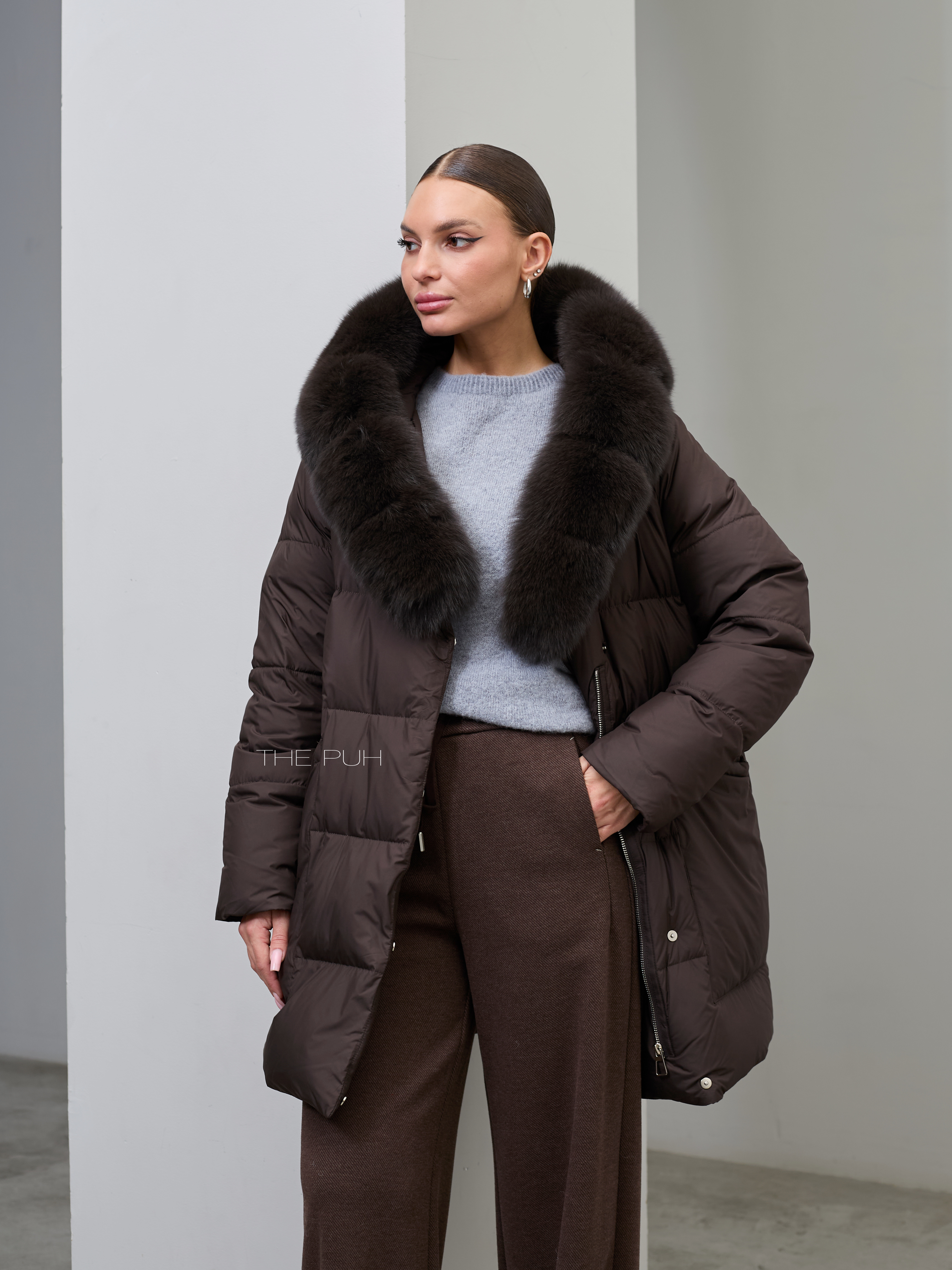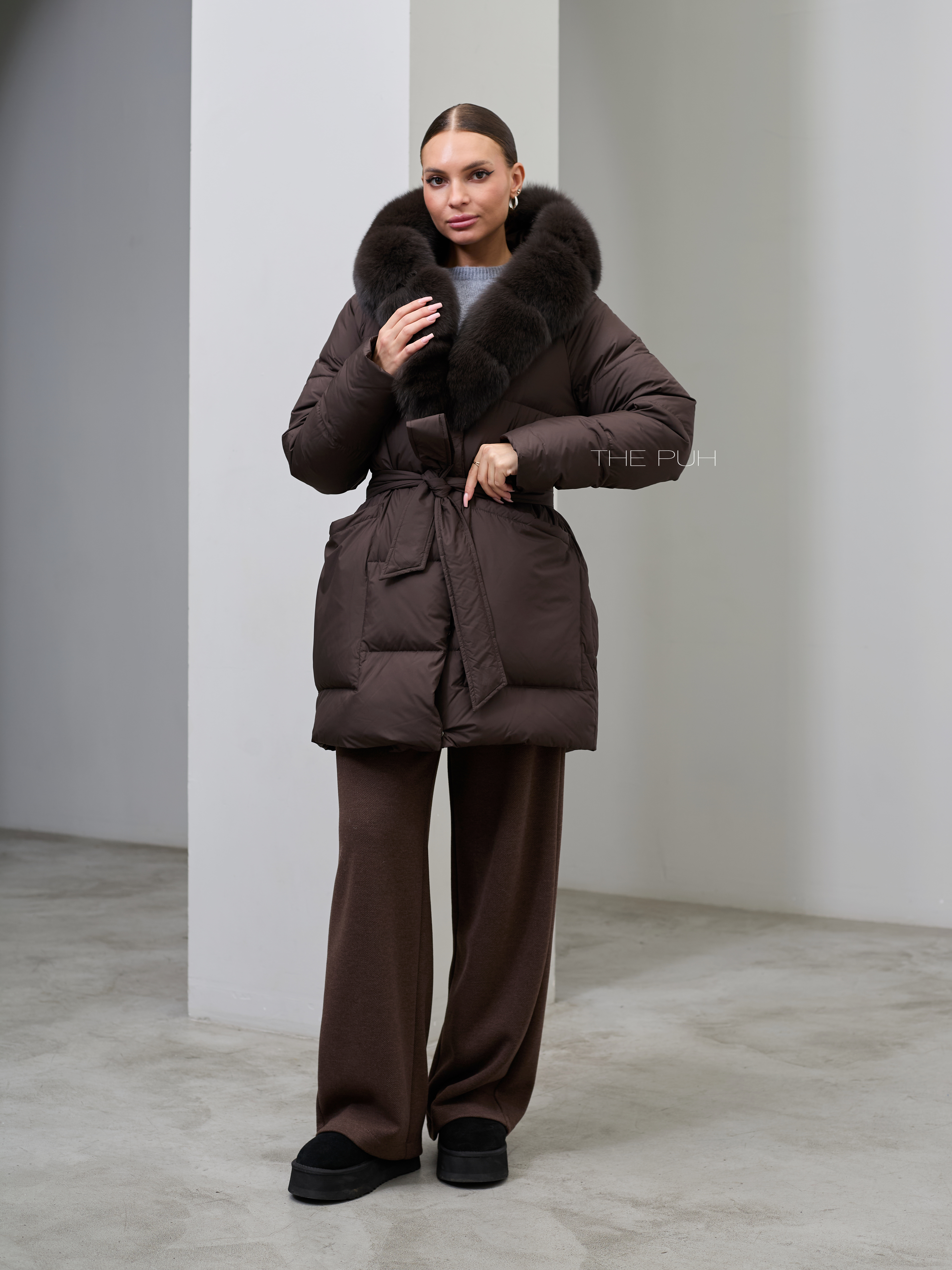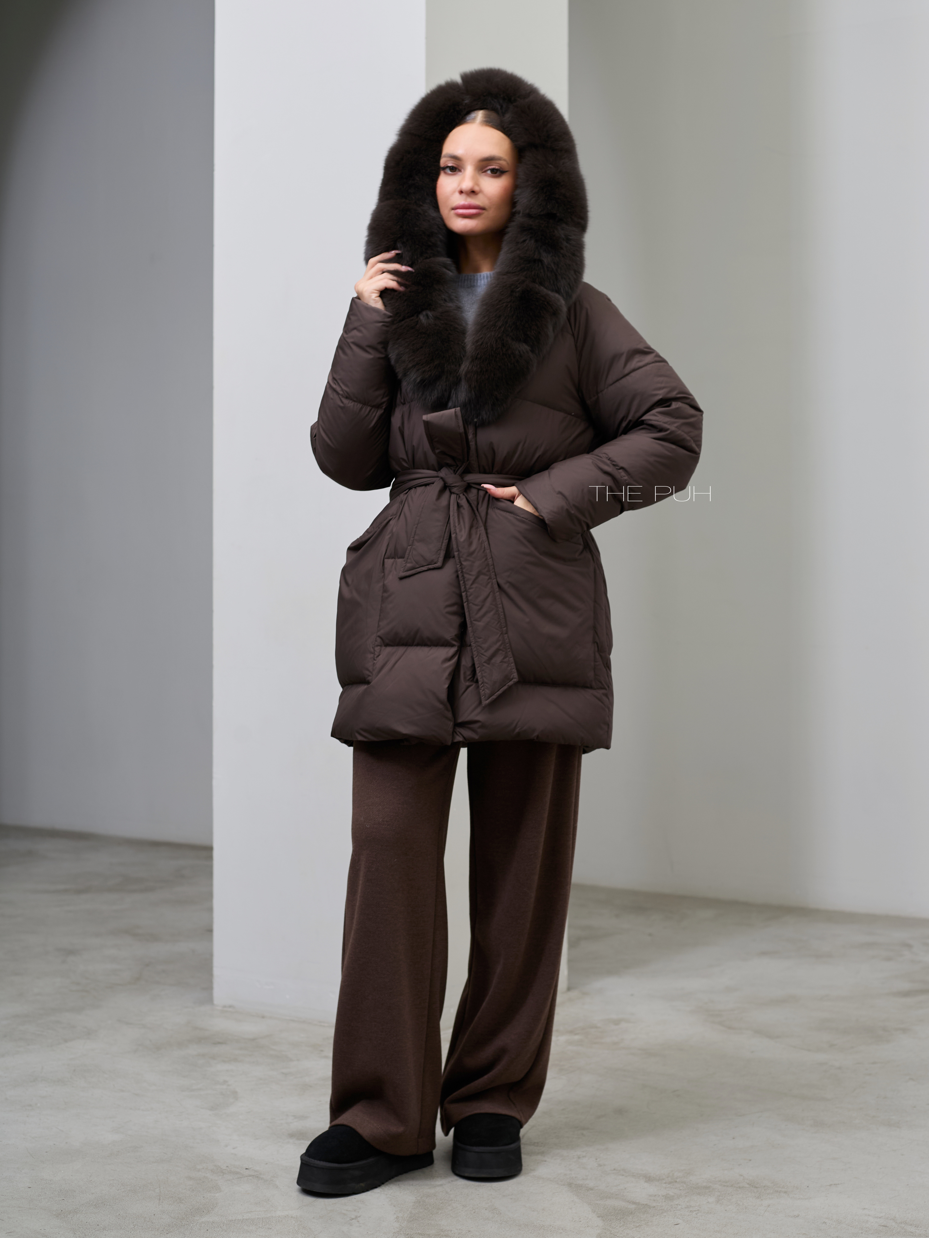 Удлиненный пуховик шоколадного цвета застегивается на молнию с пуговицами и дополнен поясом, благодаря которому вы можете изменять силуэт и контролировать прилегание пуховика. Модель утеплена натуральным гусиным пухом и способна выдерживать самые крепкие морозы. Объемный теплый капюшон оторочен мехом в тон.