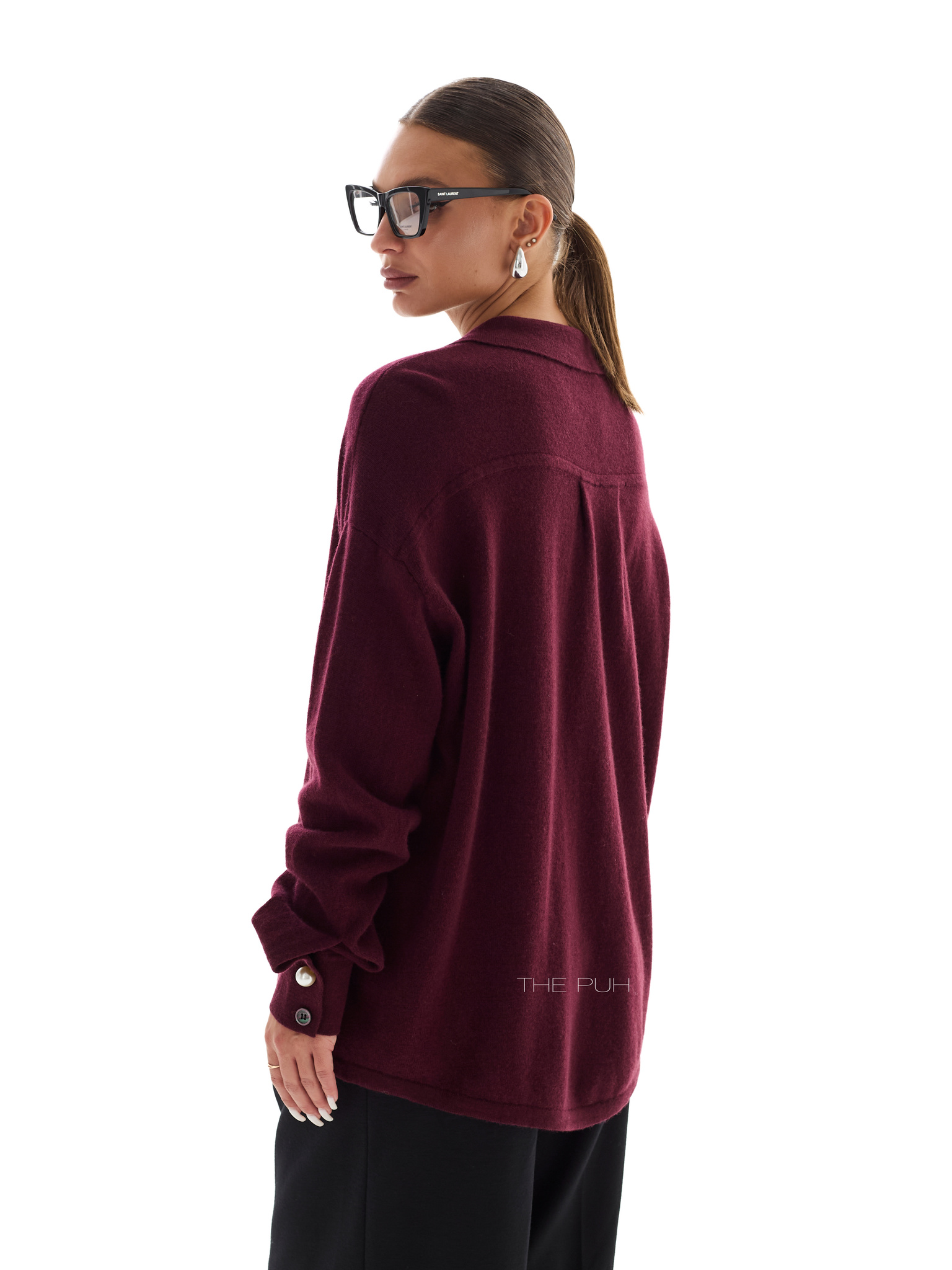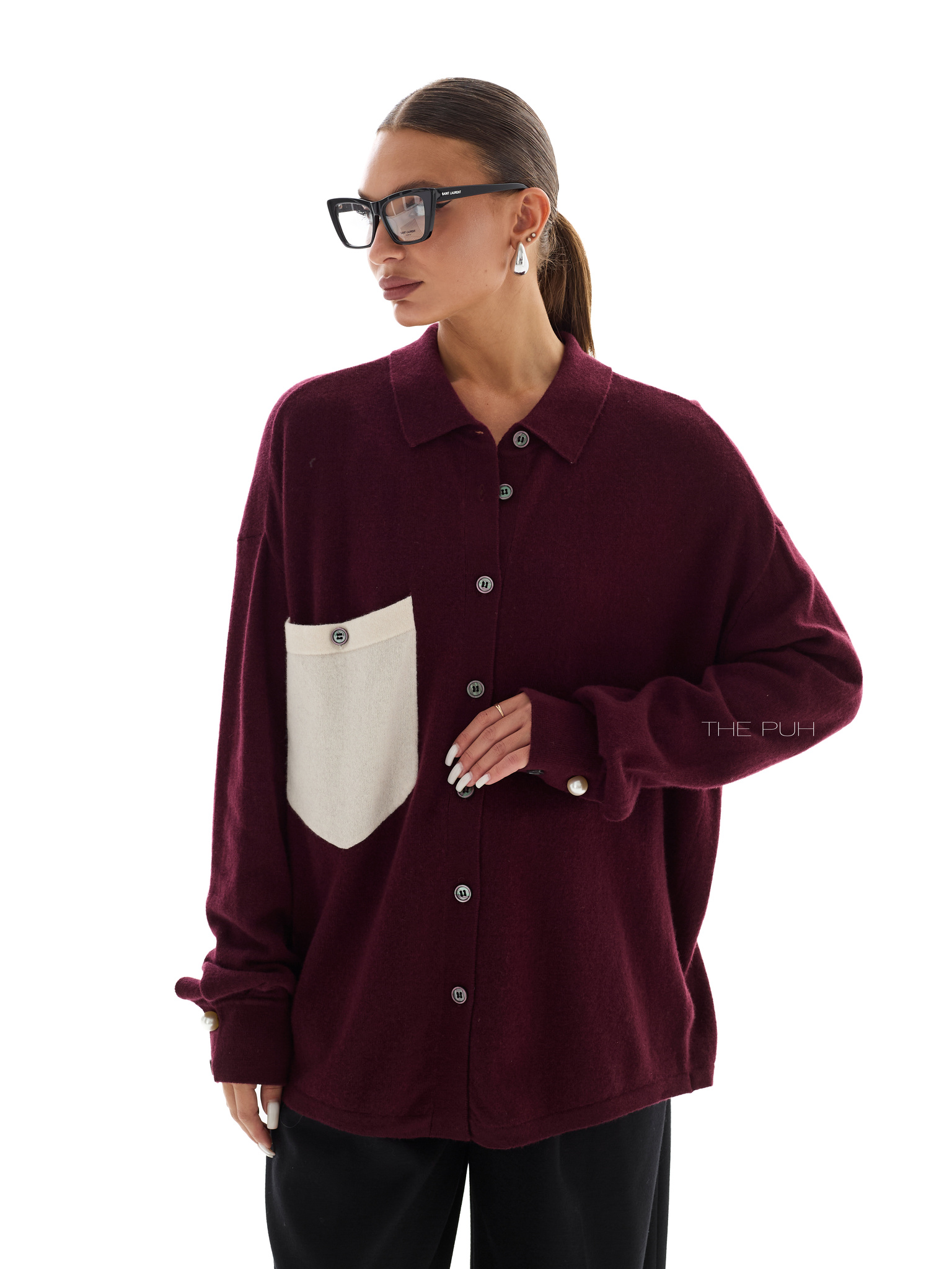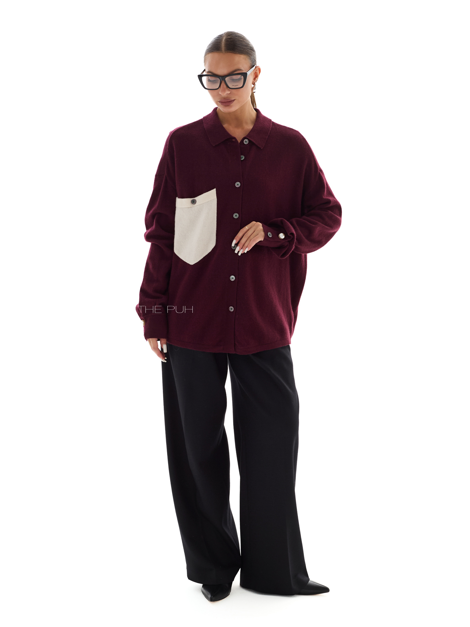 Кашемировая рубашка прямого свободного кроя бордового цвета с контрастным нагрудным карманом.