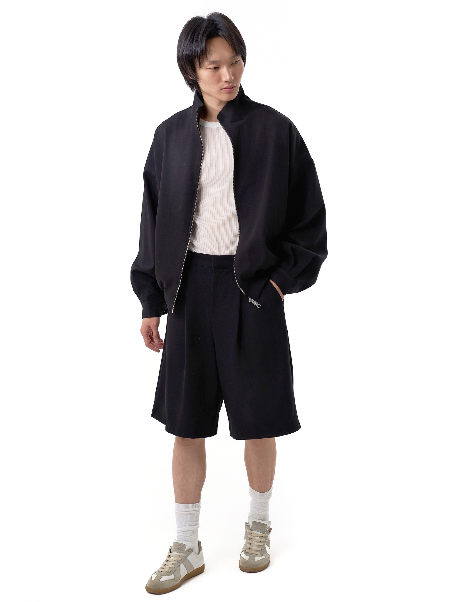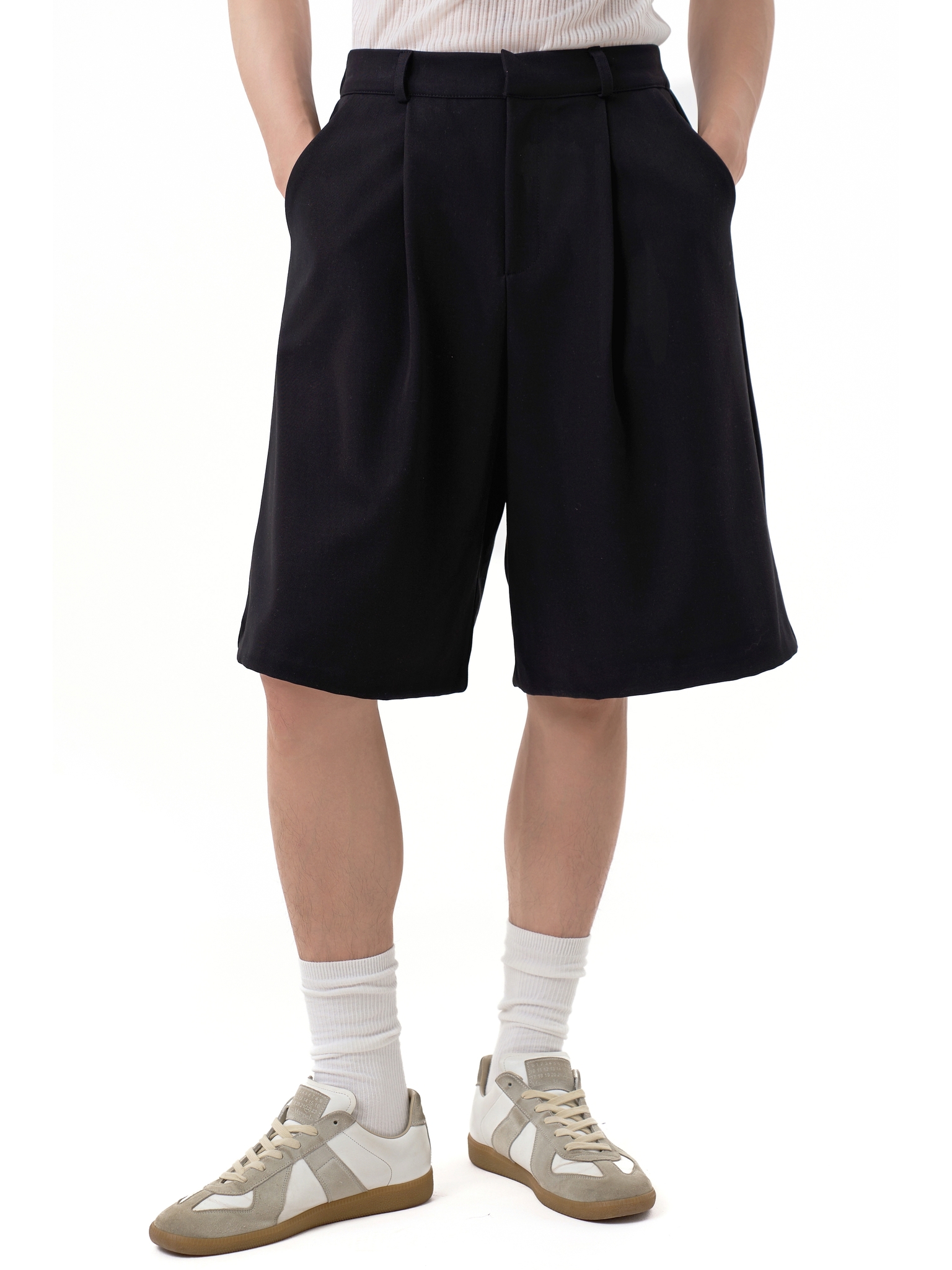 Черные широкие бермуды с поясом на резинке. Модель чуть ниже колена выполнена в классическом крое и дополнена поясными защипами, благодаря чему будет отлично сочетаться как с летними футболками, так и с более формальными верхами - рубашками и пиджаками.