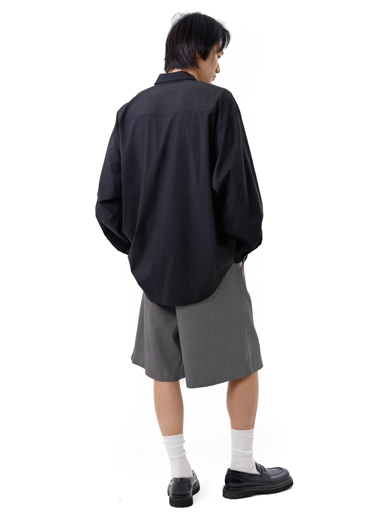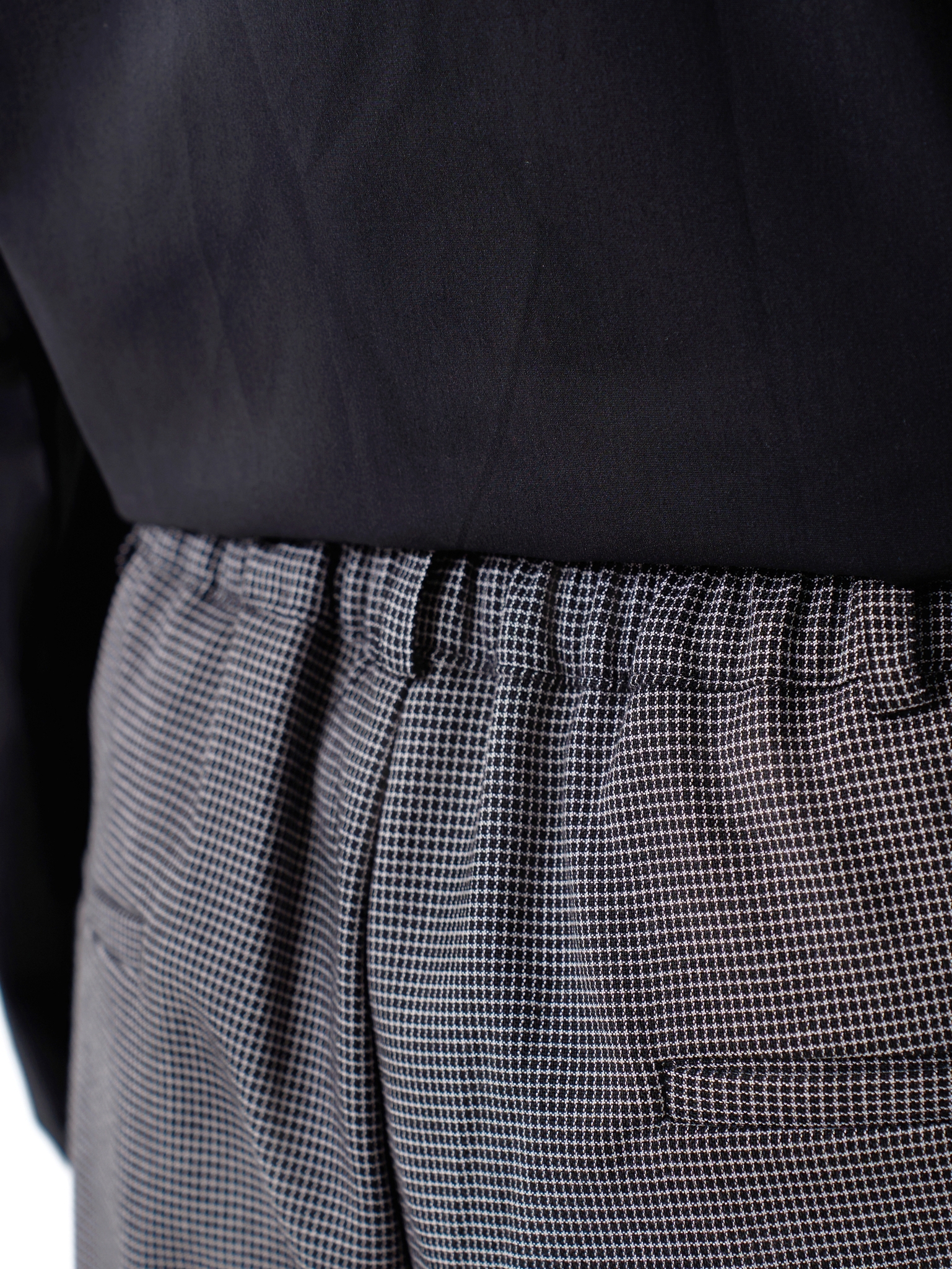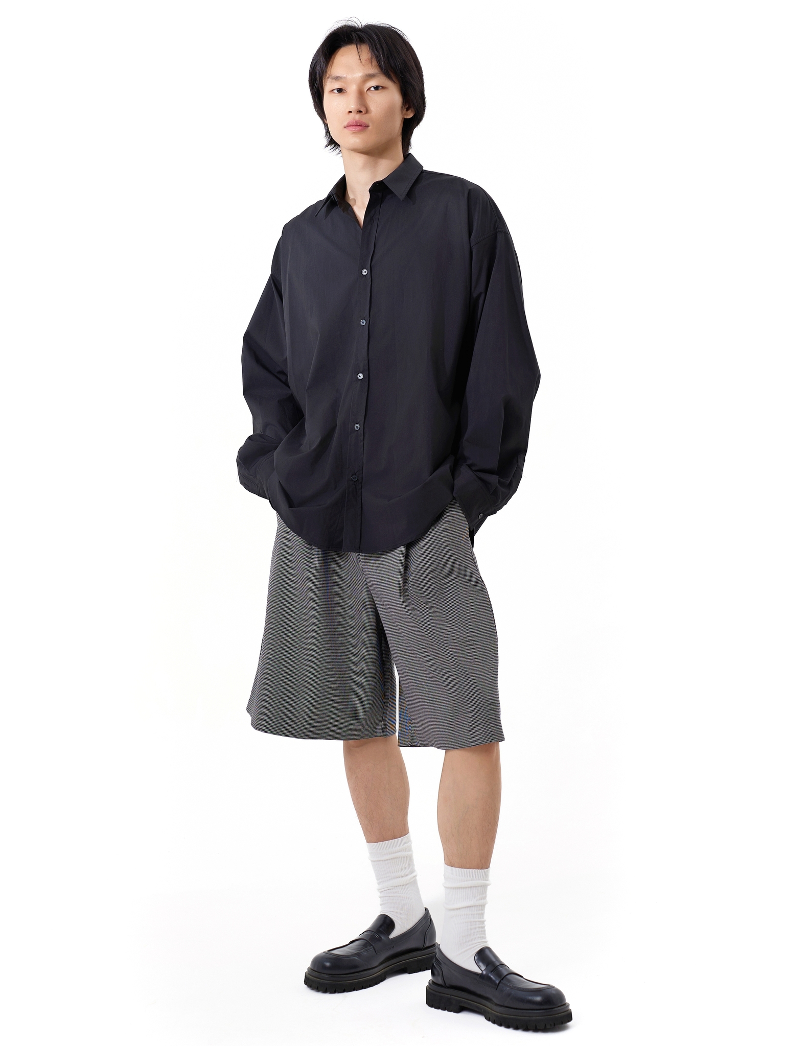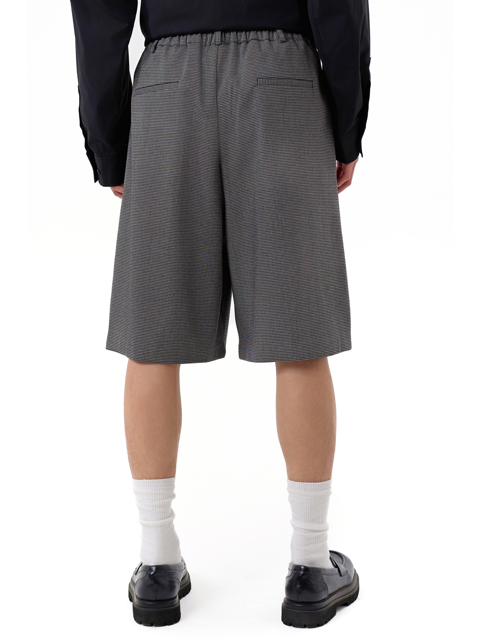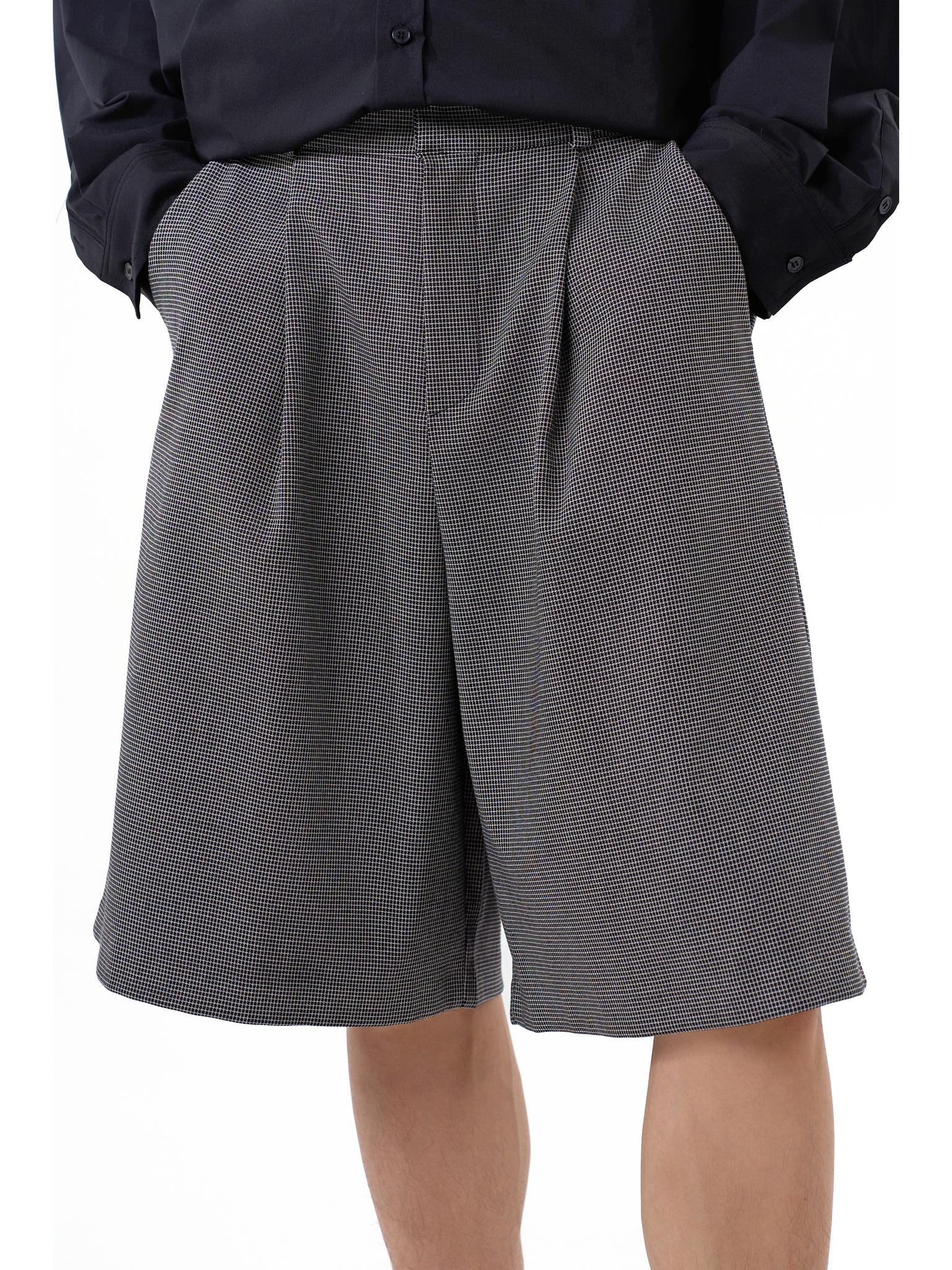Серые широкие бермуды в мелкую клетку. Модель чуть ниже колена выполнена в классическом крое и дополнена поясными защипами, благодаря чему будет отлично сочетаться как с летними футболками, так и с более формальными верхами - рубашками и пиджаками.