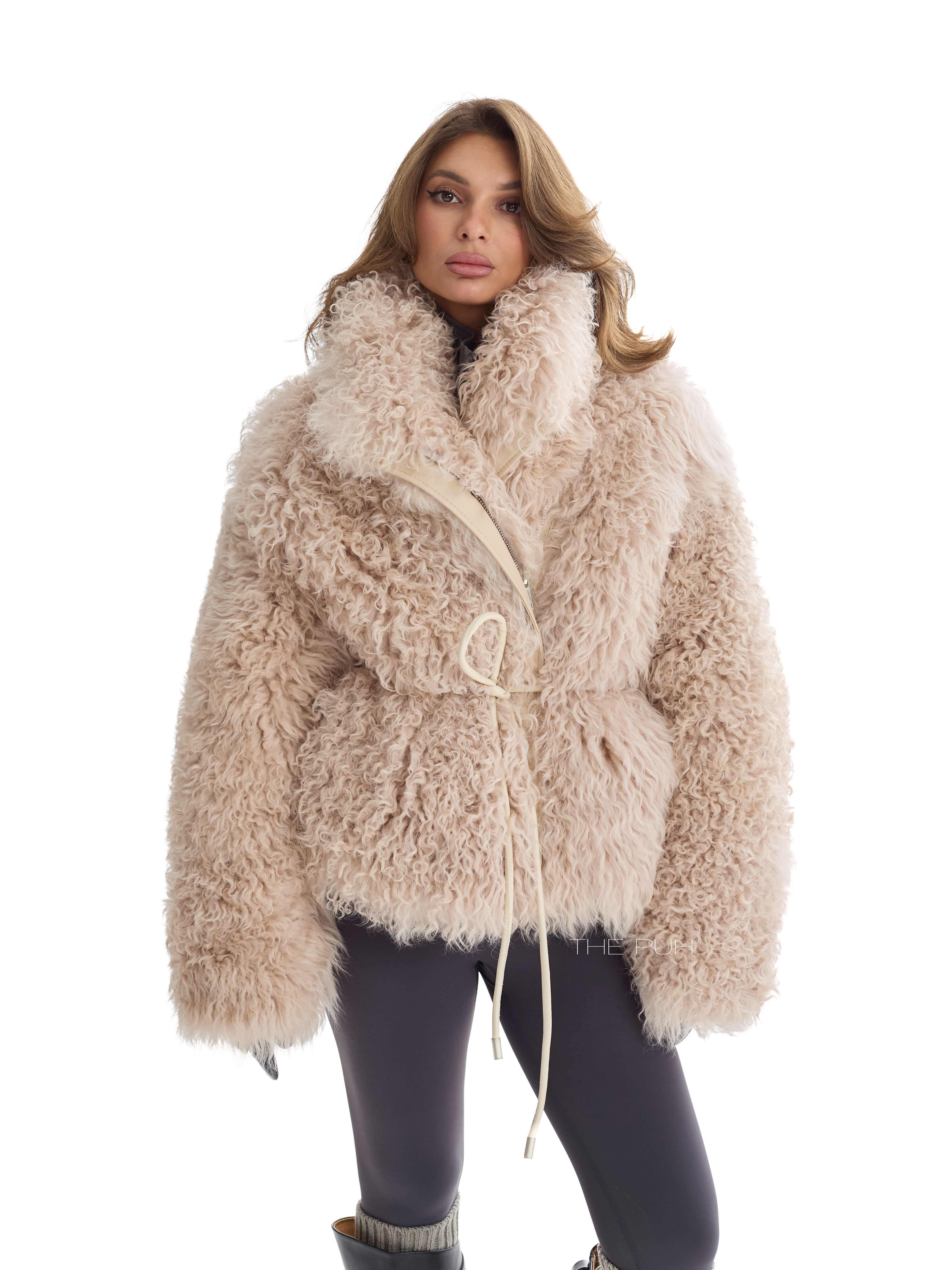 Бежевая короткая шуба выполнена из натуральной овчины породы Калган. Модель объемного кроя застегивается на косую молнию и дополнена воротником-стойкой, который защитит от ветра и непогоды.
