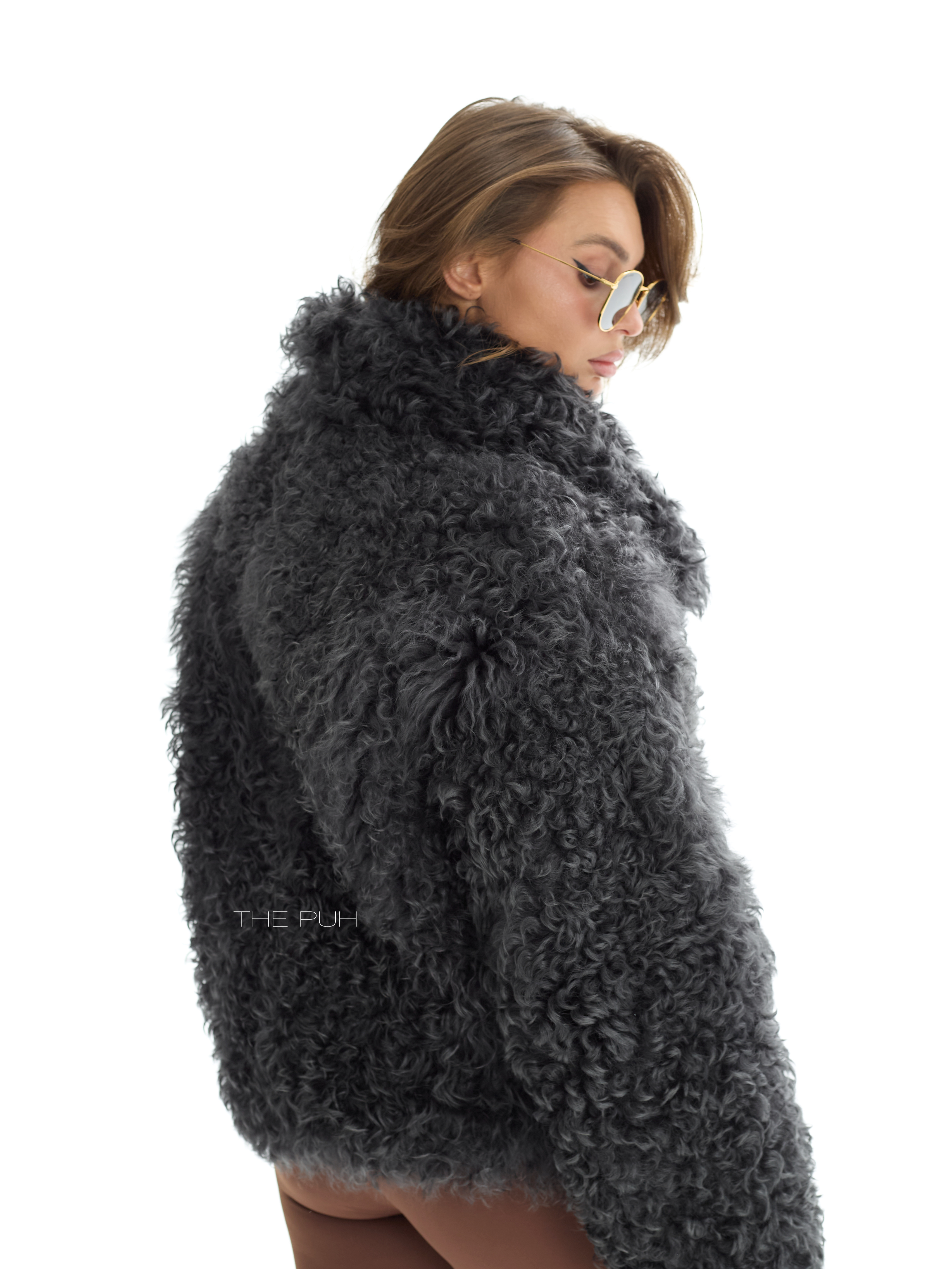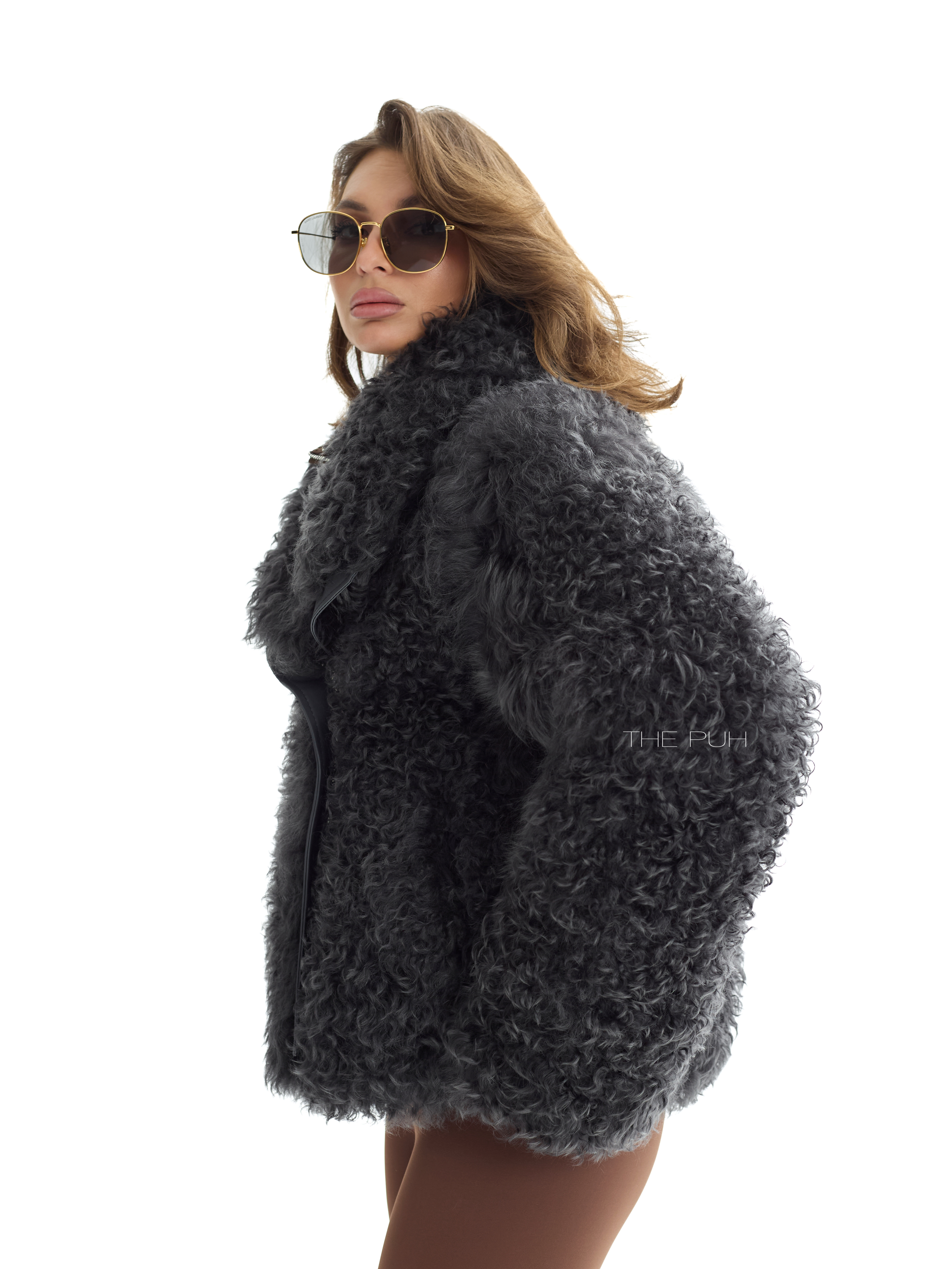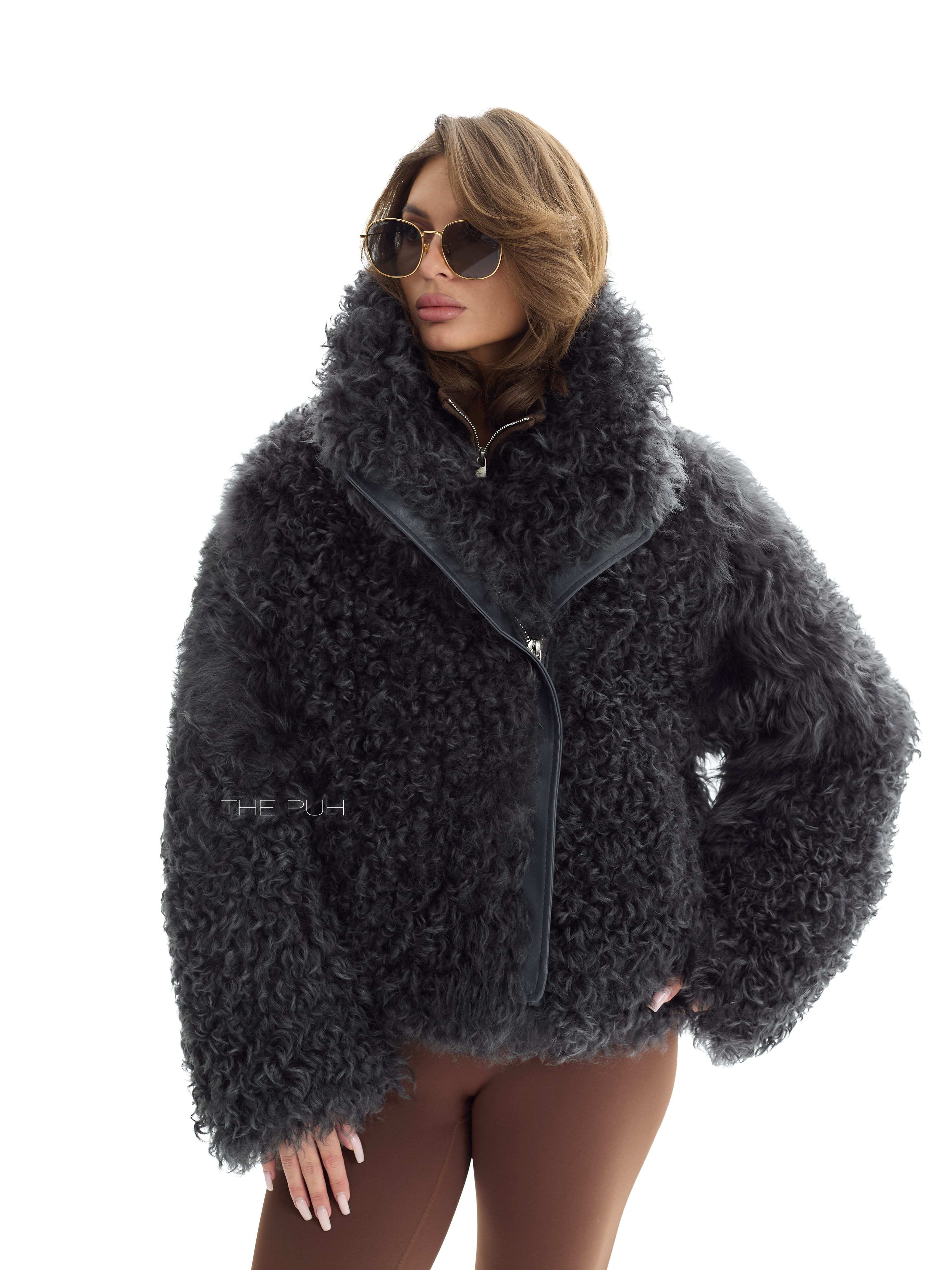 Графитовая короткая шуба выполнена из натуральной овчины породы Калган. Модель объемного кроя застегивается на косую молнию и дополнена воротником-стойкой, который защитит от ветра и непогоды.