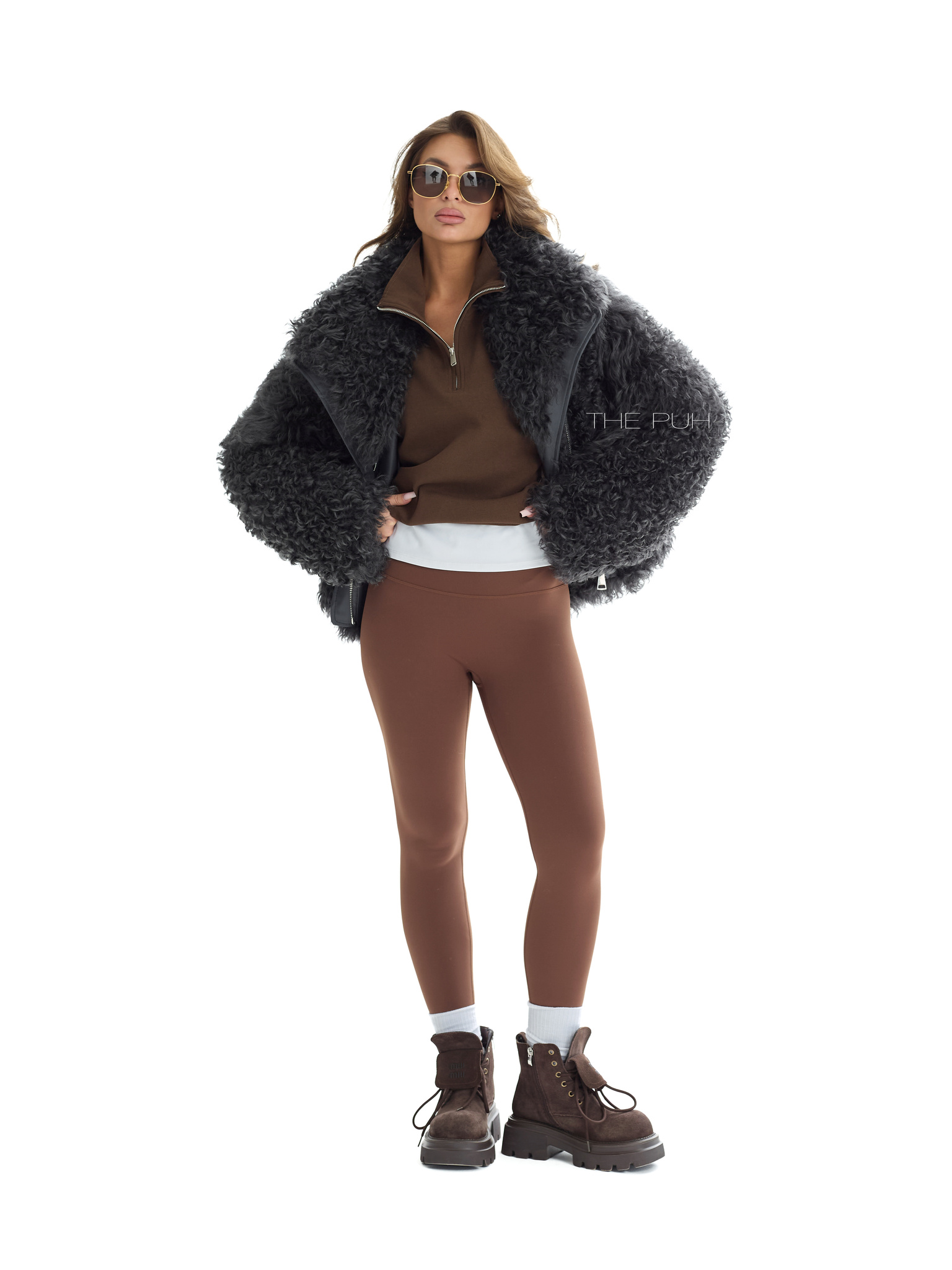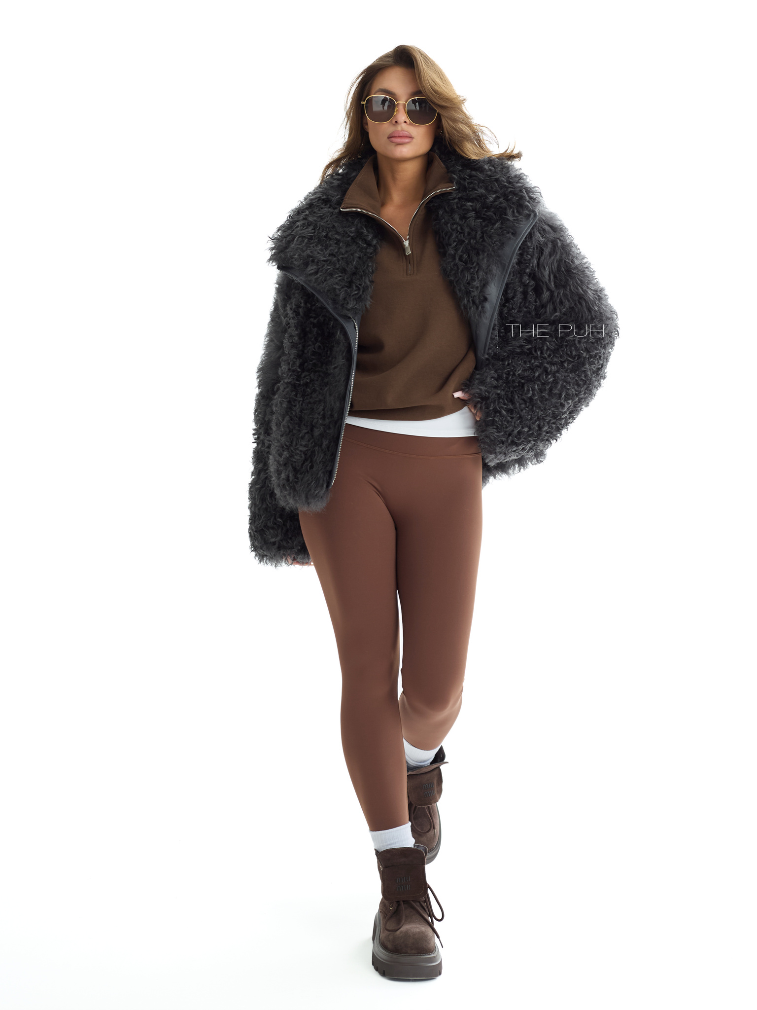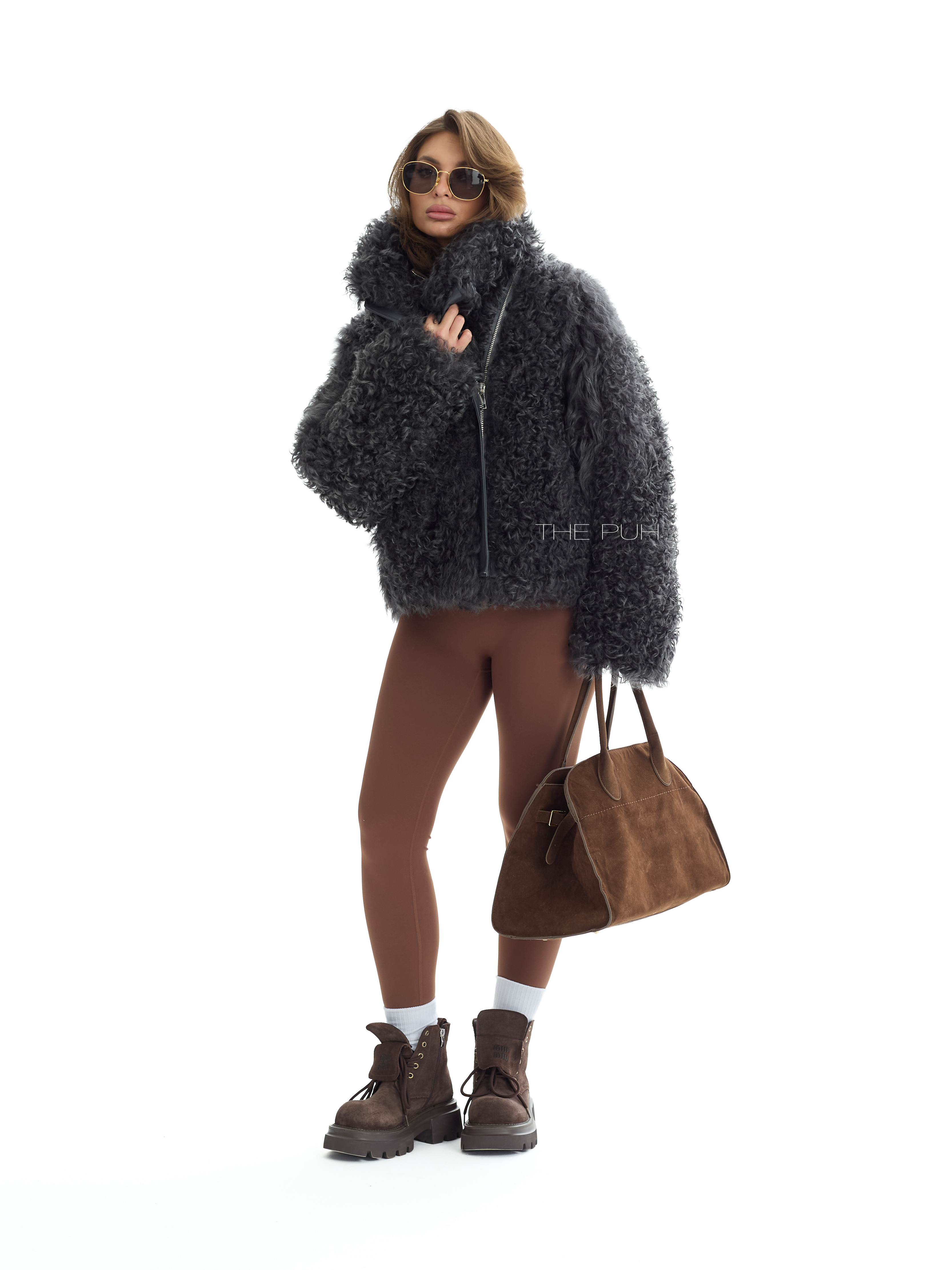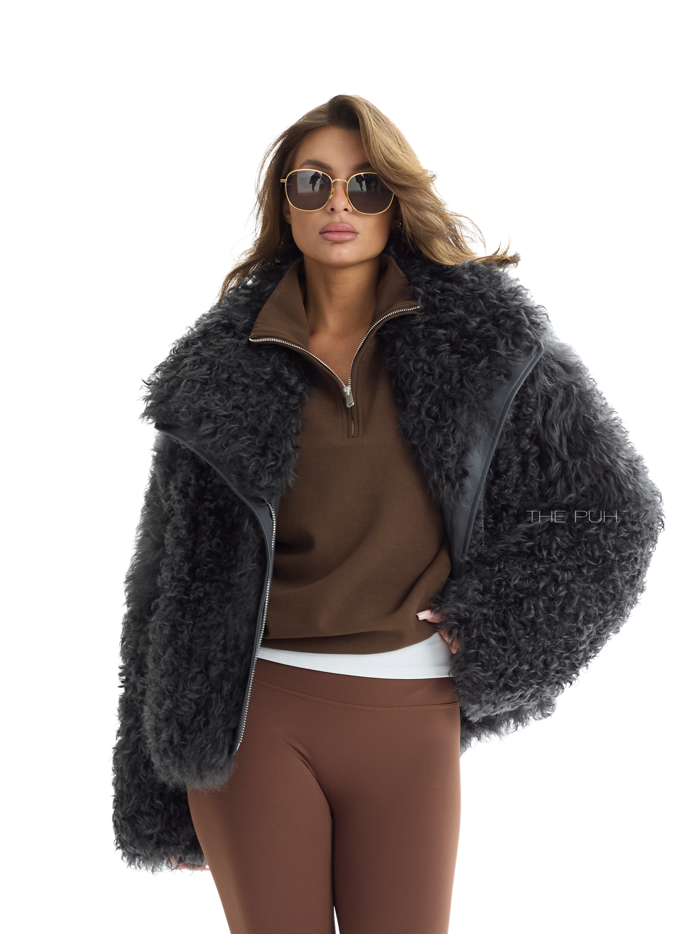 Графитовая короткая шуба выполнена из натуральной овчины породы Калган. Модель объемного кроя застегивается на косую молнию и дополнена воротником-стойкой, который защитит от ветра и непогоды.