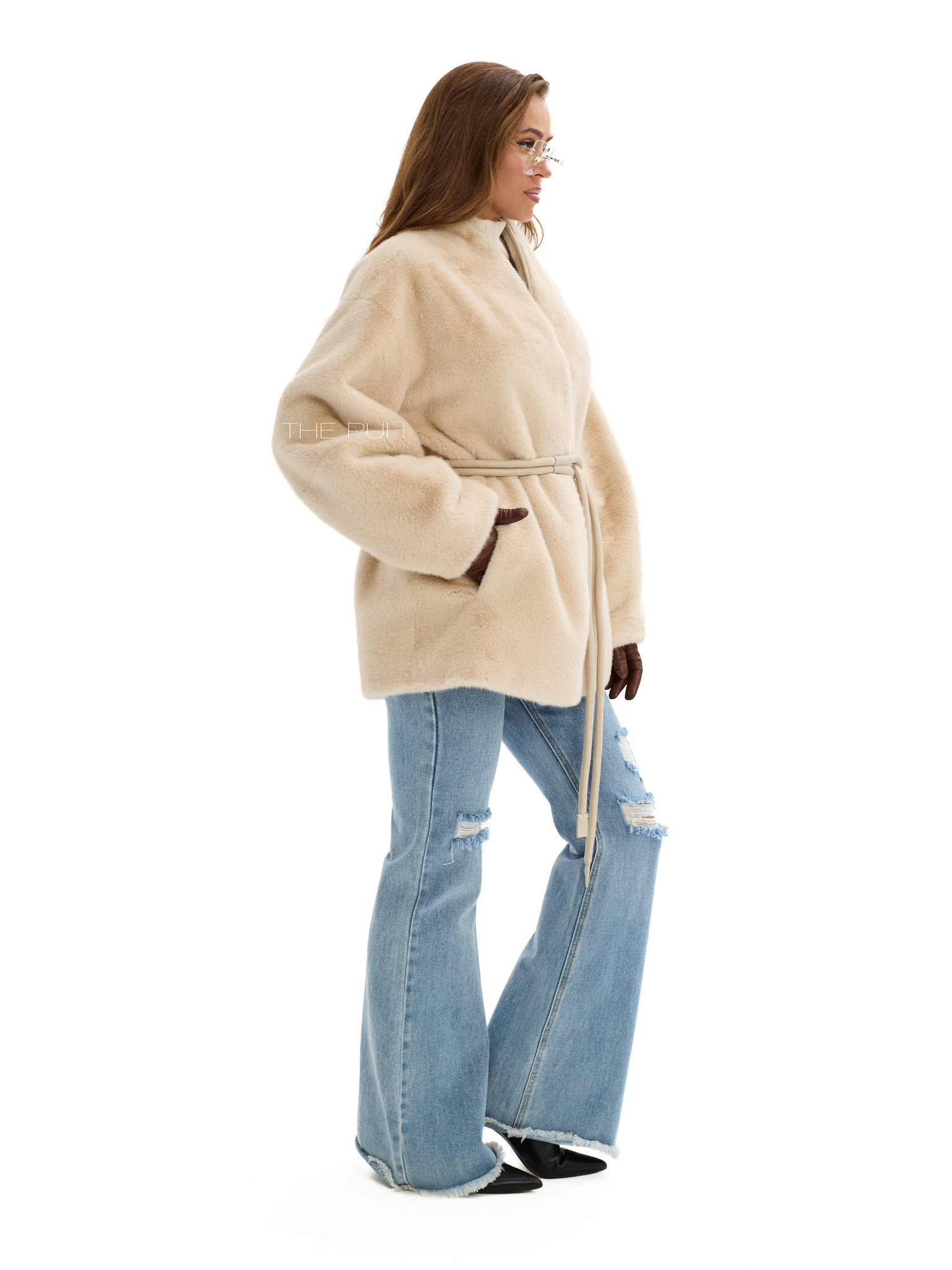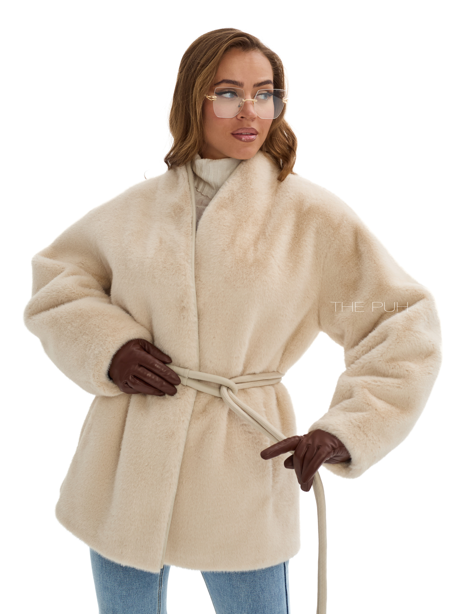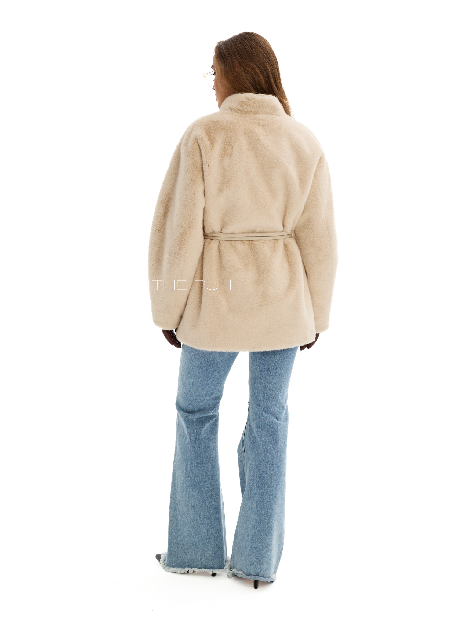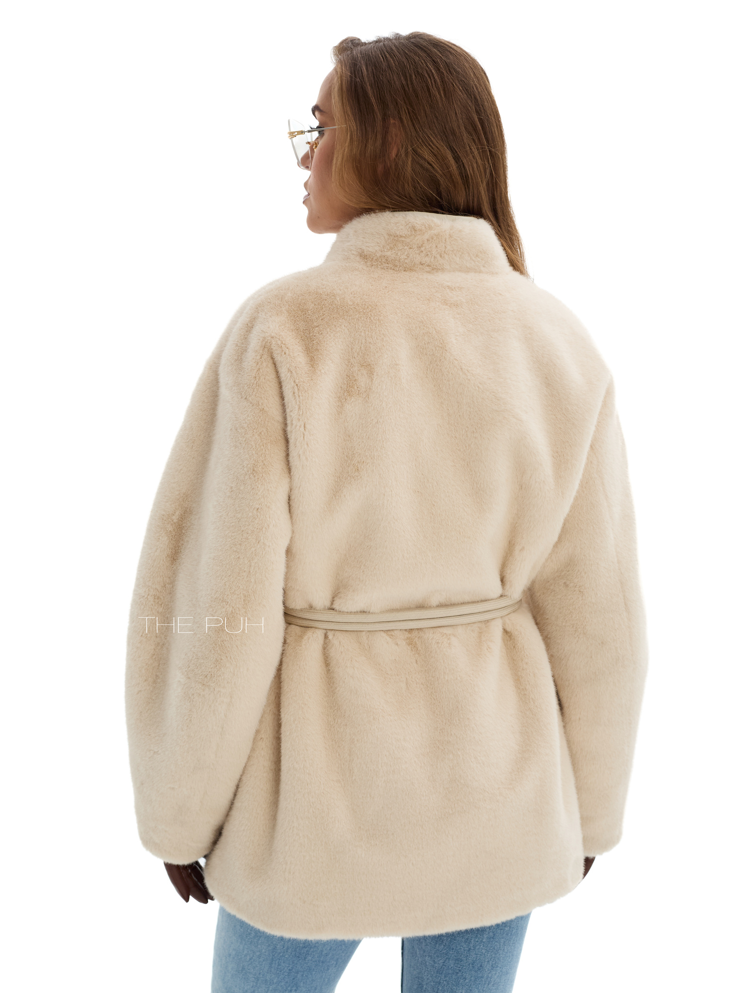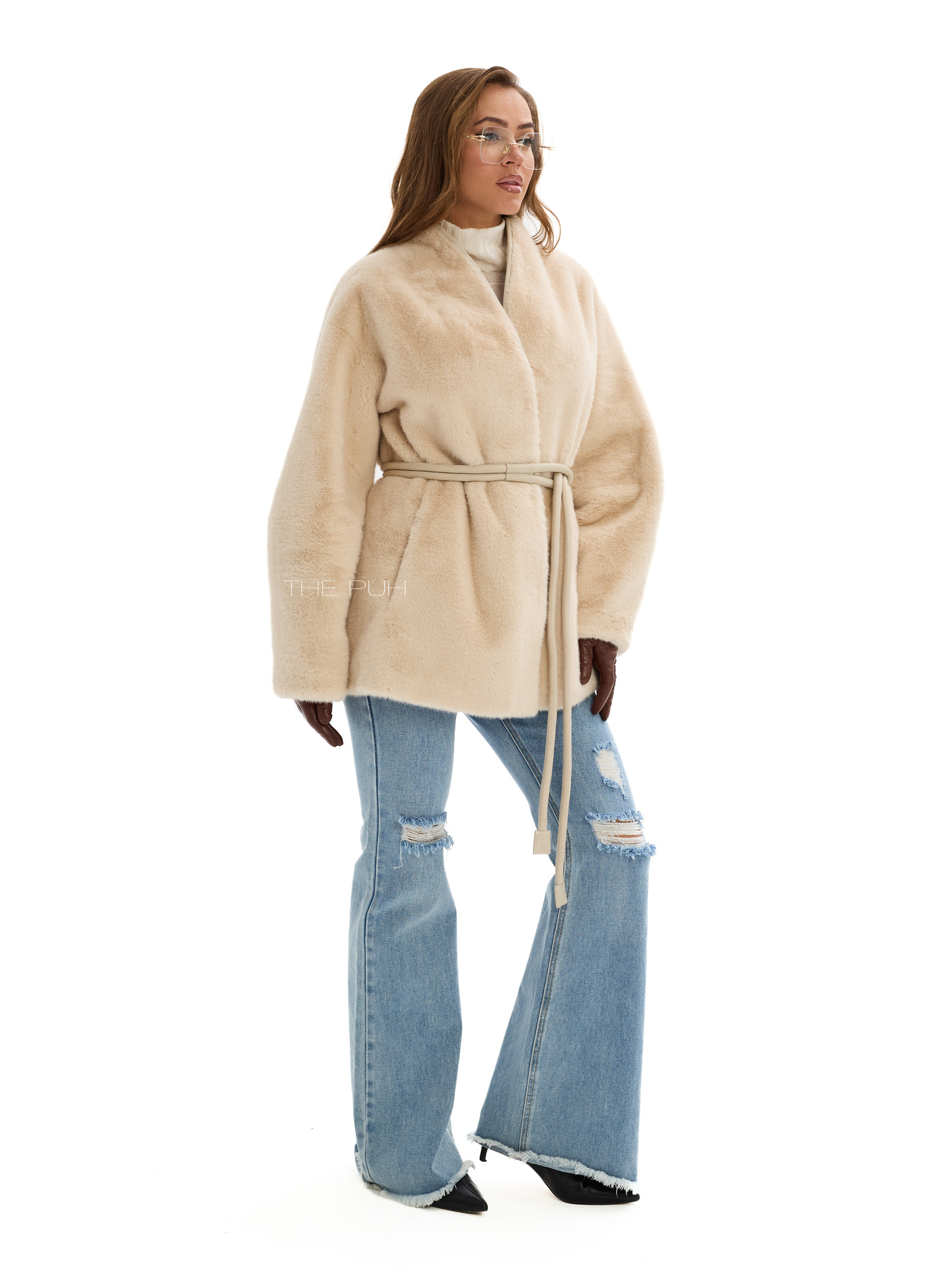 Элегантная шуба бежевого цвета без воротника с регулируемым поясом в тон для создания как приталенного, так и свободного кроя. Модель сочетает в себе тепло и изысканный дизайн.