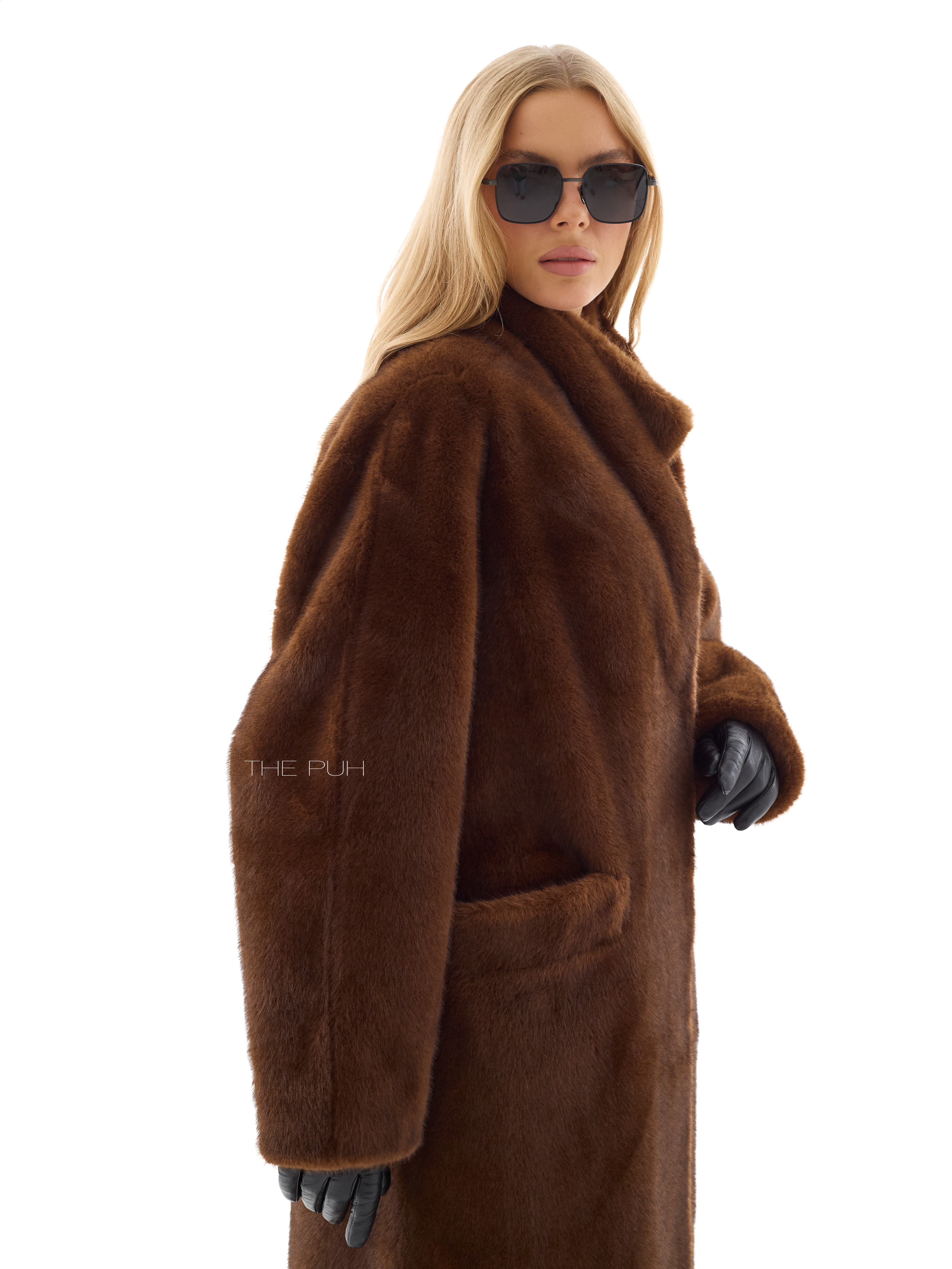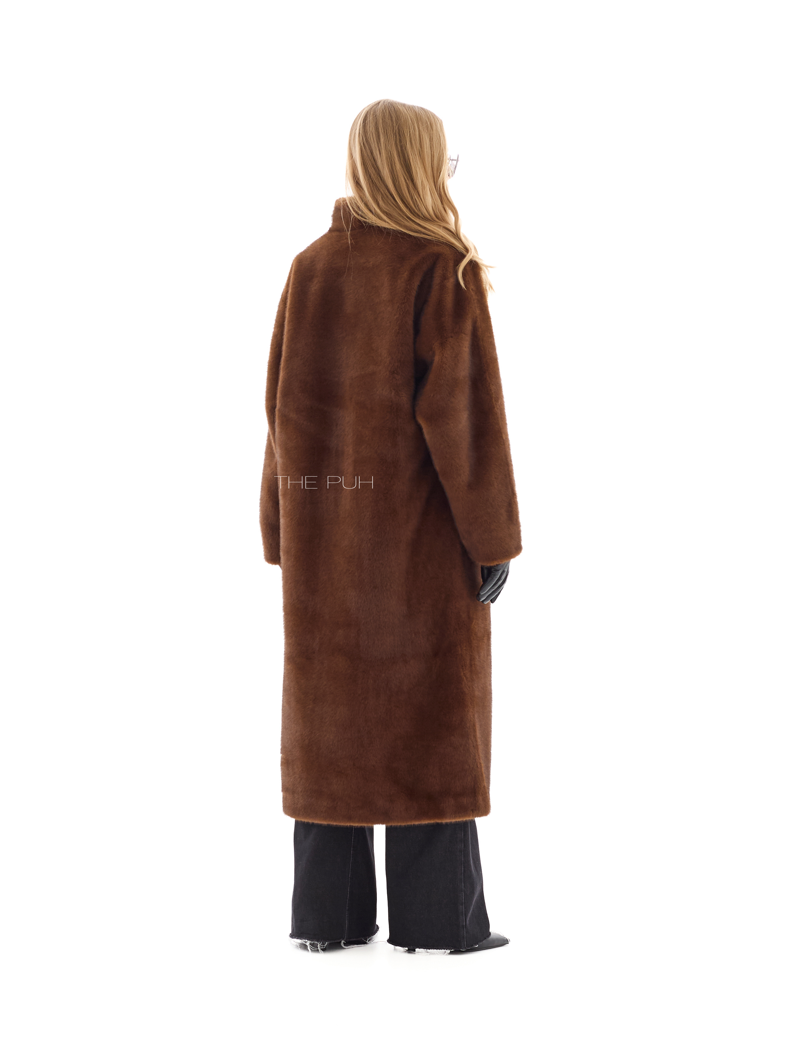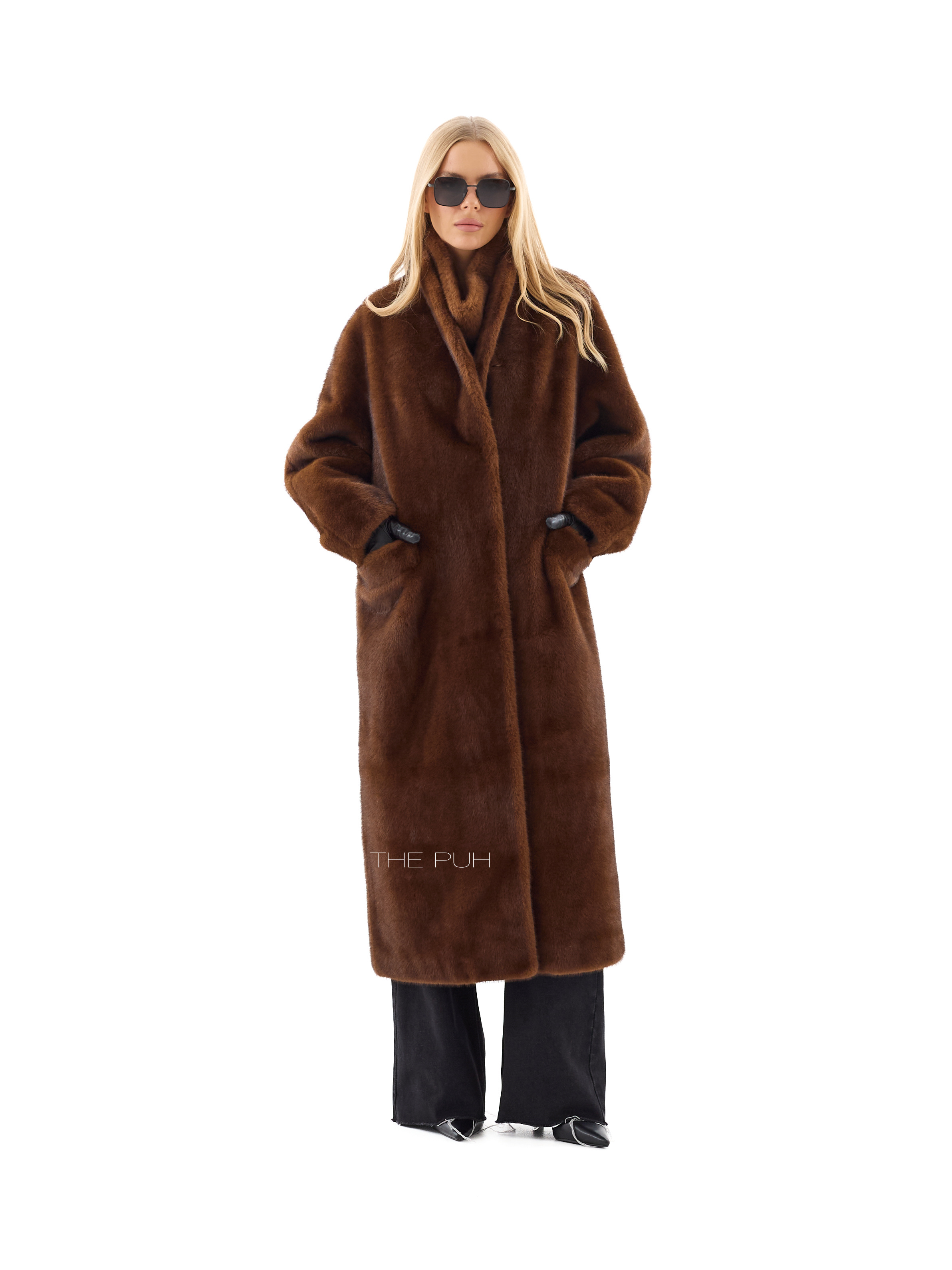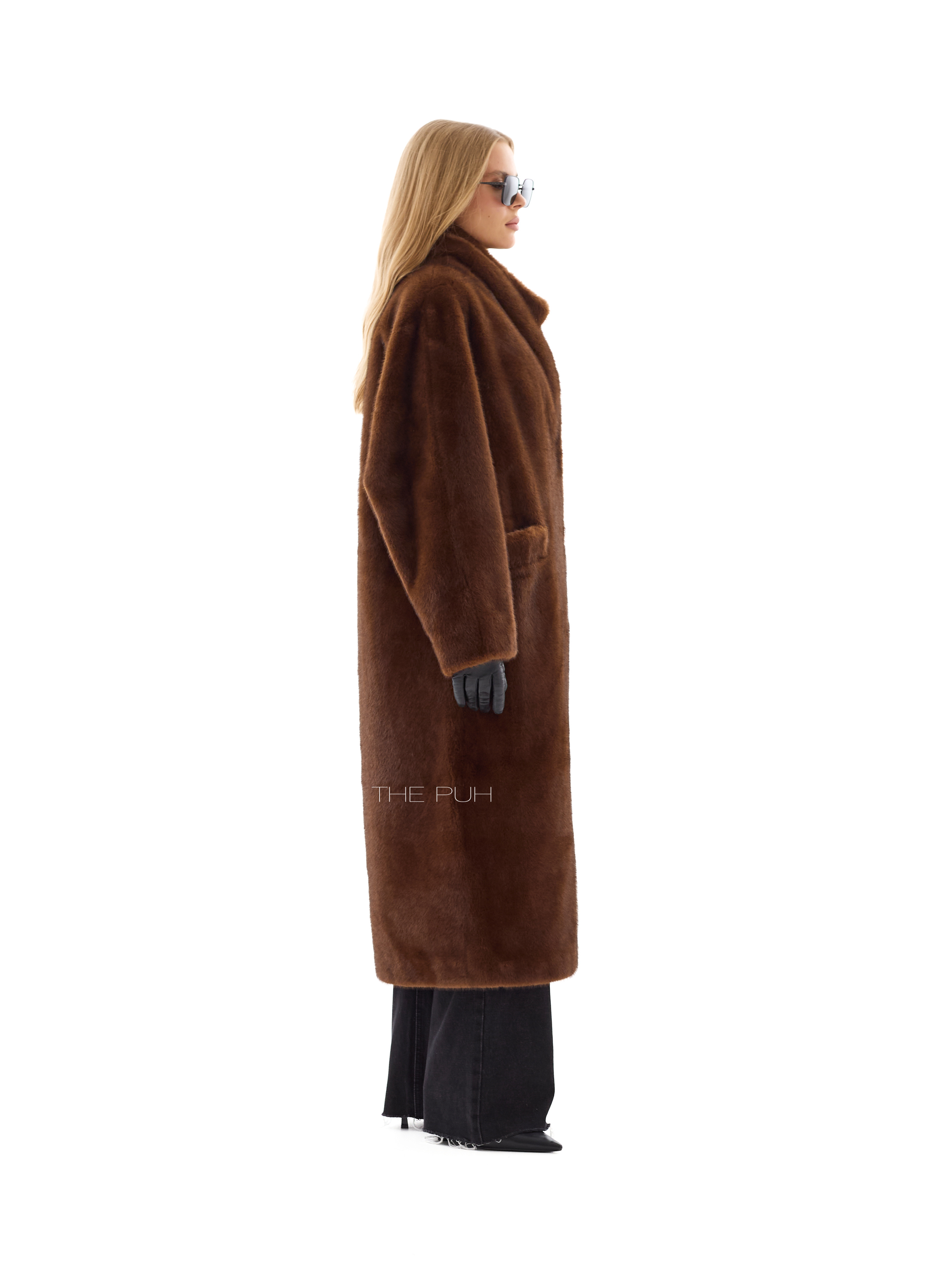 Длинная прямая шуба без воротника выполнена из мягчайшего премиального эко-меха коричневого цвета, который по своим свойствам максимально приближен к меху норки. Модель застегивается на крючки спереди и дополнена двумя боковыми карманами.