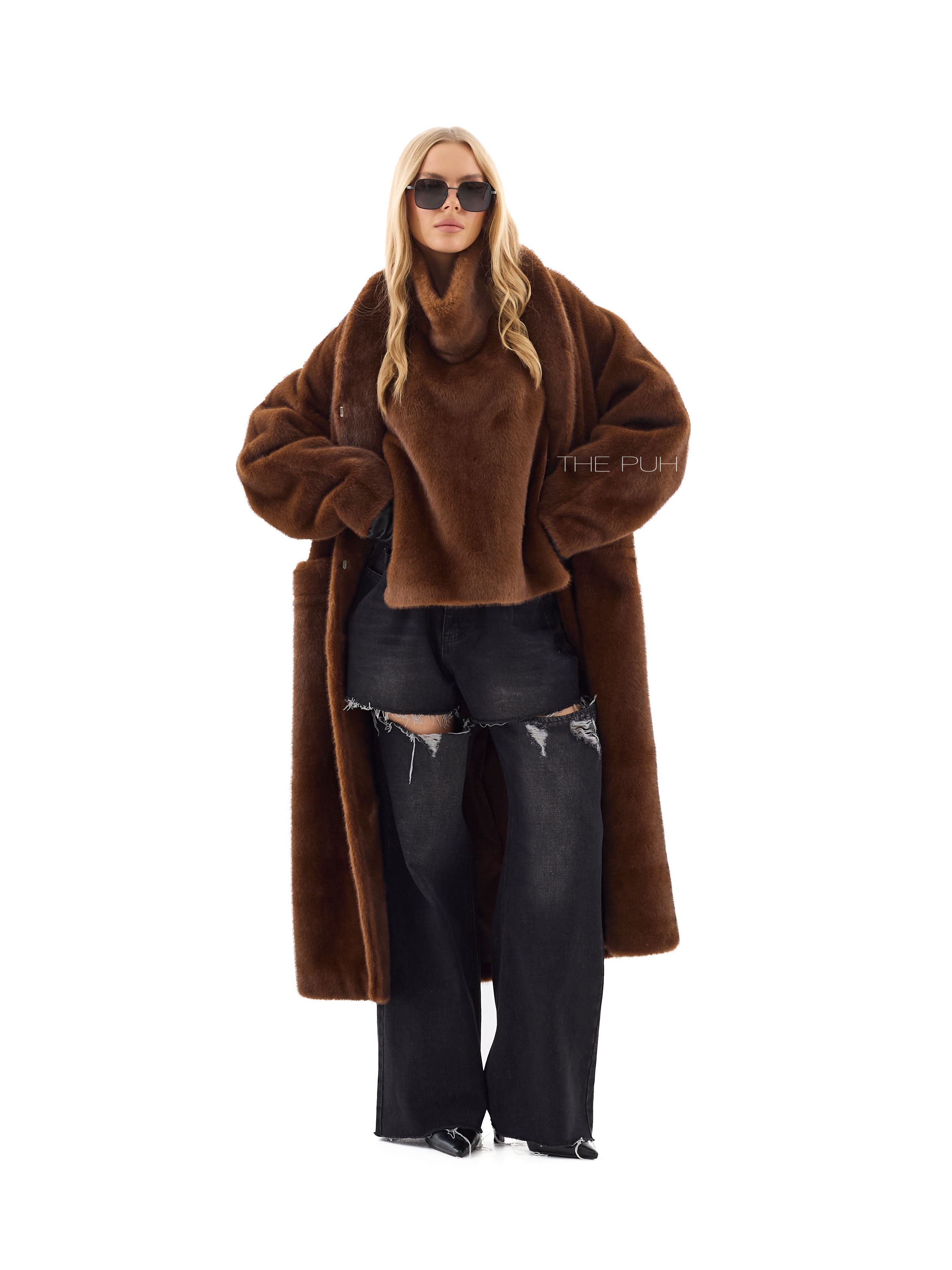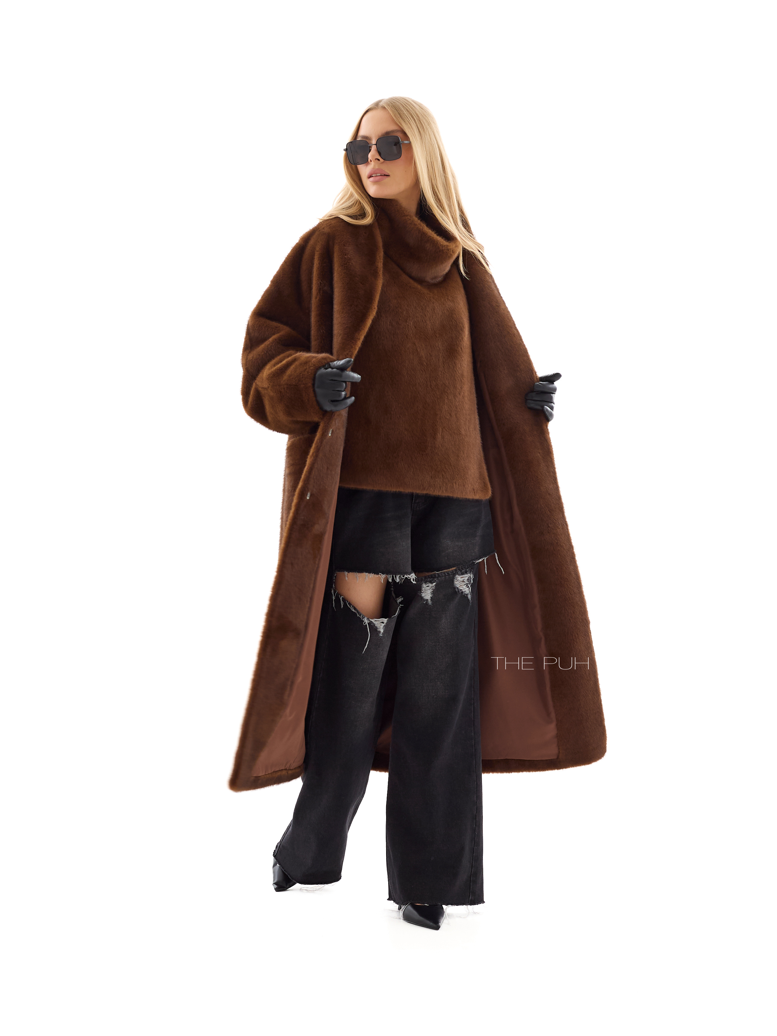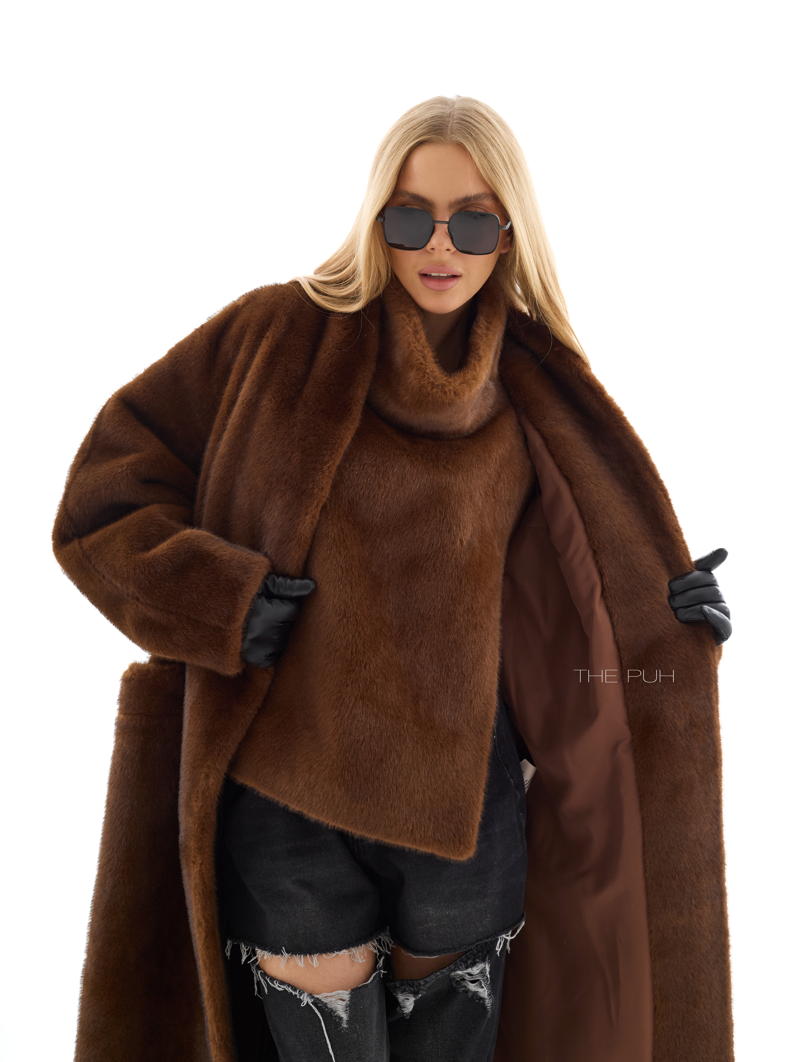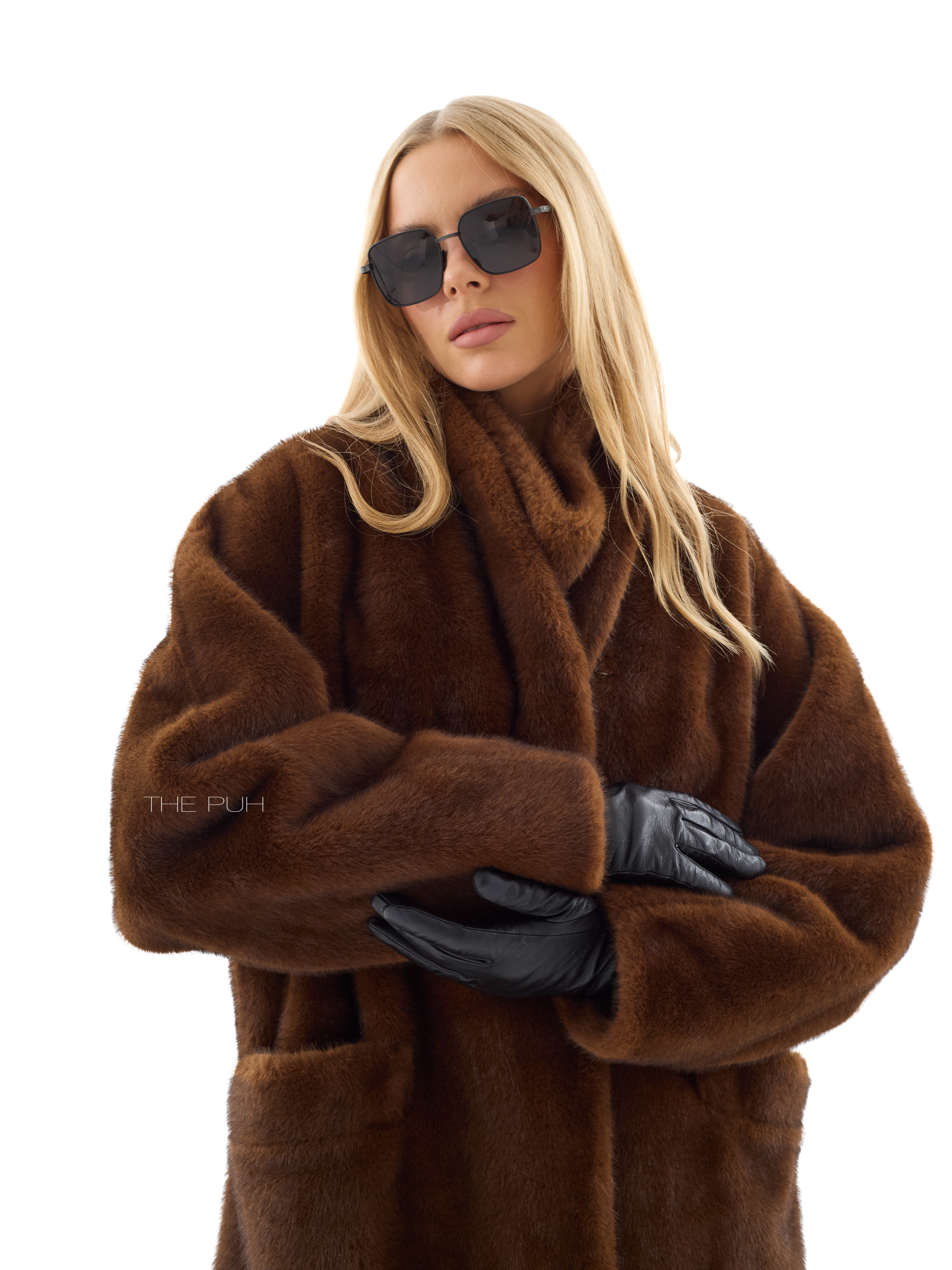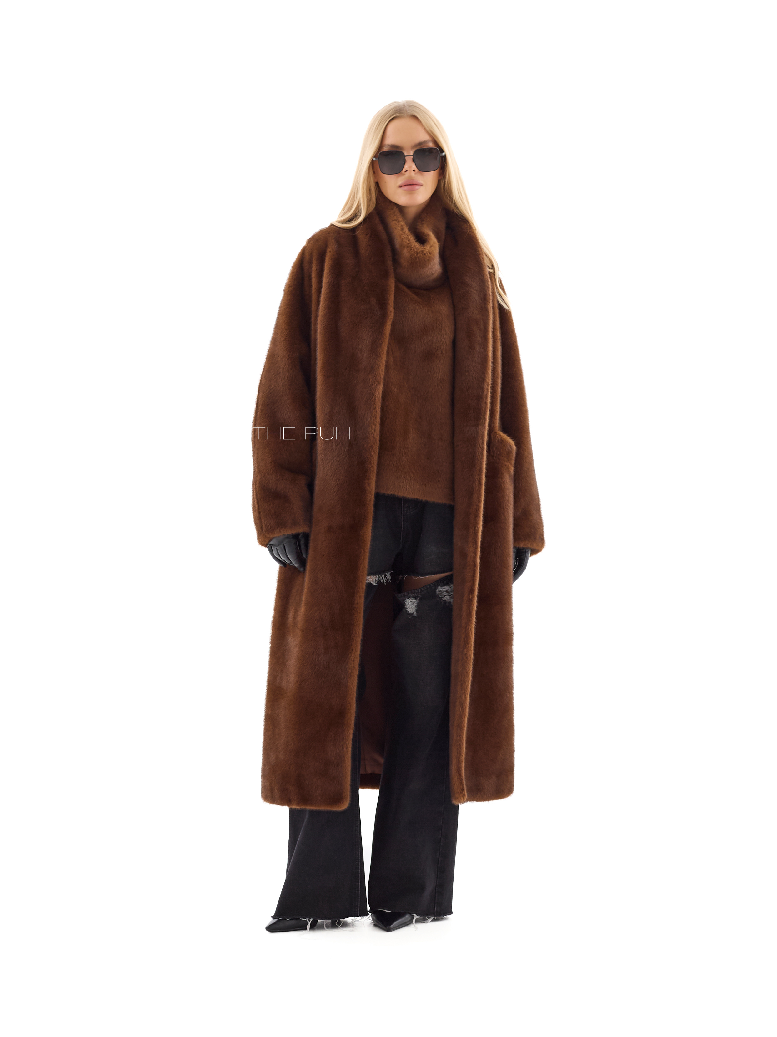 Длинная прямая шуба без воротника выполнена из мягчайшего премиального эко-меха коричневого цвета, который по своим свойствам максимально приближен к меху норки. Модель застегивается на крючки спереди и дополнена двумя боковыми карманами.