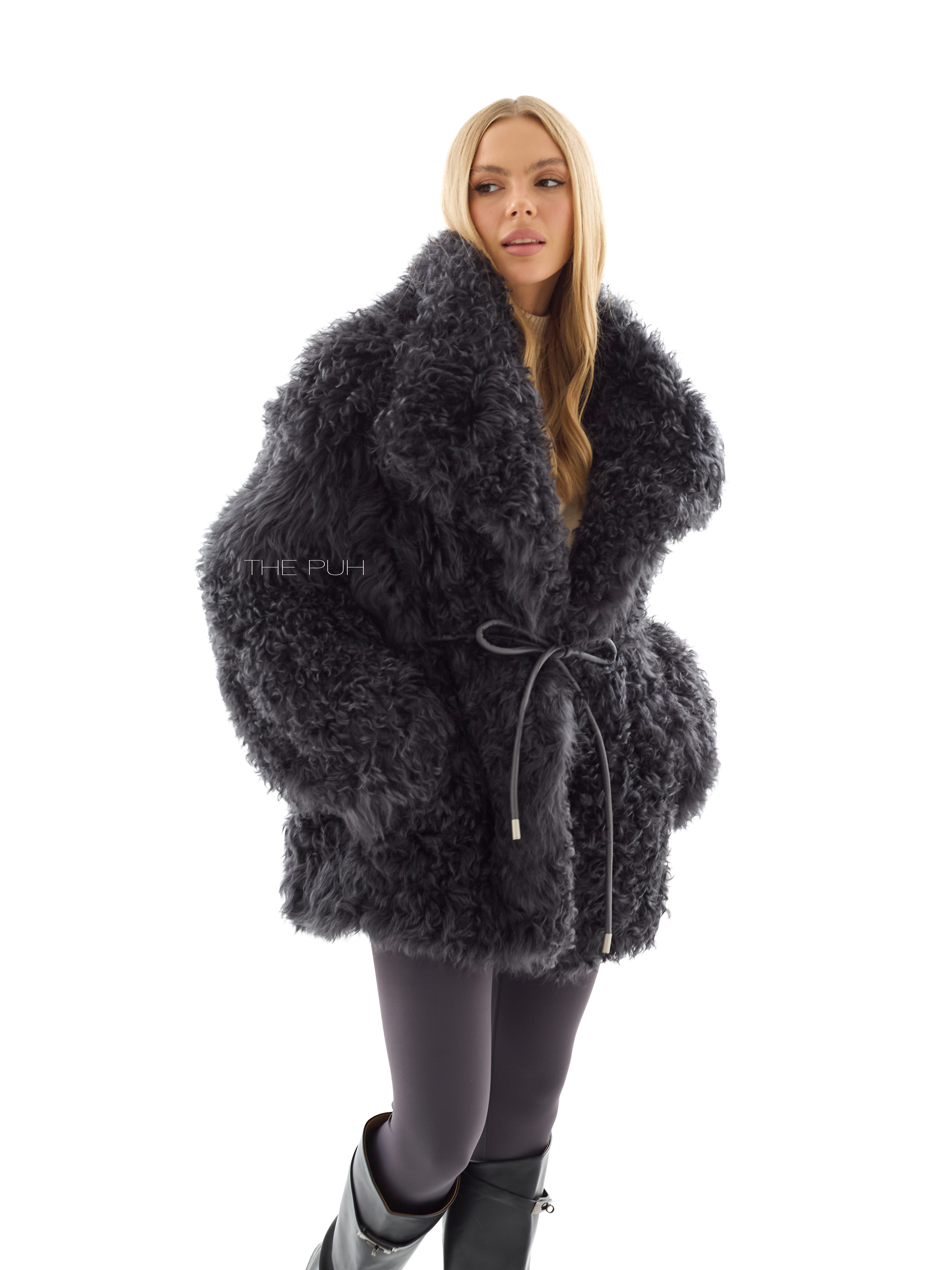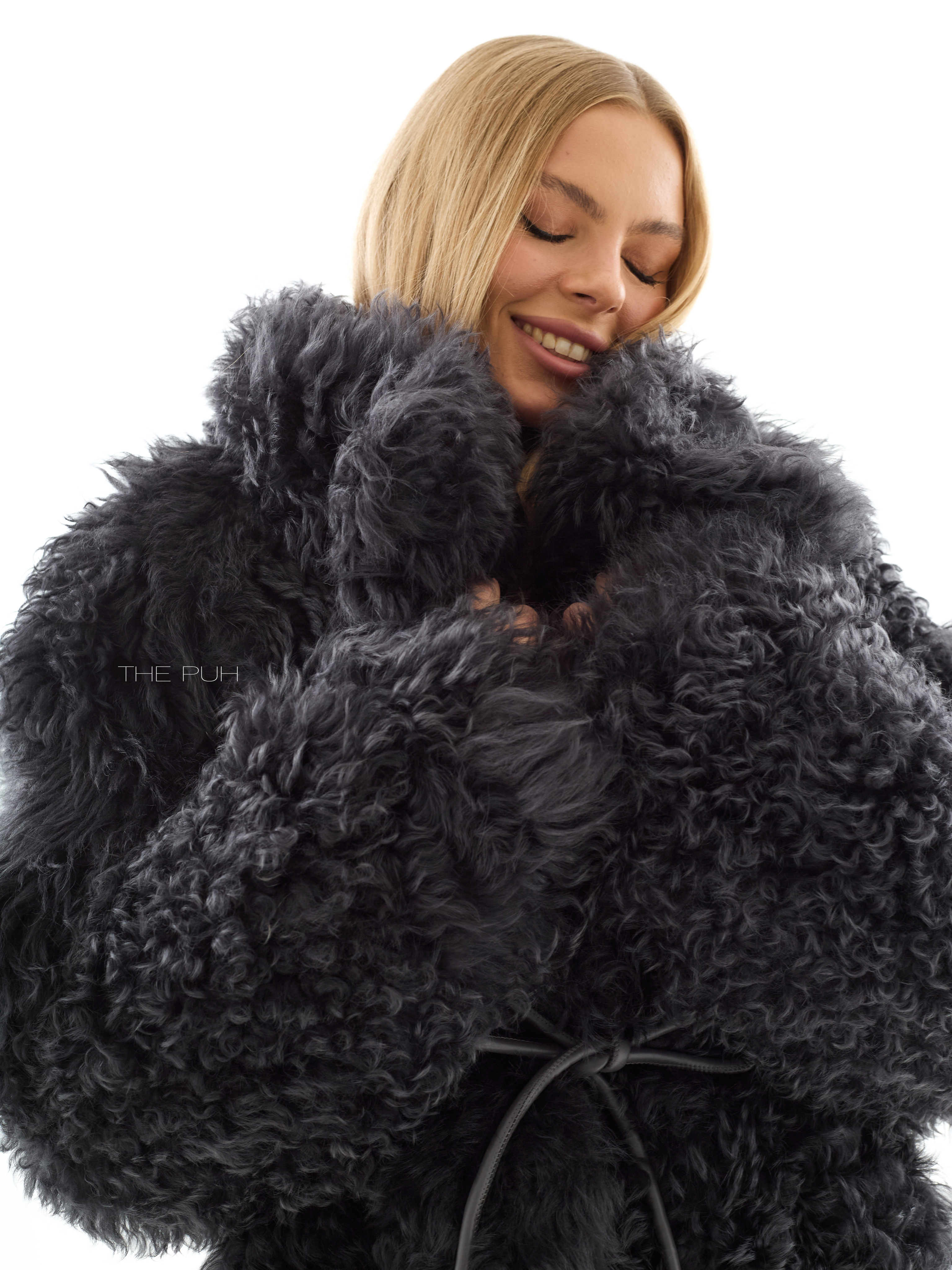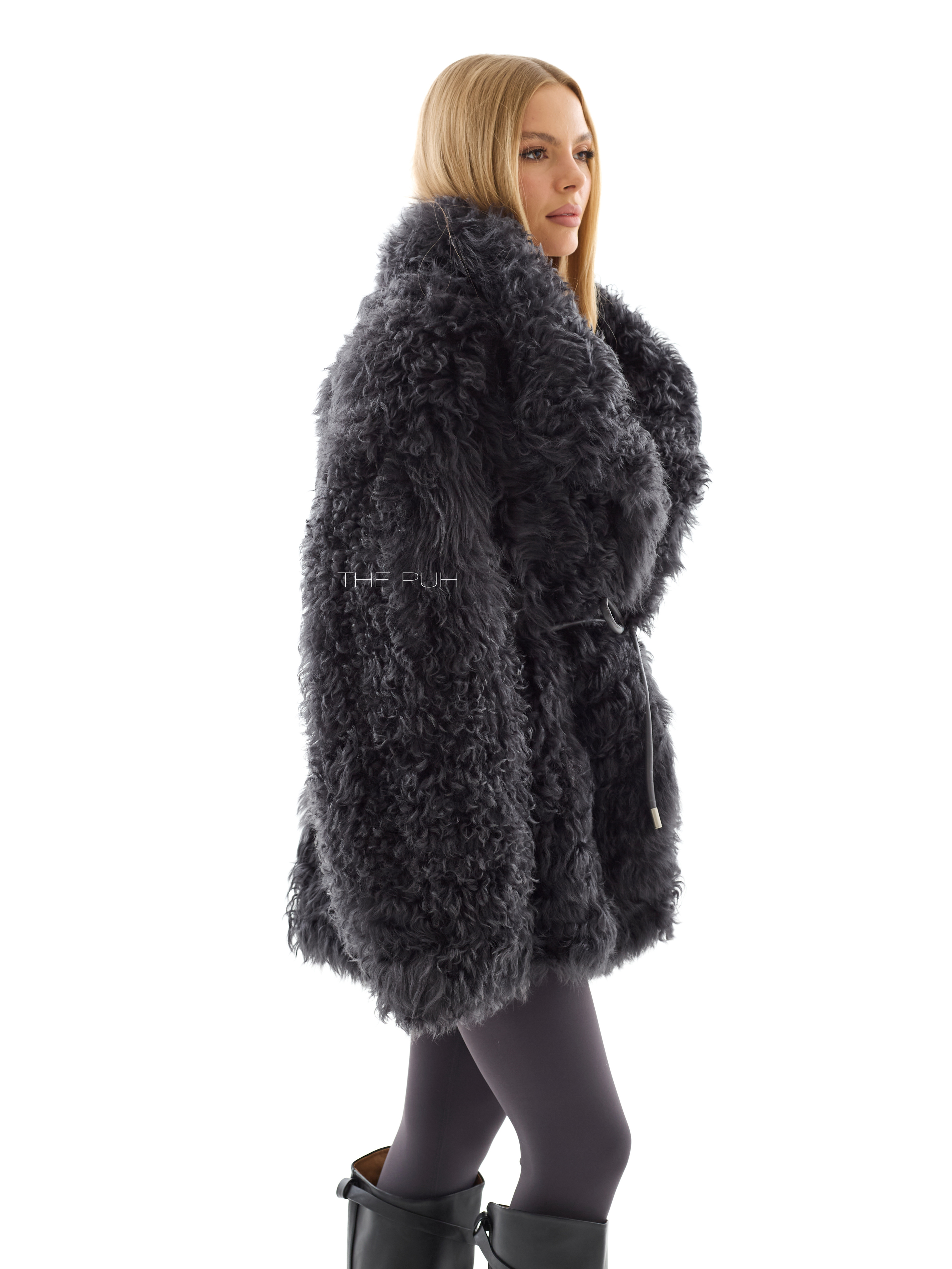 Графитовая шуба средней длины выполнена из натуральной овчины породы Калган. Модель объемного кроя застегивается на крючки и дополнена поясом-шнурком, который помогает контролировать прилегание и изменять силуэт шубы.