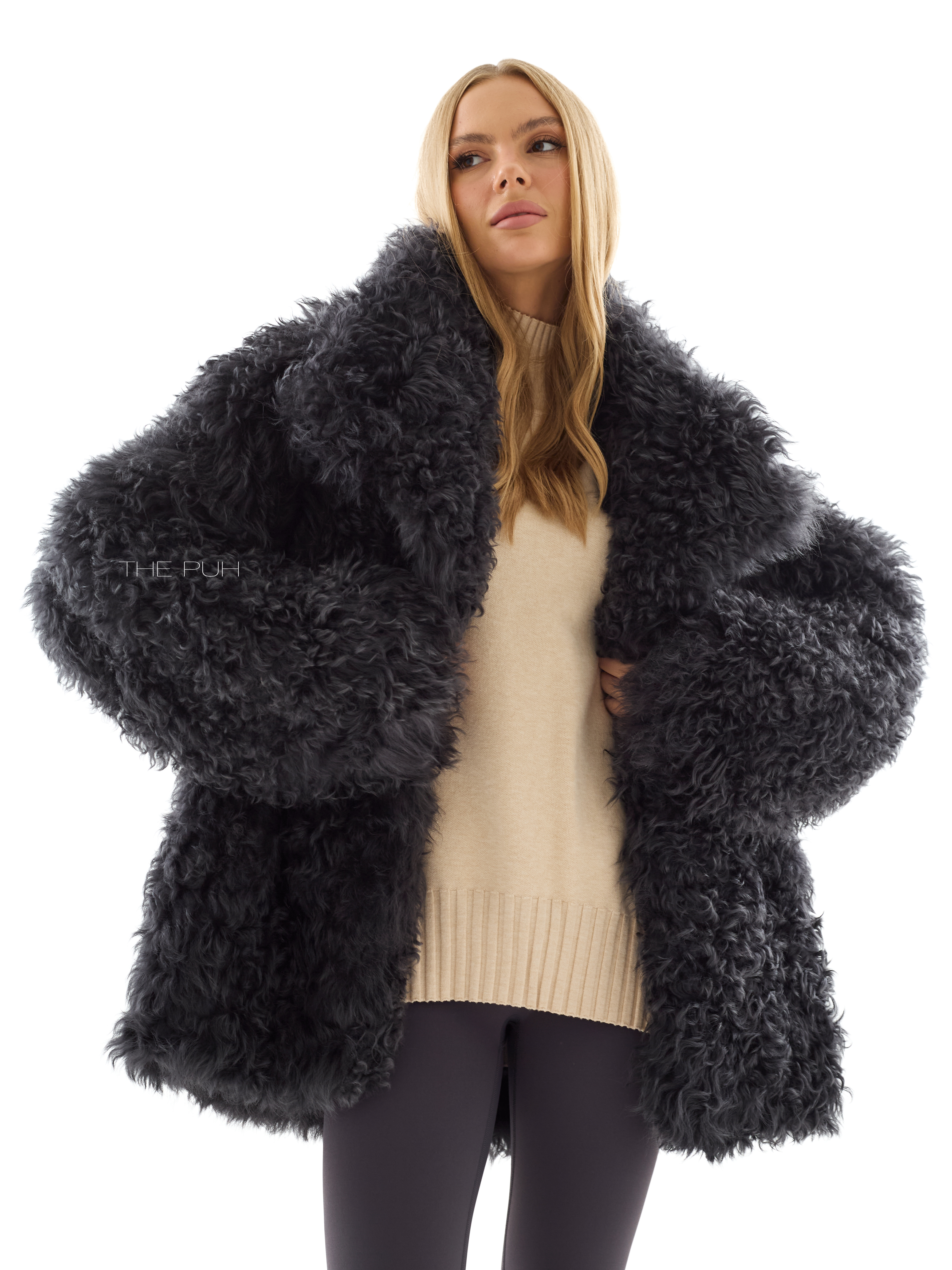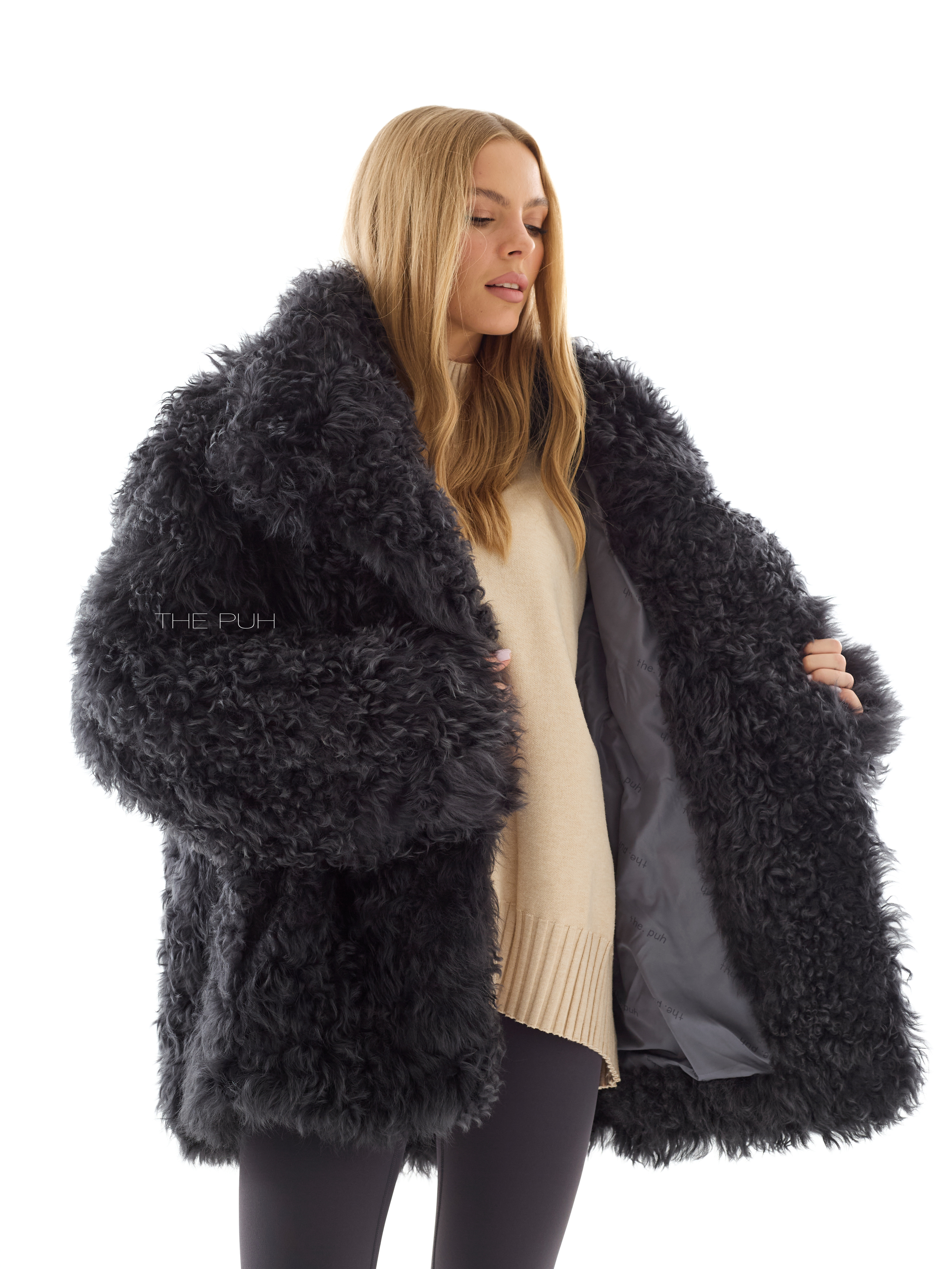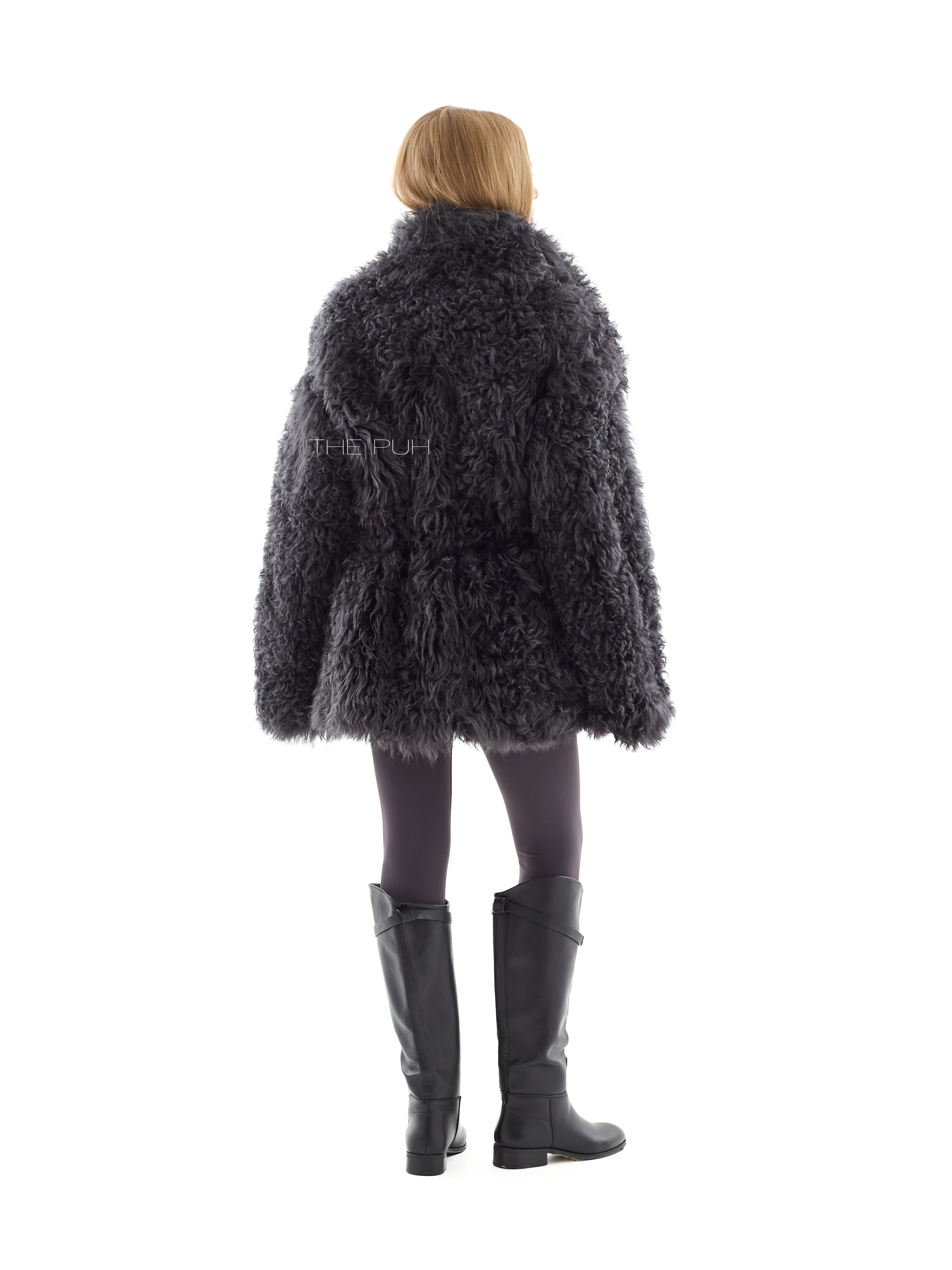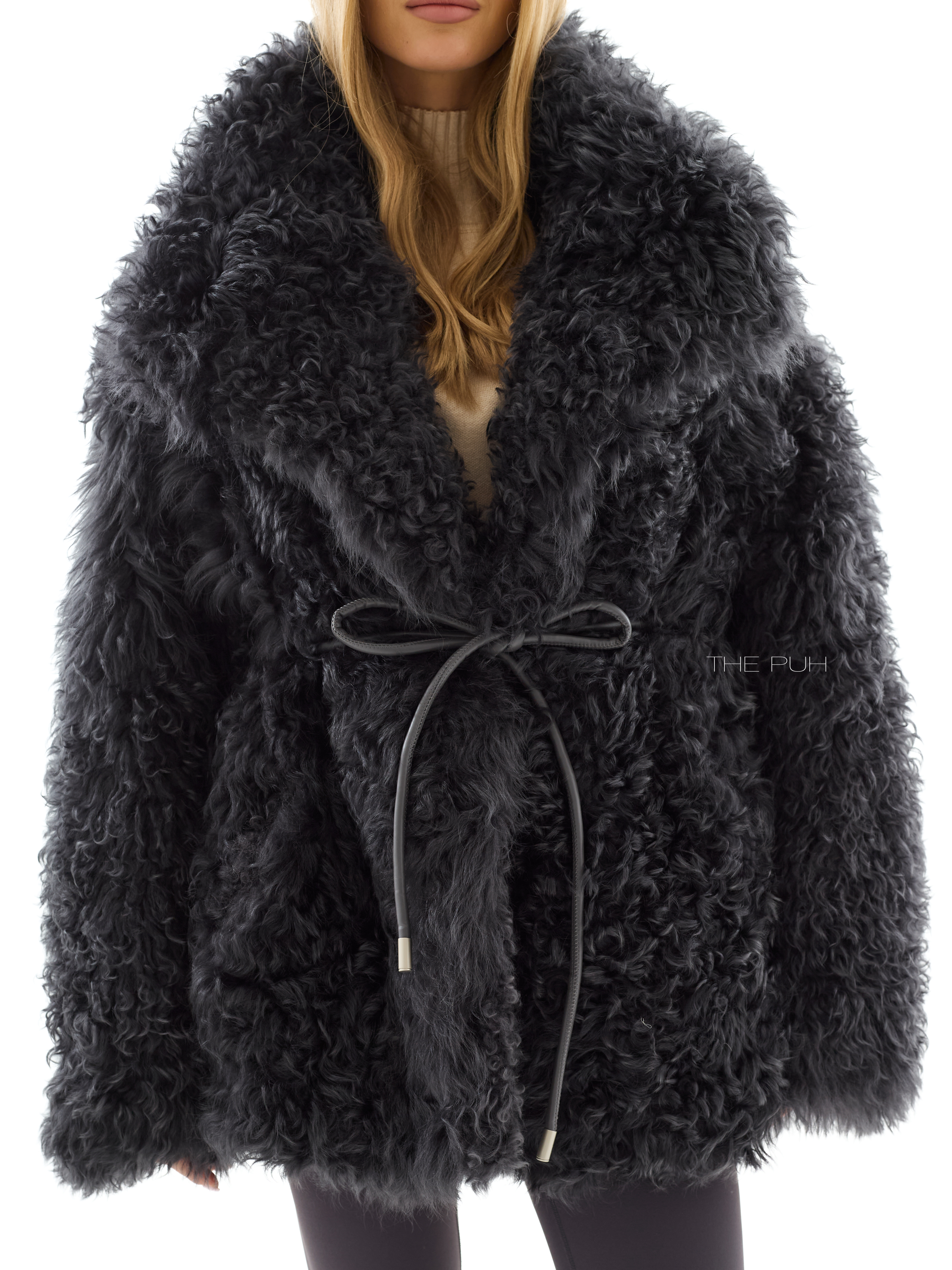 Графитовая шуба средней длины выполнена из натуральной овчины породы Калган. Модель объемного кроя застегивается на крючки и дополнена поясом-шнурком, который помогает контролировать прилегание и изменять силуэт шубы.