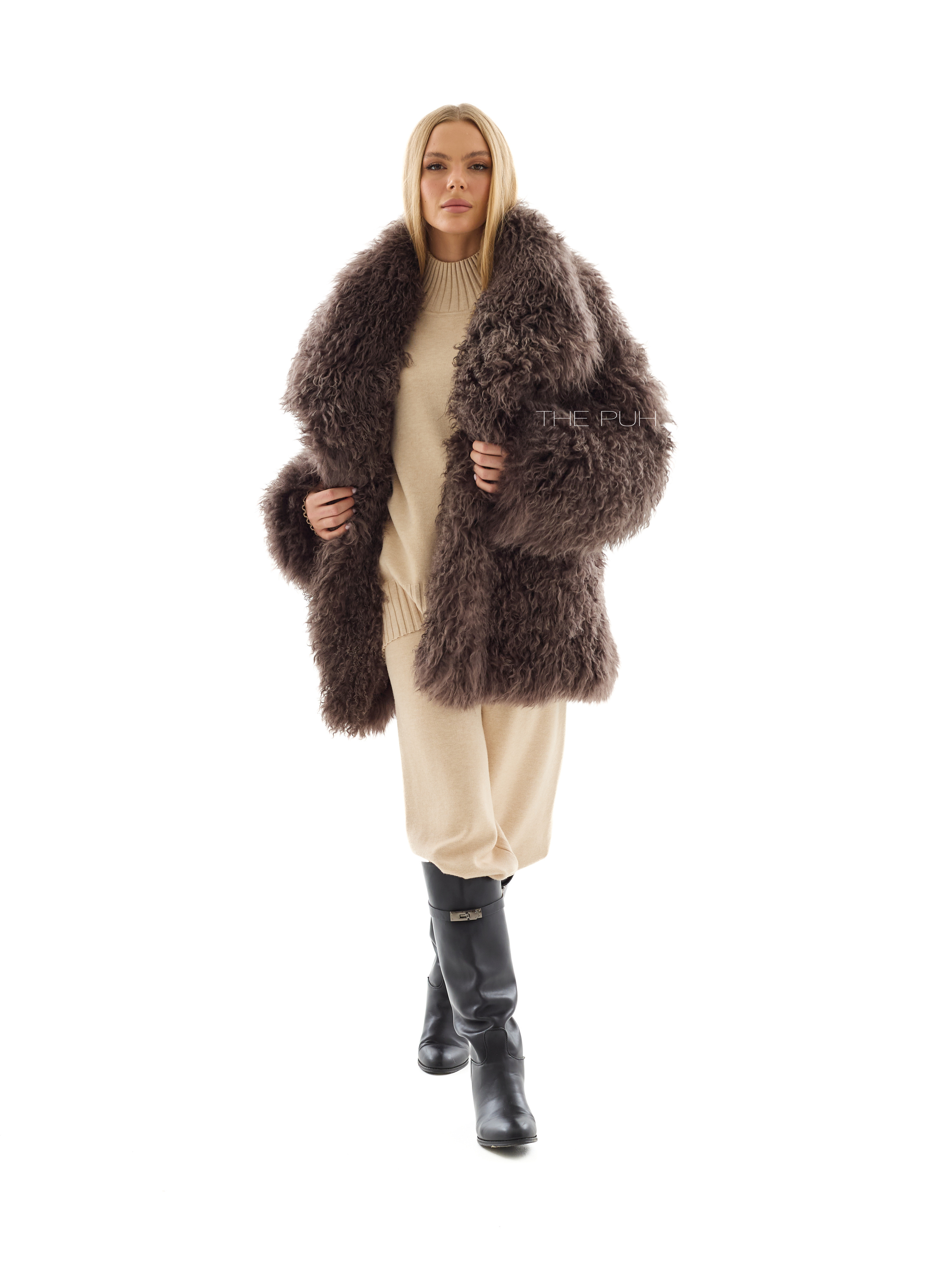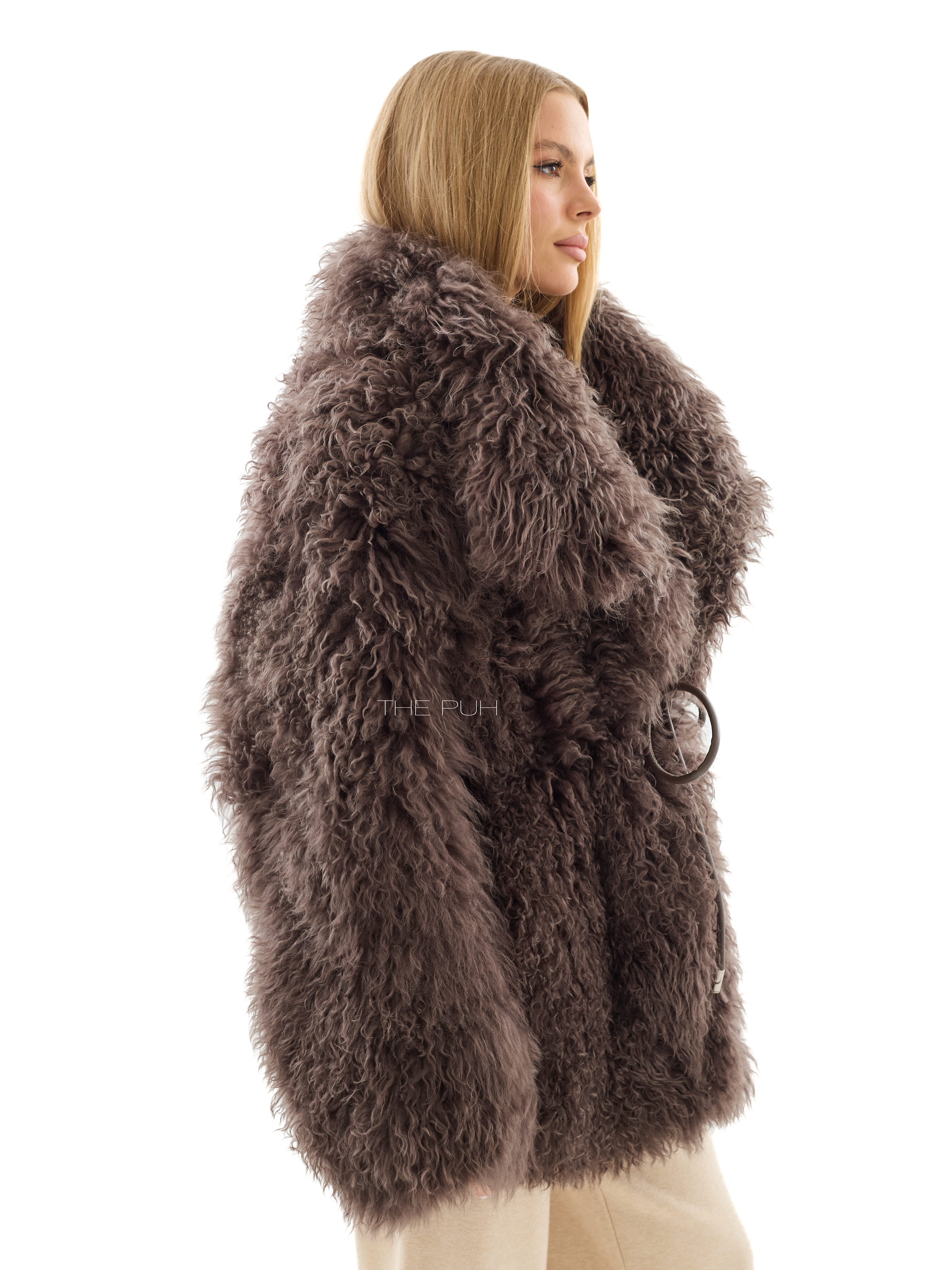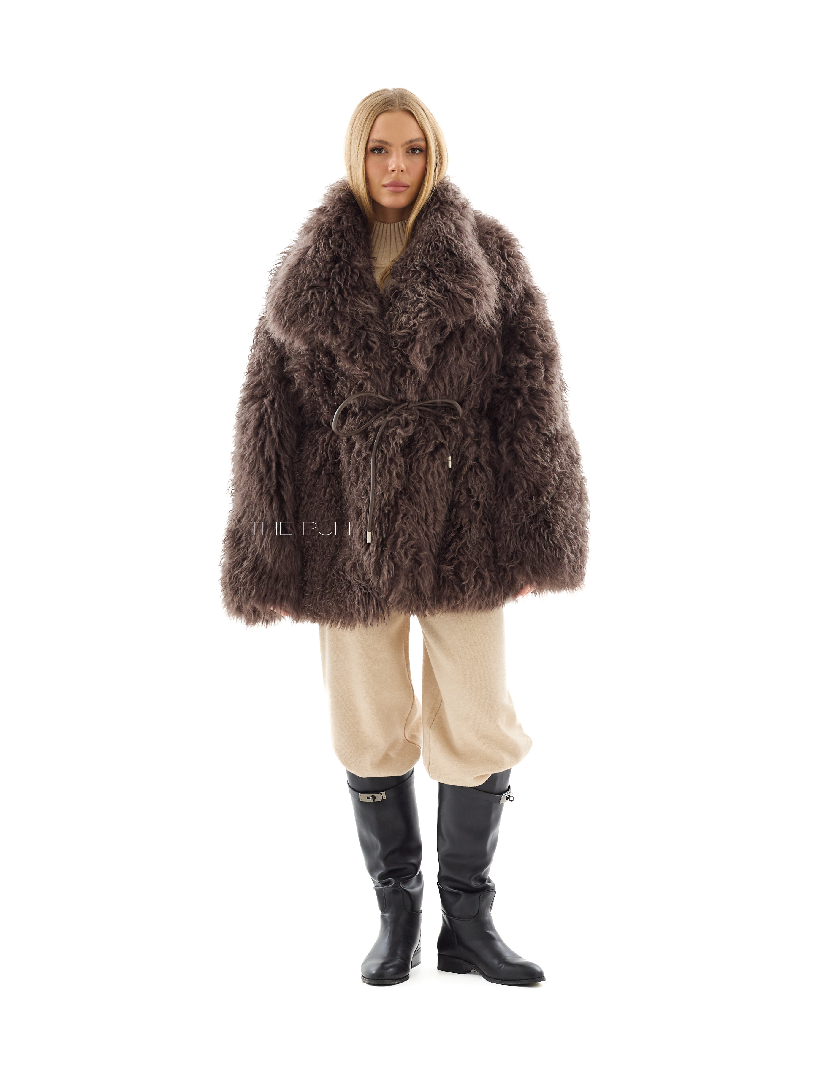 Шоколадная шуба средней длины выполнена из натуральной овчины породы Калган. Модель объемного кроя застегивается на крючки и дополнена поясом-шнурком, который помогает контролировать прилегание и изменять силуэт шубы.