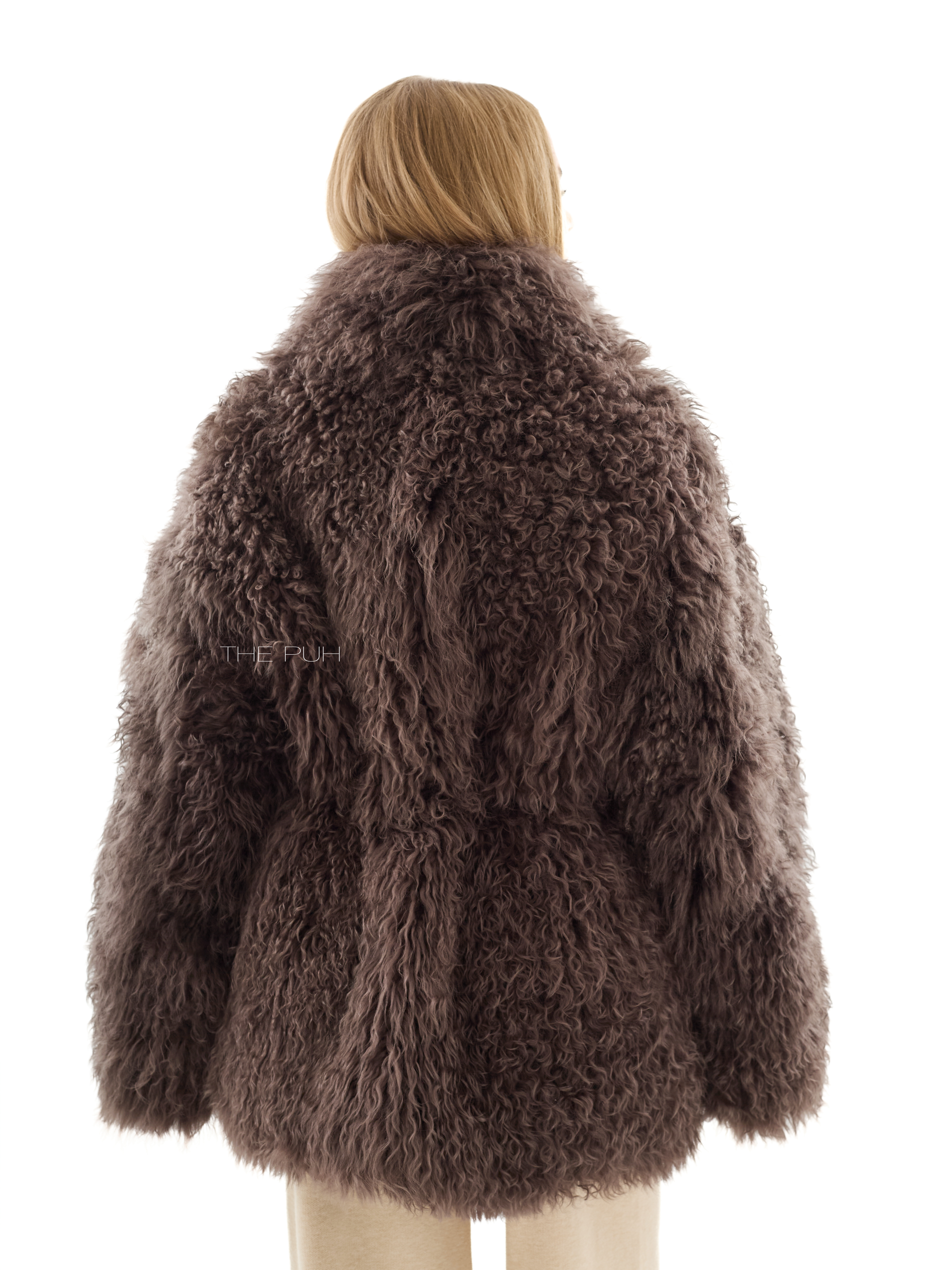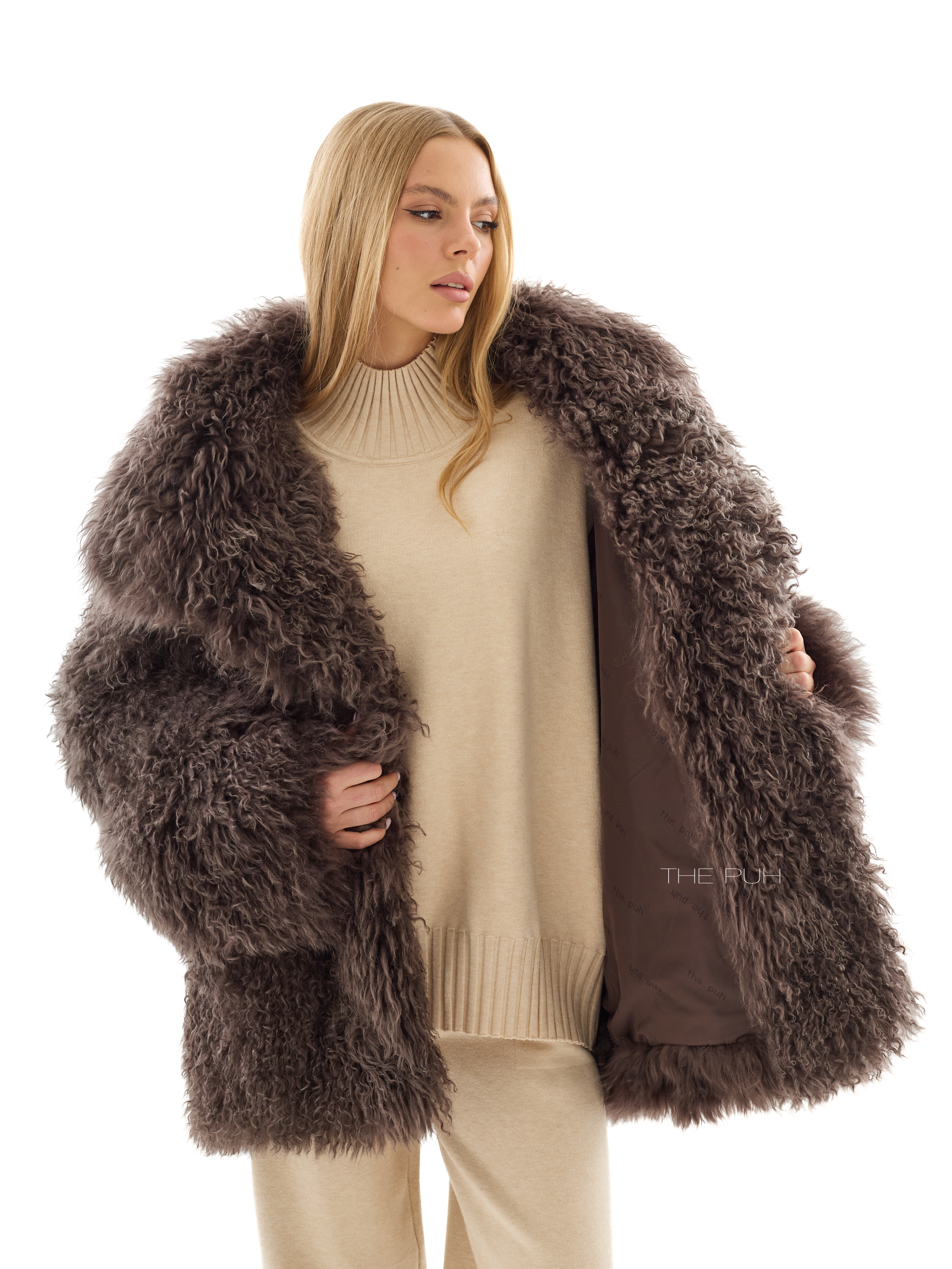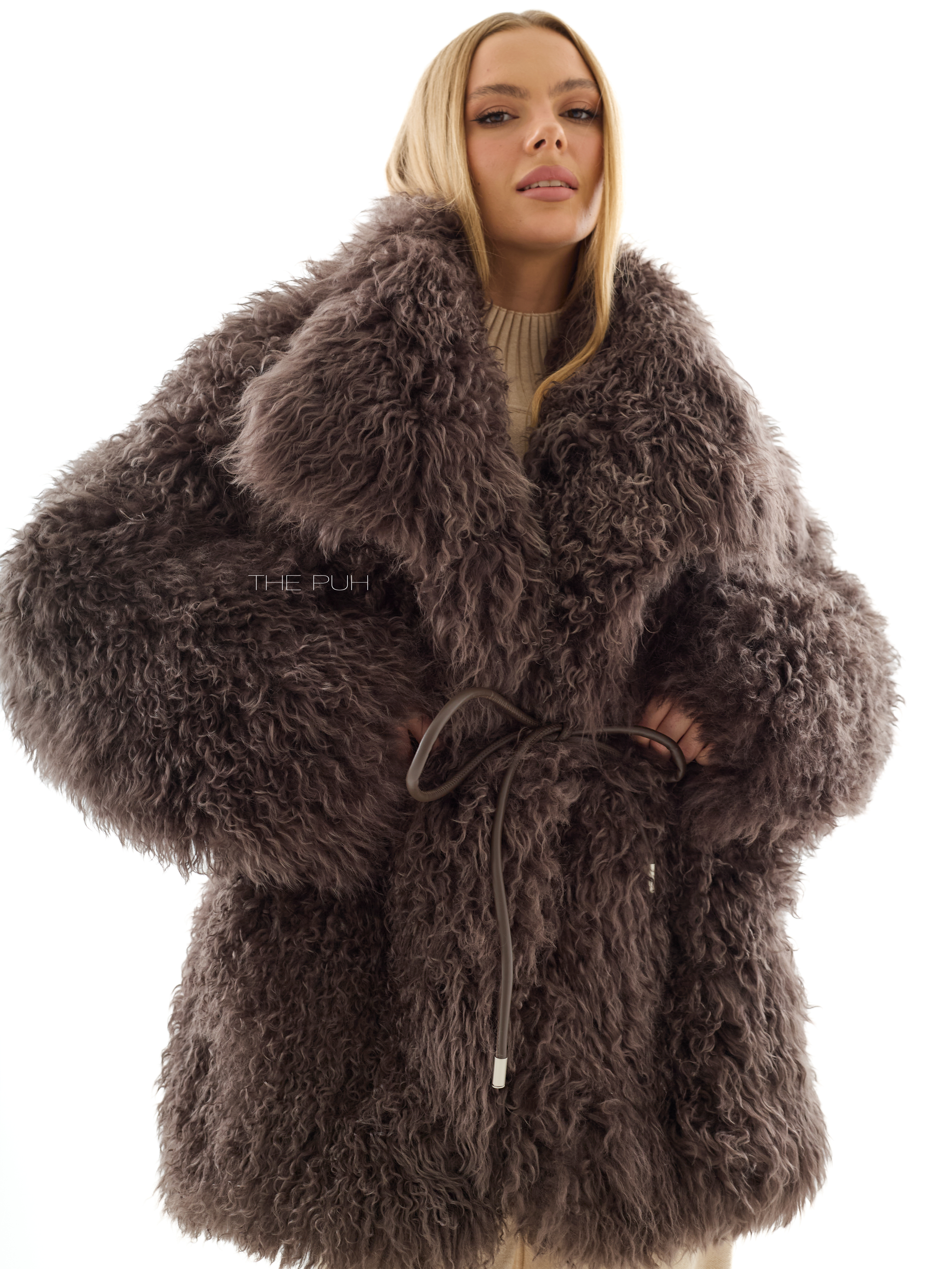 Шоколадная шуба средней длины выполнена из натуральной овчины породы Калган. Модель объемного кроя застегивается на крючки и дополнена поясом-шнурком, который помогает контролировать прилегание и изменять силуэт шубы.