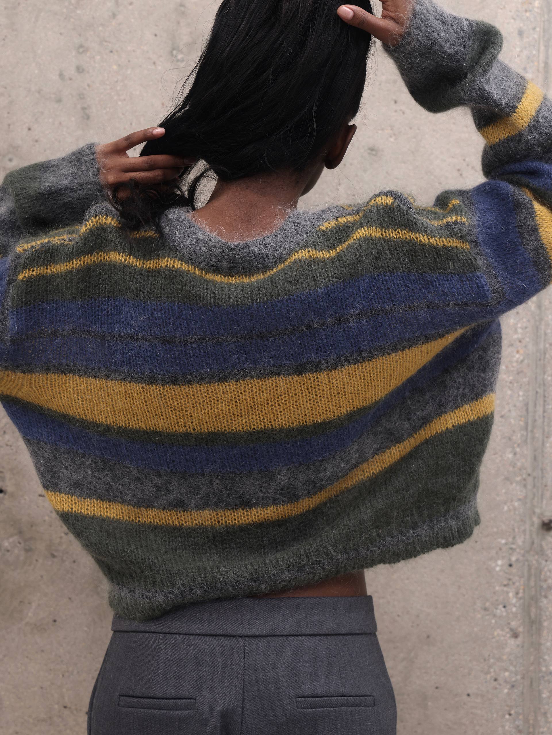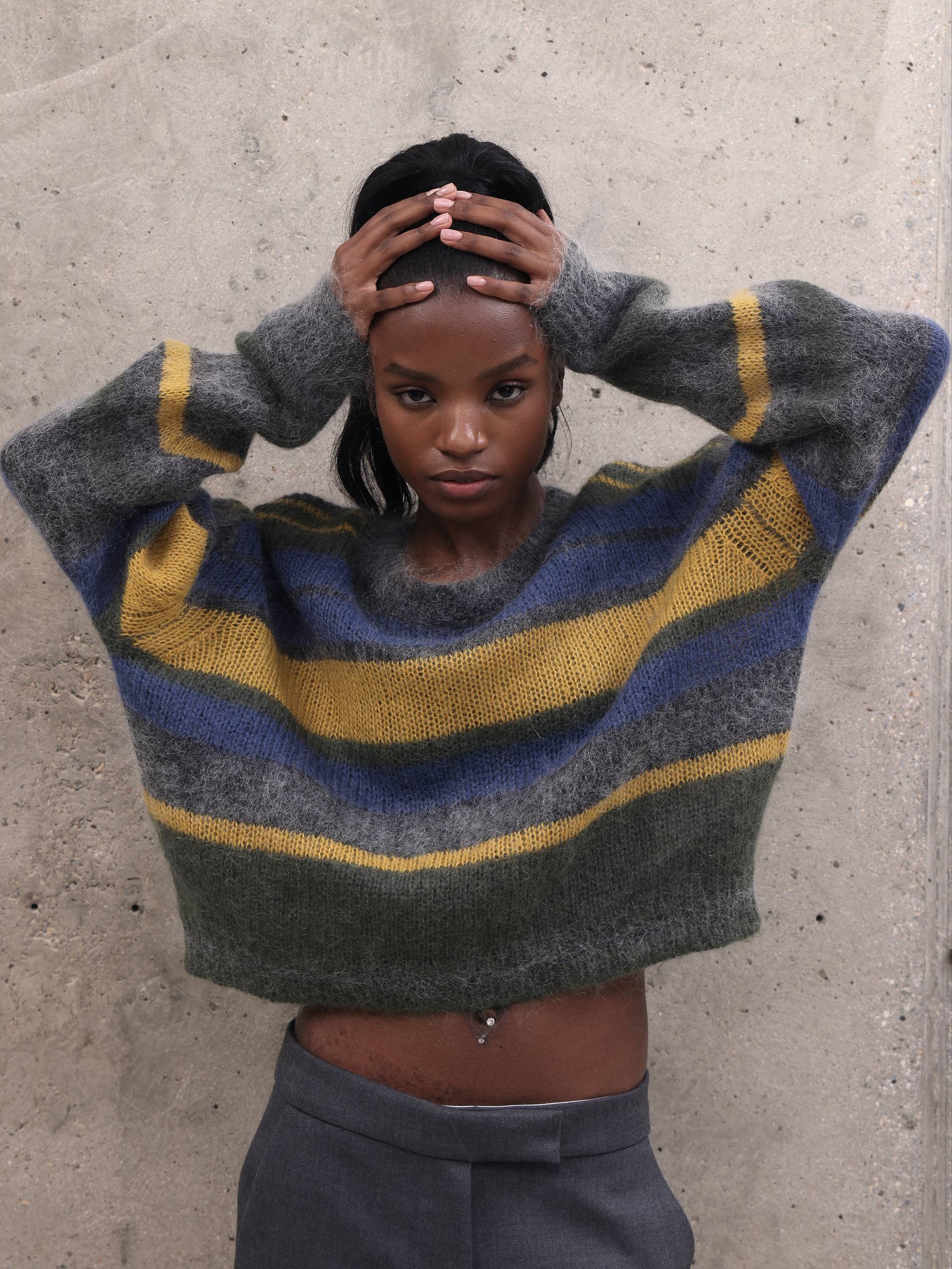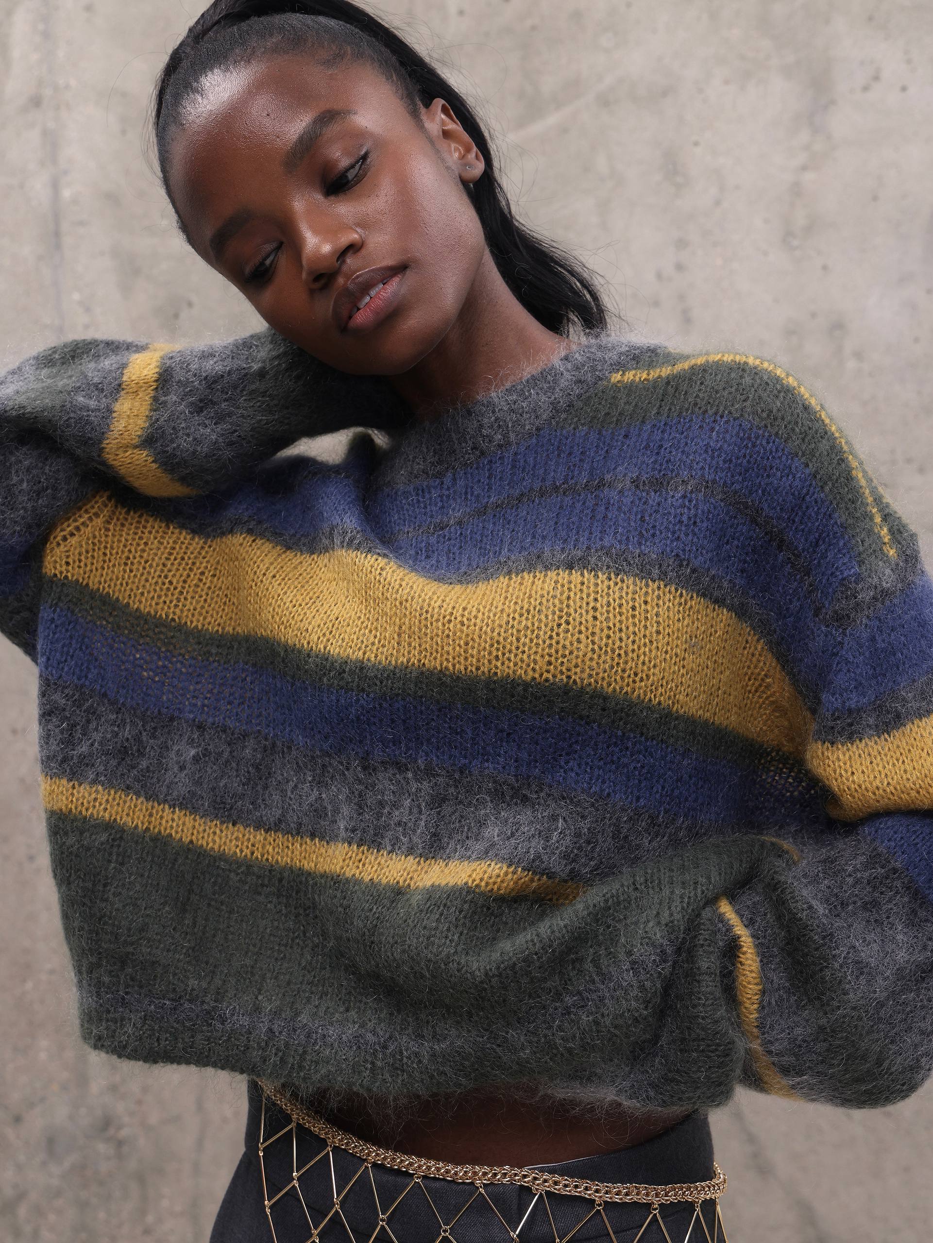Укороченный синий свитер в полоску выполнен из смесовой шерсти и мохера. Идеальный кроп-фит отлично подходит для многослойного стайлинга, а множество цветов полоски упрощает подбор низа - от акцентной юбки до базовых серых брюк, которые есть в гардеробе у каждой.