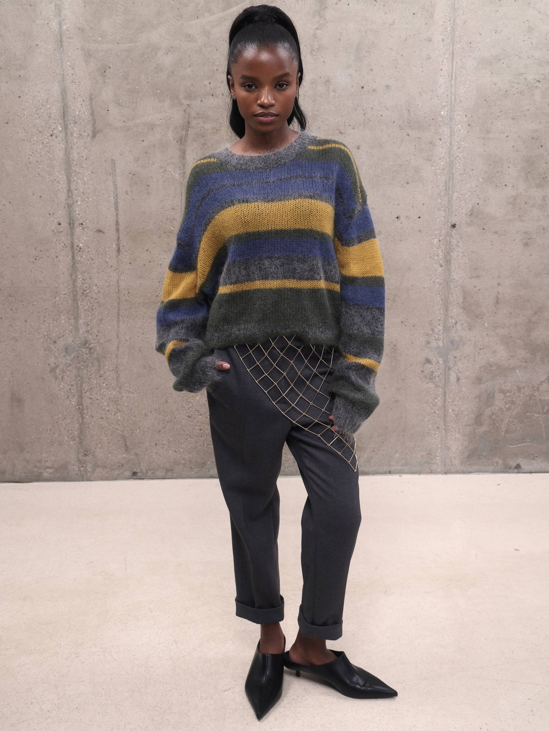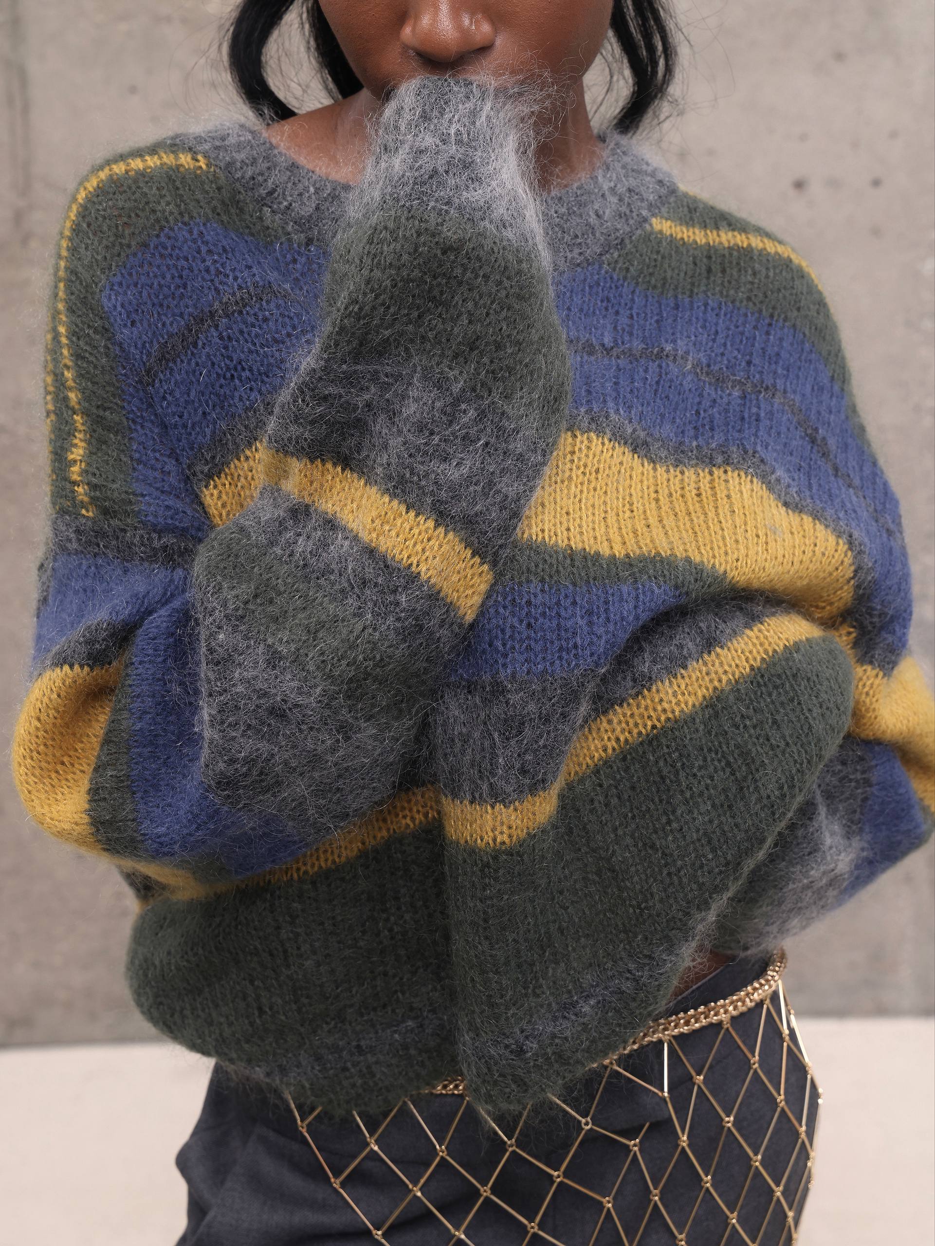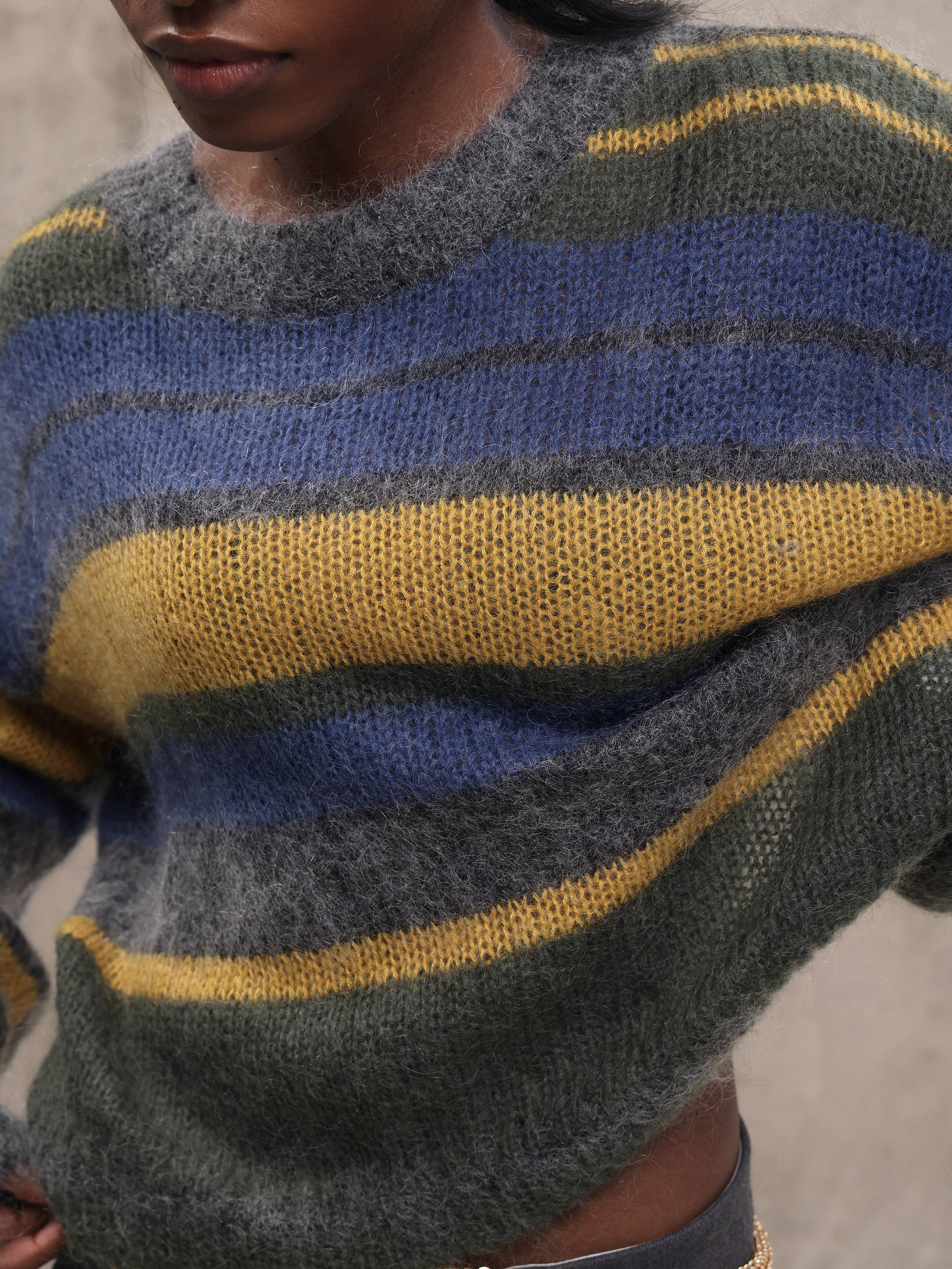 Укороченный синий свитер в полоску выполнен из смесовой шерсти и мохера. Идеальный кроп-фит отлично подходит для многослойного стайлинга, а множество цветов полоски упрощает подбор низа - от акцентной юбки до базовых серых брюк, которые есть в гардеробе у каждой.