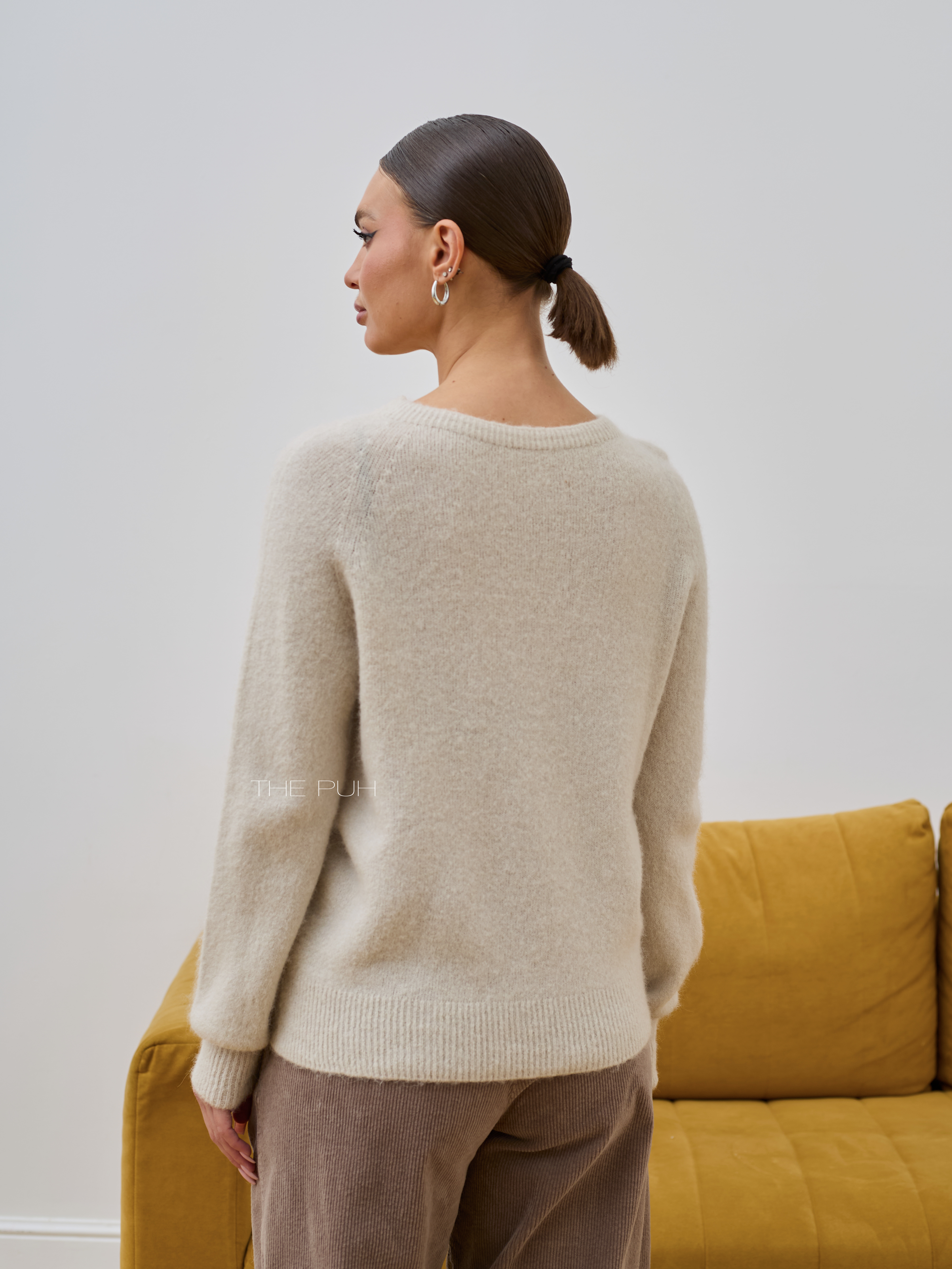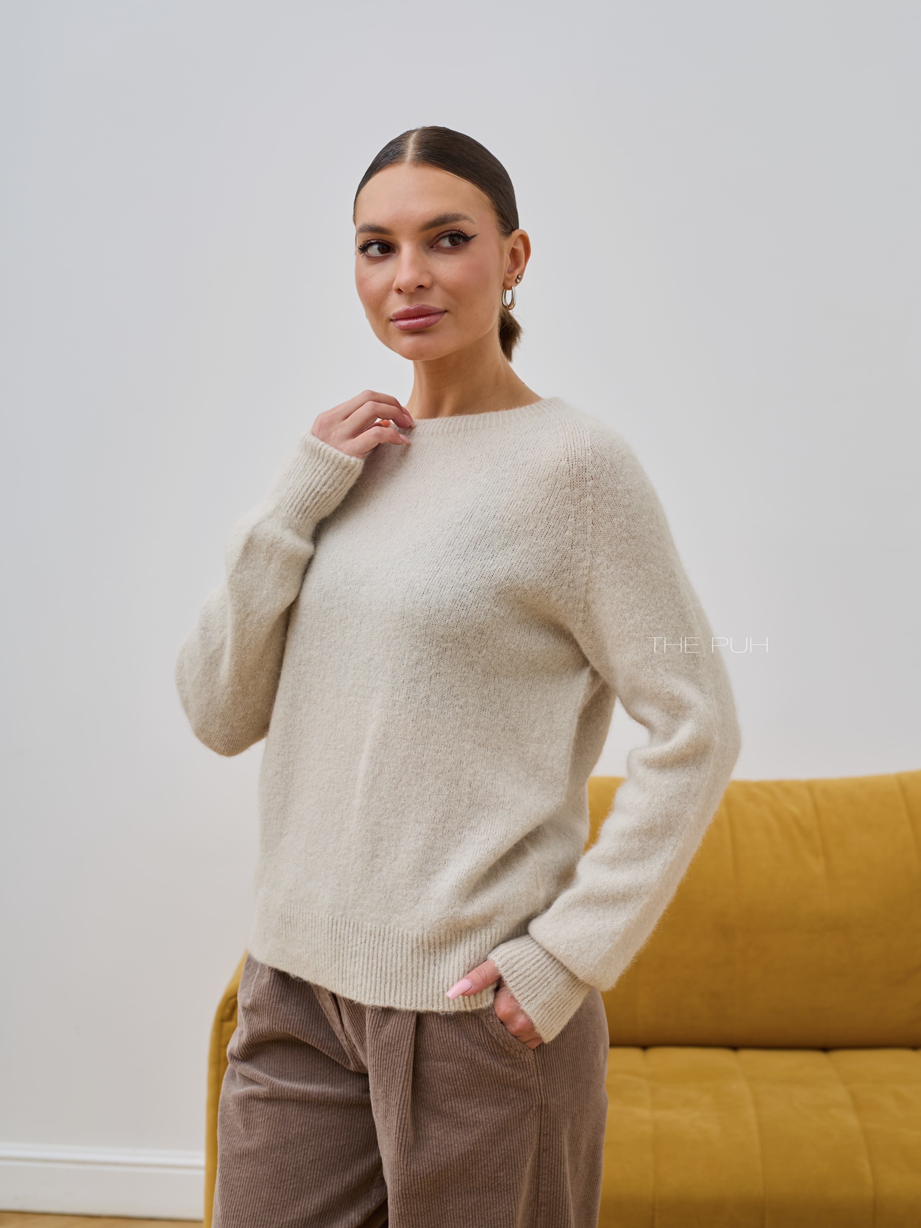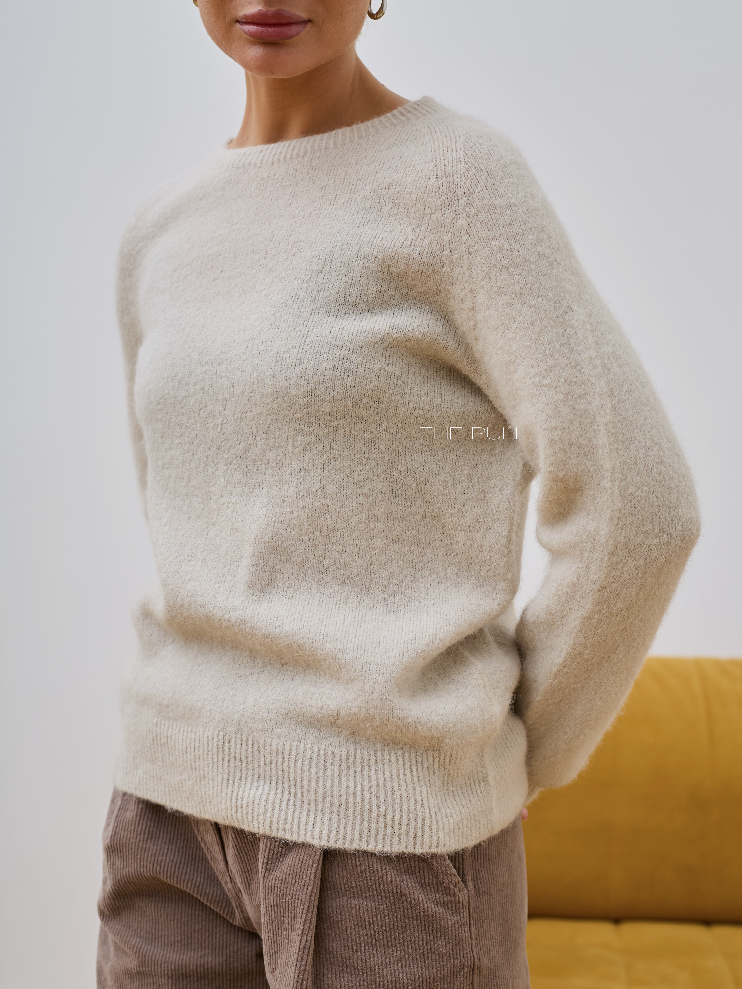 Бежевый джемпер из смесовой пряжи с добавлением бэби альпаки. Модель базового кроя с круглым вырезом идеально впишется в любой гардероб и отлично подойдет как бля самостоятельной носки, так и для многослойных стилизаций.