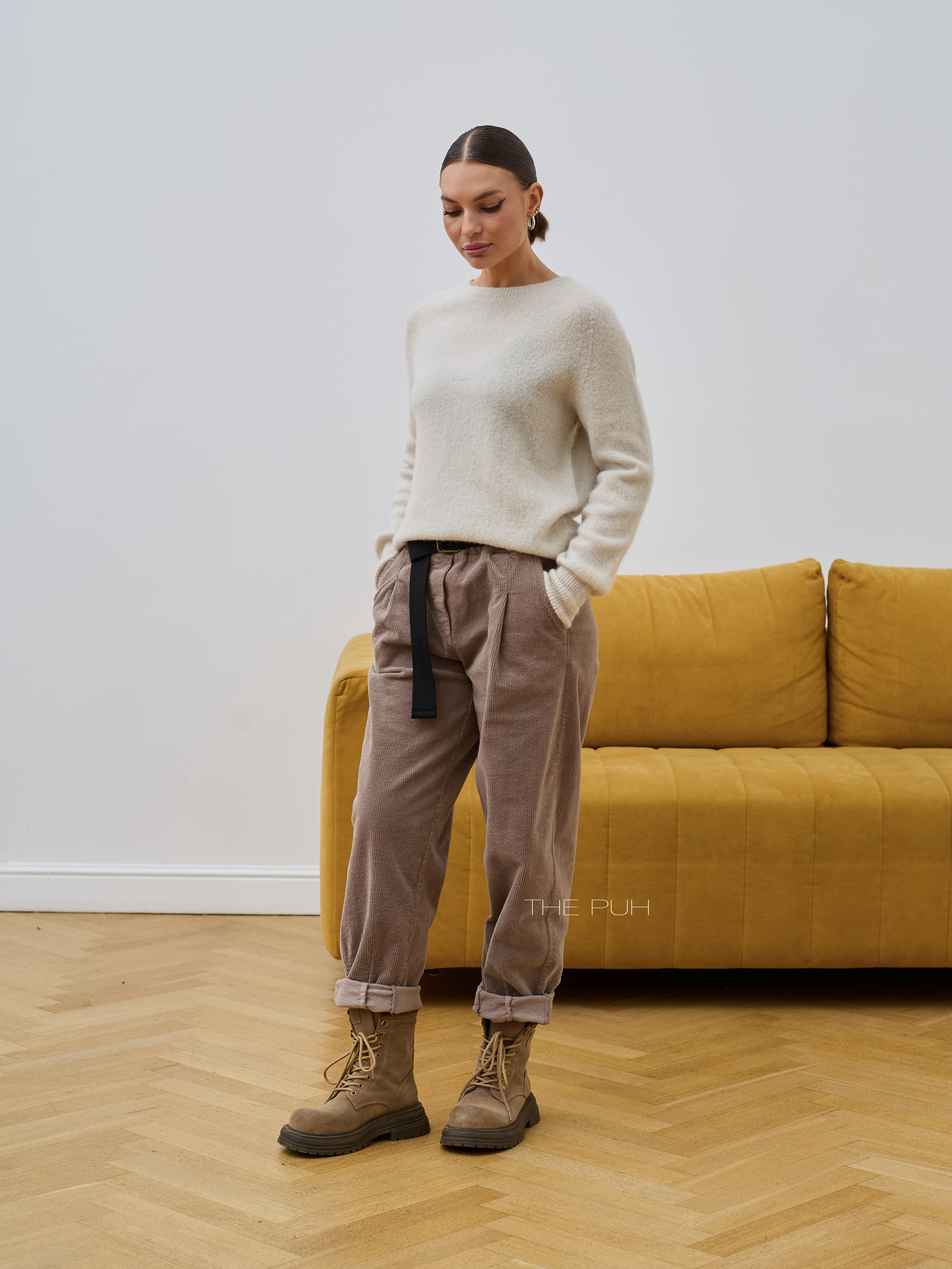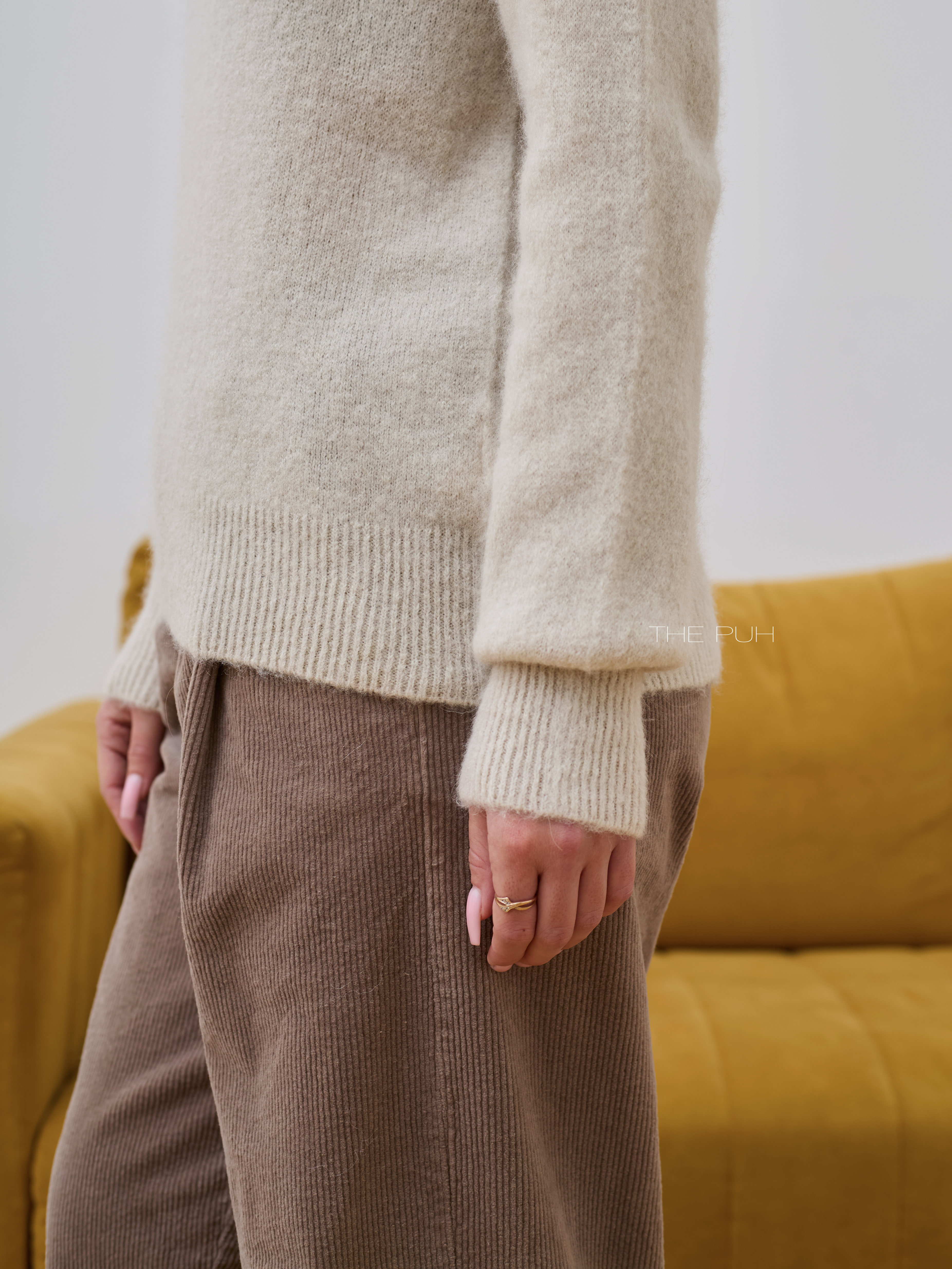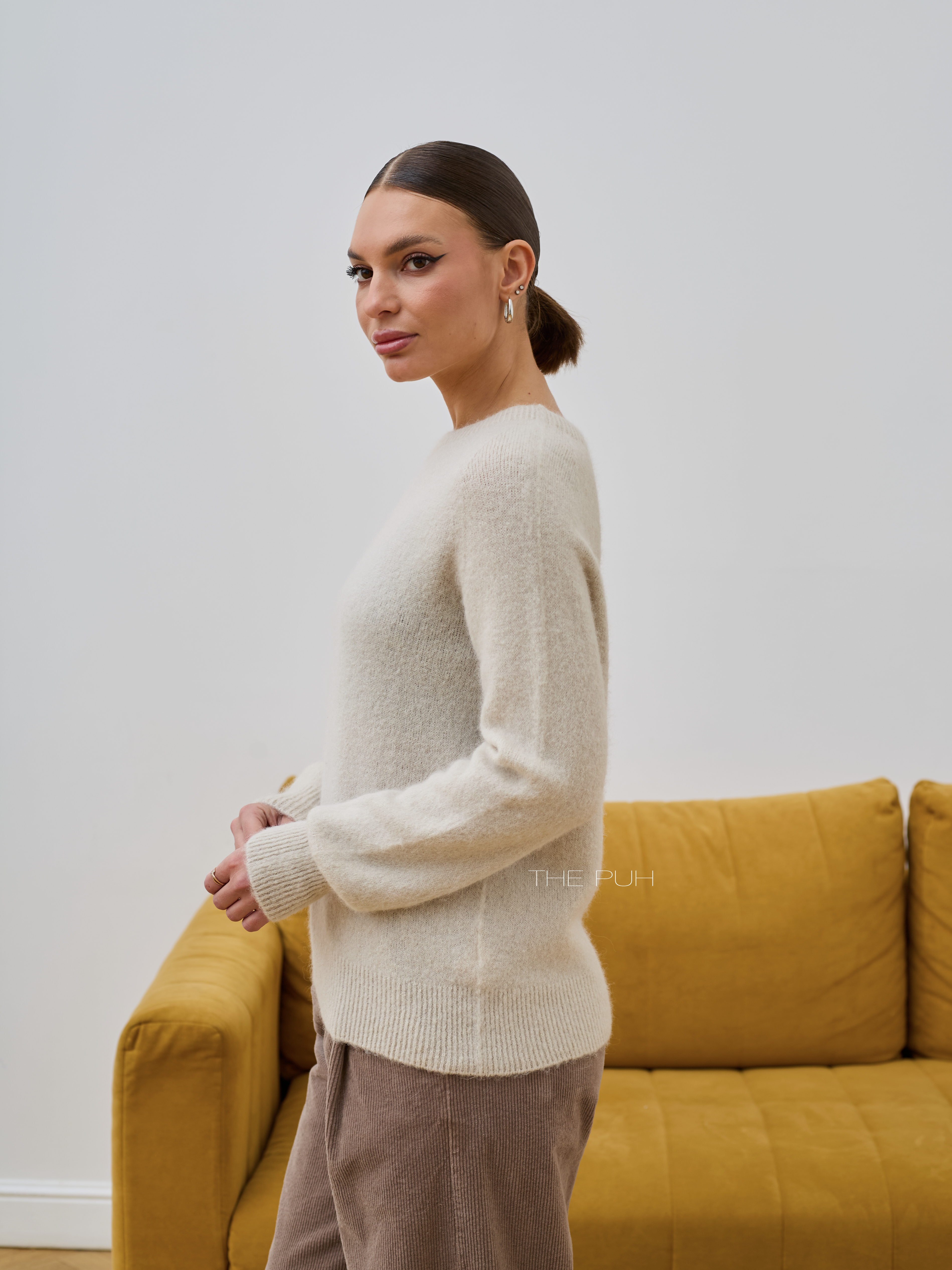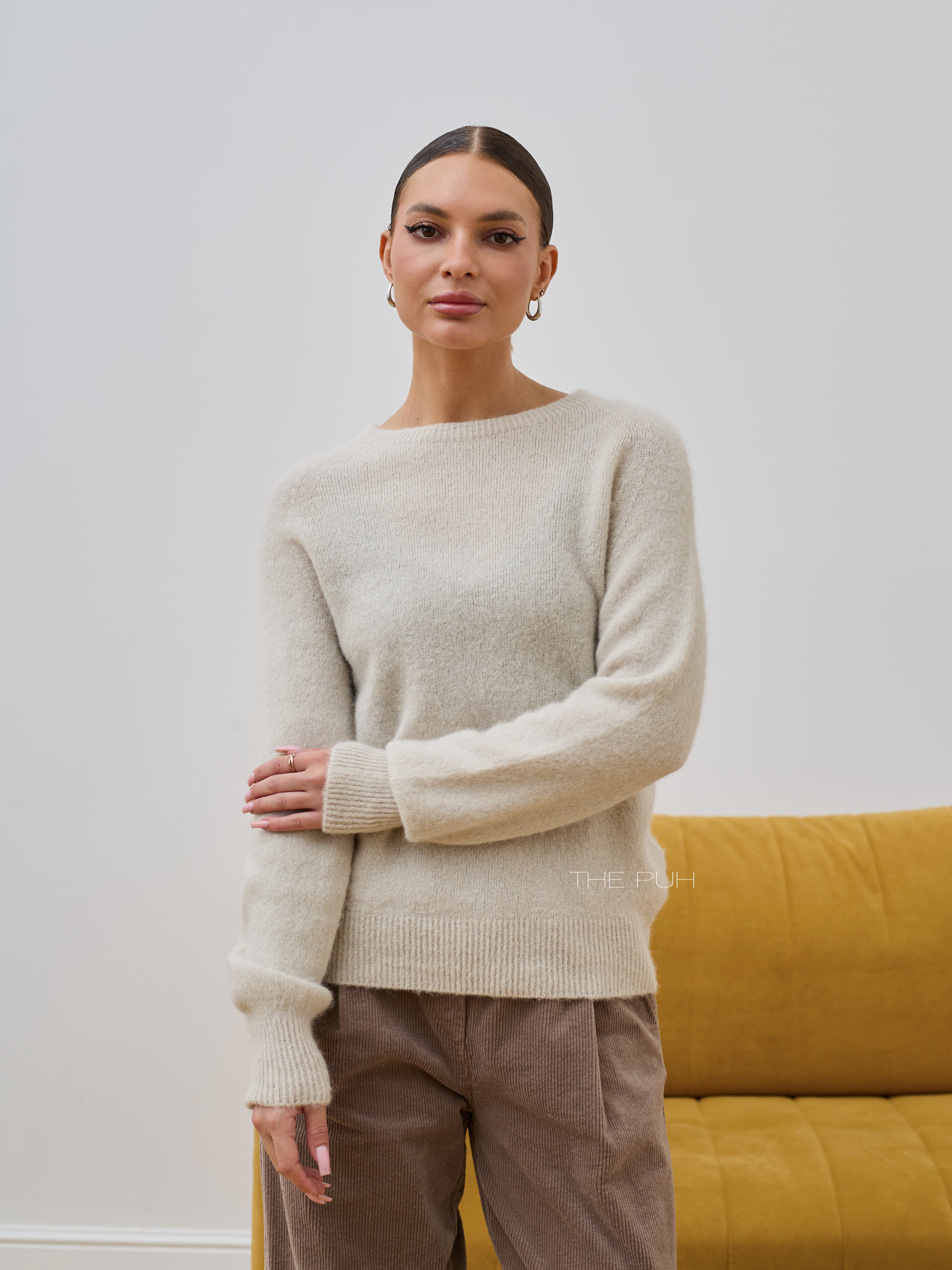 Бежевый джемпер из смесовой пряжи с добавлением бэби альпаки. Модель базового кроя с круглым вырезом идеально впишется в любой гардероб и отлично подойдет как бля самостоятельной носки, так и для многослойных стилизаций.