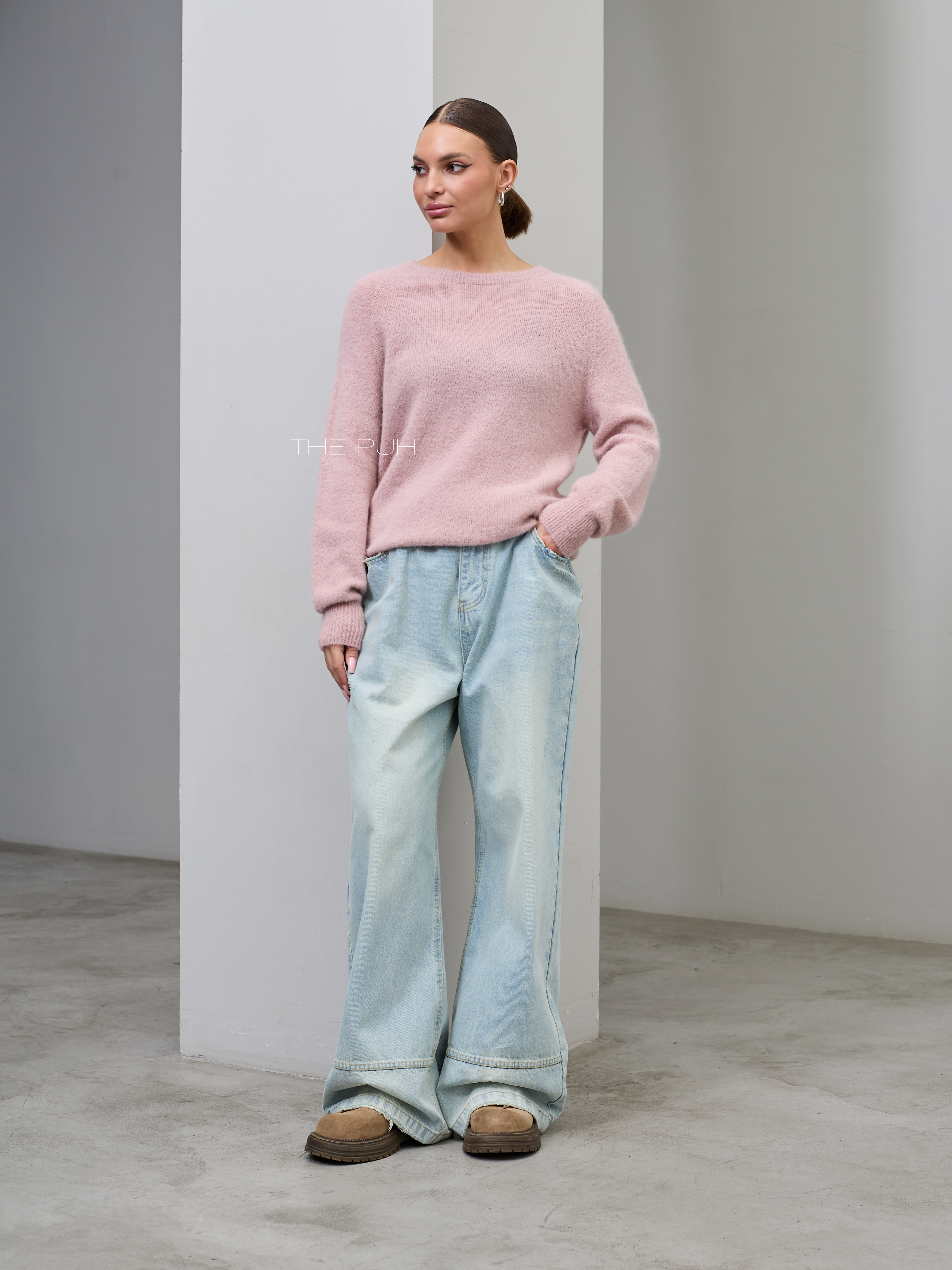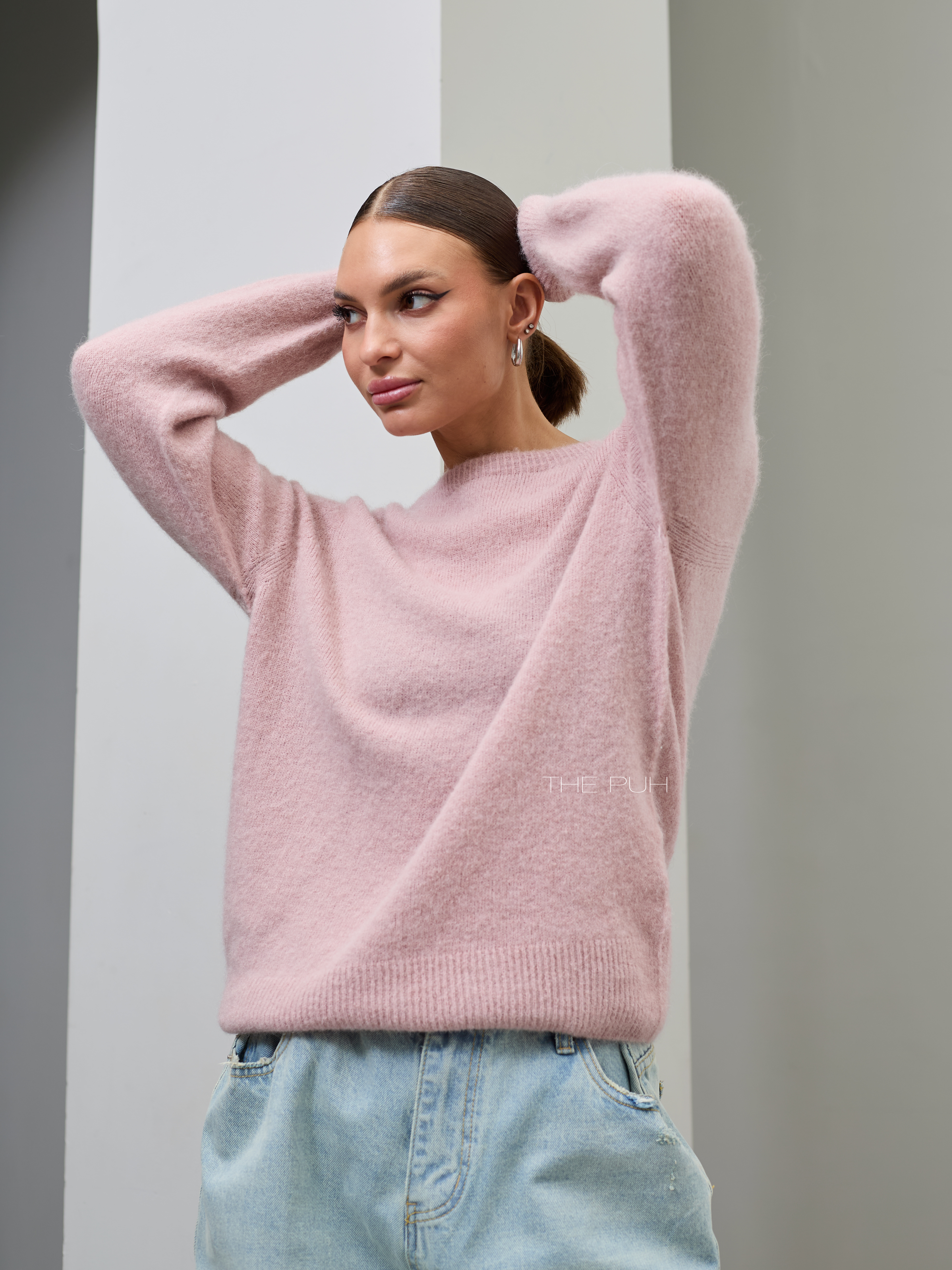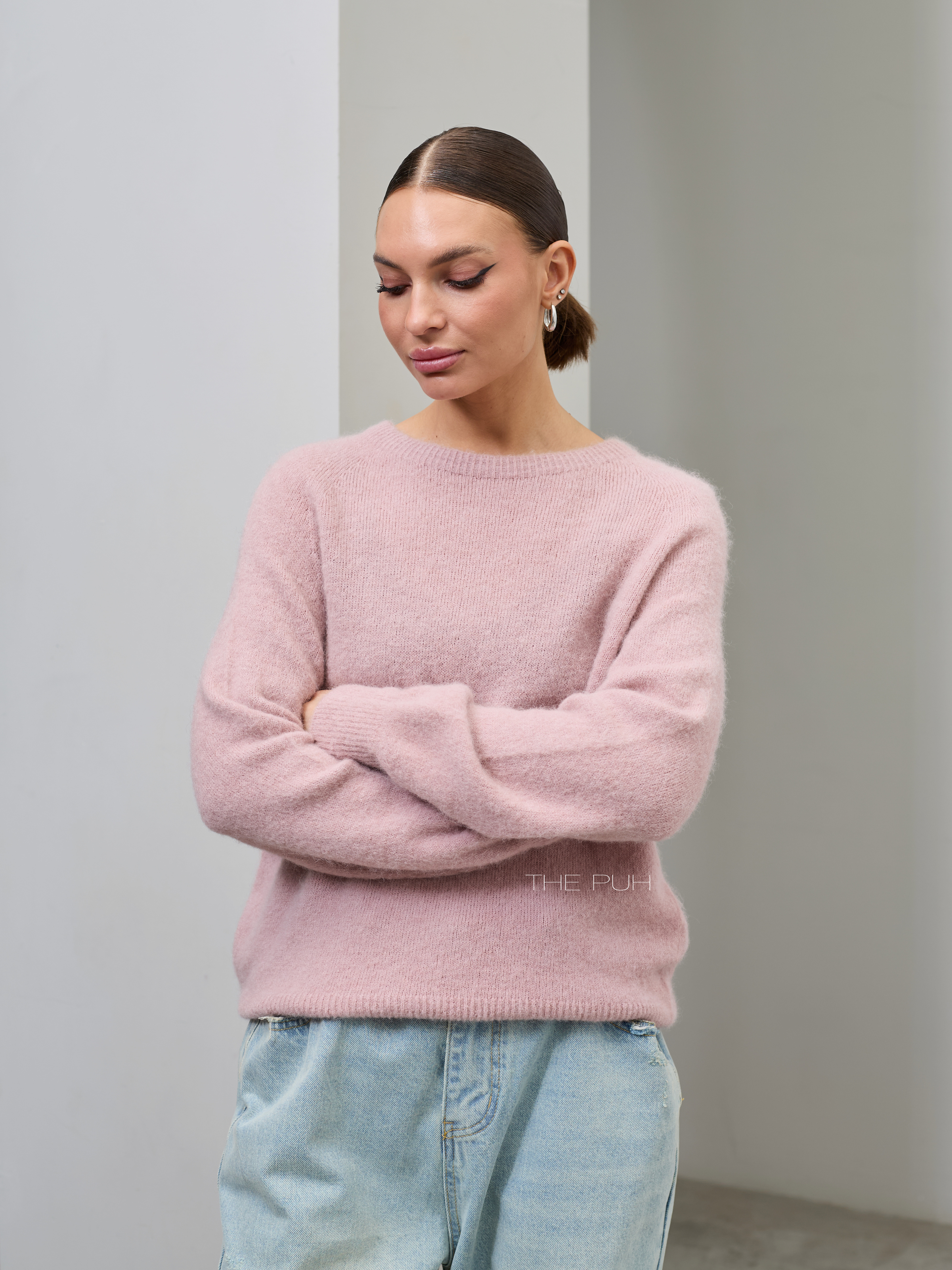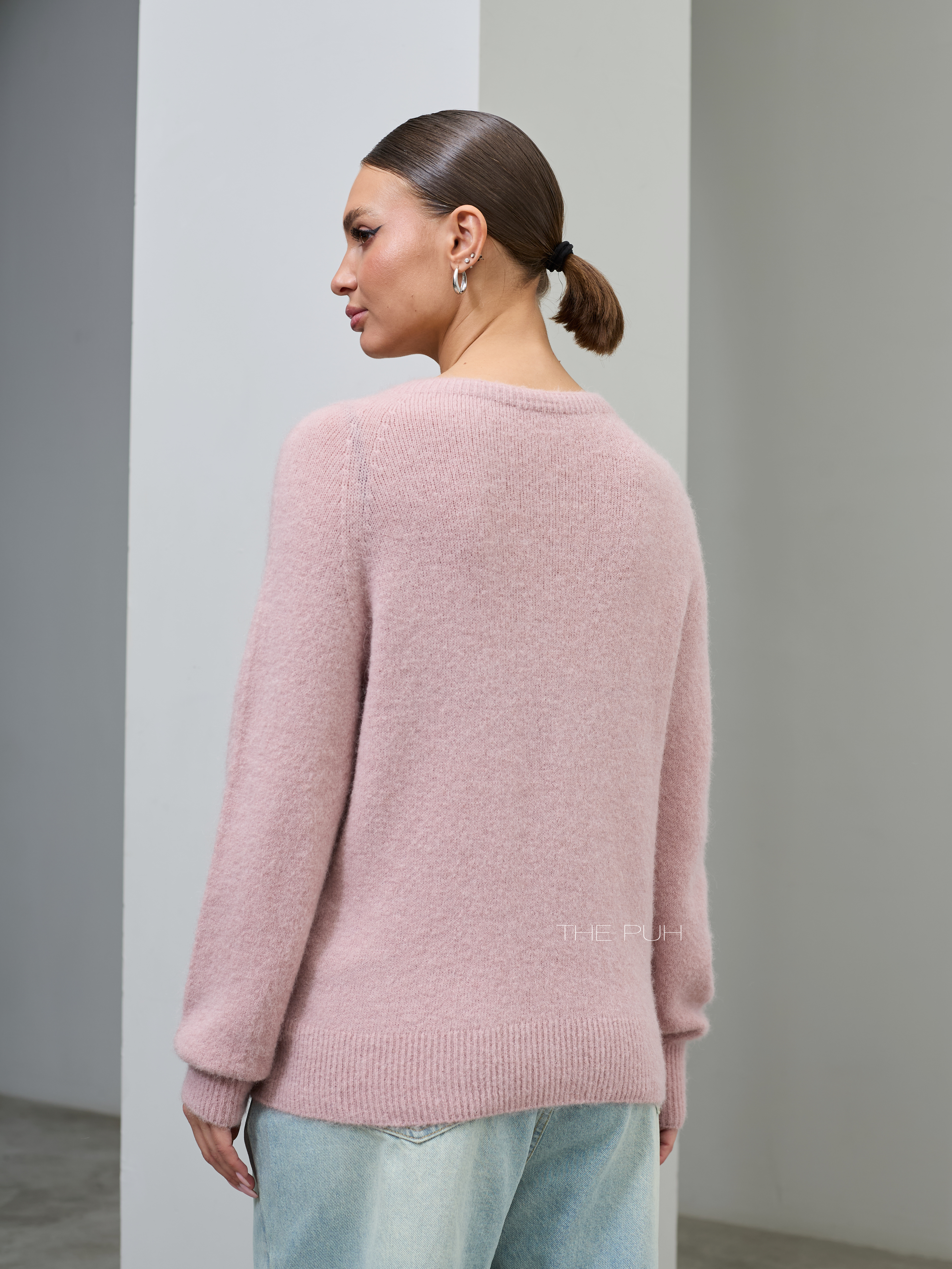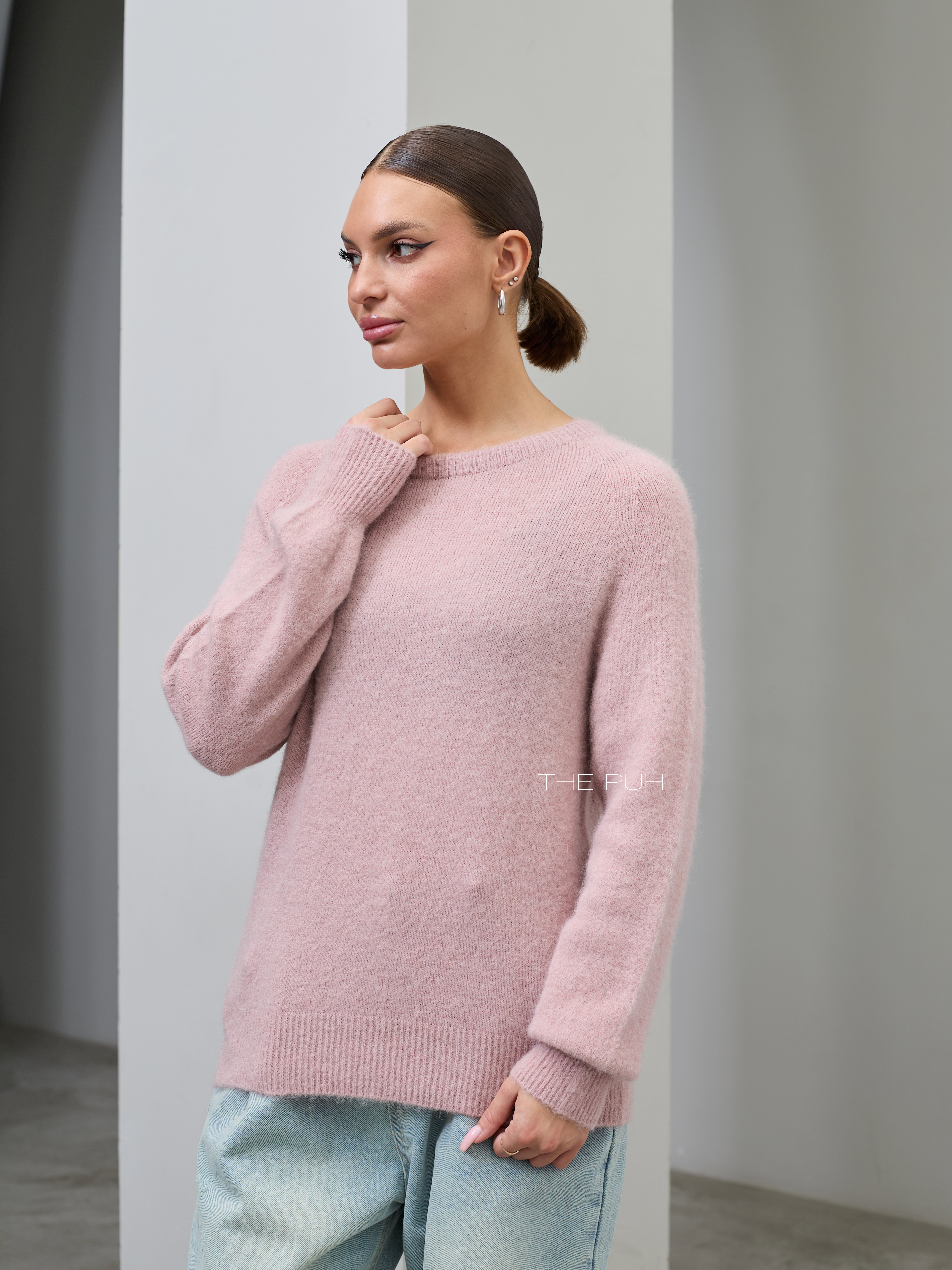 Розовый джемпер из смесовой пряжи с добавлением бэби альпаки. Модель базового кроя с круглым вырезом идеально впишется в любой гардероб и отлично подойдет как бля самостоятельной носки, так и для многослойных стилизаций.
