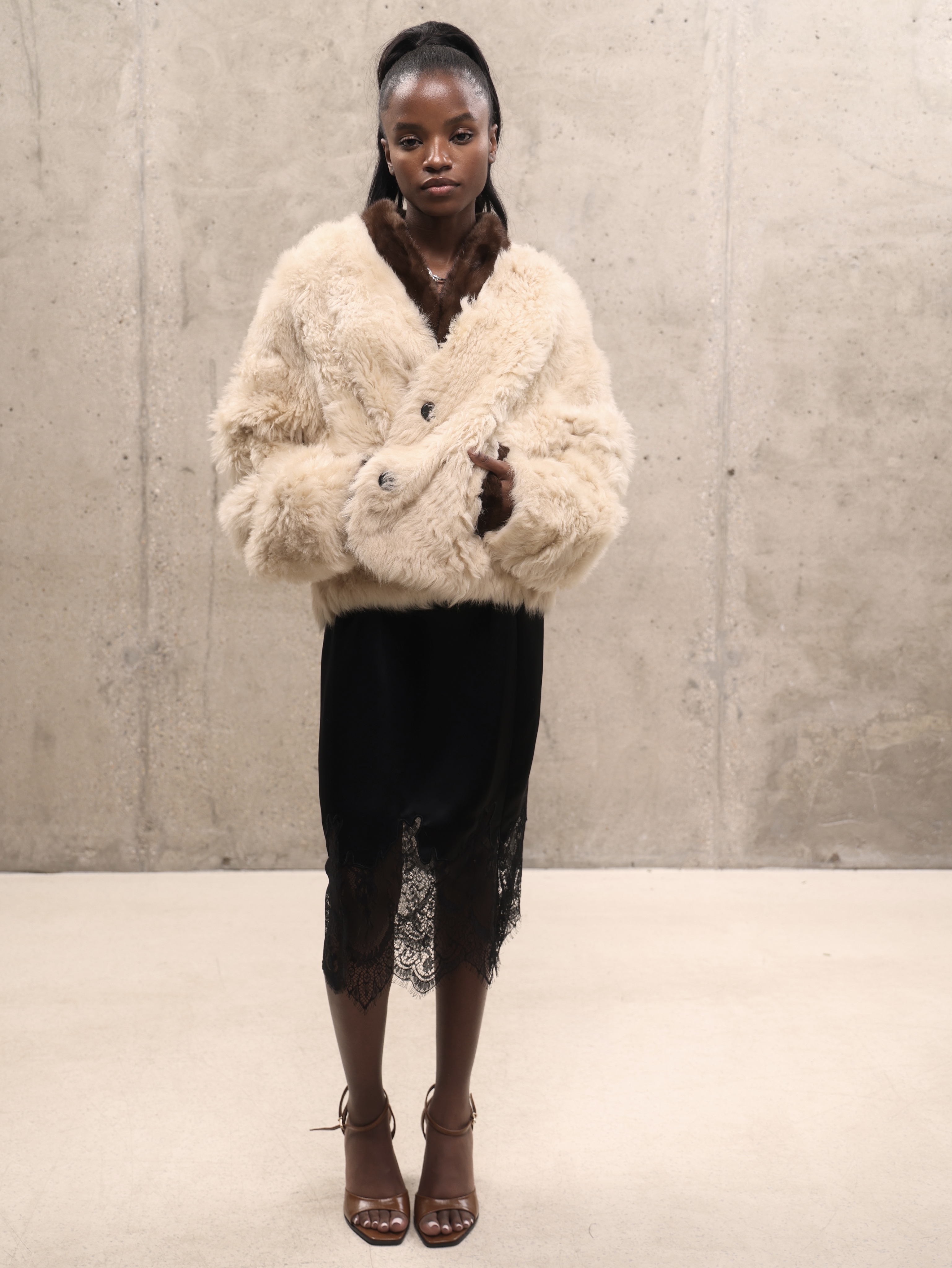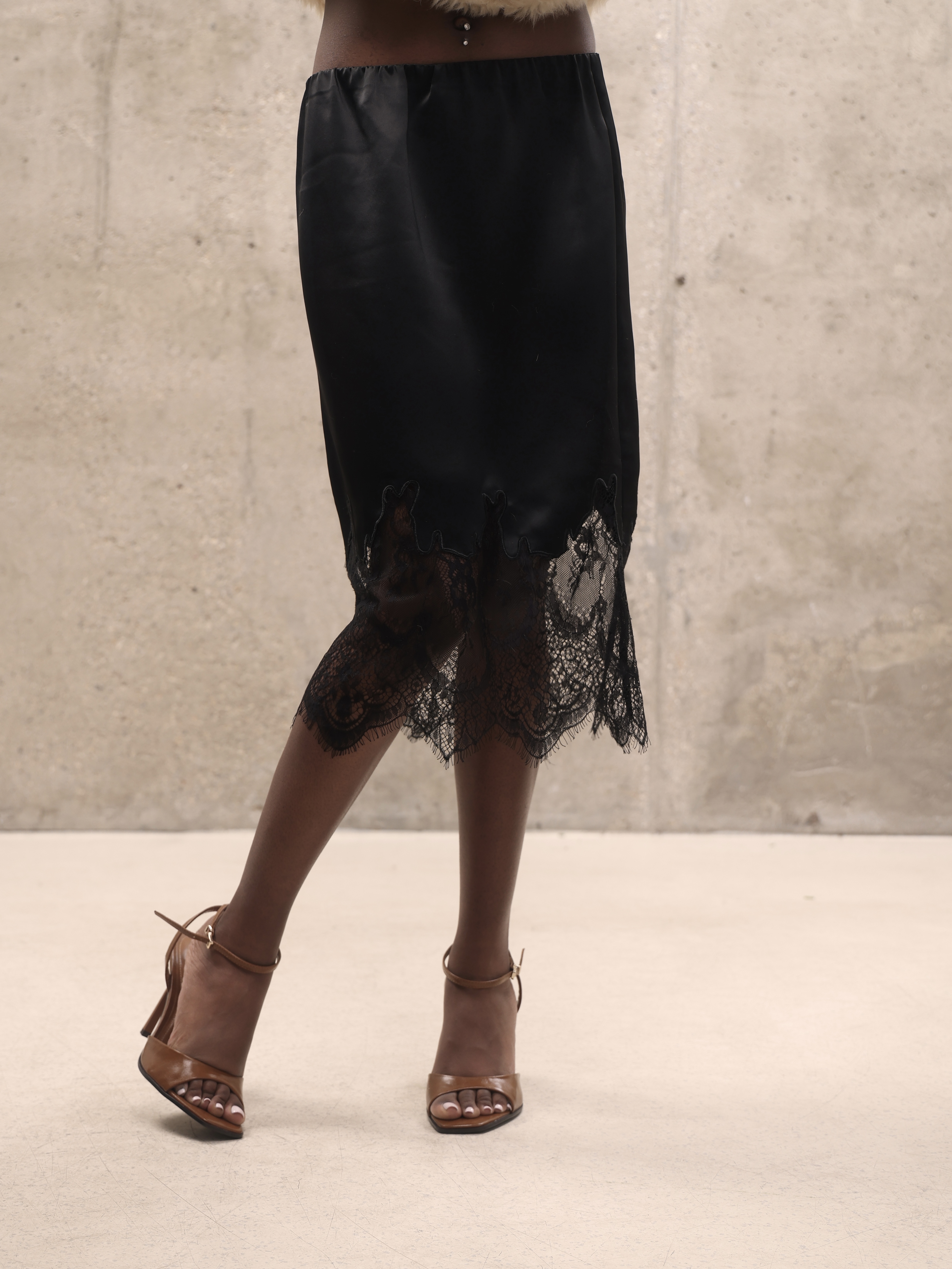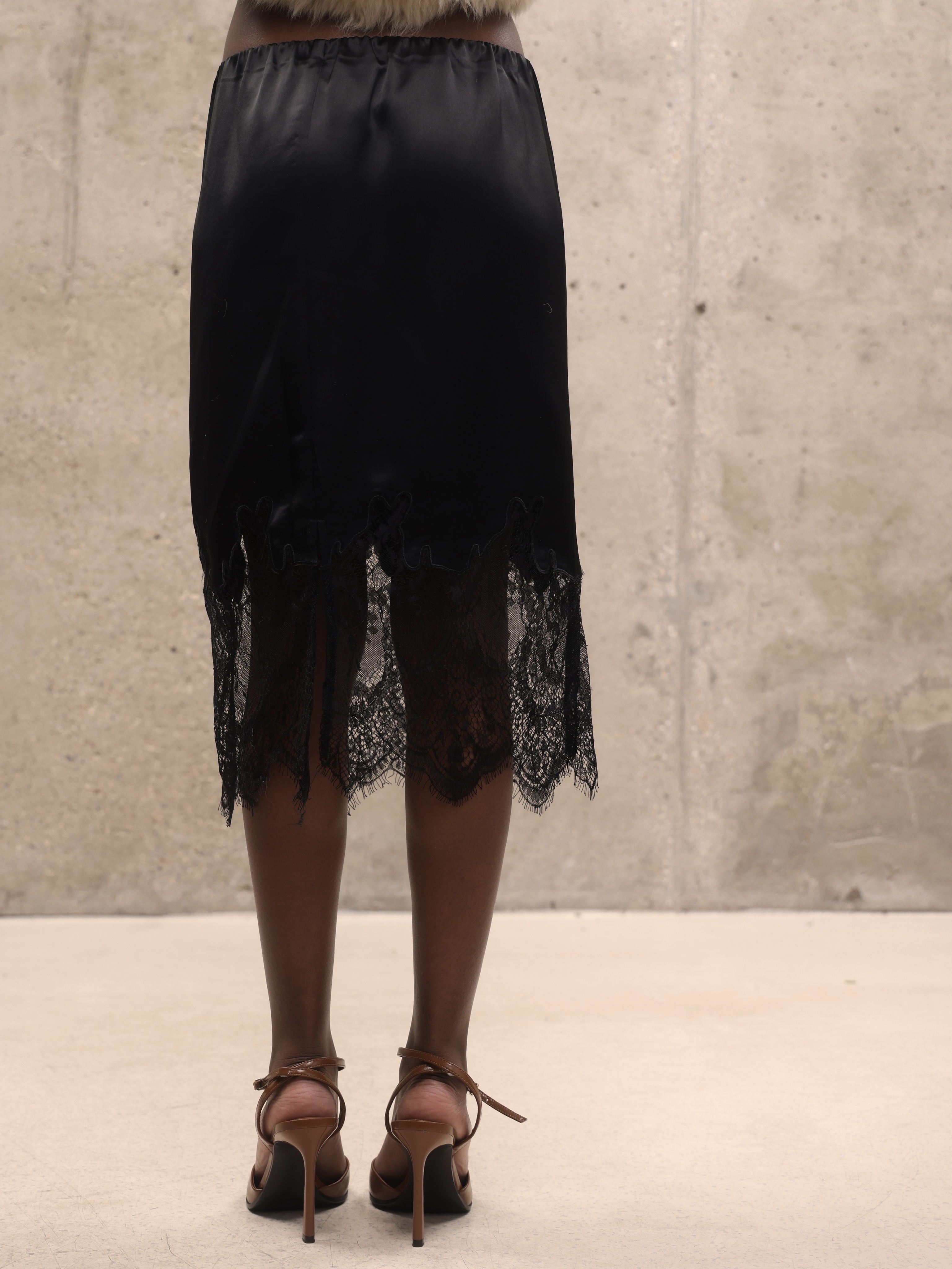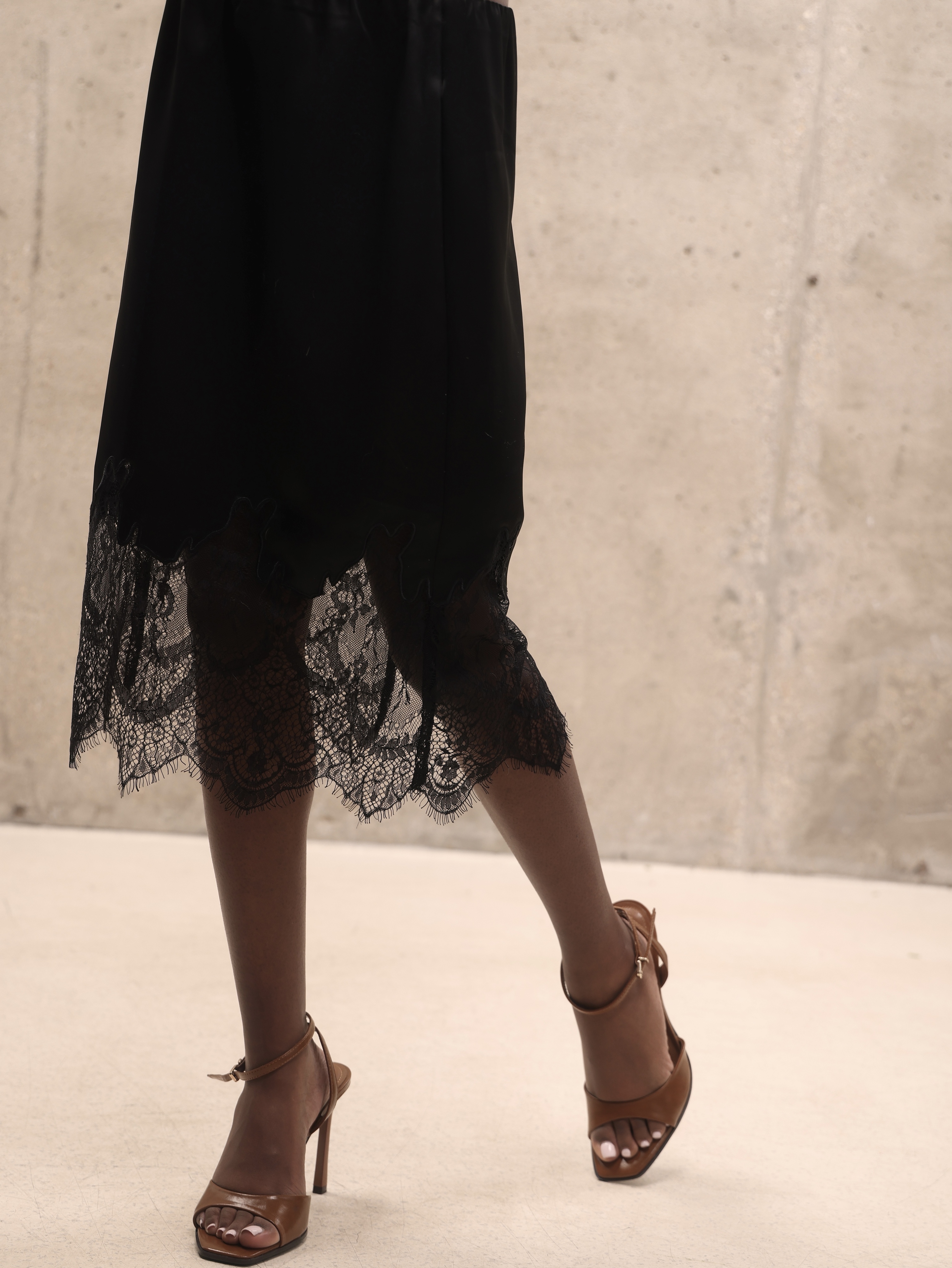 Черная юбка-миди выполнена из гладкого сатина и оторочена кружевом в тон по подолу. Модель с эластичным поясом на резинке.