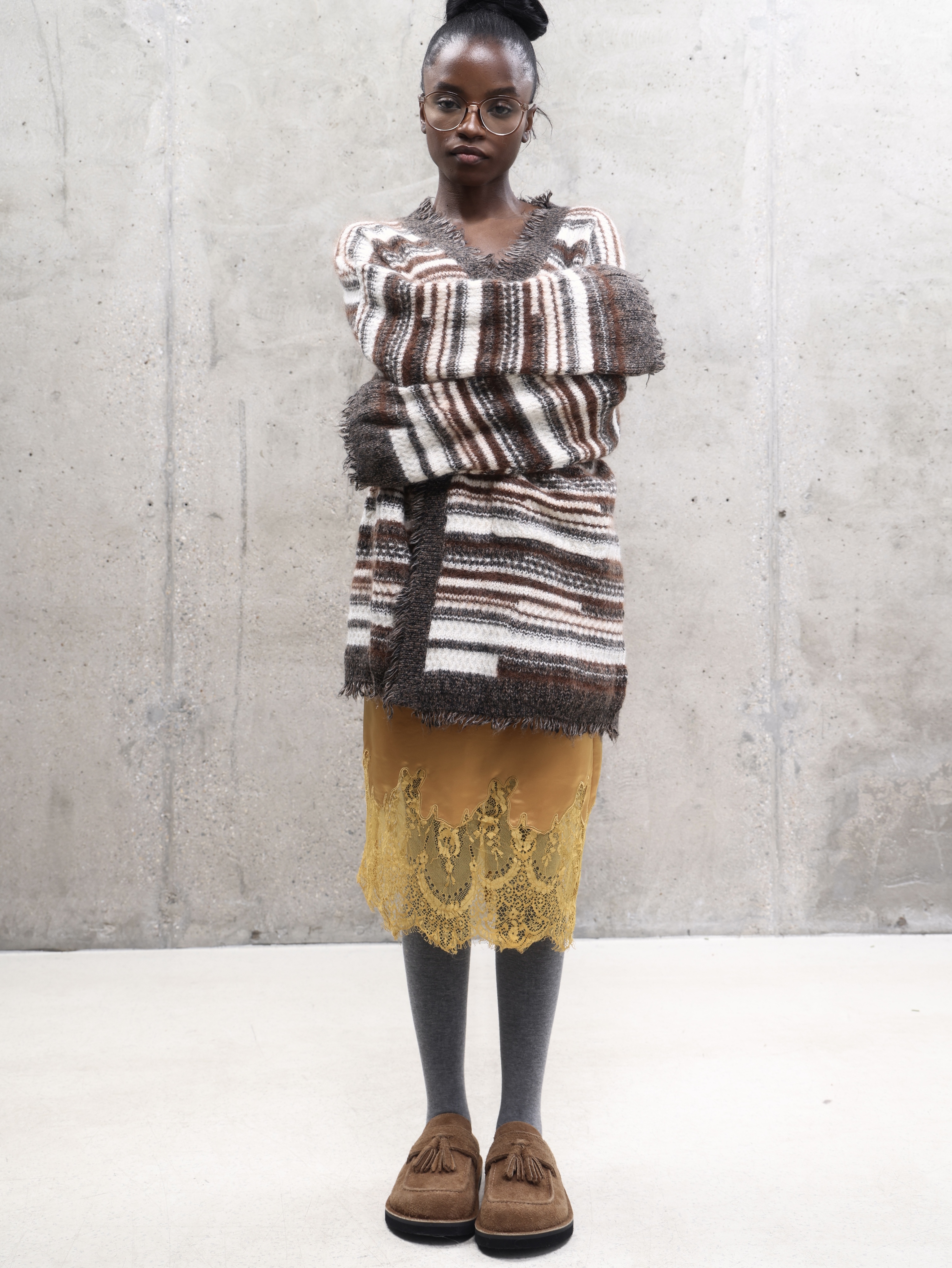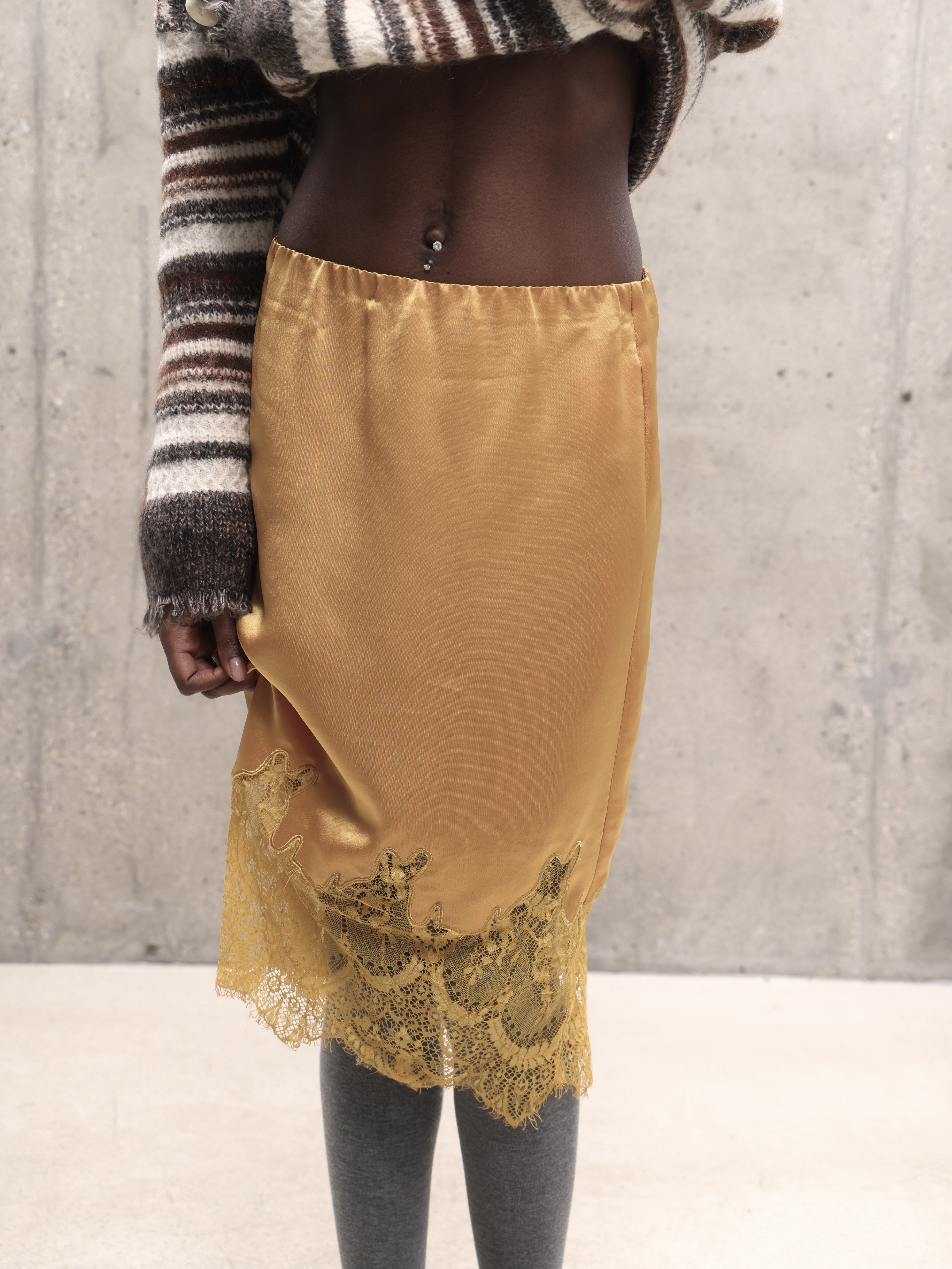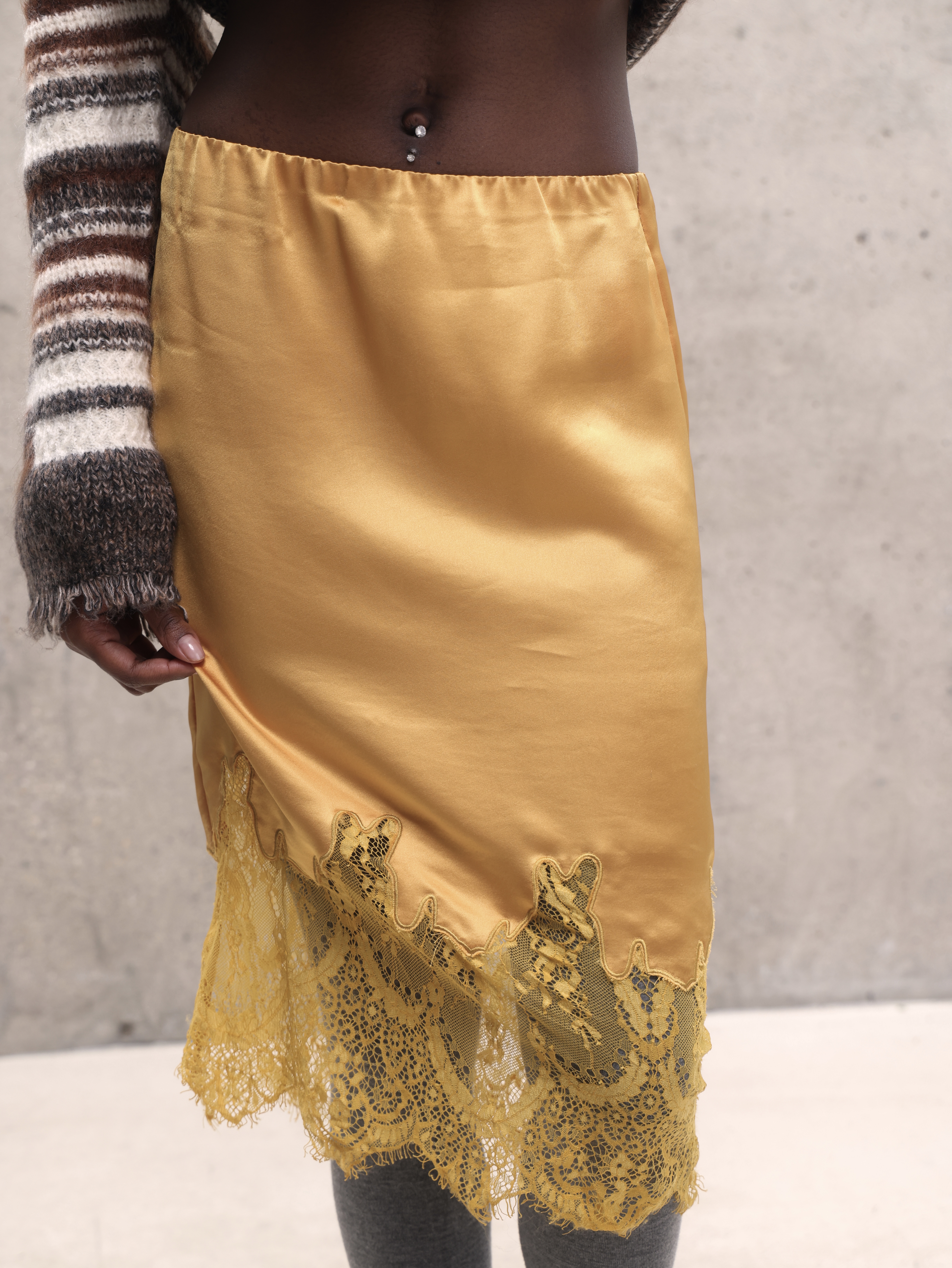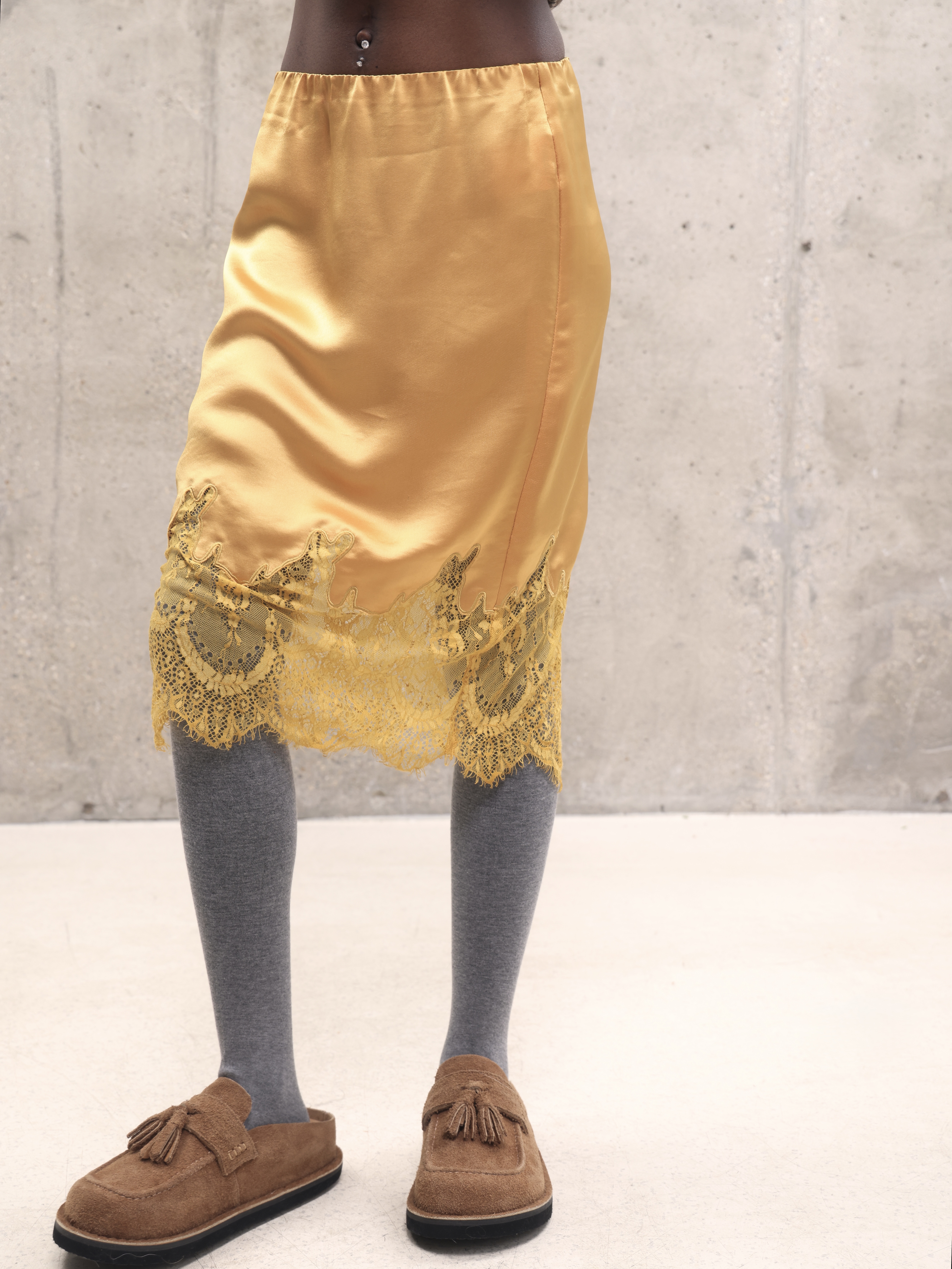 Горчичная юбка-миди выполнена из гладкого сатина и оторочена кружевом в тон по подолу. Модель с эластичным поясом на резинке.
