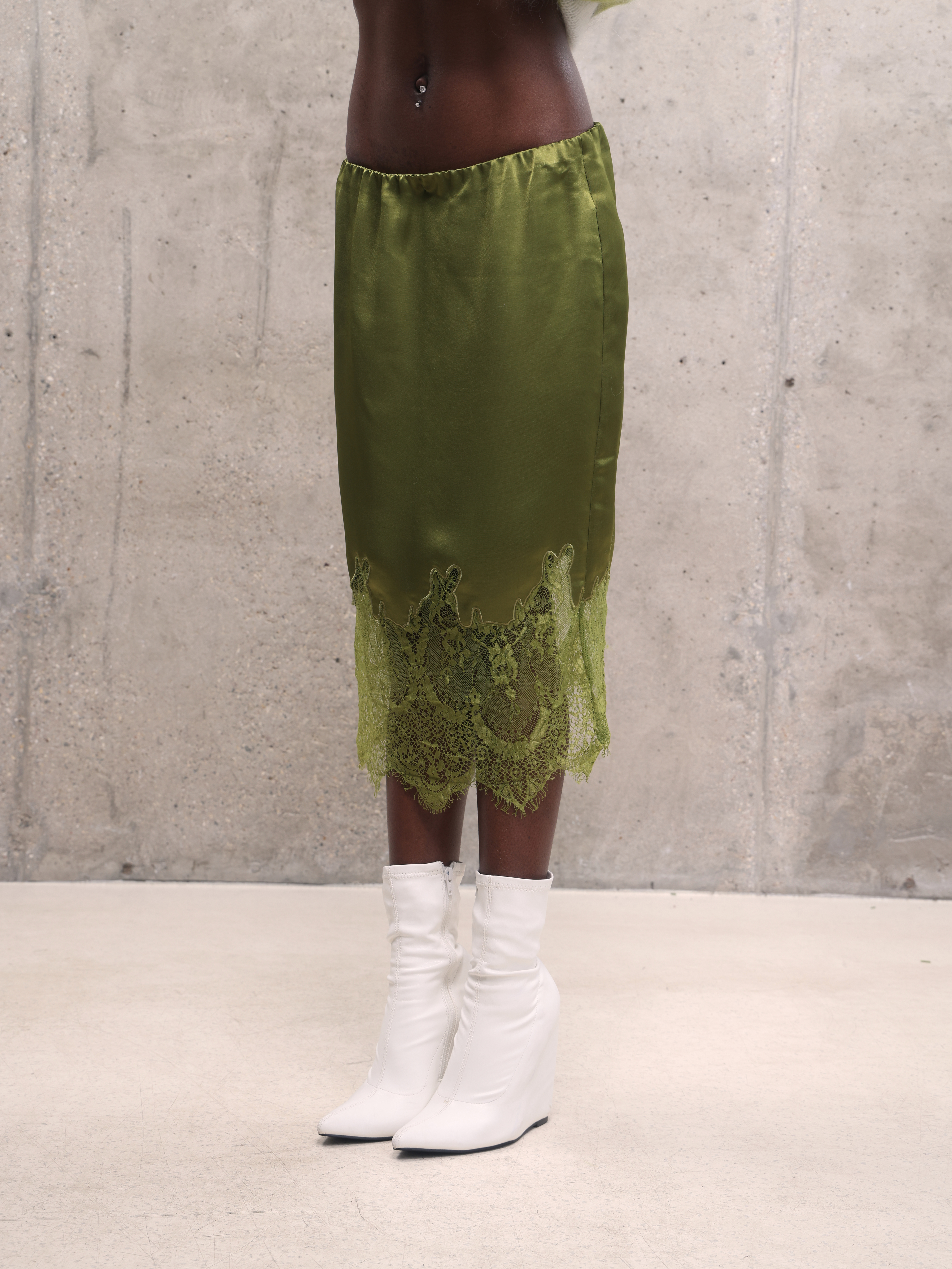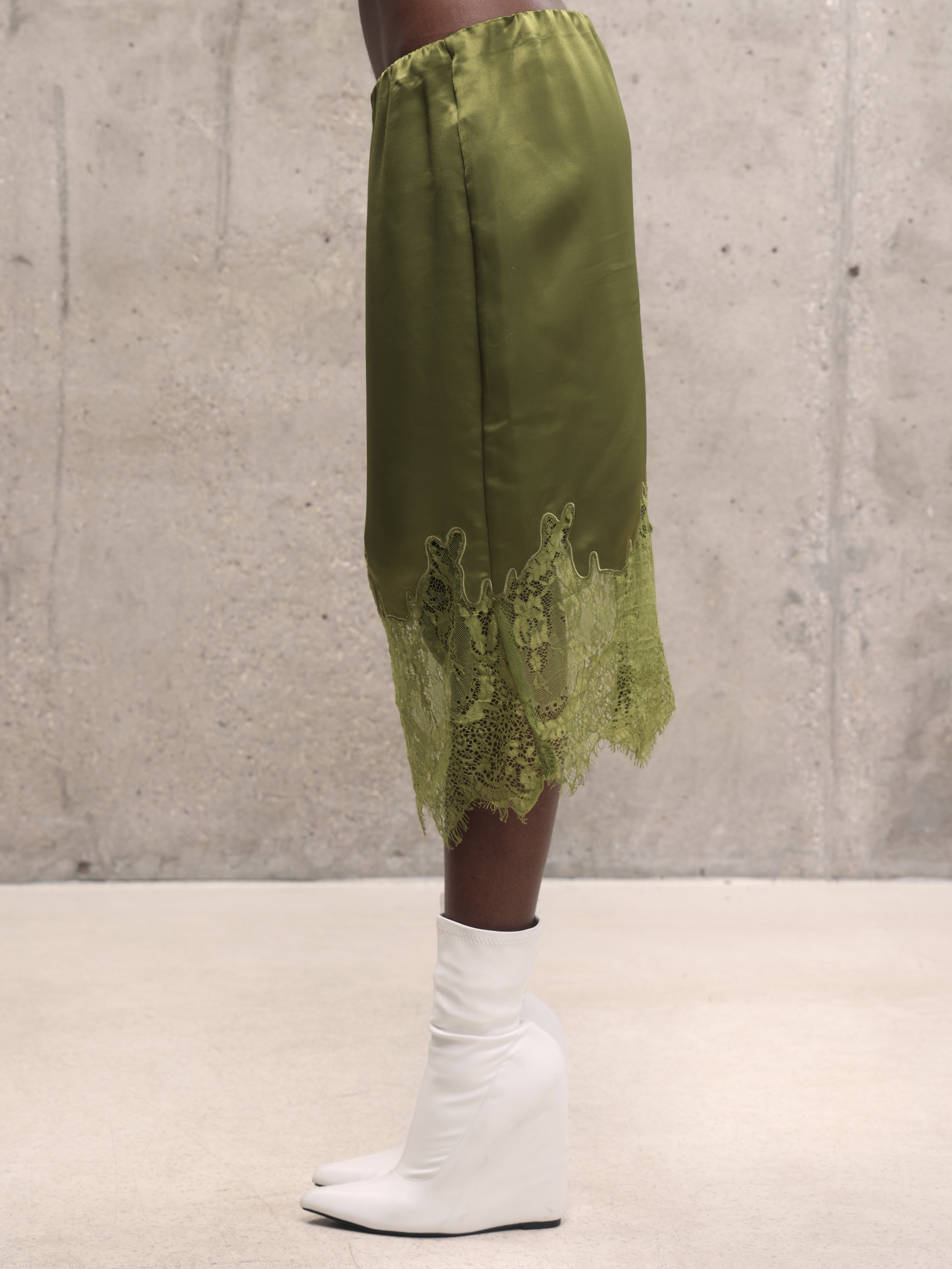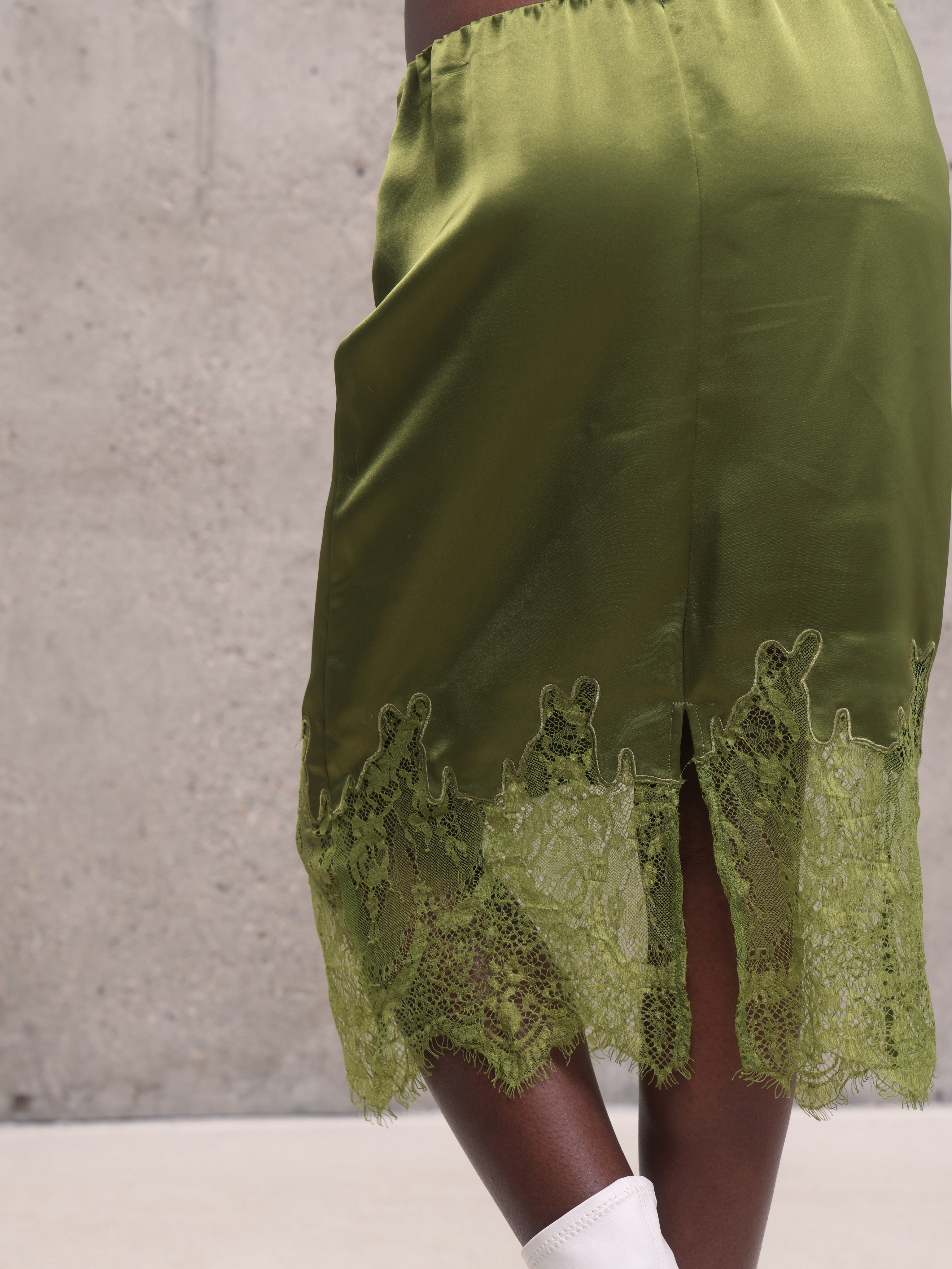 Зеленая юбка-миди выполнена из гладкого сатина и оторочена кружевом в тон по подолу. Модель с эластичным поясом на резинке.
