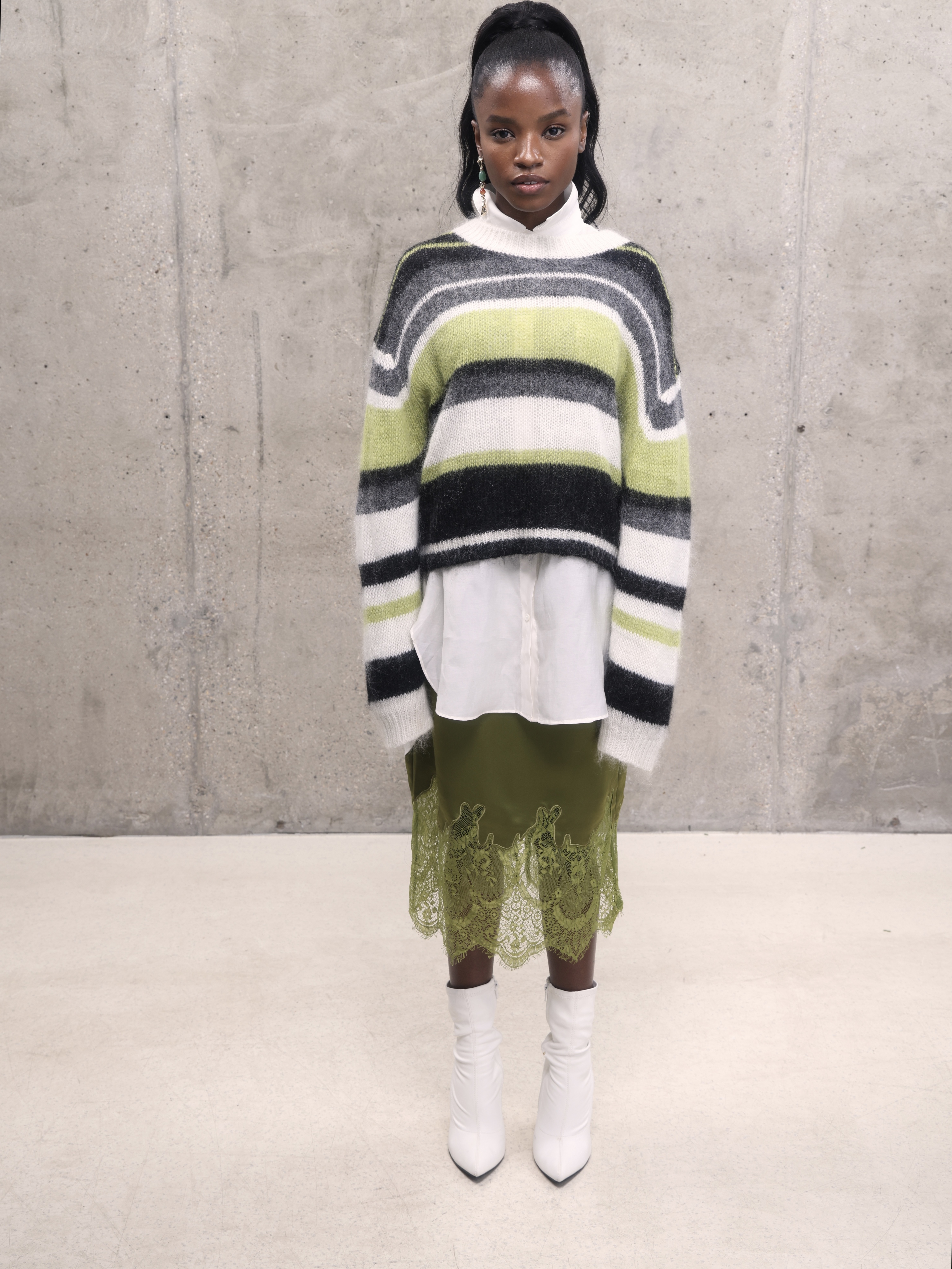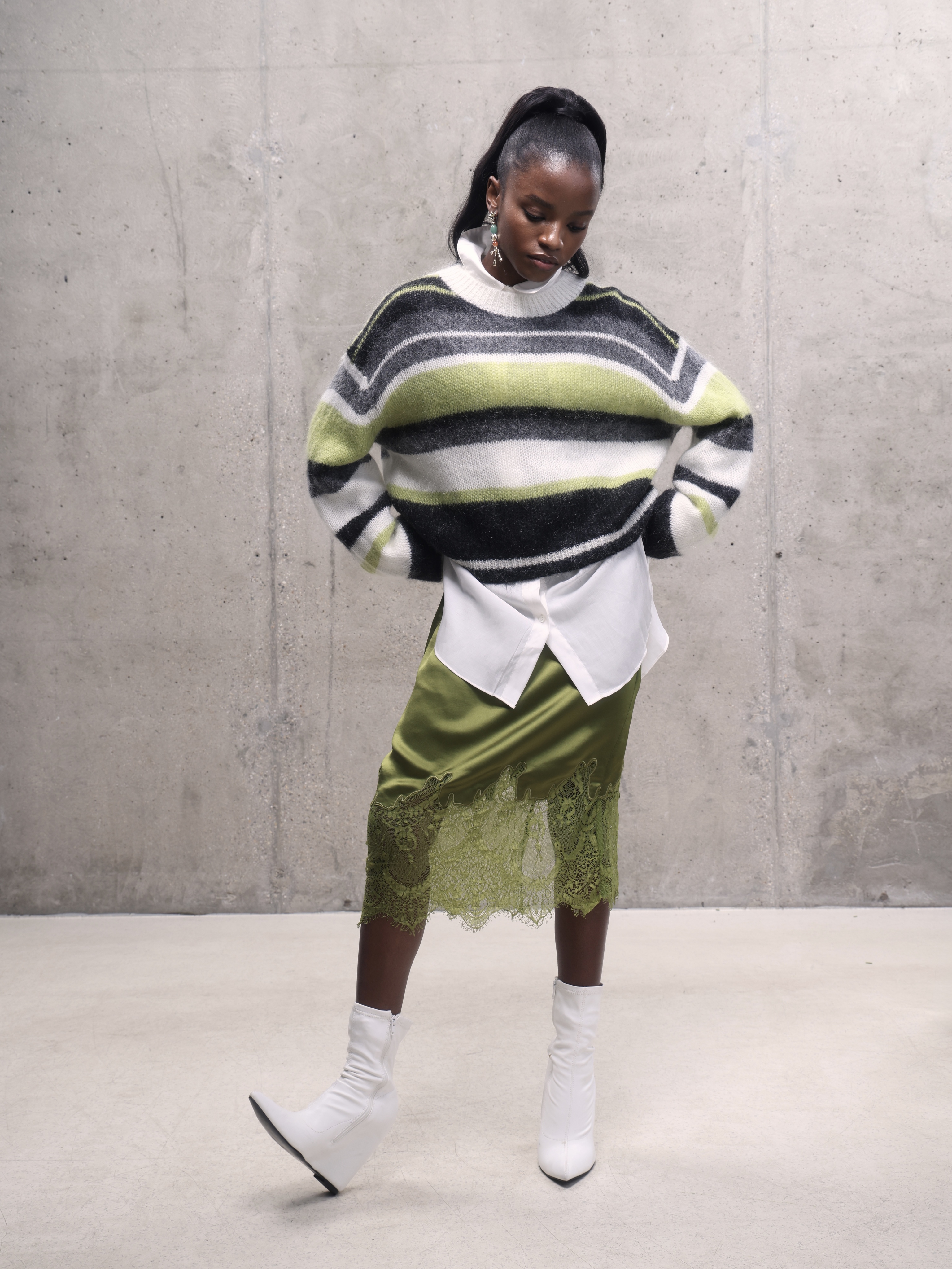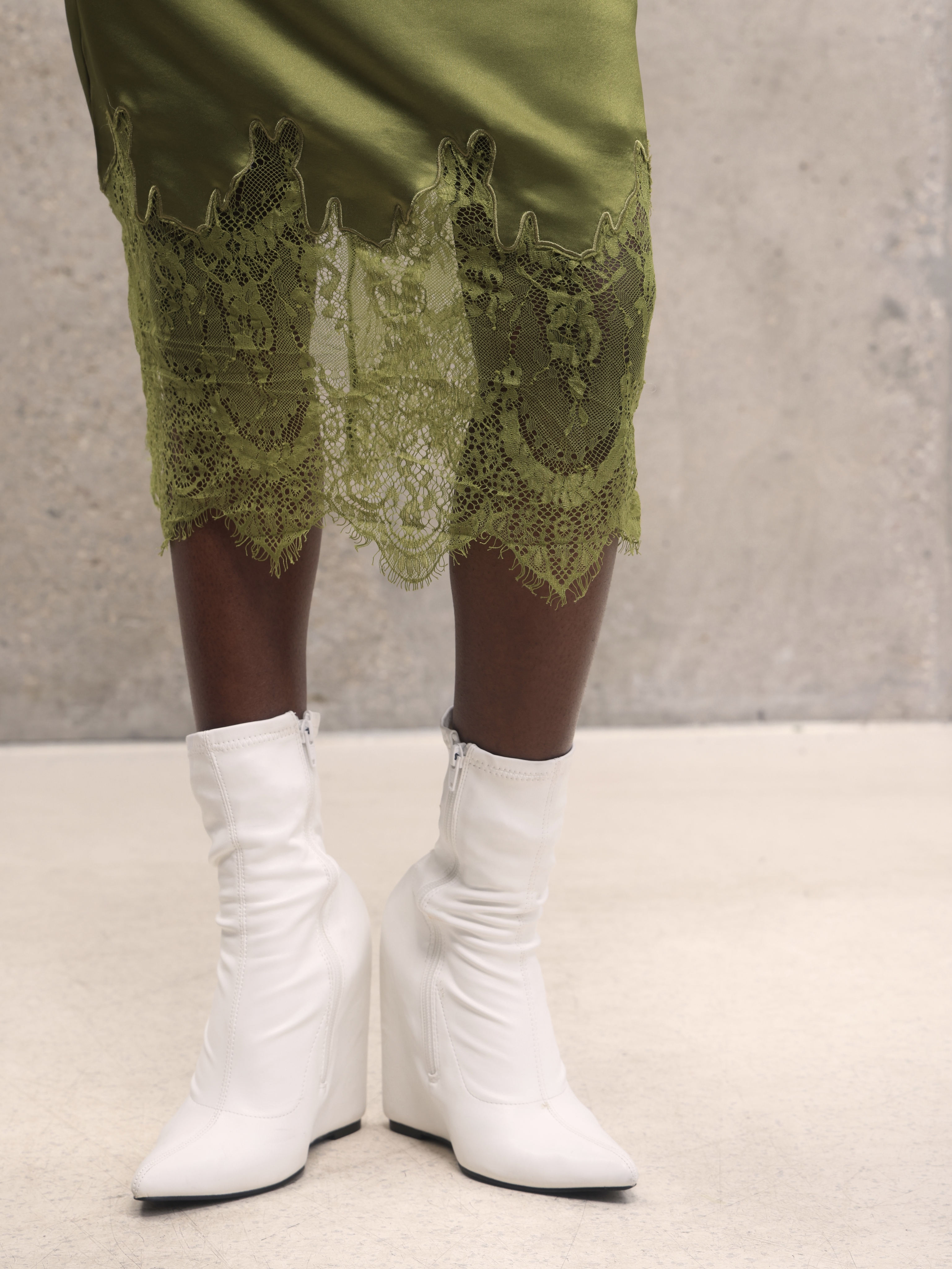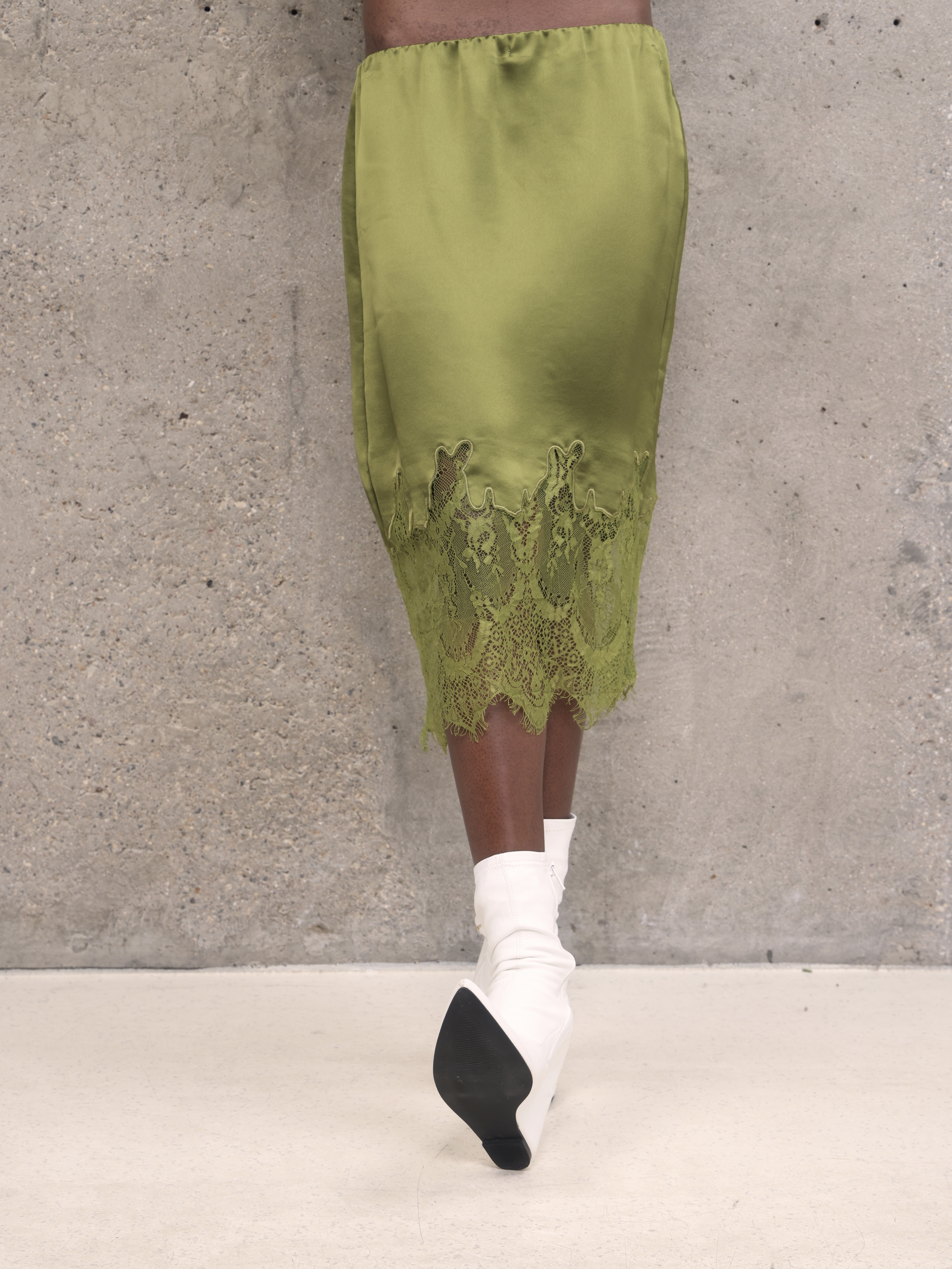 Зеленая юбка-миди выполнена из гладкого сатина и оторочена кружевом в тон по подолу. Модель с эластичным поясом на резинке.