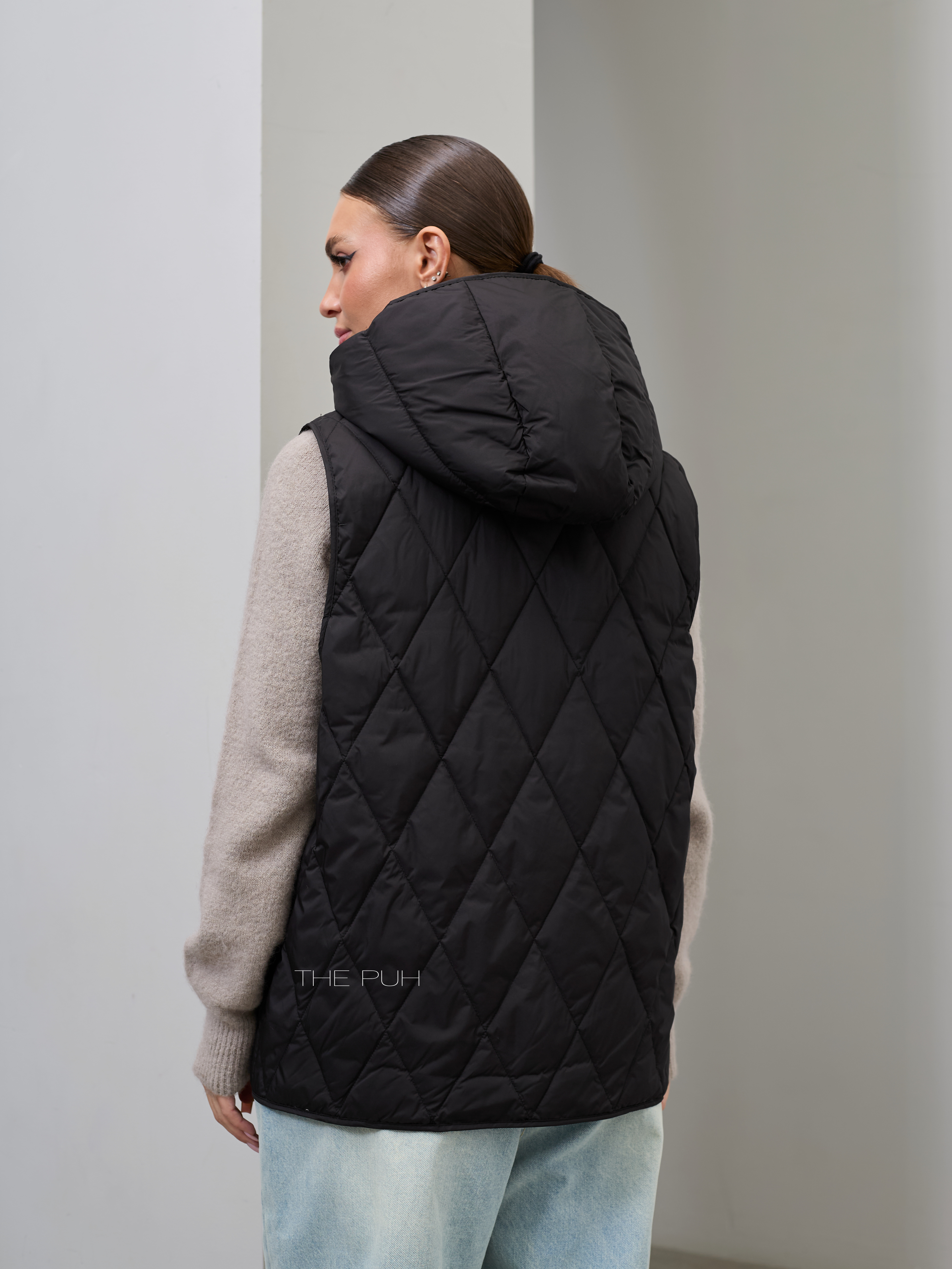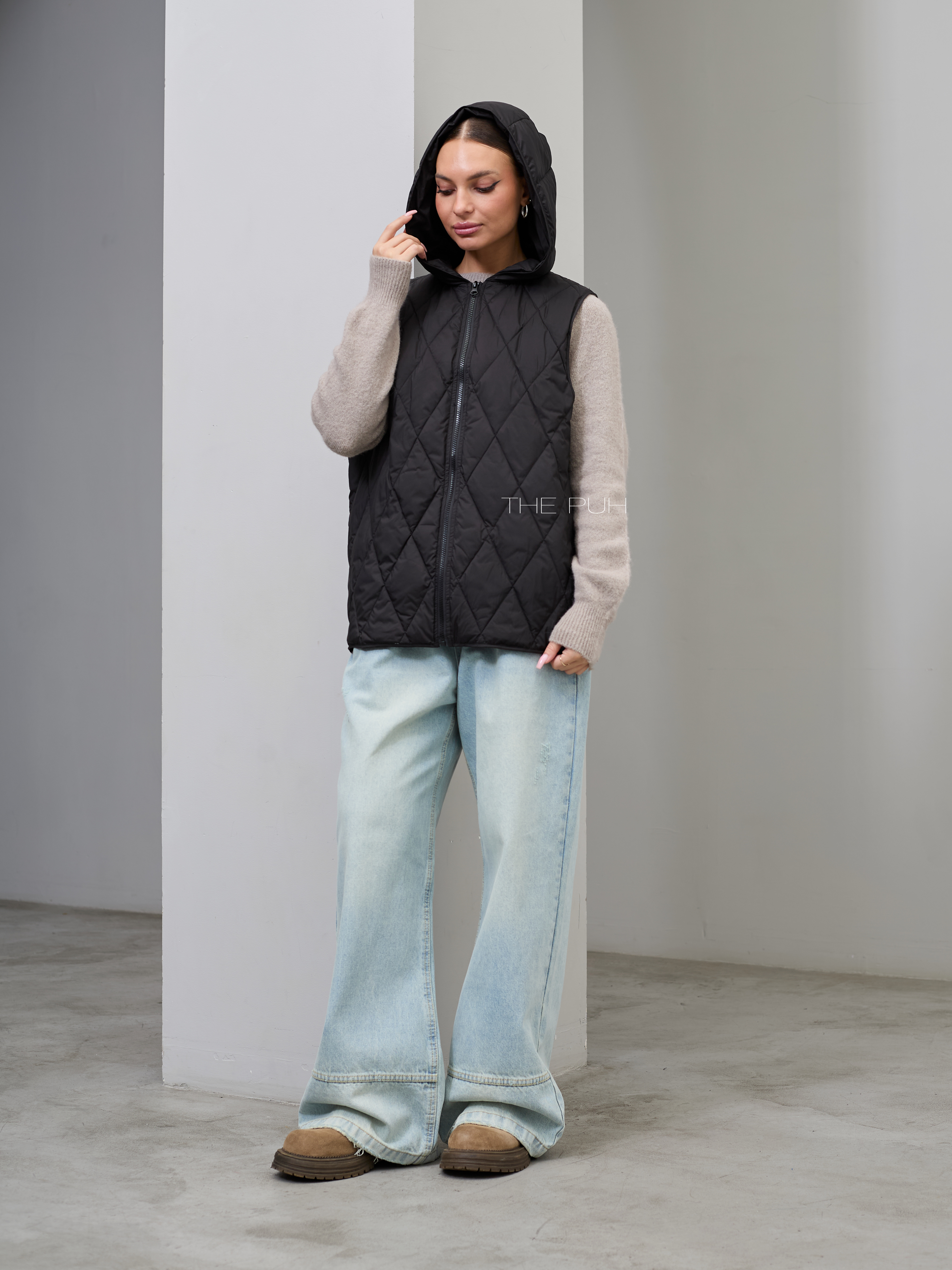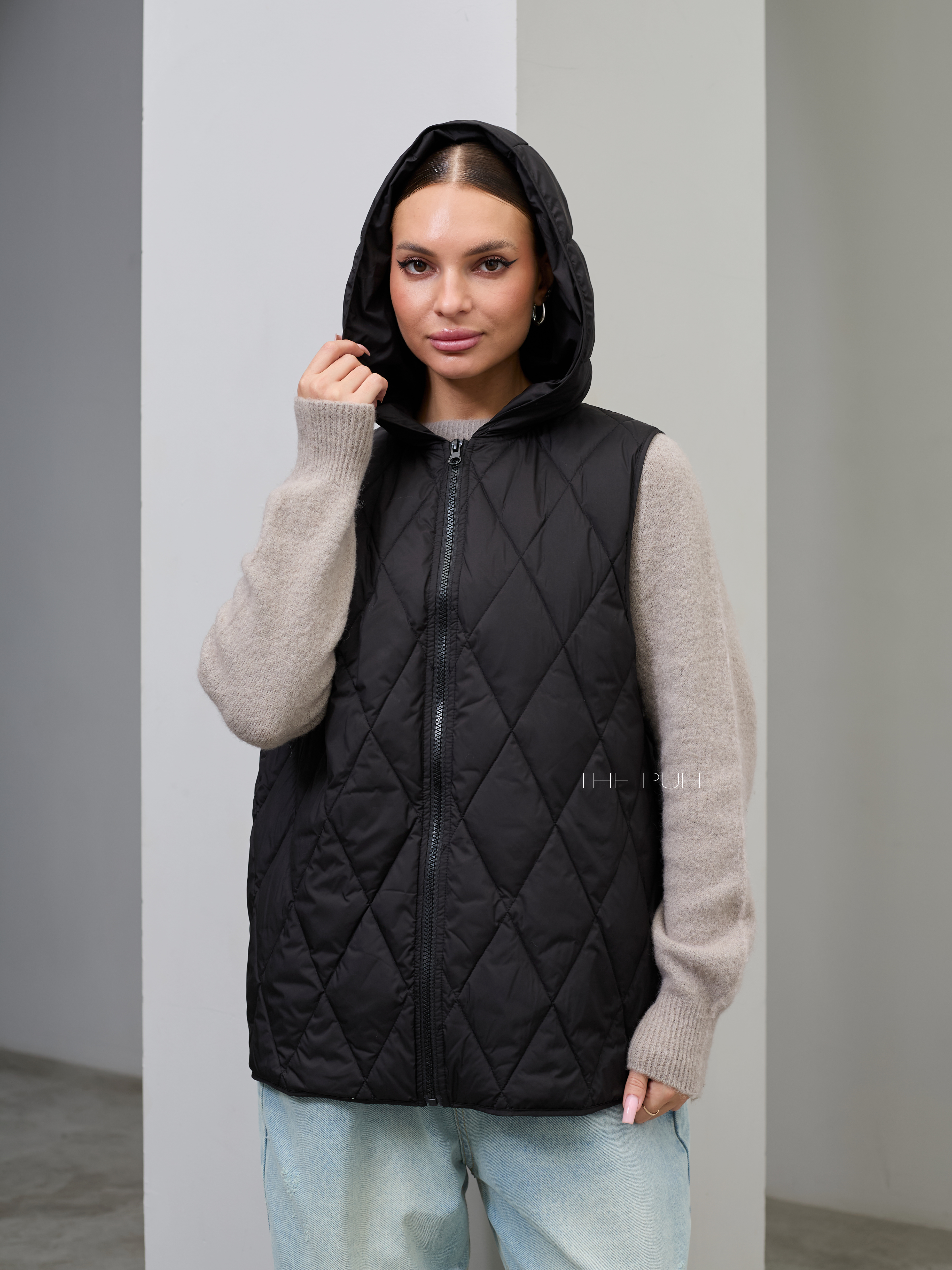 Модель представлена в универсальном дизайне свободного кроя в черном цвете, с молнией и объёмным капюшоном. Данный жилет отлично подойдет для многослойных стилизаций образов.