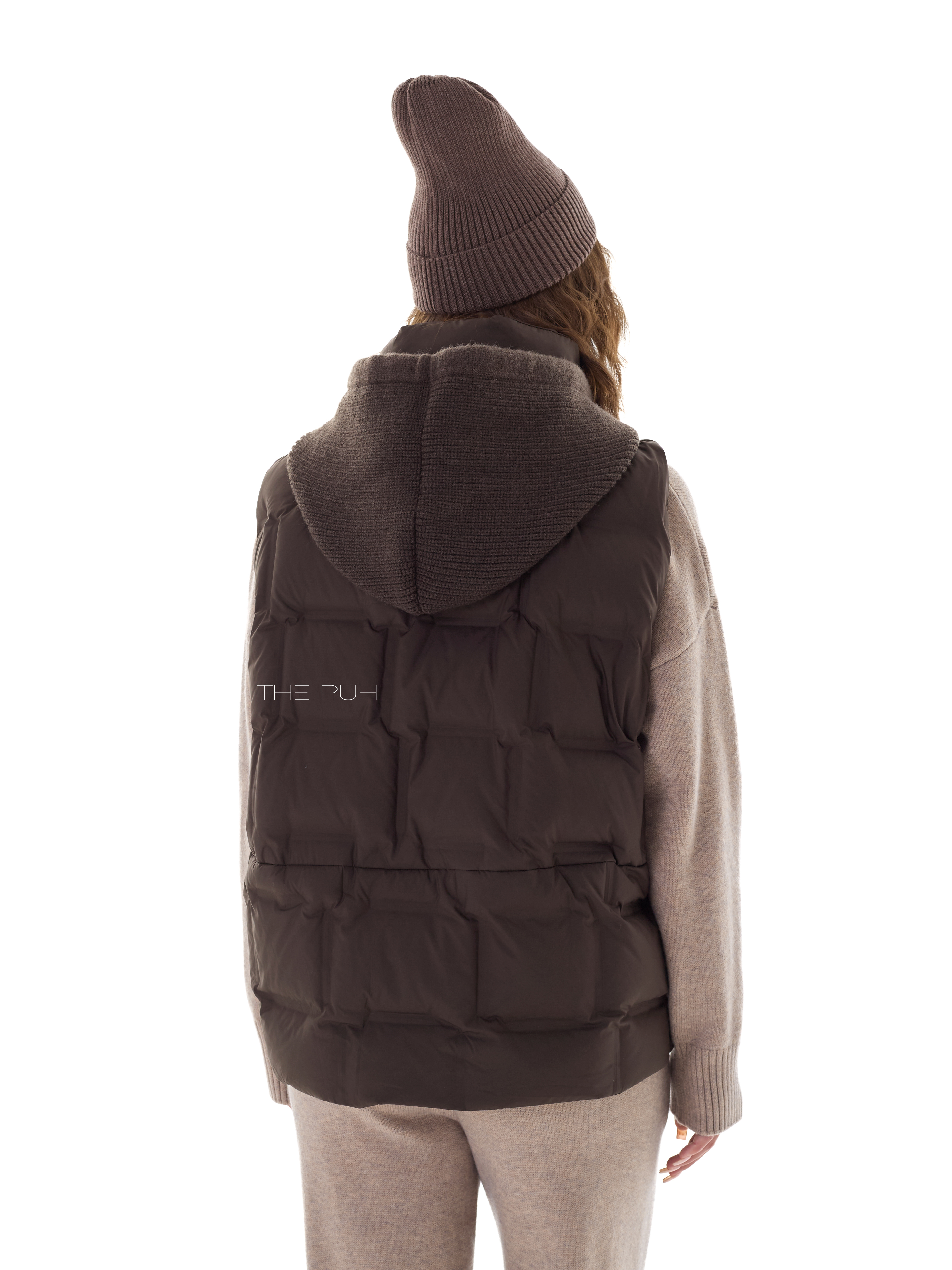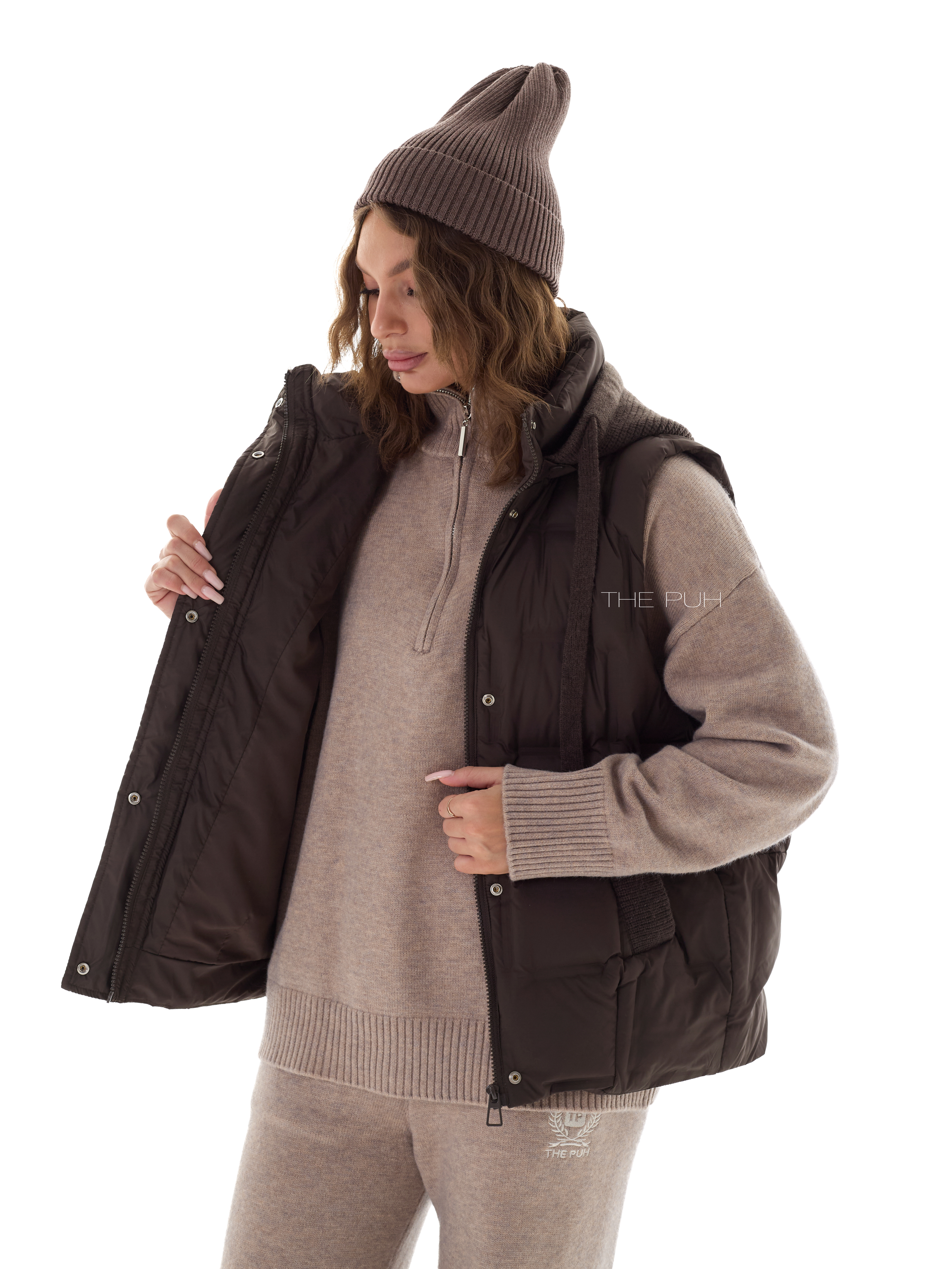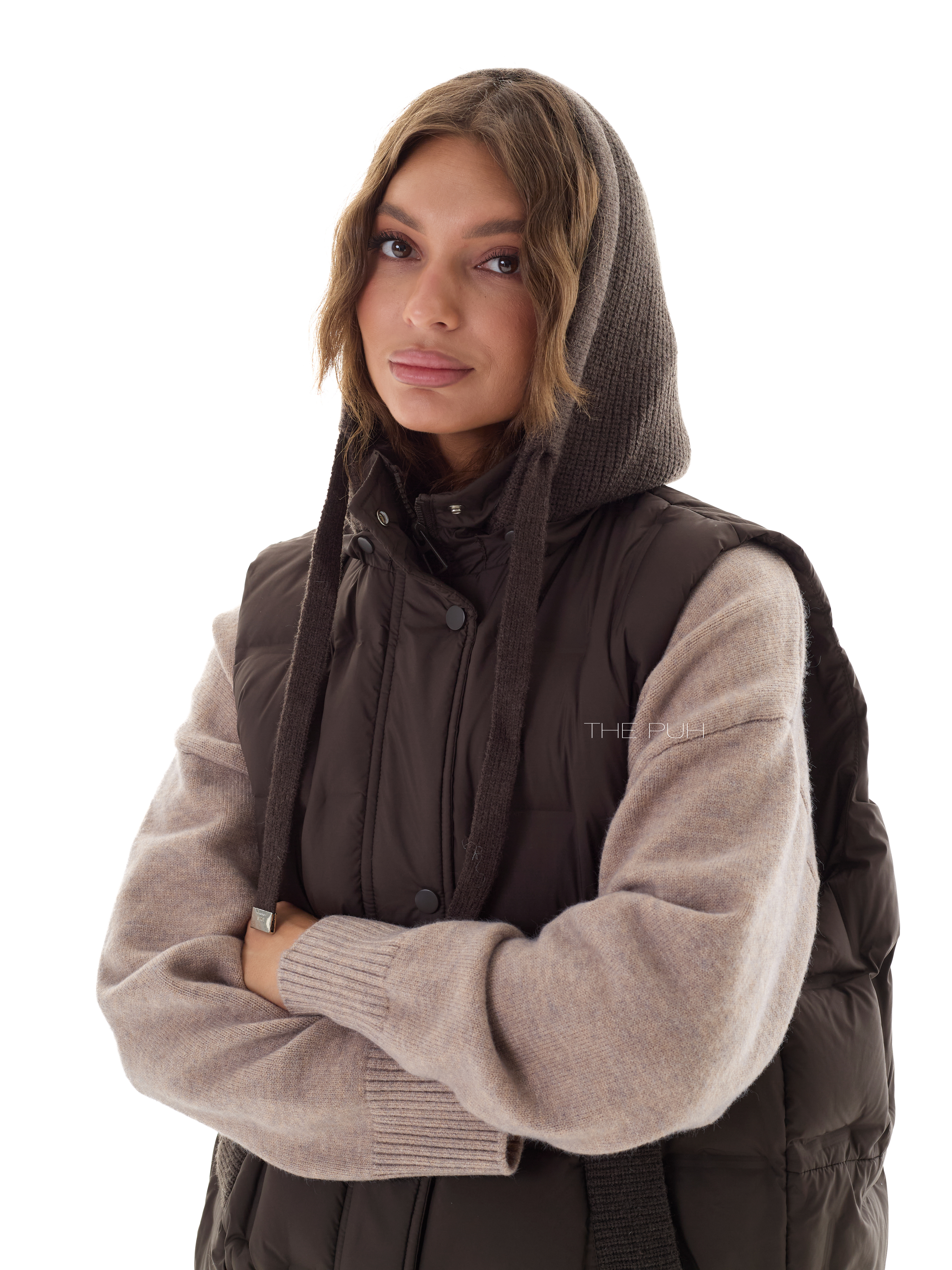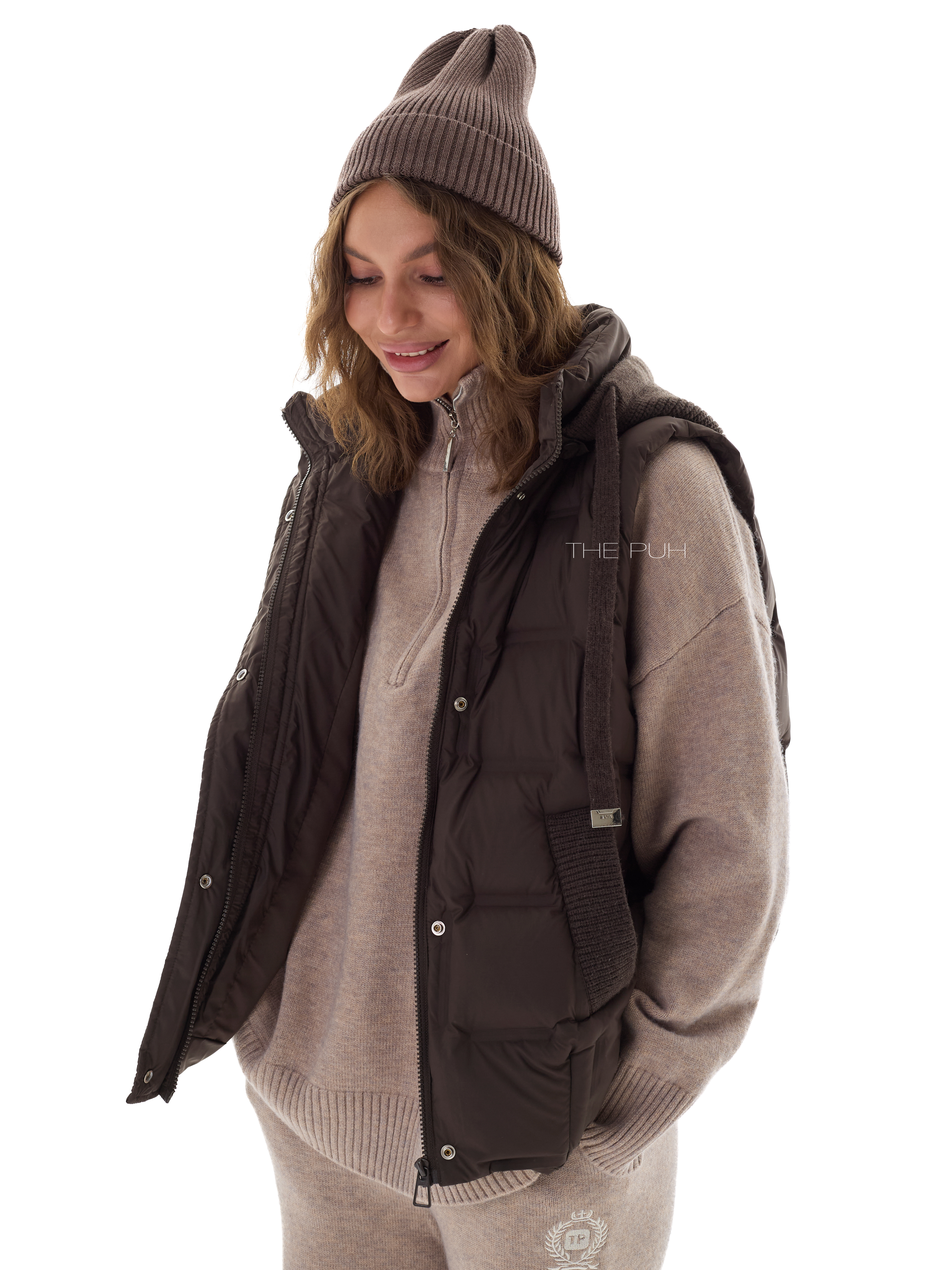 Тонкий жилет-пуховик в цвете шоколад со съемным вязаным капюшоном. Модель утеплена натуральным гусиным пухом и идеально подойдет на позднюю осень и первые заморозки, а также послужить отличным нижним слоем под пальто.