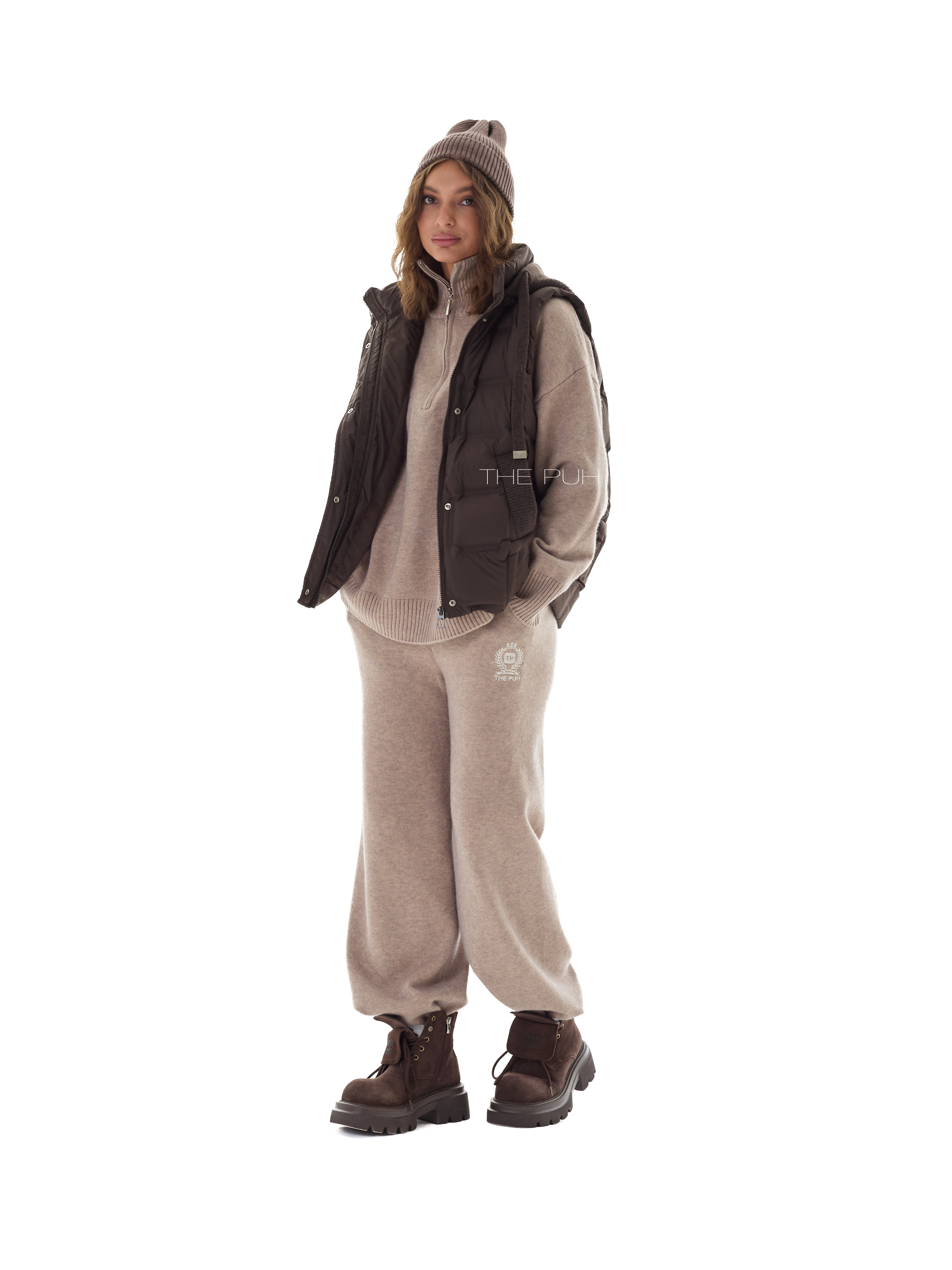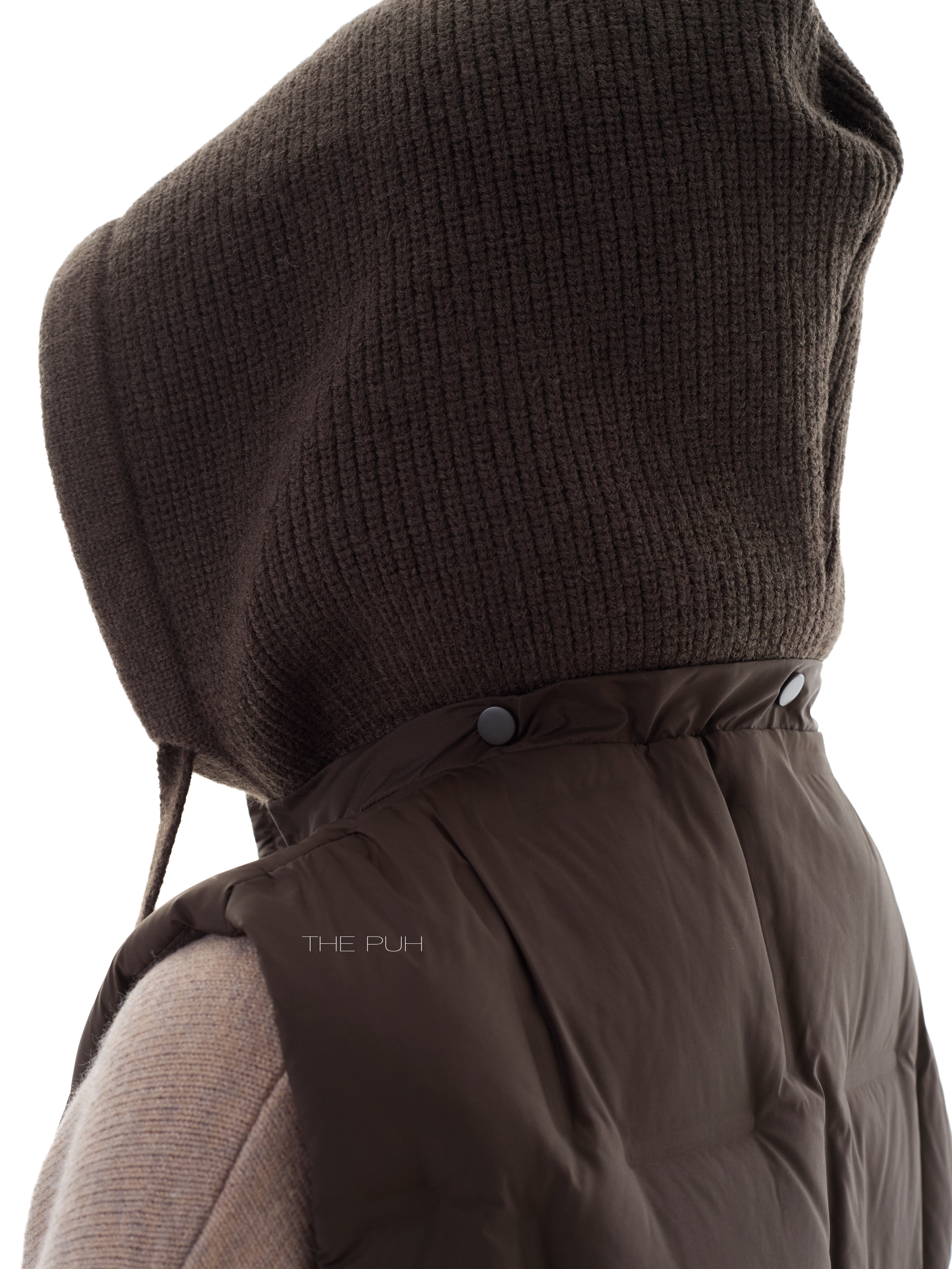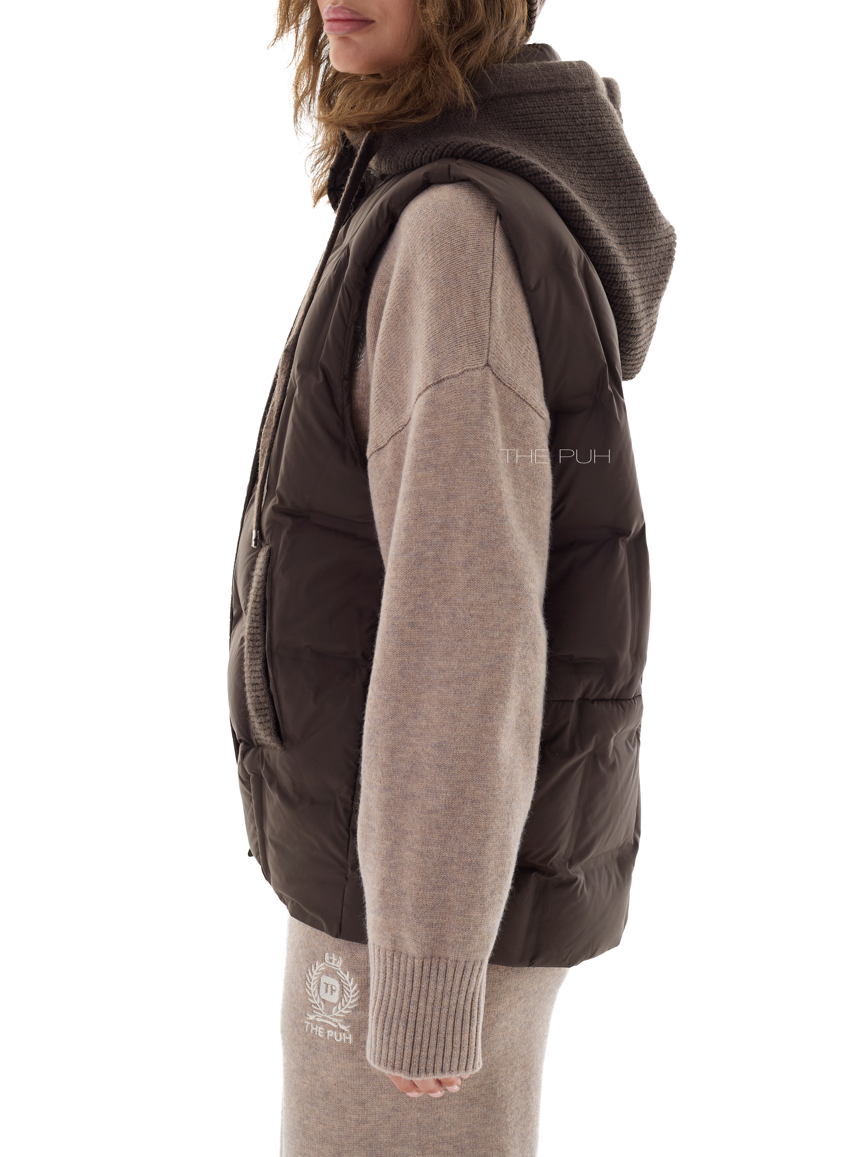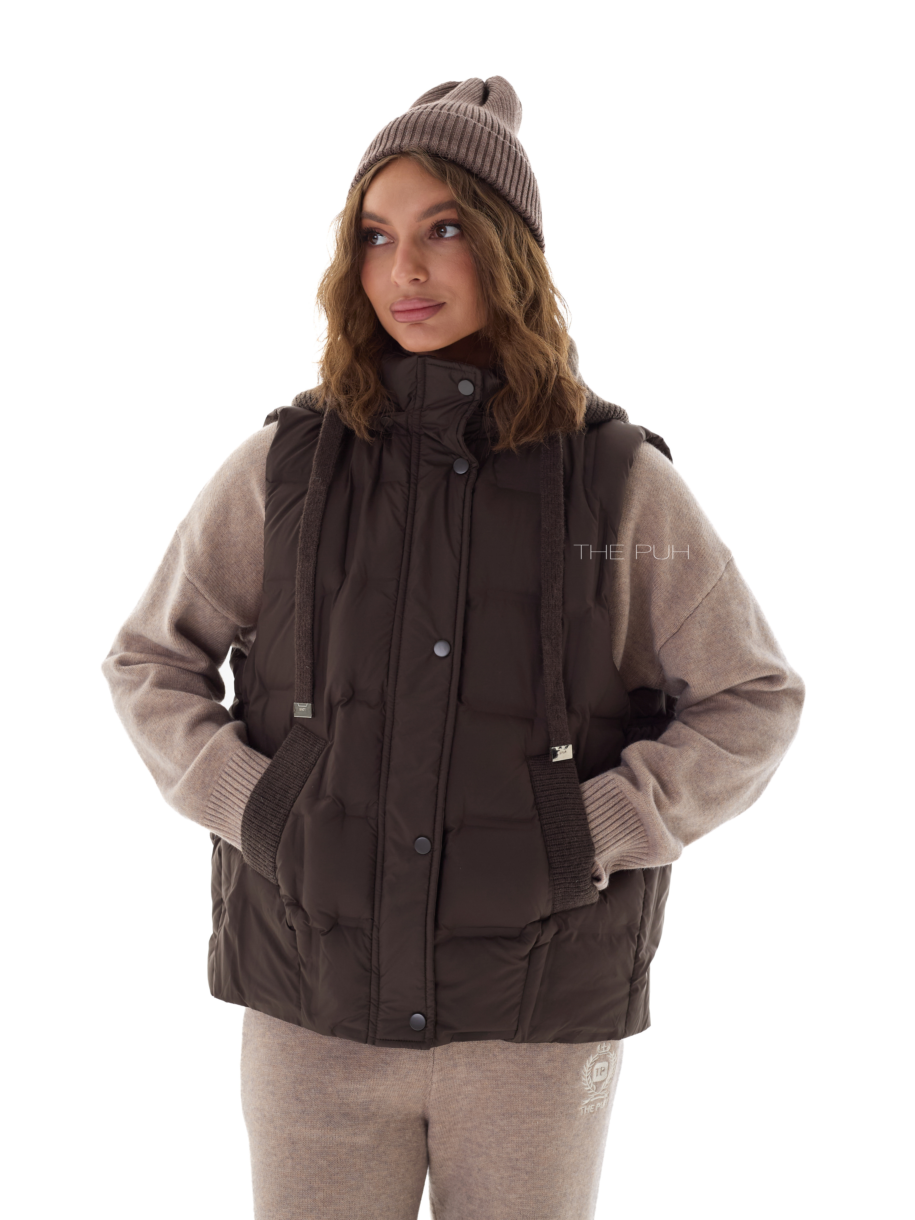 Тонкий жилет-пуховик в цвете шоколад со съемным вязаным капюшоном. Модель утеплена натуральным гусиным пухом и идеально подойдет на позднюю осень и первые заморозки, а также послужить отличным нижним слоем под пальто.