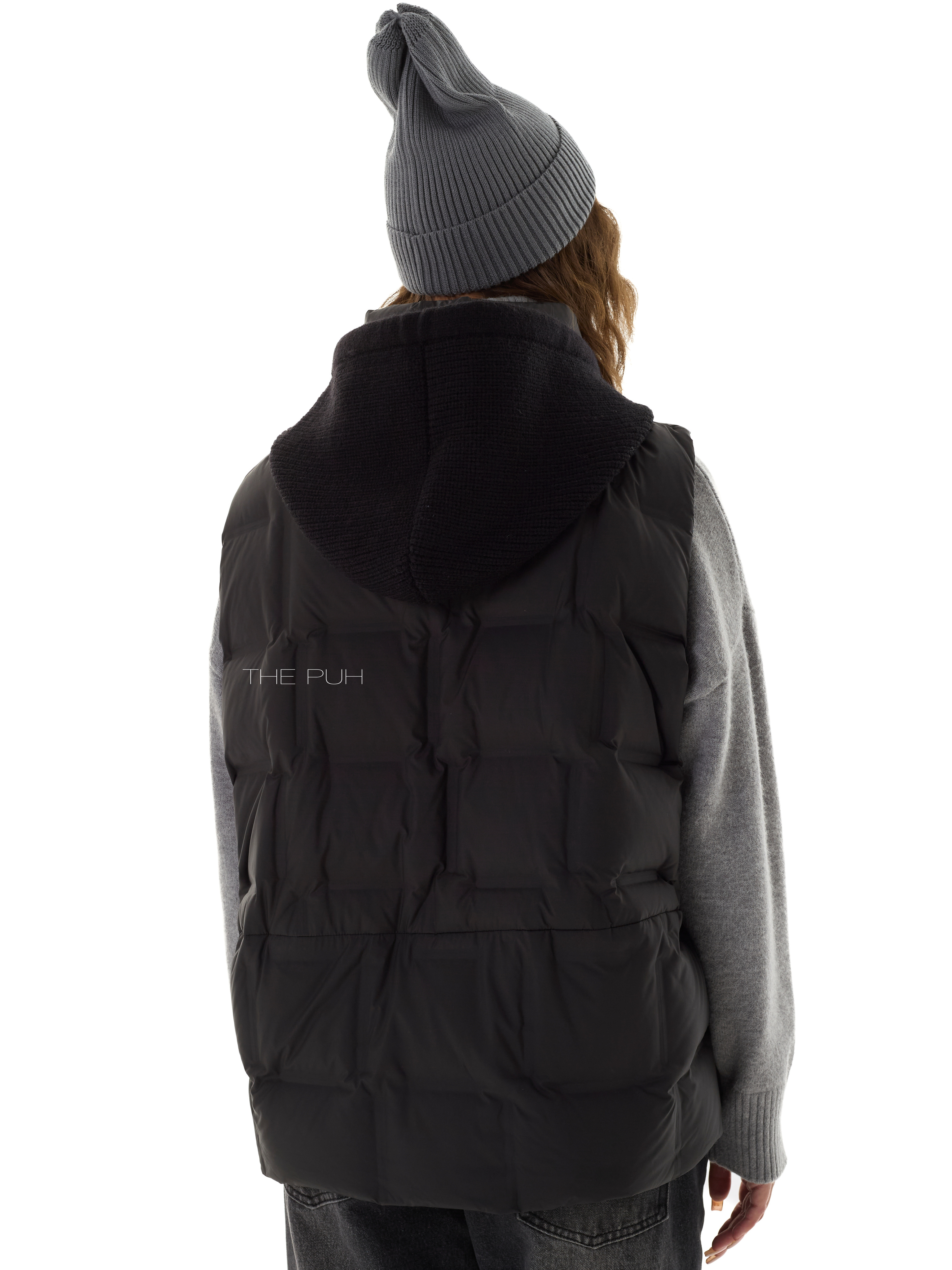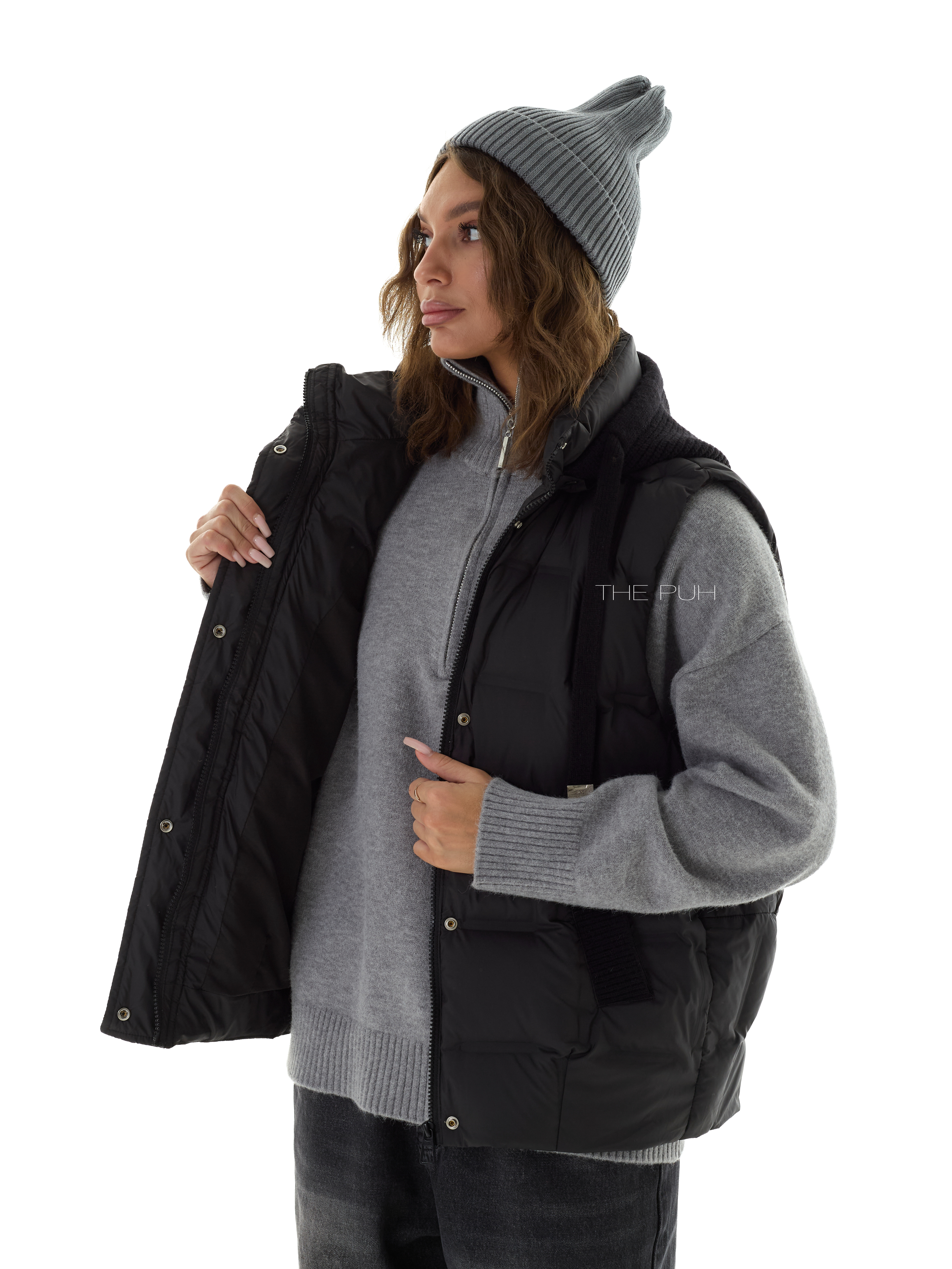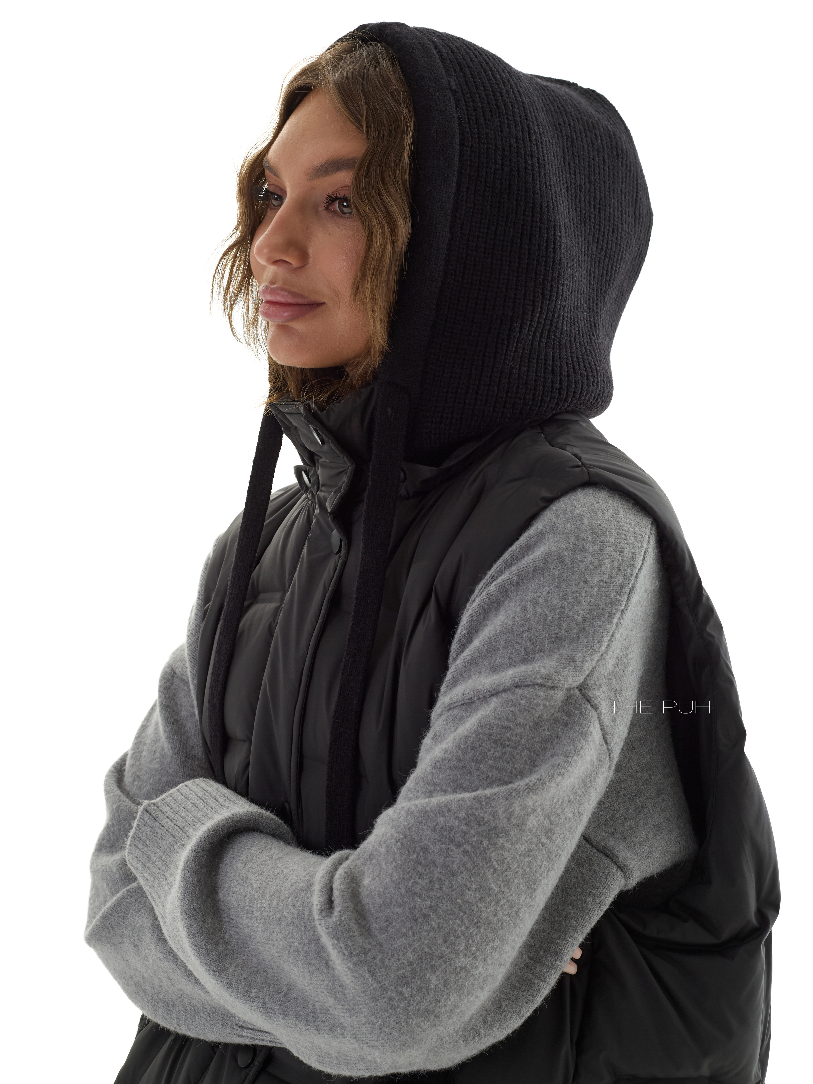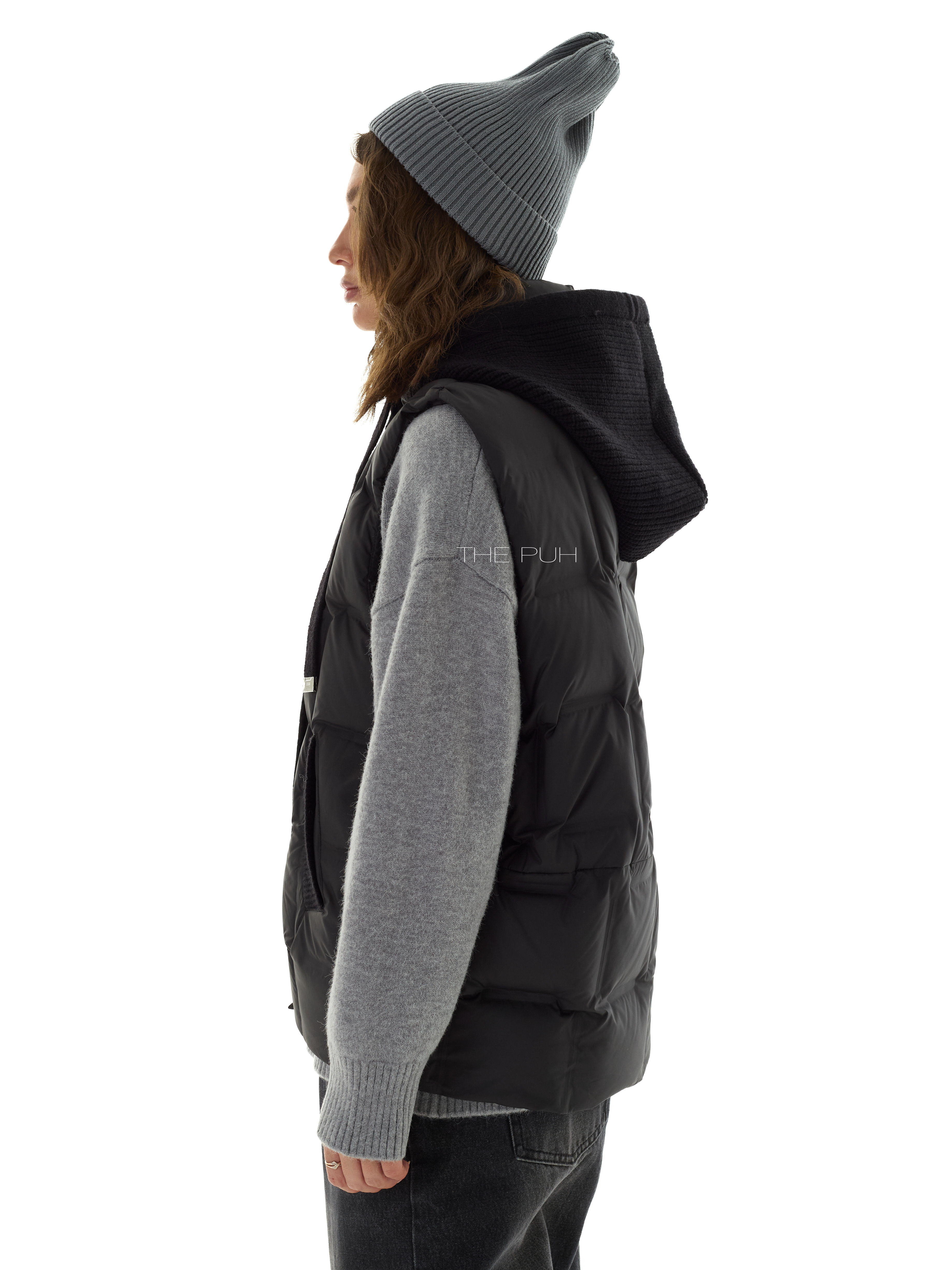 Тонкий жилет-пуховик в черном цвете со съемным вязаным капюшоном. Модель утеплена натуральным гусиным пухом и идеально подойдет на позднюю осень и первые заморозки, а также послужить отличным нижним слоем под пальто.